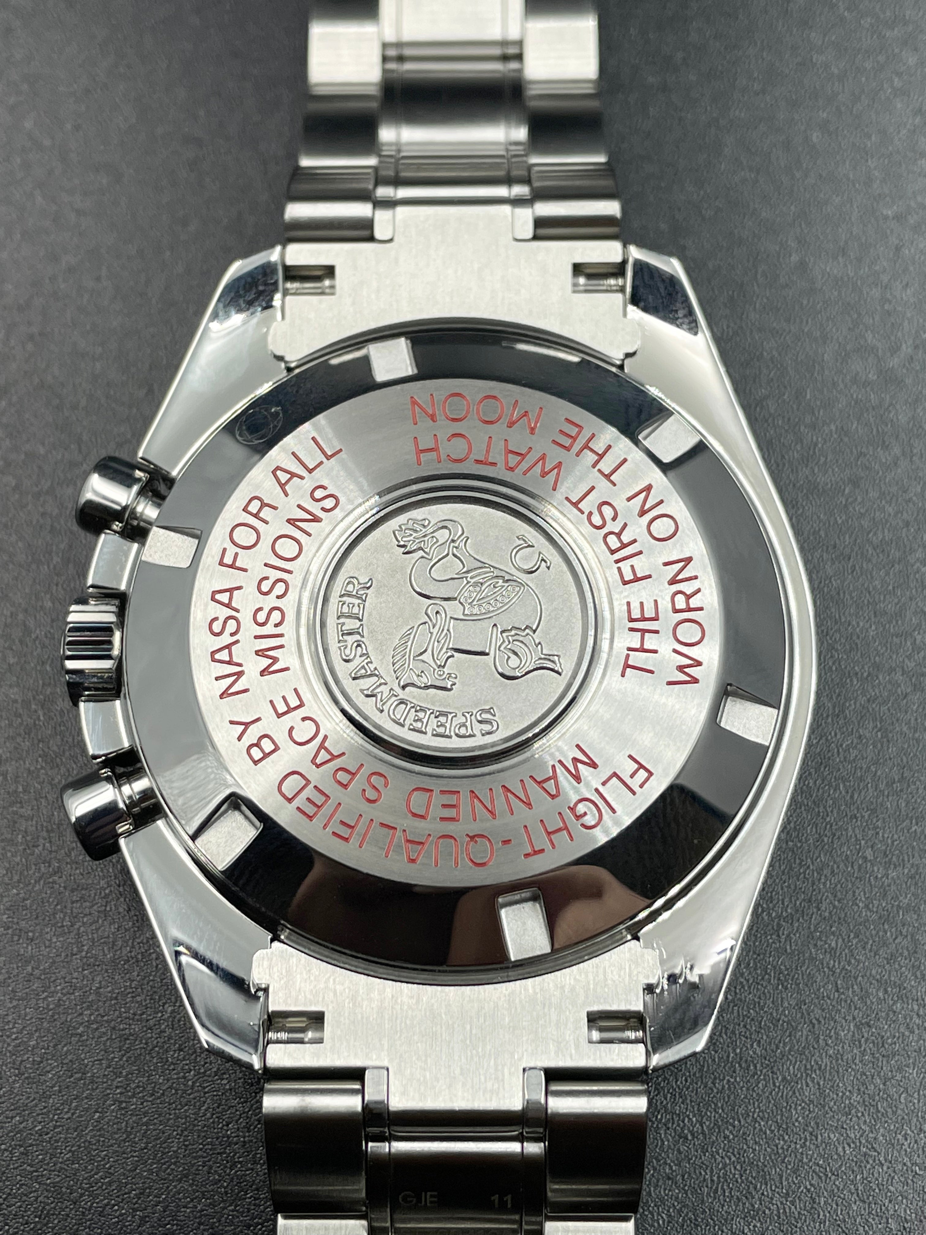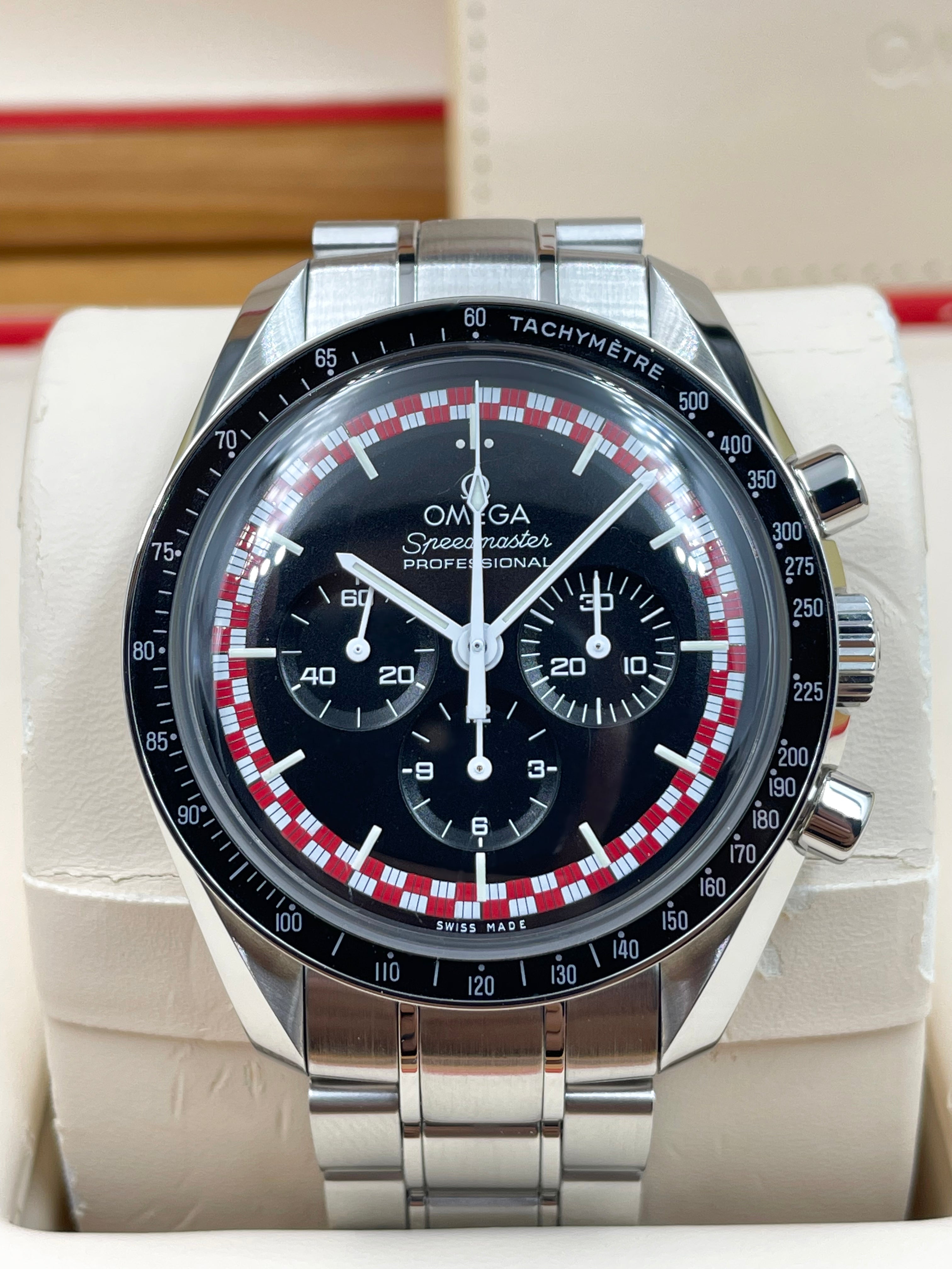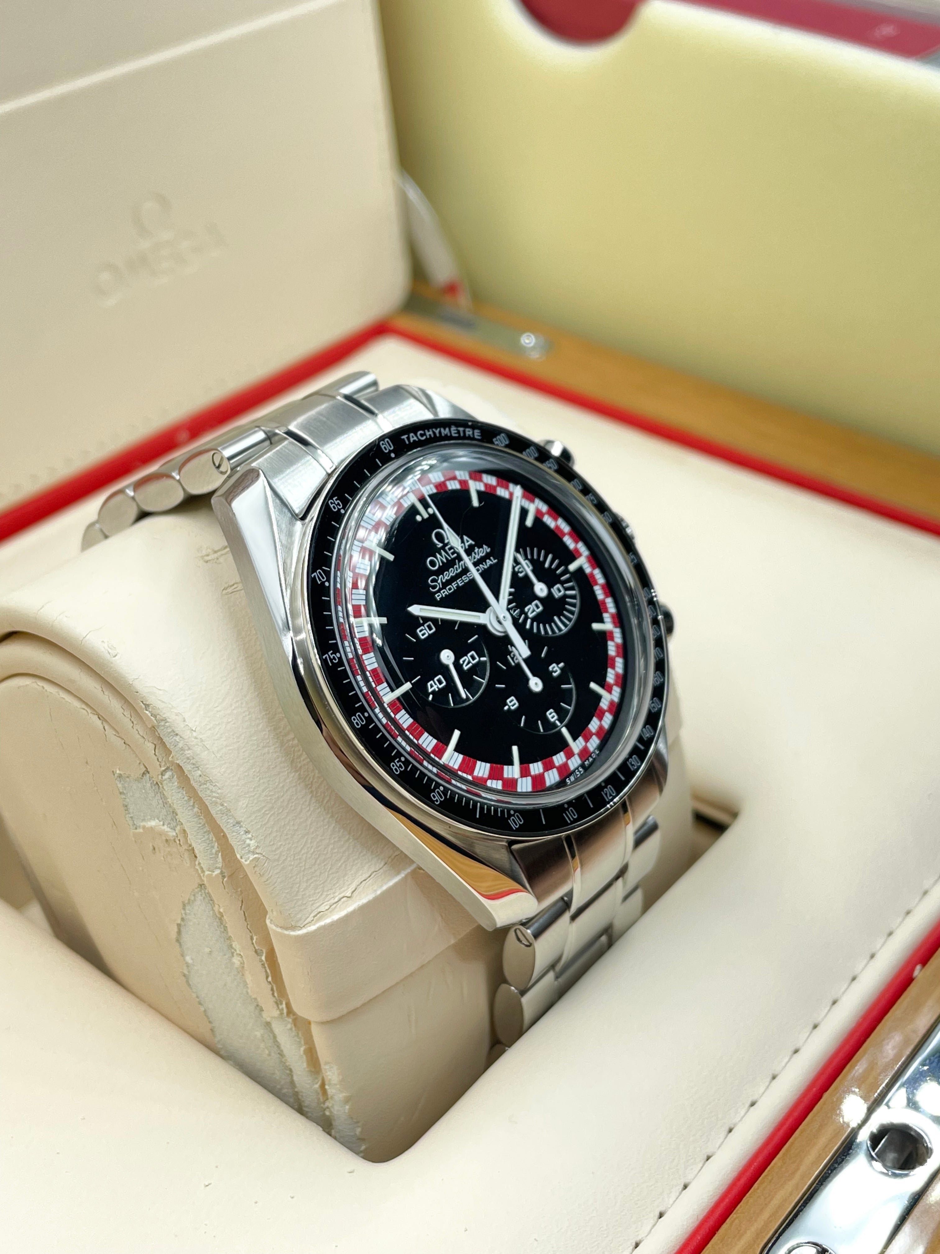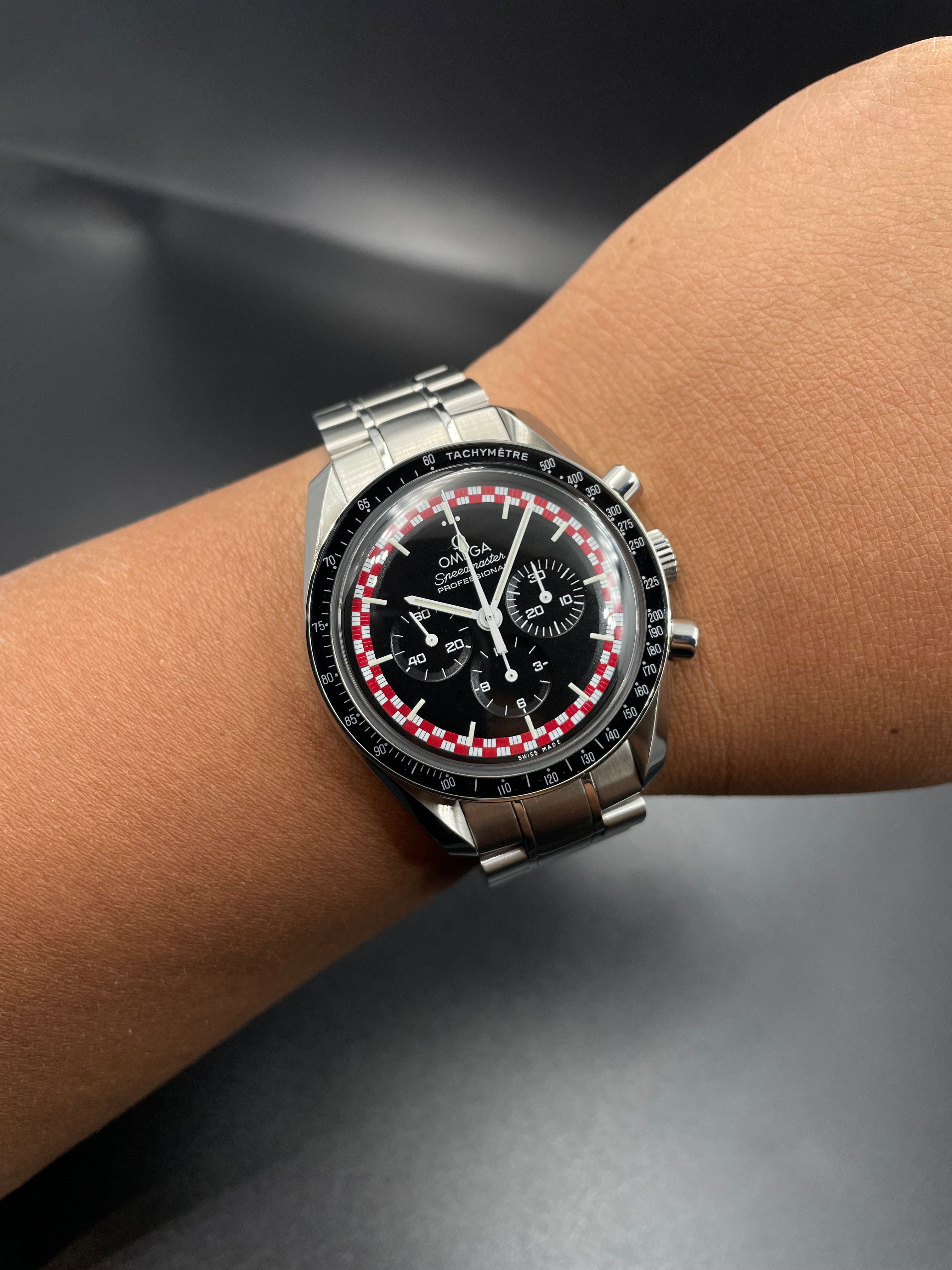 This version of the Moonwatch was released in 2013 and is coined the Tintin (after the famous Belgian comic character). It has a unique red & white racing motif on its dial - which is alike the design of the rocket in which Tintin famously goes to the Moon (refer to Adventures of Tintin - Destination Moon).