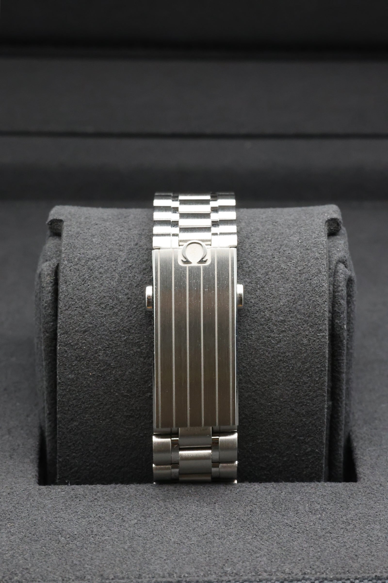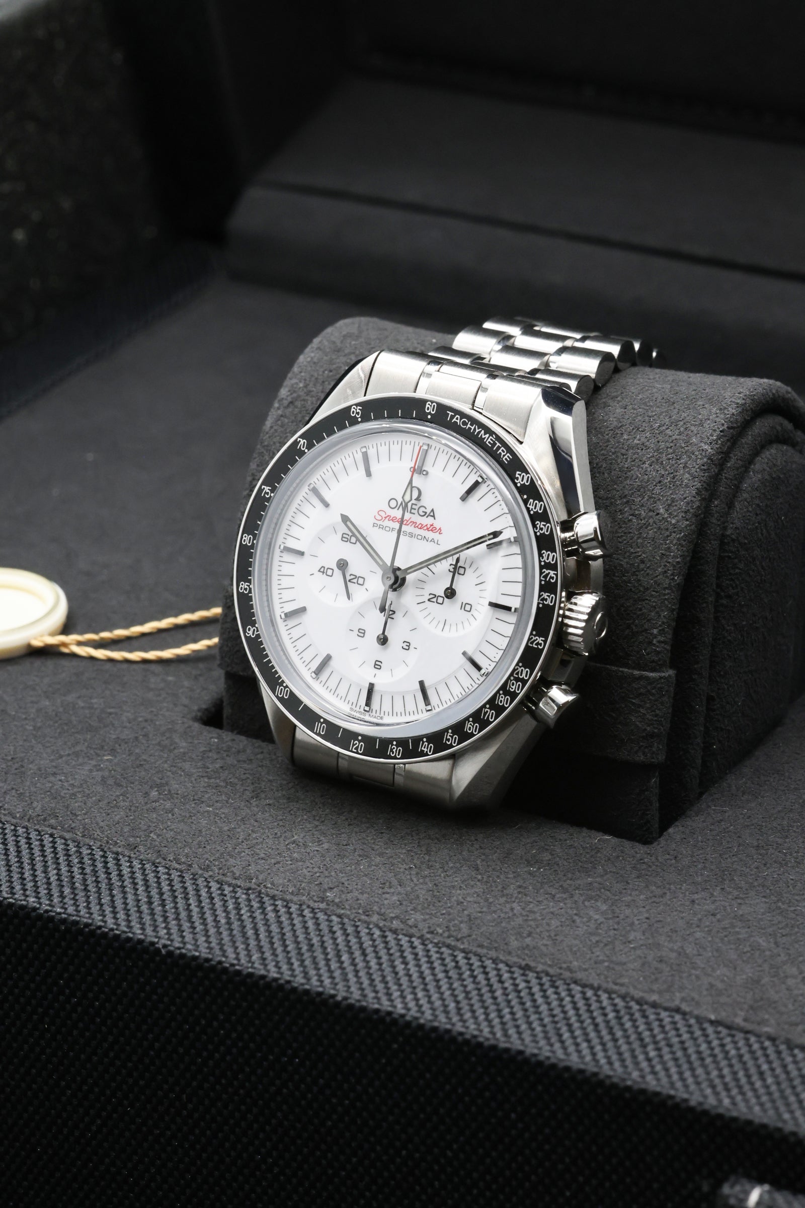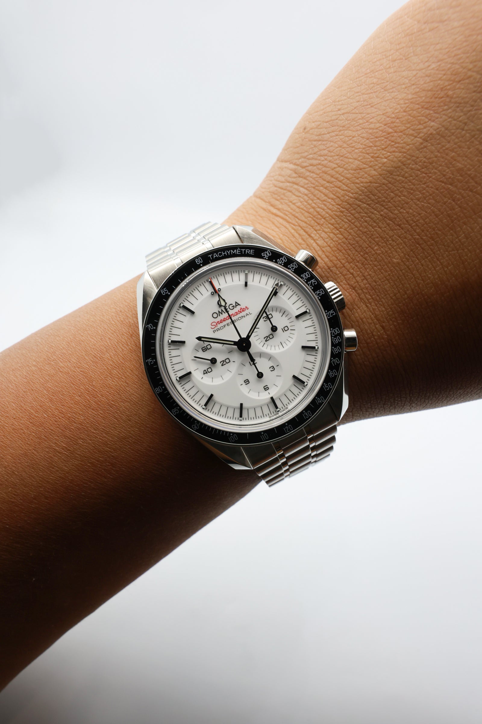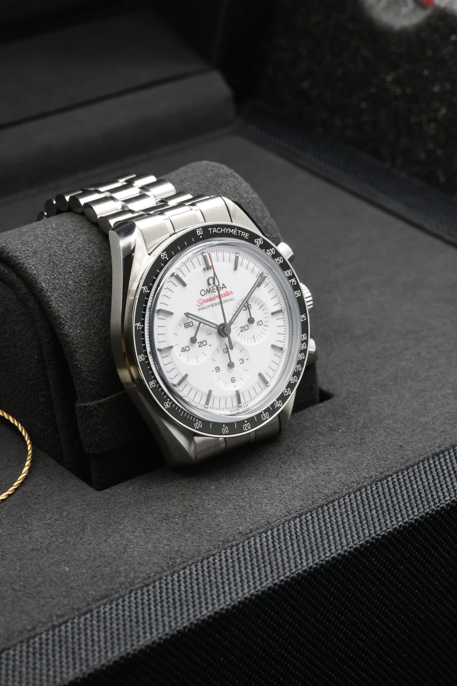 The watch’s 42mm stainless steel case stays true to the classic Moonwatch proportions, complete with Omega’s signature twisted lugs for a refined touch. The black anodized aluminum tachymeter bezel adds a bold contrast to the clean white dial, giving the timepiece a distinctive yet balanced appearance. Paired with a polished and brushed stainless steel bracelet, this model offers versatility and comfort, seamlessly transitioning between professional, casual, and adventurous occasions.