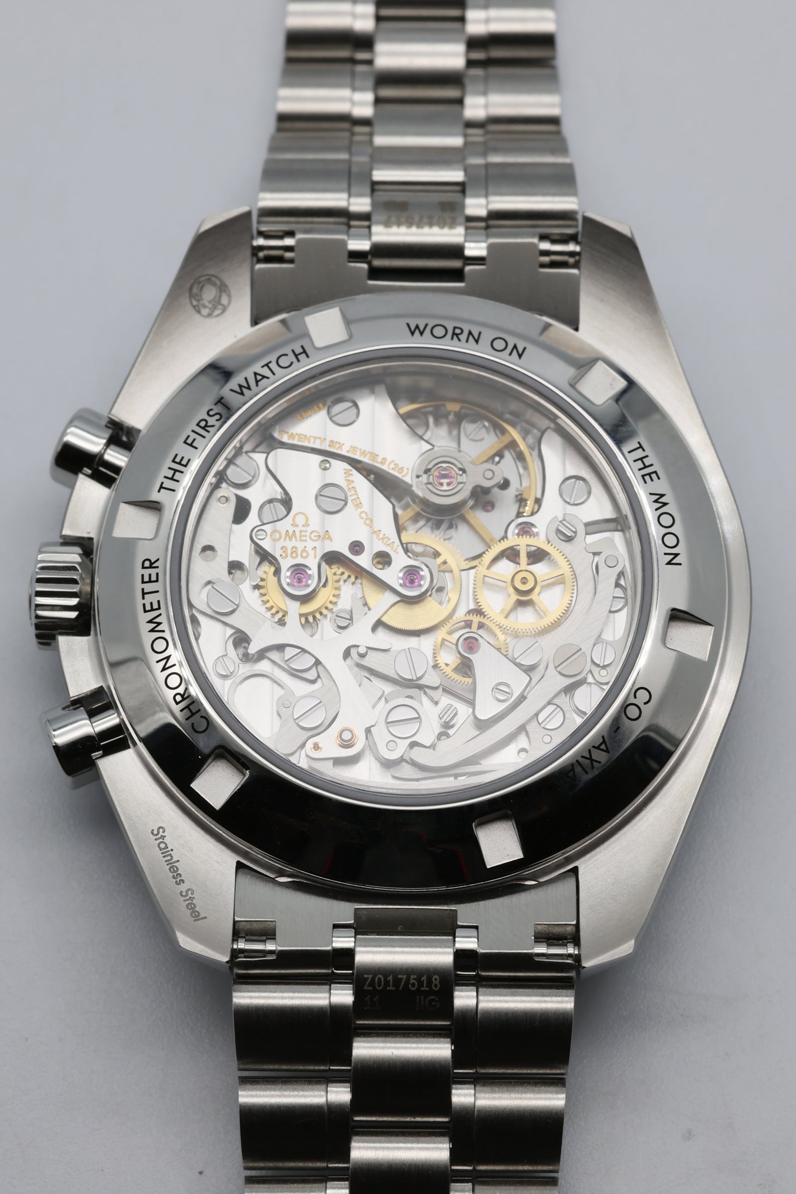 At the heart of the 310.30.42.50.04.001 is Omega’s Co-Axial Master Chronometer Calibre 3861, a state-of-the-art manual-winding movement. This upgrade combines the historical charm of the original Moonwatch with modern advancements, including a co-axial escapement, silicon balance spring, and METAS-certified precision and resistance to magnetic fields. With a 50-hour power reserve, the movement ensures reliability and performance, honoring the legacy of the Speedmaster while meeting today’s technical standards.