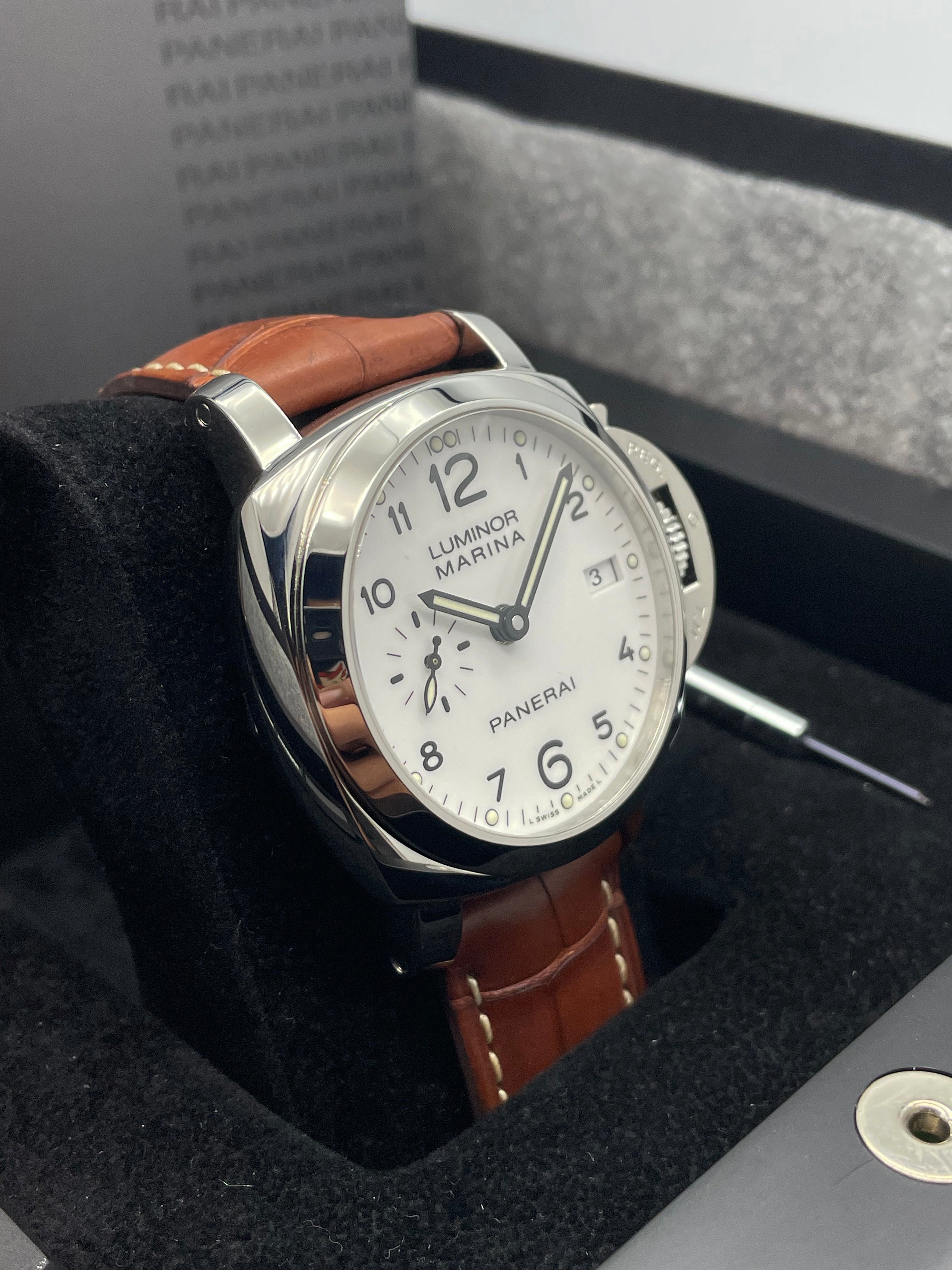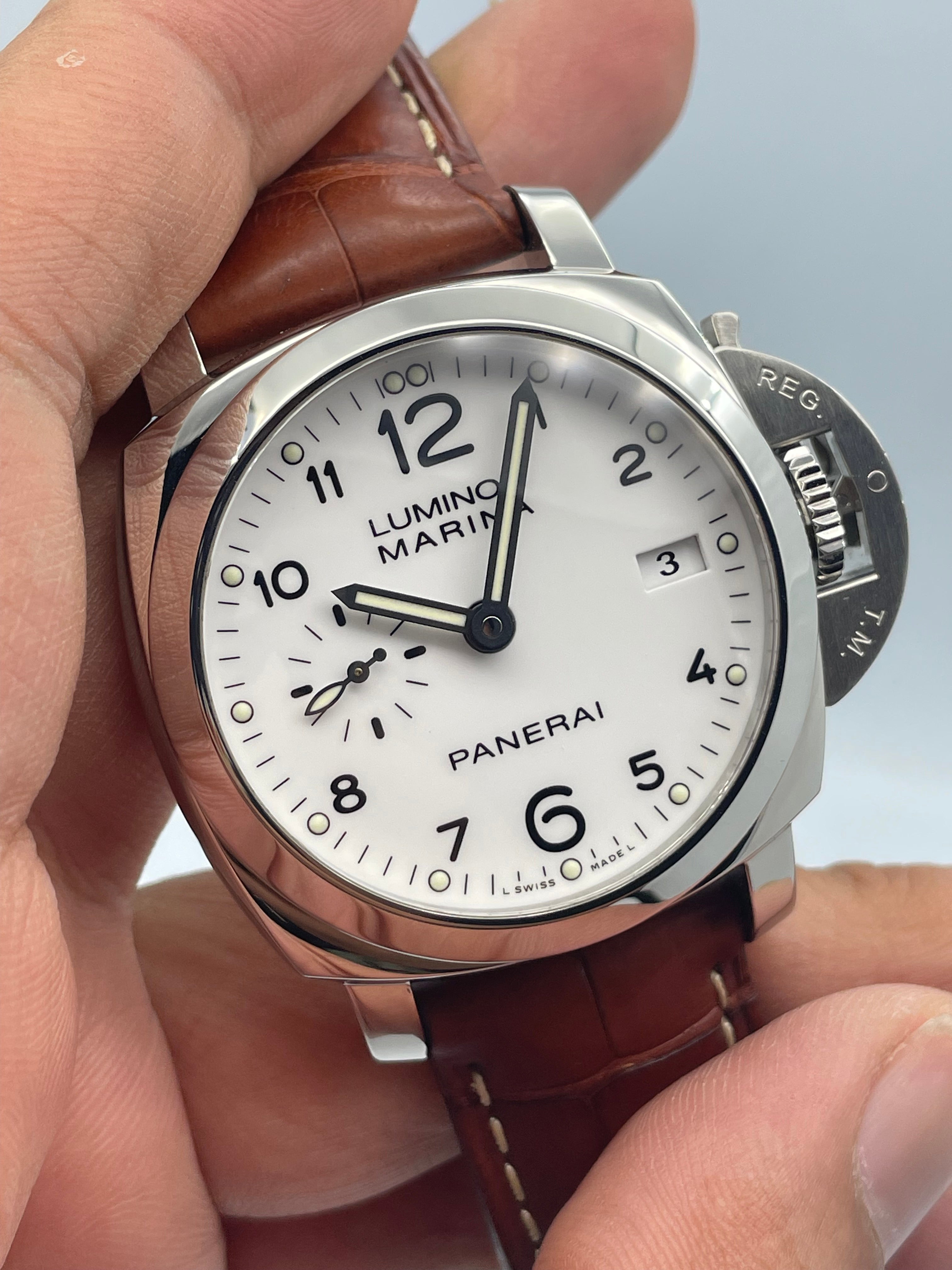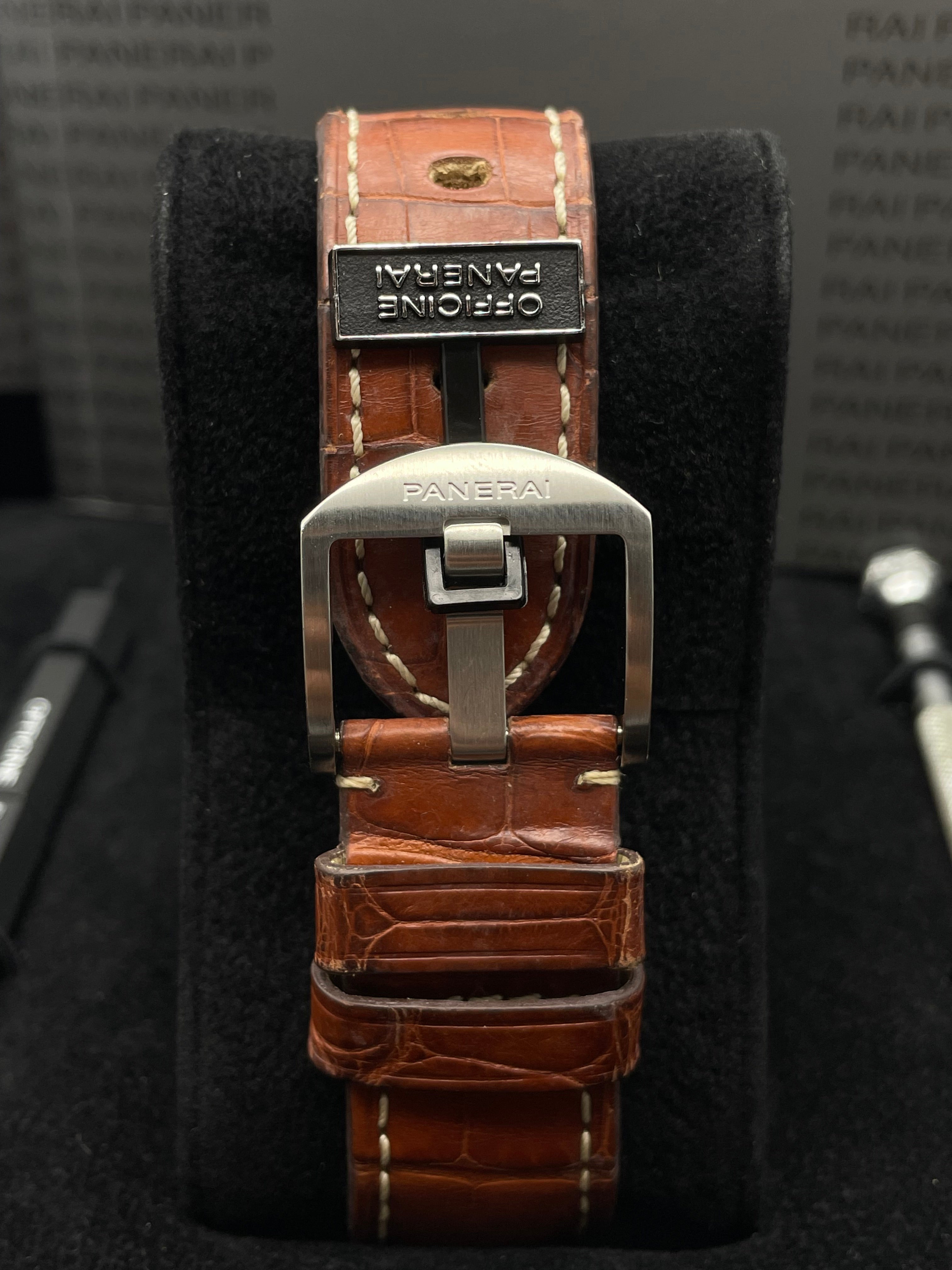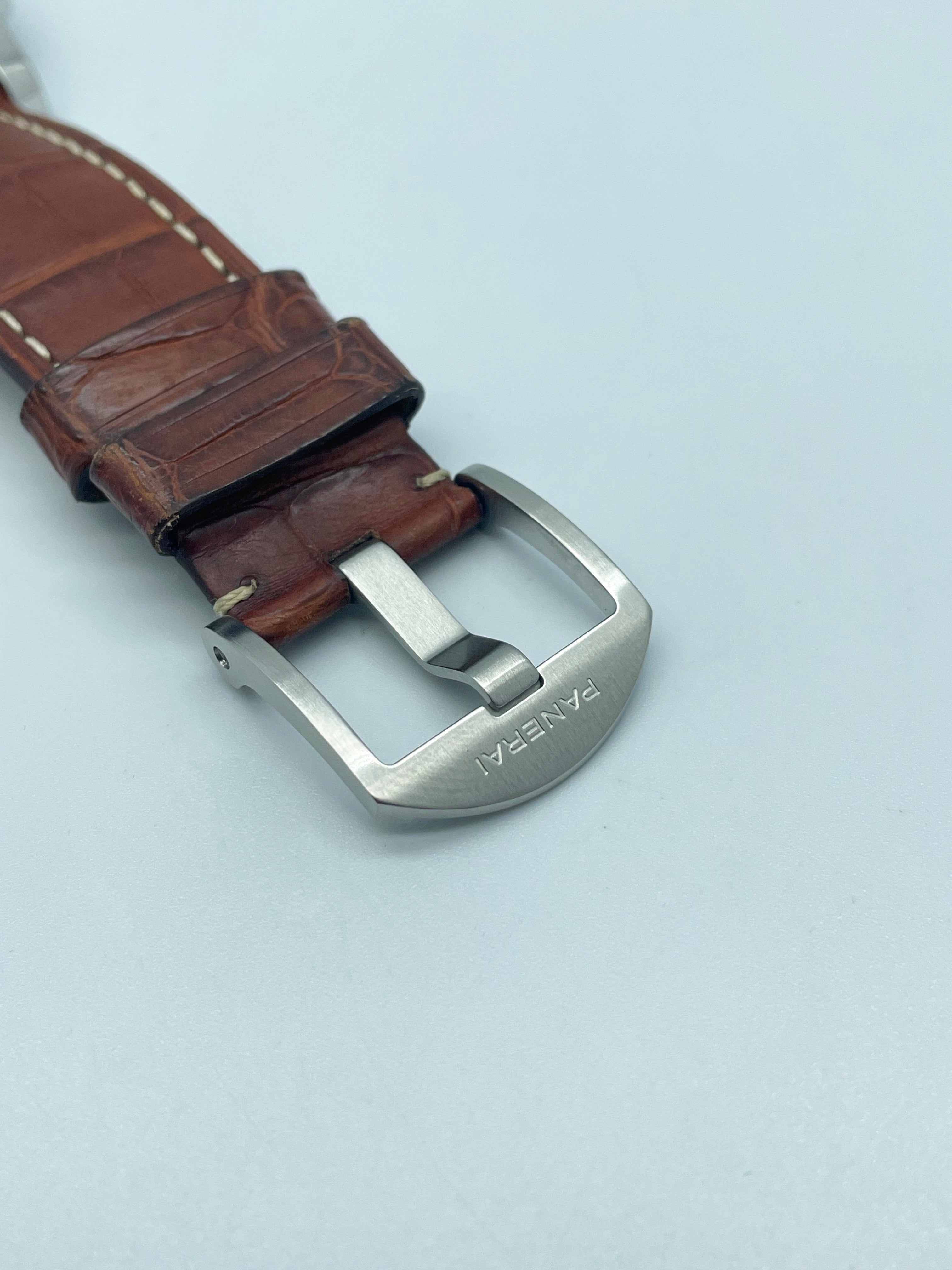 Paired with a luxurious brown alligator strap, the PAM00523 exudes a classic and sophisticated vibe. This choice of strap complements the white dial beautifully, adding a touch of warmth and contrast to the stainless steel case. The combination of the watch’s heritage-inspired design and modern functionality makes it an appealing choice for Panerai enthusiasts who appreciate both form and function in a more modest size.