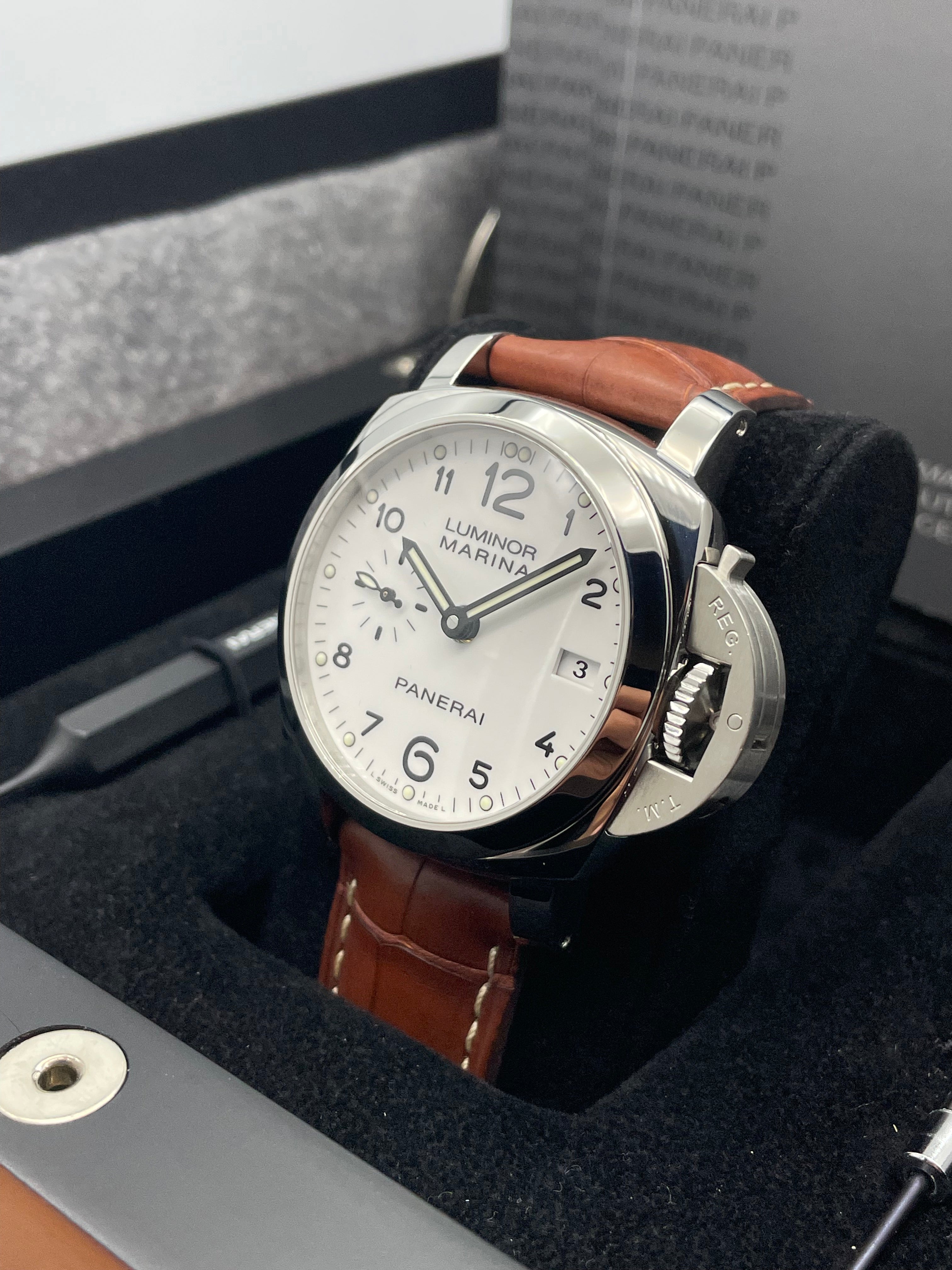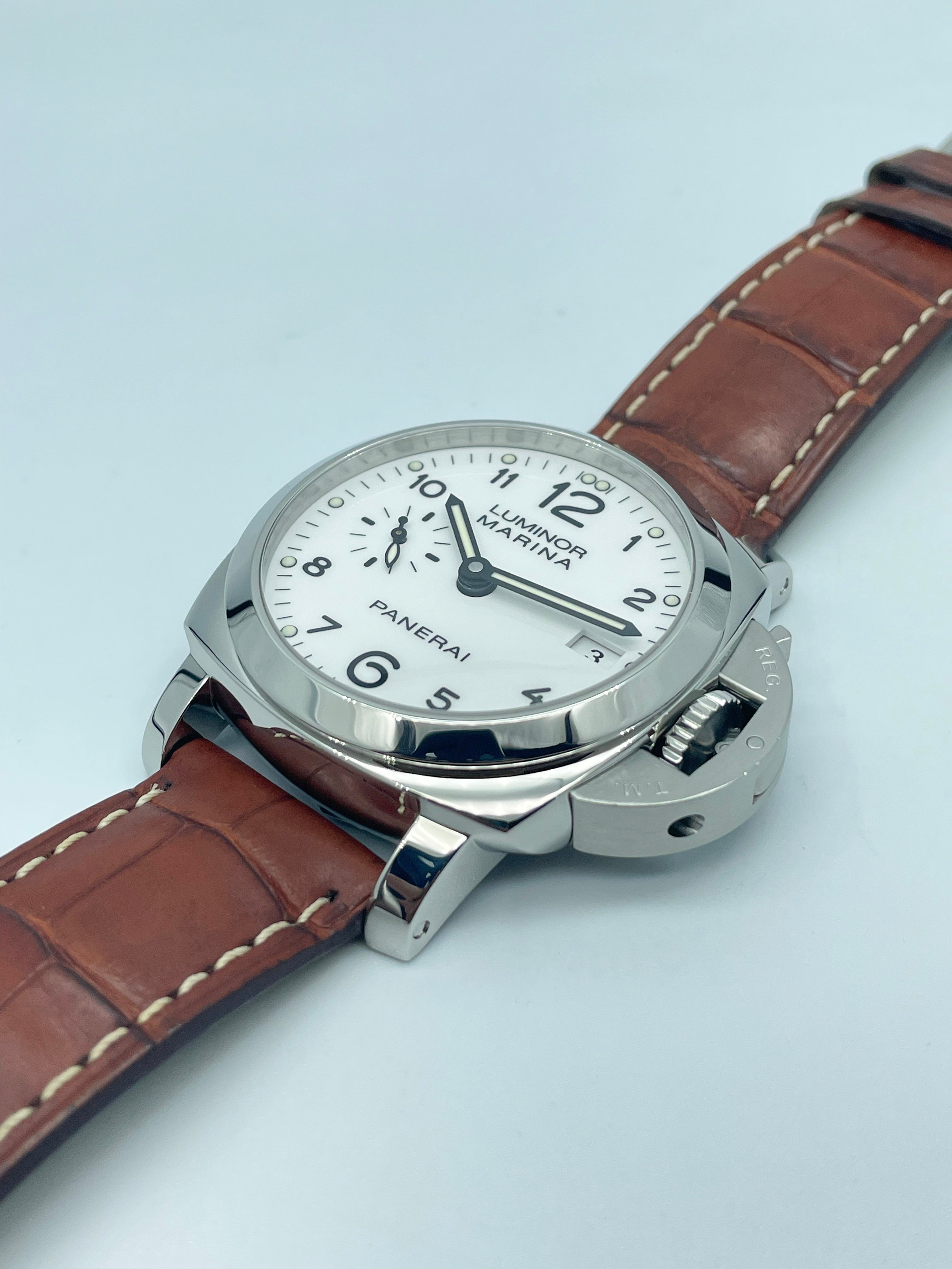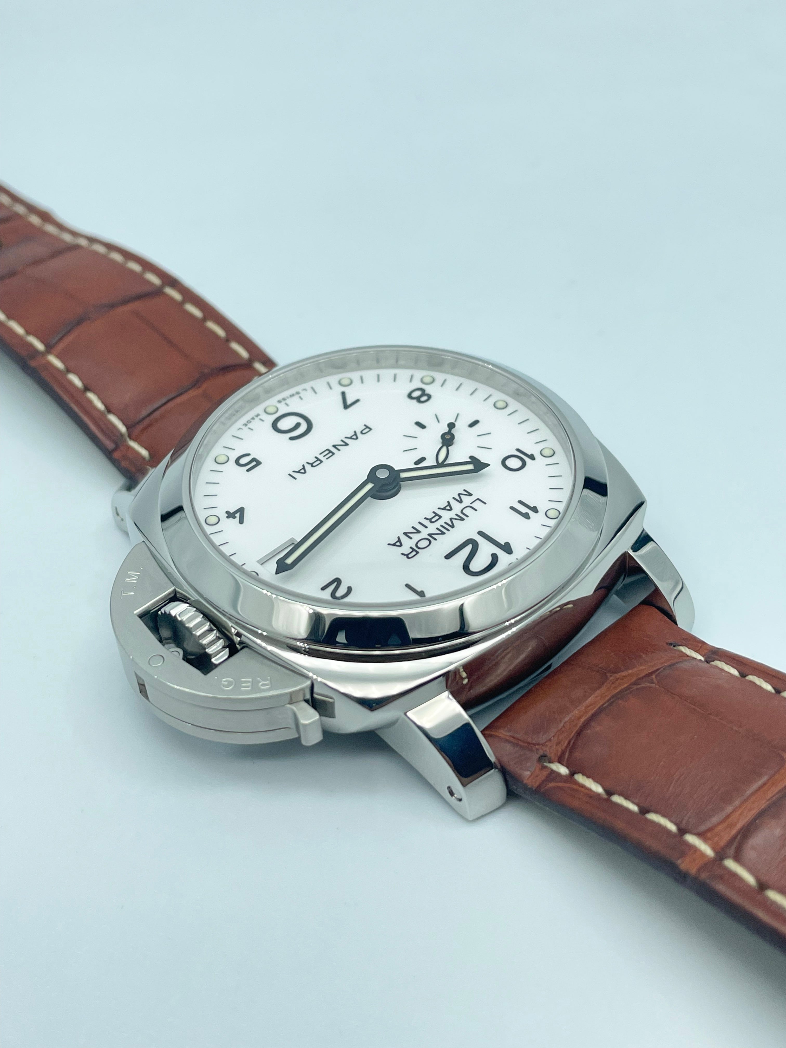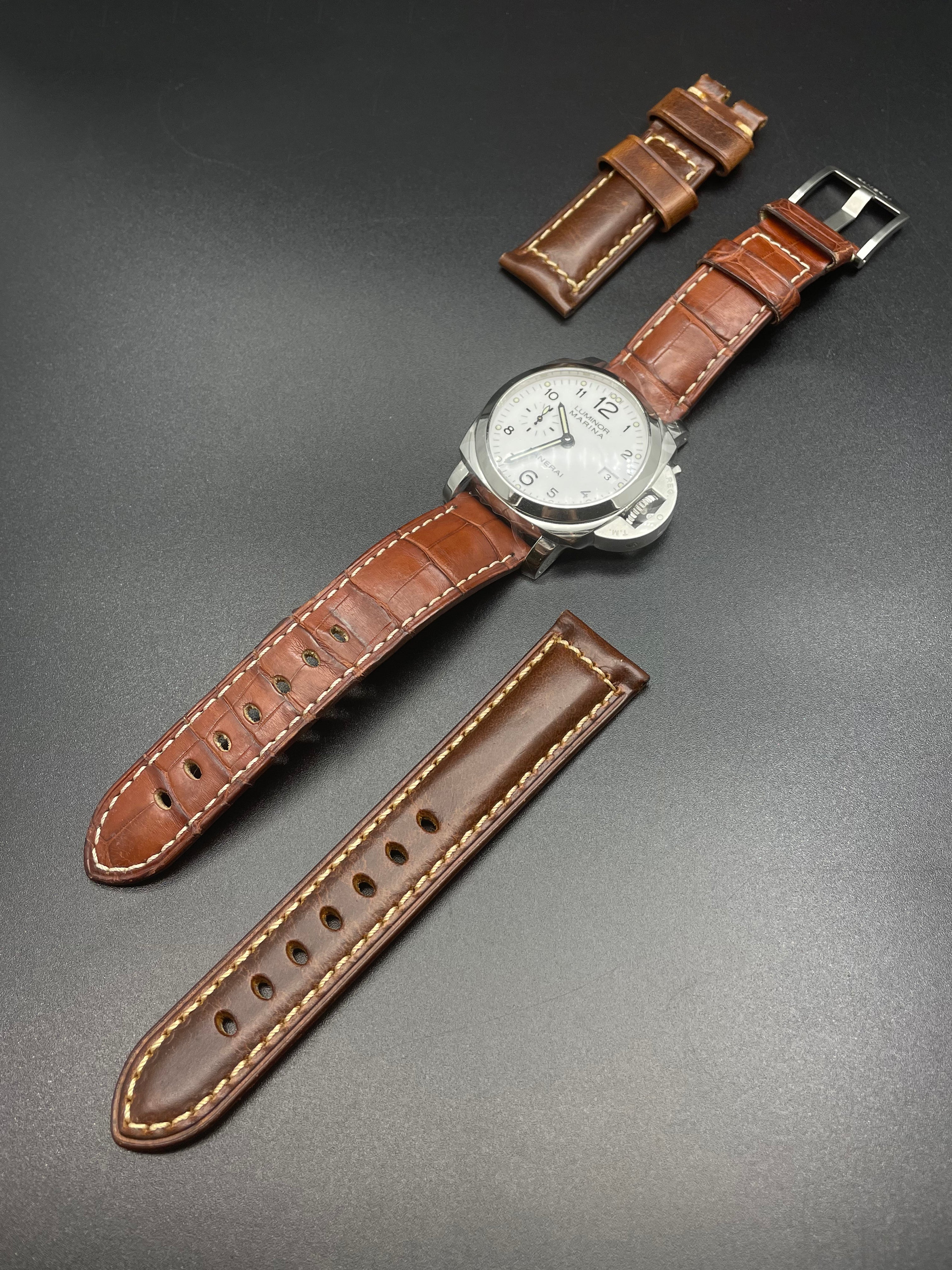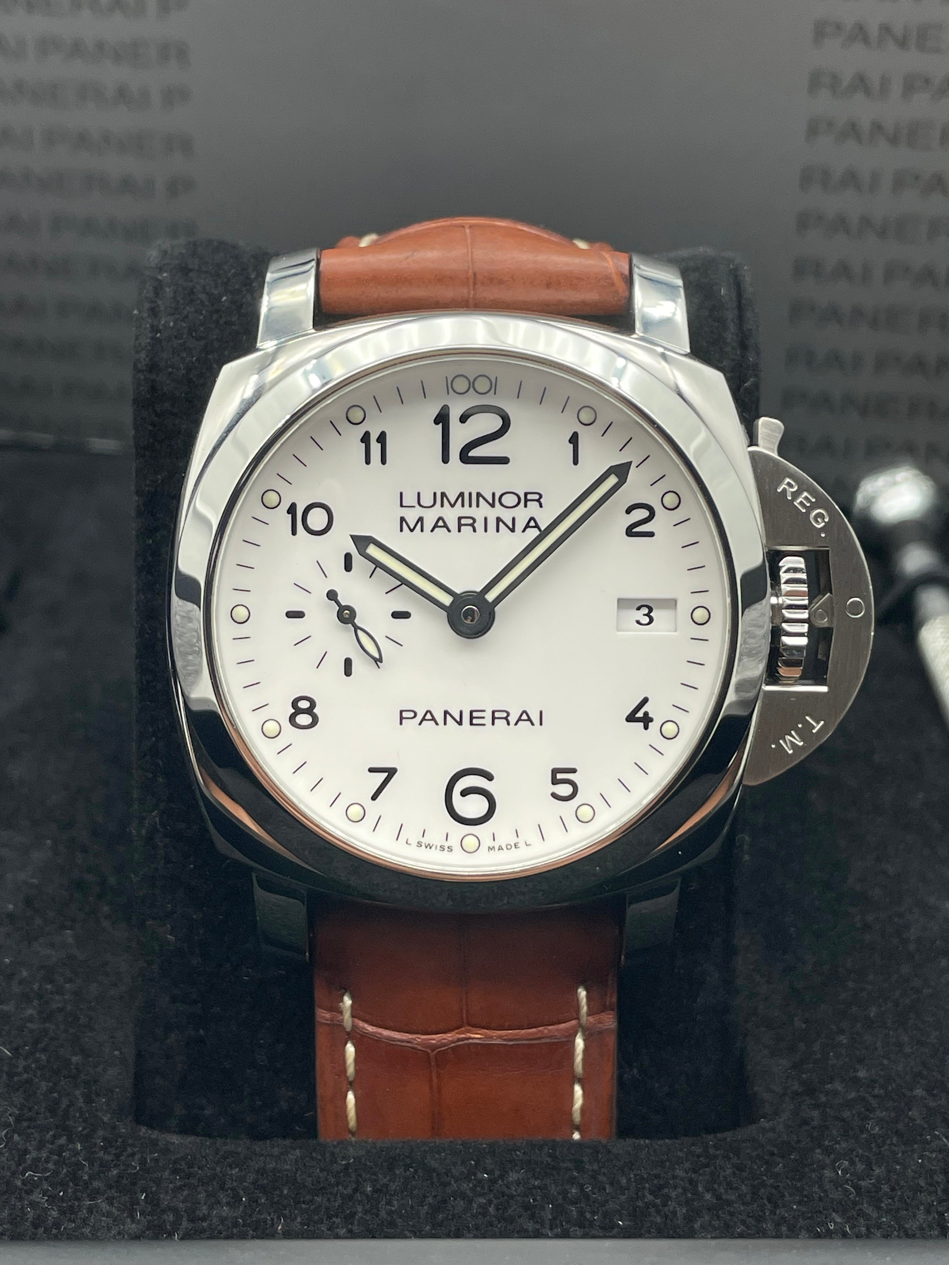 Paired with a luxurious brown alligator strap, the PAM00523 exudes a classic and sophisticated vibe. This choice of strap complements the white dial beautifully, adding a touch of warmth and contrast to the stainless steel case. The combination of the watch’s heritage-inspired design and modern functionality makes it an appealing choice for Panerai enthusiasts who appreciate both form and function in a more modest size.