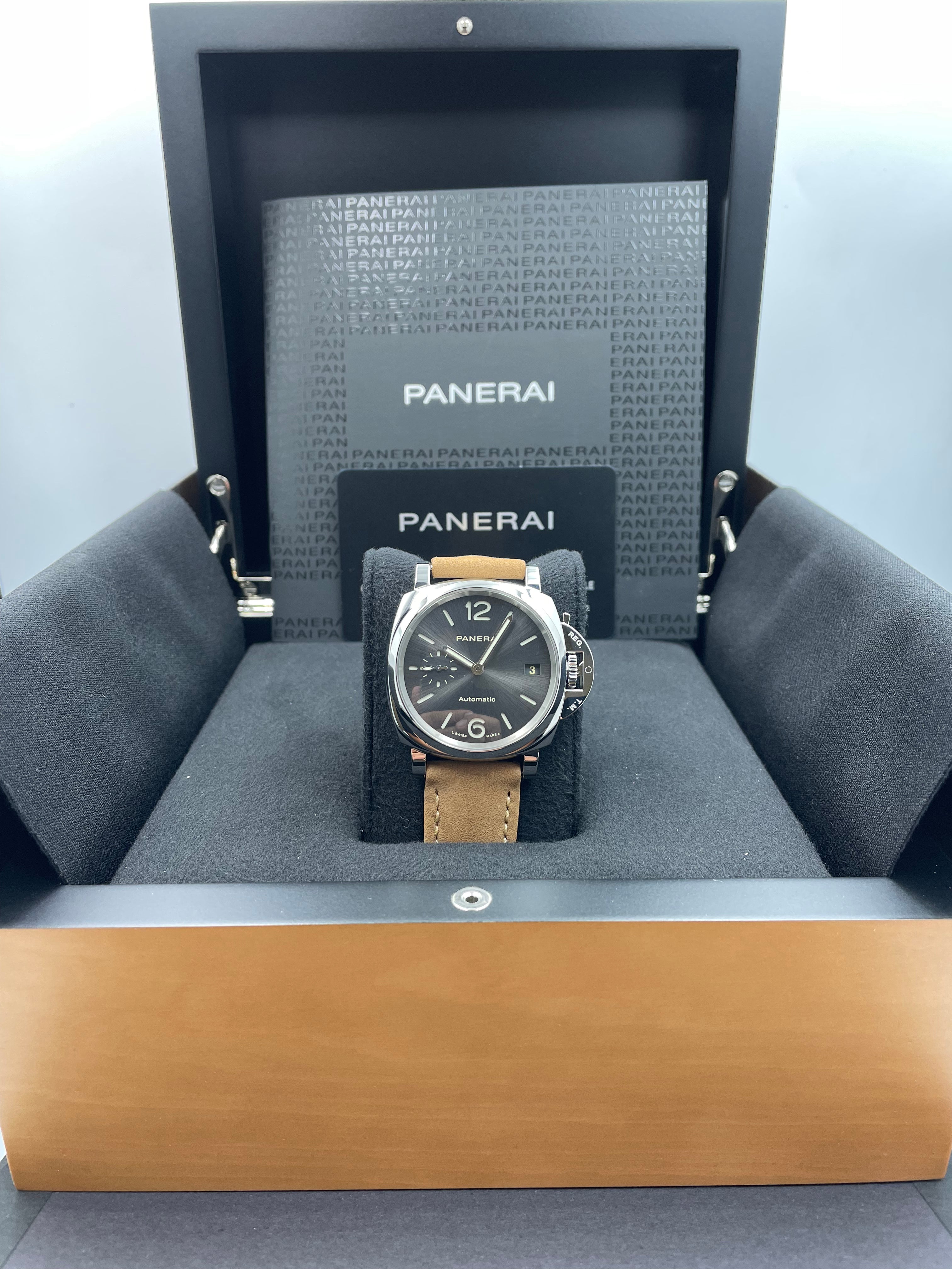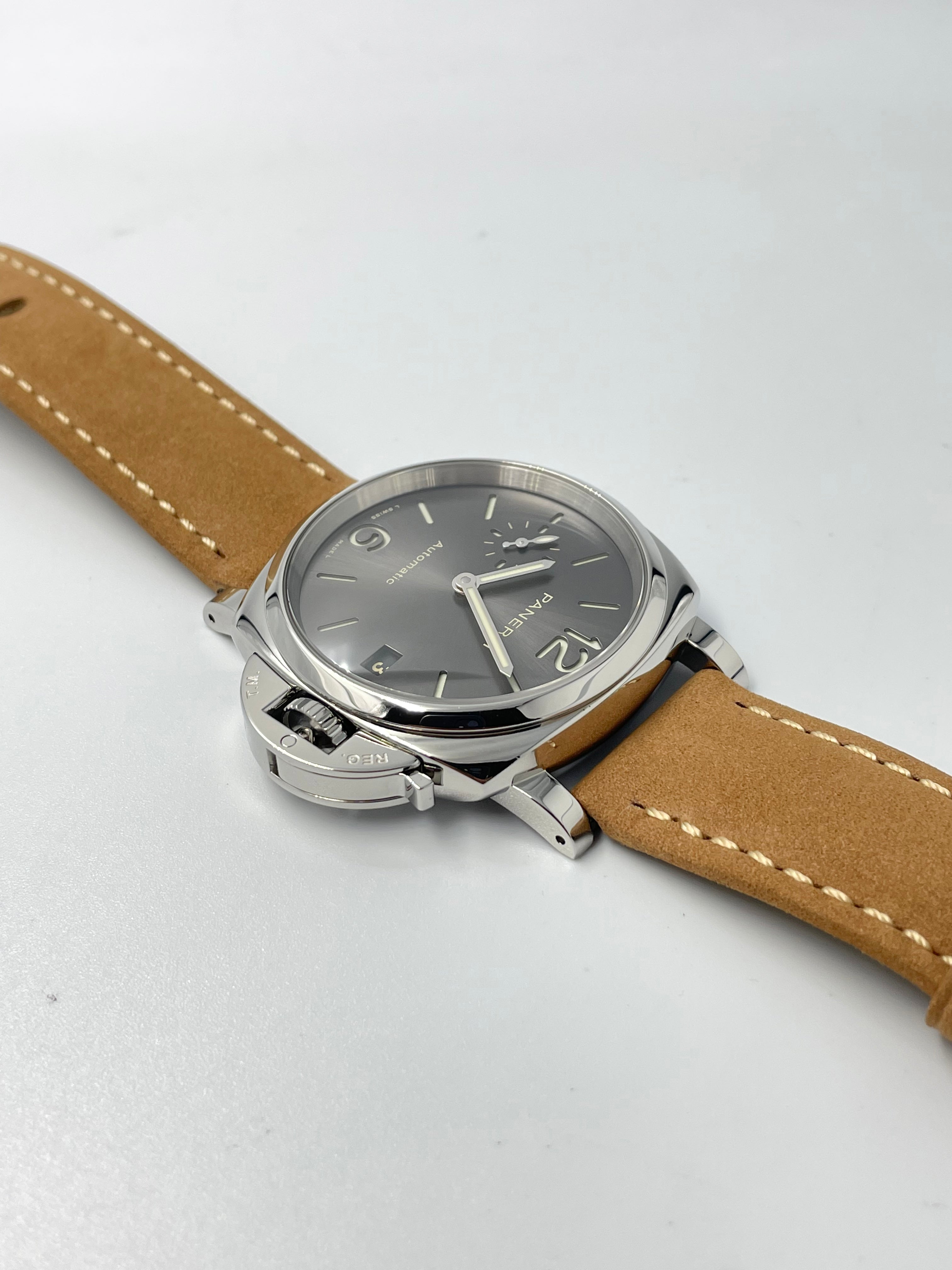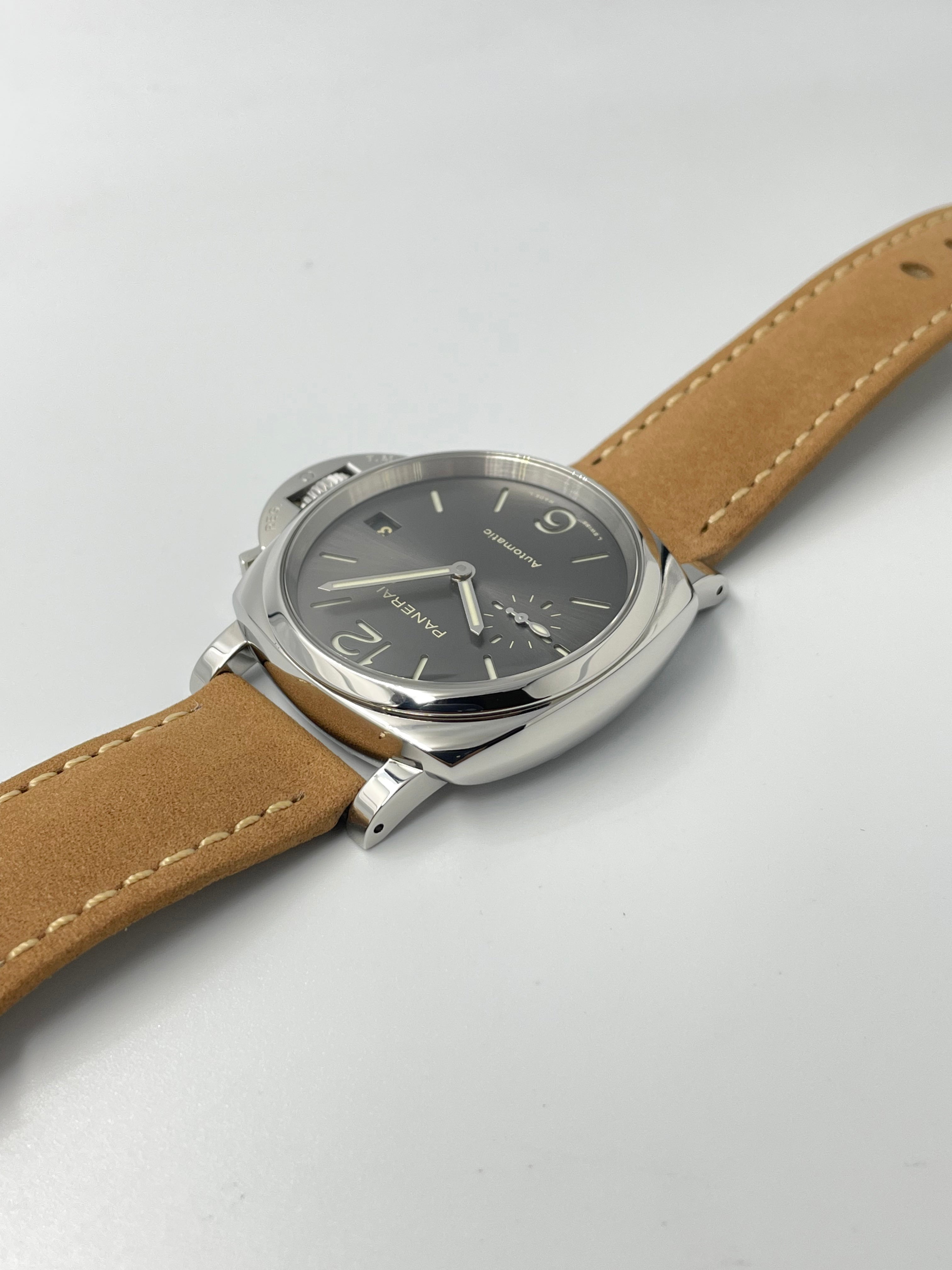 The 38mm stainless steel case exhibits Panerai's signature cushion shape and clean styling focused on legibility. The sunbrushed anthracite gray dial features luminous sword hands, a small seconds subdial, and a date window.