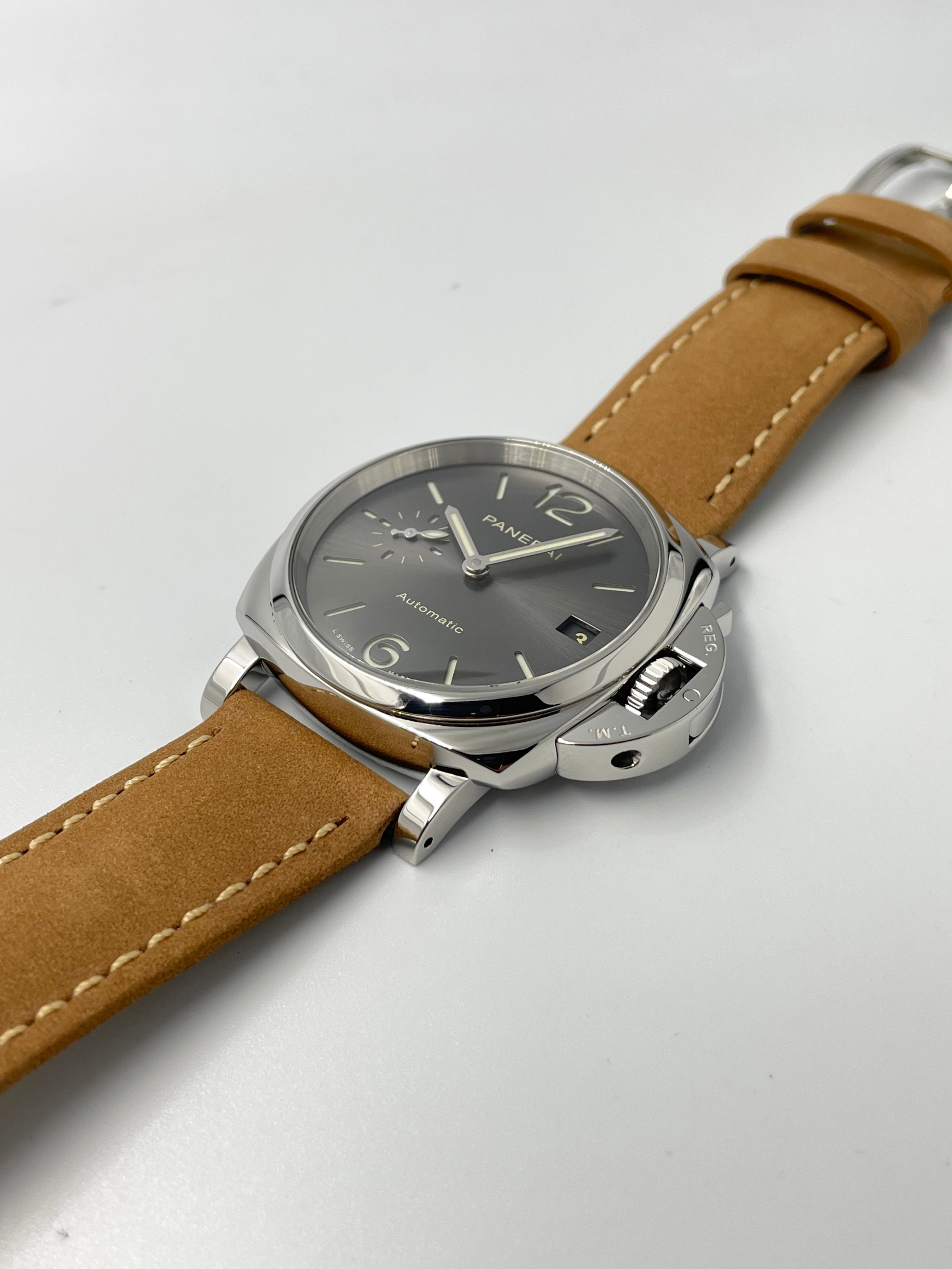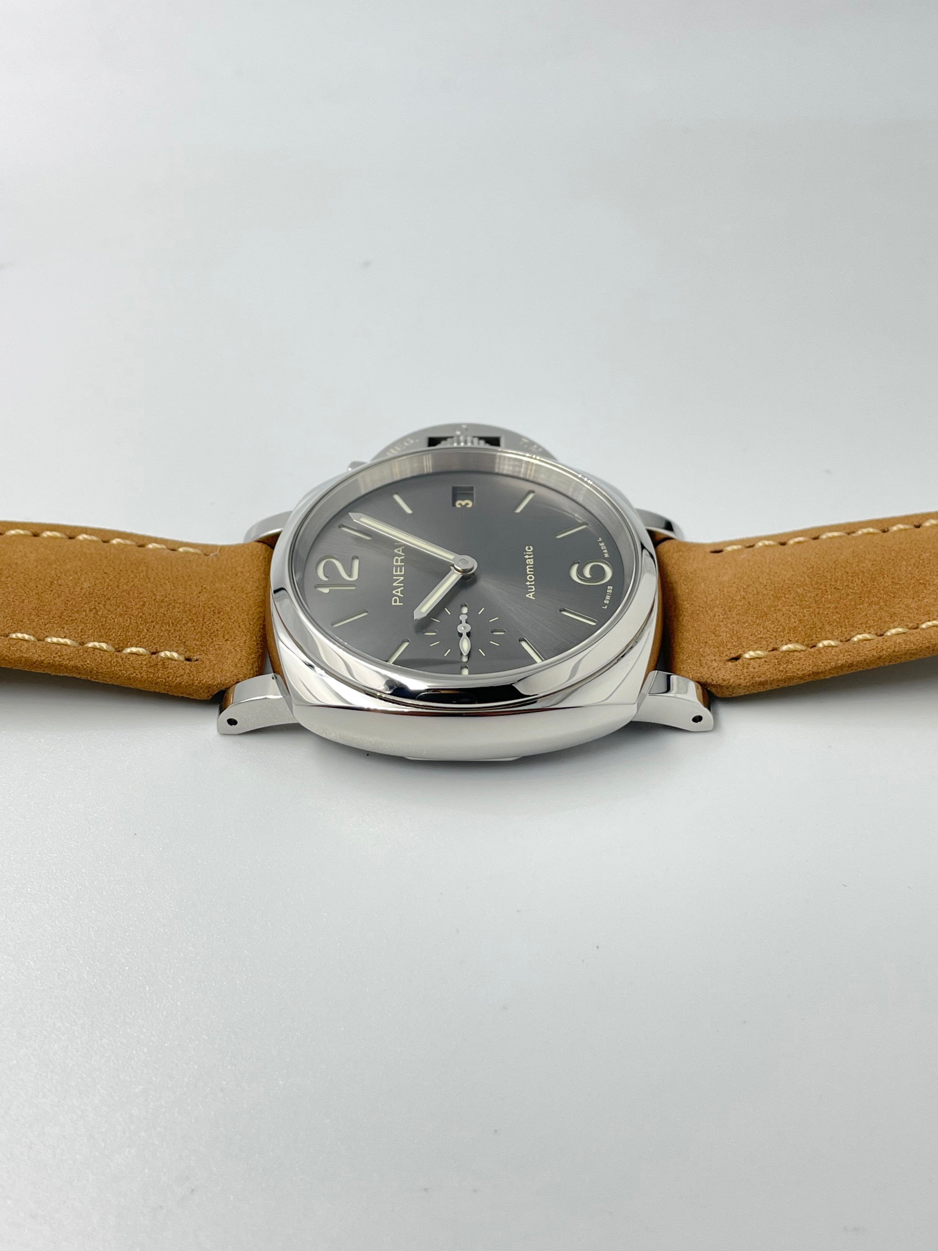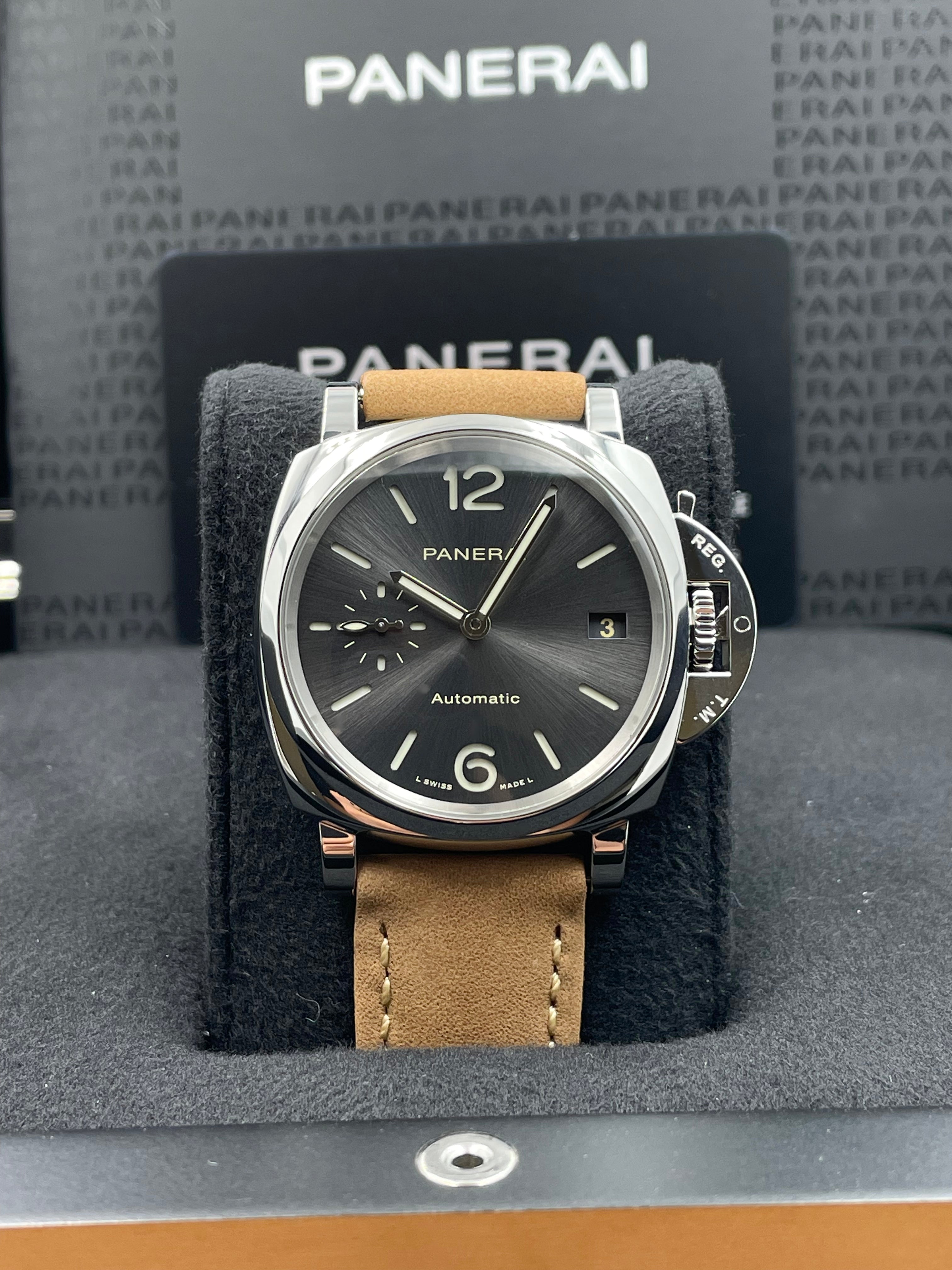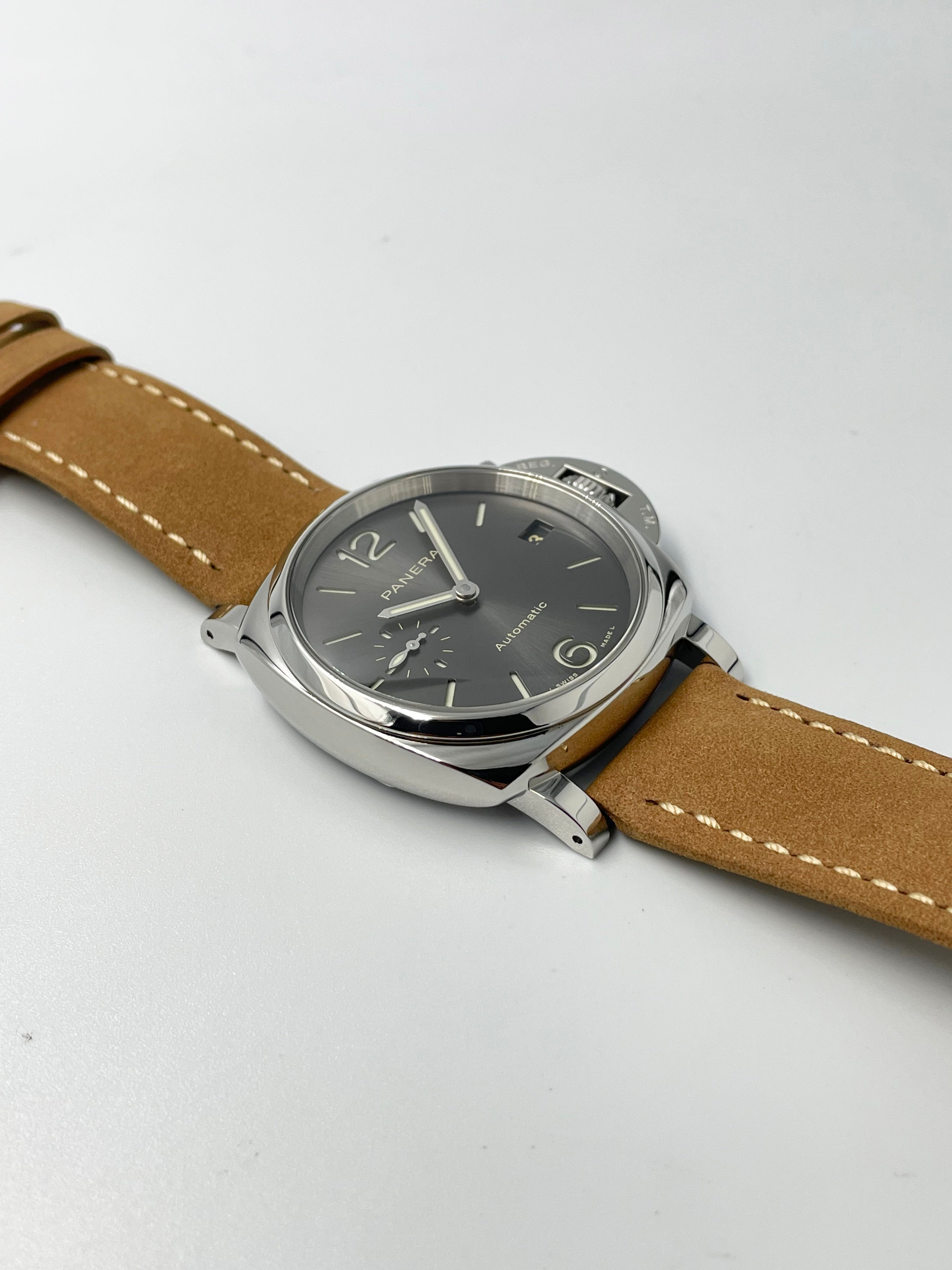 The 38mm stainless steel case exhibits Panerai's signature cushion shape and clean styling focused on legibility. The sunbrushed anthracite gray dial features luminous sword hands, a small seconds subdial, and a date window.