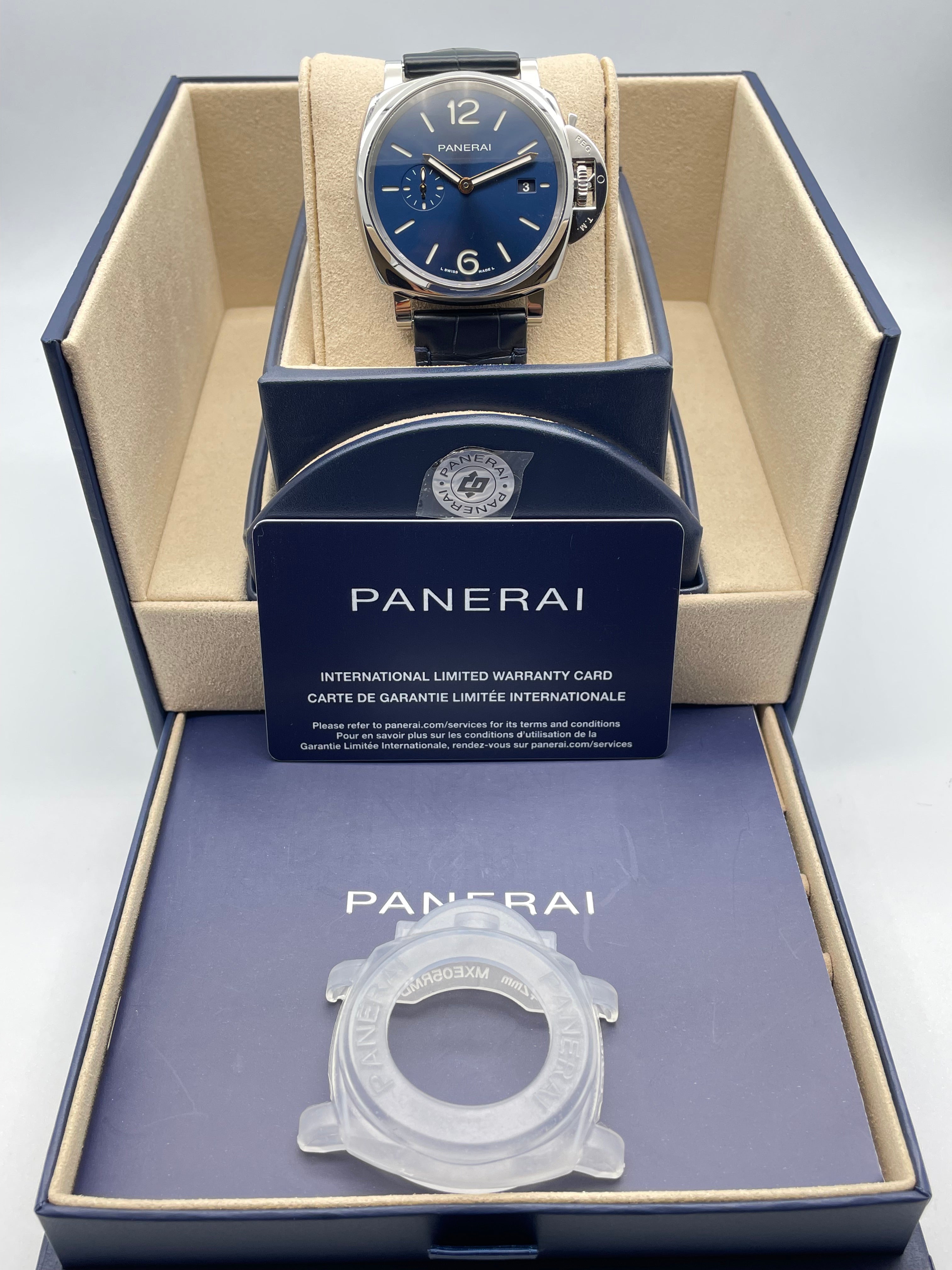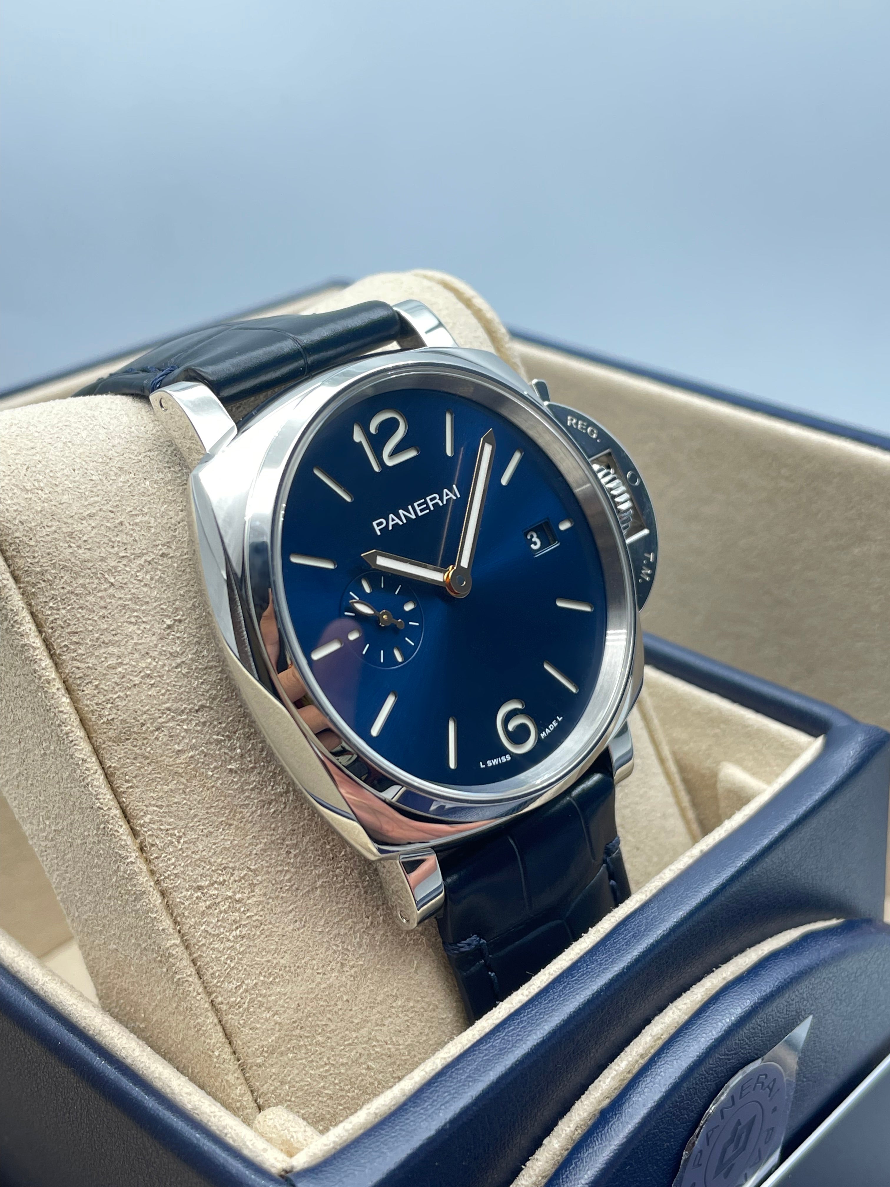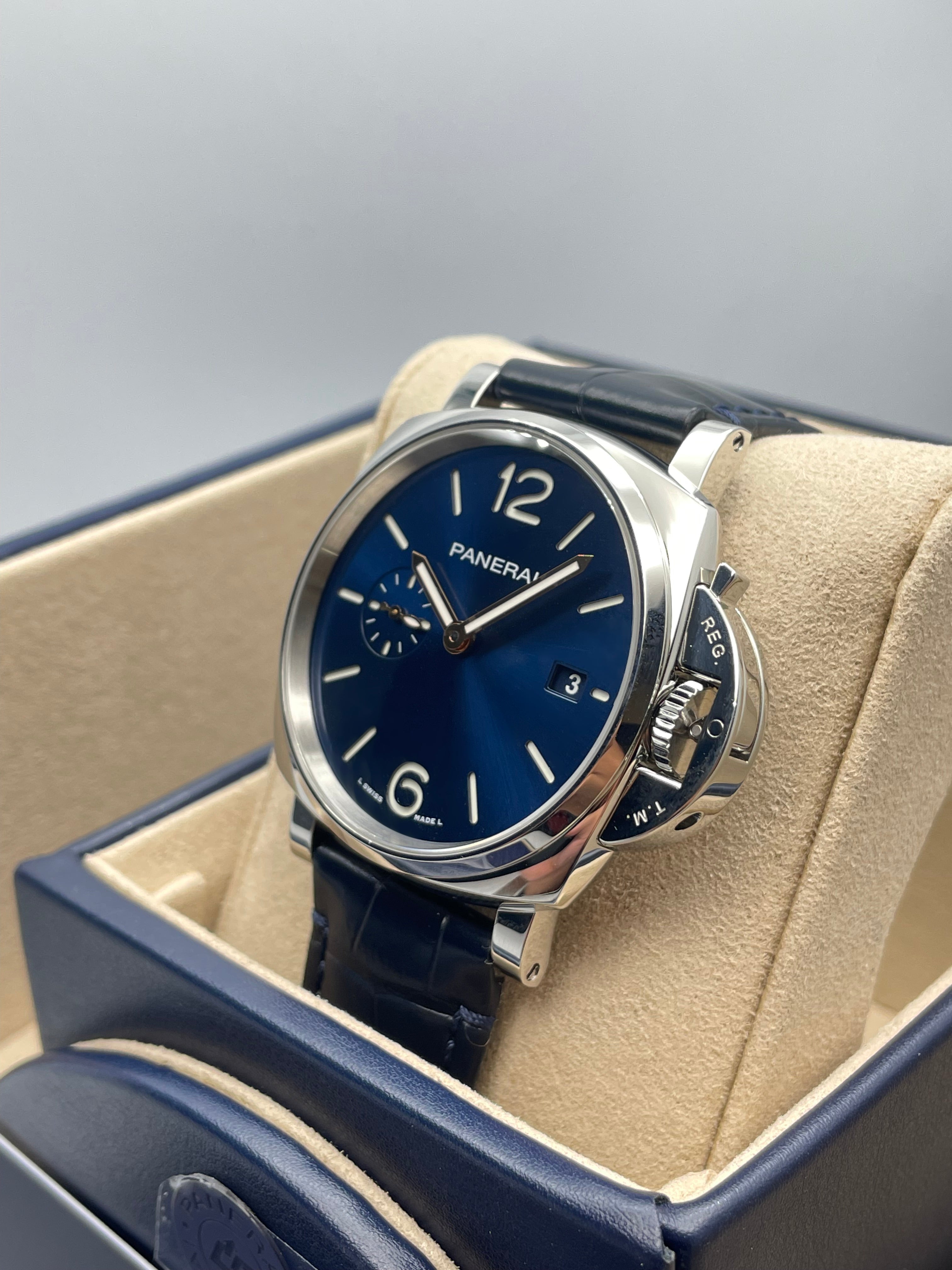 The Panerai Luminor Due 42mm PAM01429 is a sleek and modern interpretation of Panerai's iconic Luminor design, reimagined with a more refined and versatile aesthetic. At 42mm, the case is significantly slimmer than traditional Luminor models, making it more wearable for those with smaller wrists or those seeking a more elegant daily watch. Crafted in stainless steel, the watch maintains Panerai’s signature cushion-shaped case and prominent crown guard, which give it that unmistakable Luminor look, but with a contemporary touch suited for both casual and formal settings.