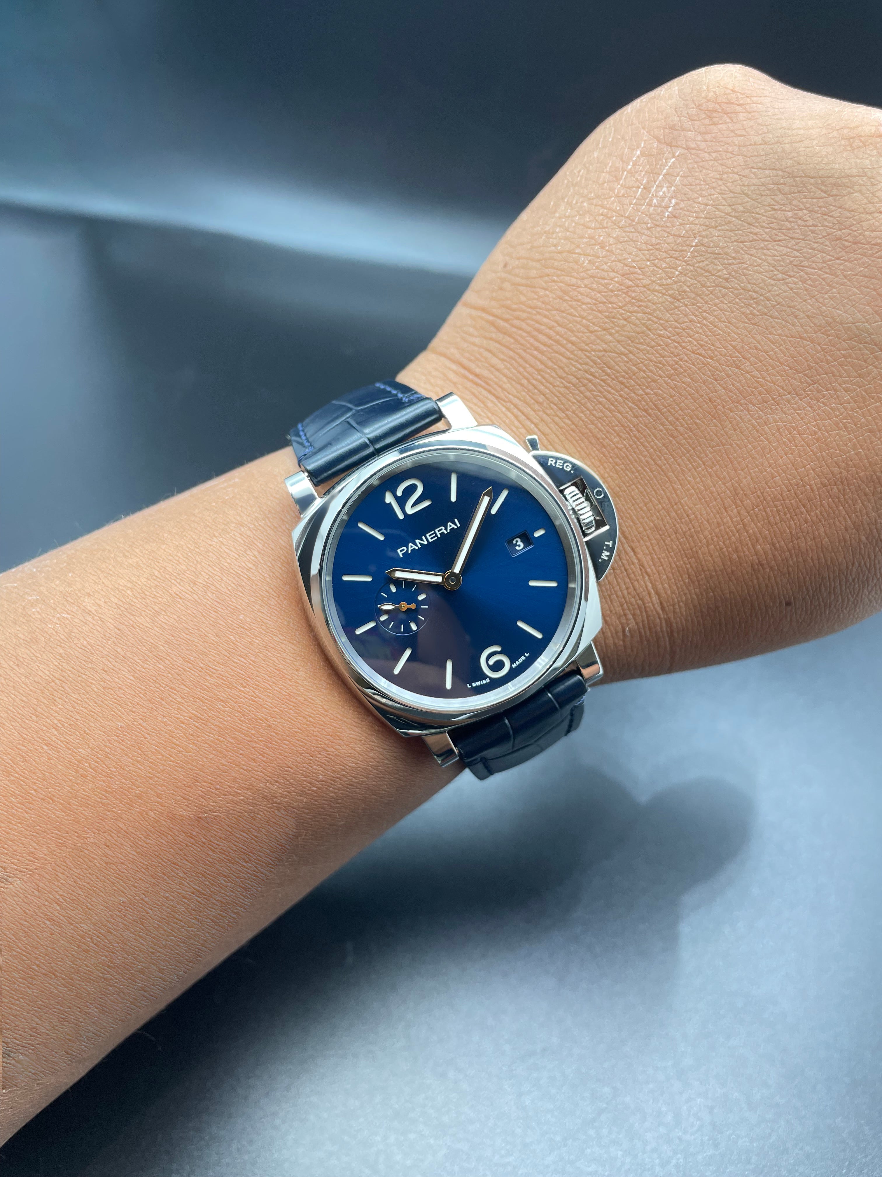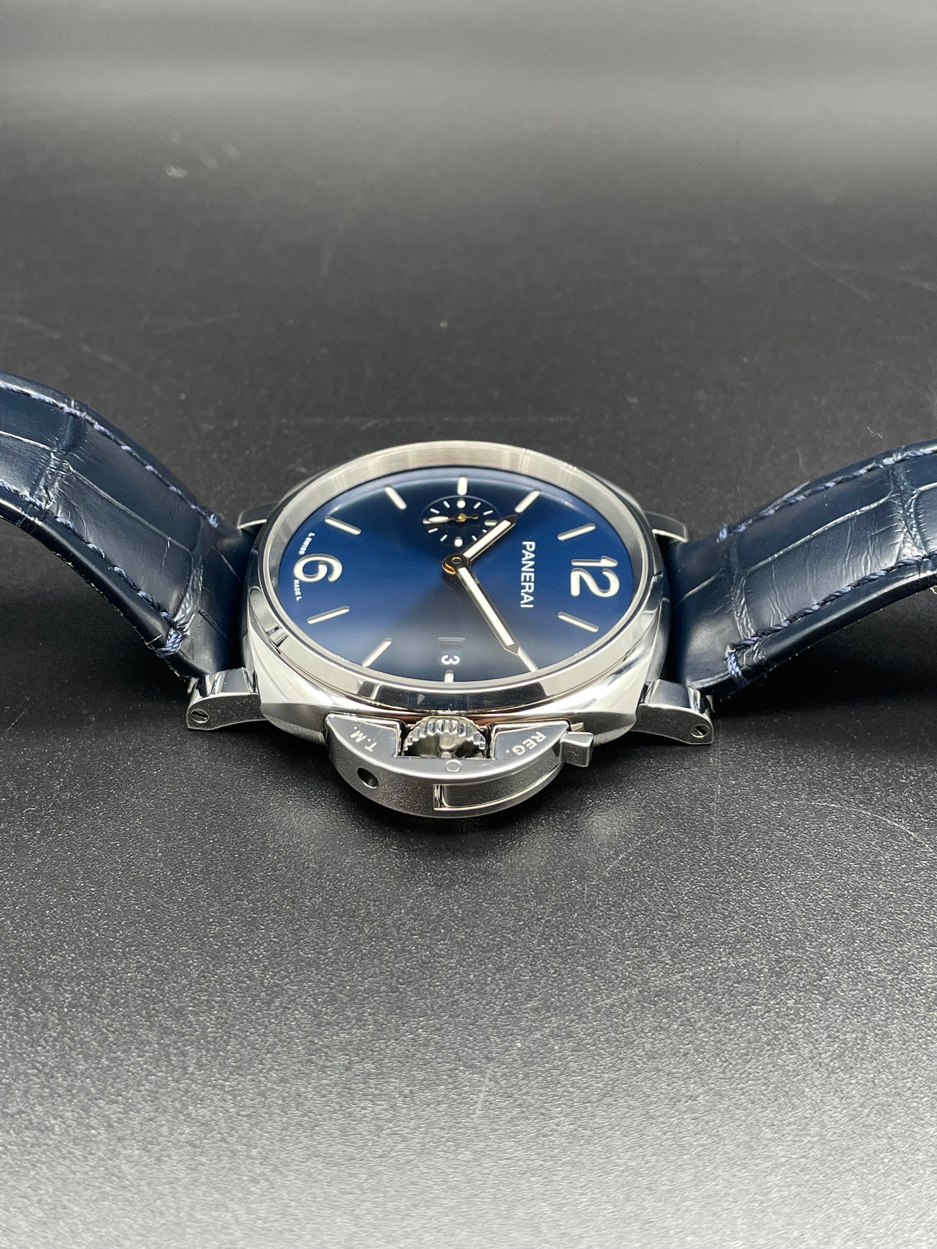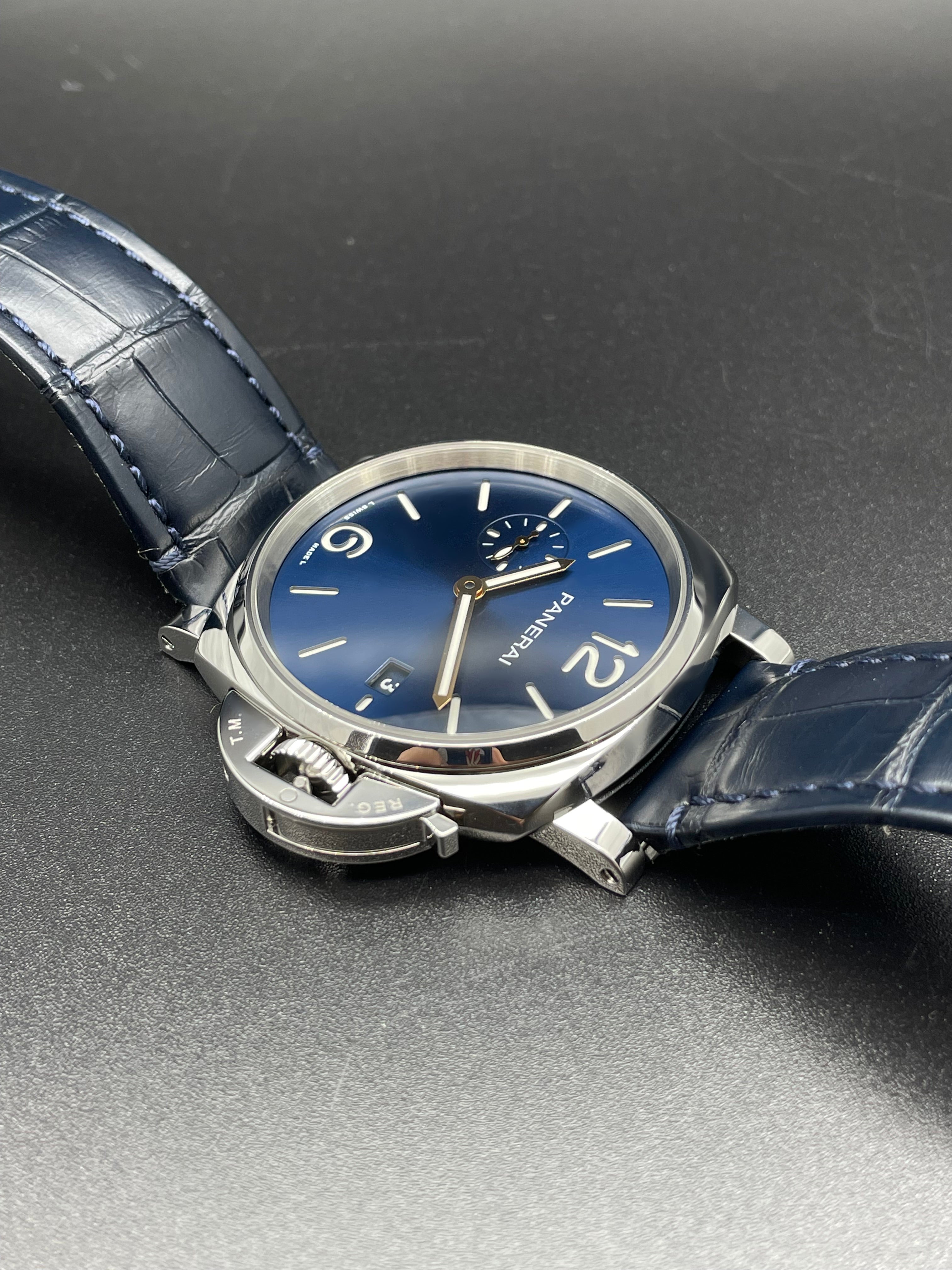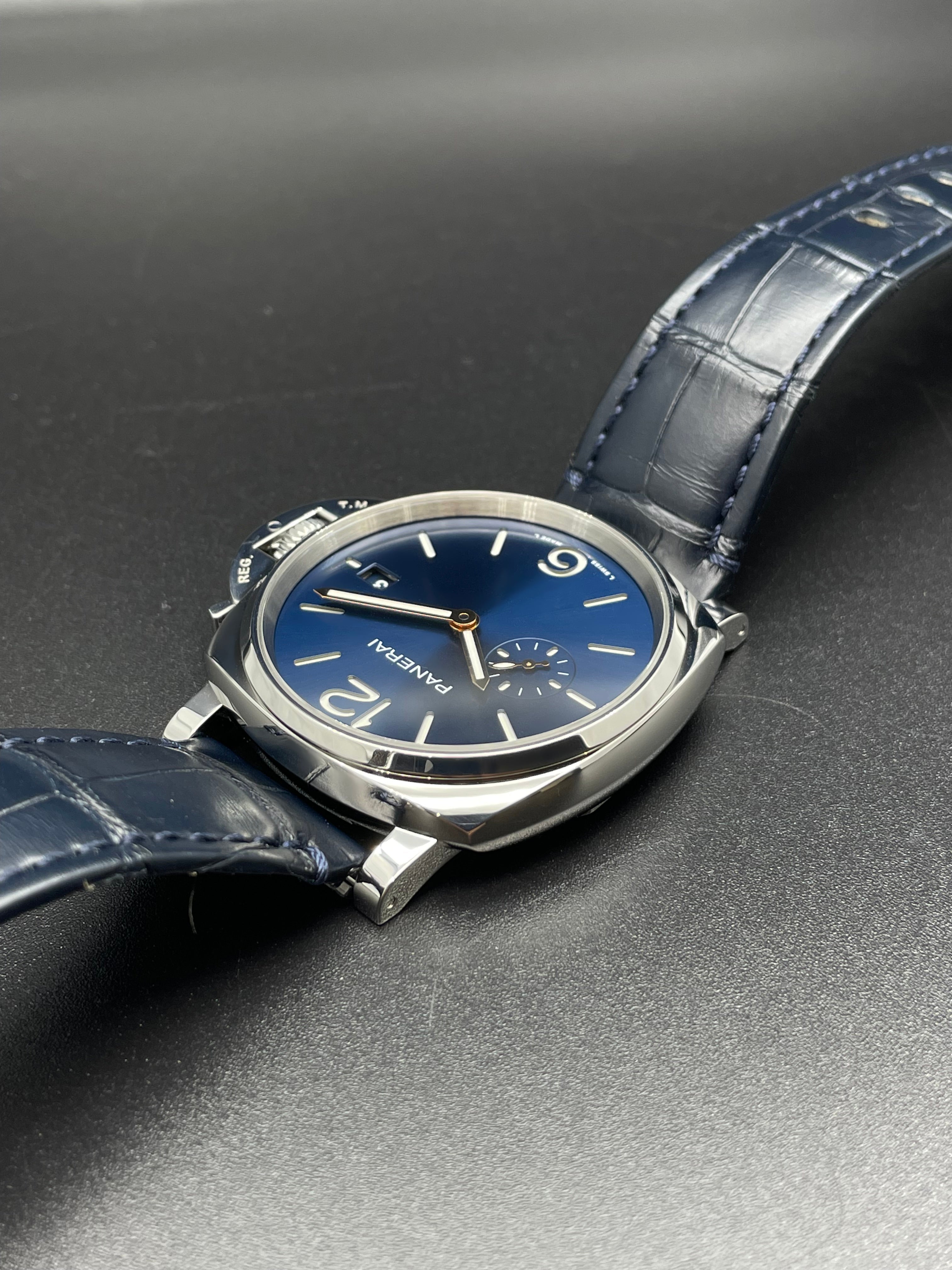 One of the standout features of the PAM01429 is its deep blue sun-brushed dial, which creates a captivating play of light. The minimalist design showcases the small seconds subdial at 9 o'clock and the date window at 3 o’clock, preserving the clean and balanced aesthetics that Panerai is known for. The luminous Arabic numerals and hour markers ensure high legibility, even in low-light conditions, maintaining Panerai's heritage as a tool watch brand, while its slim profile adds to its elegance and versatility.