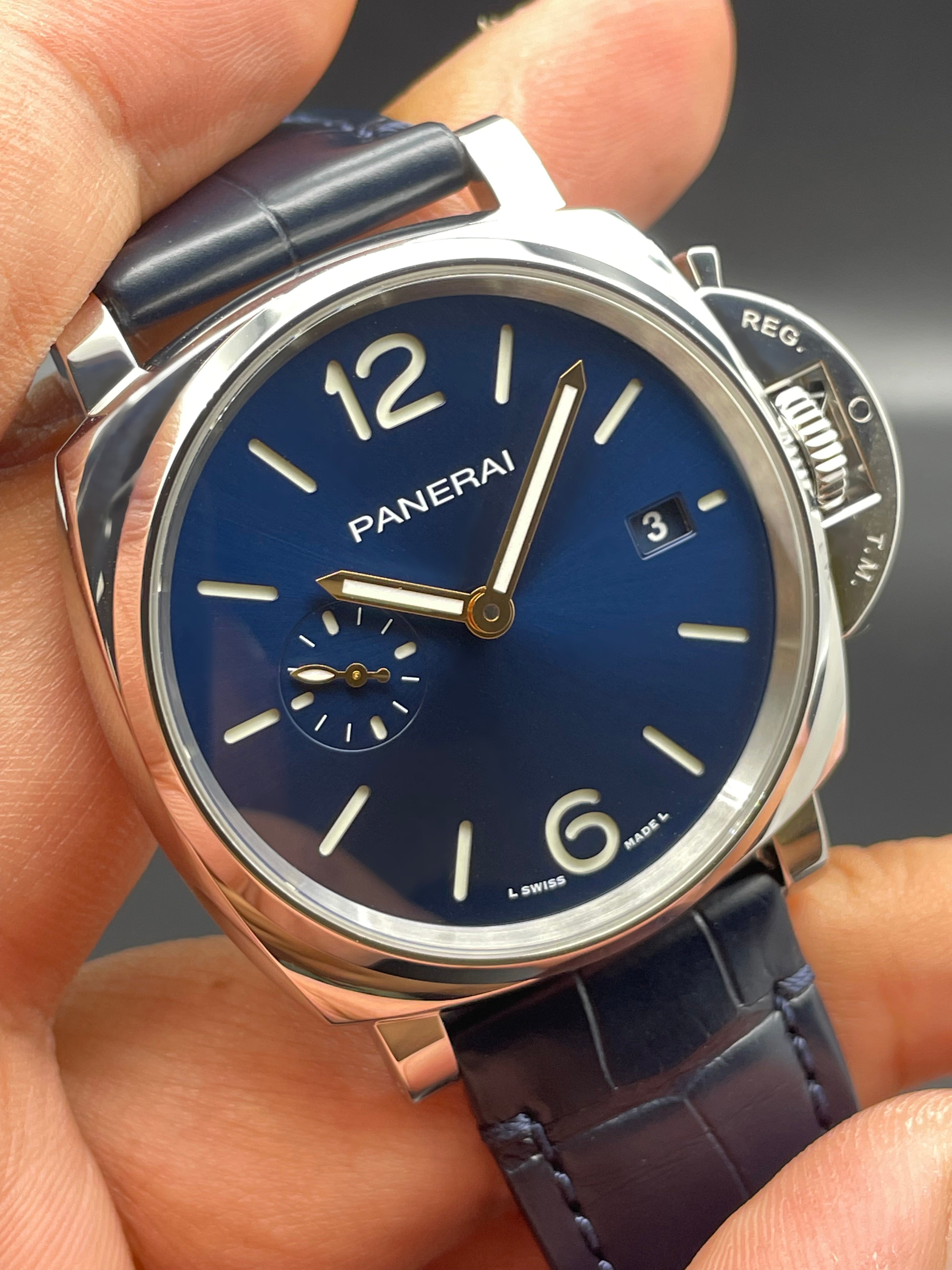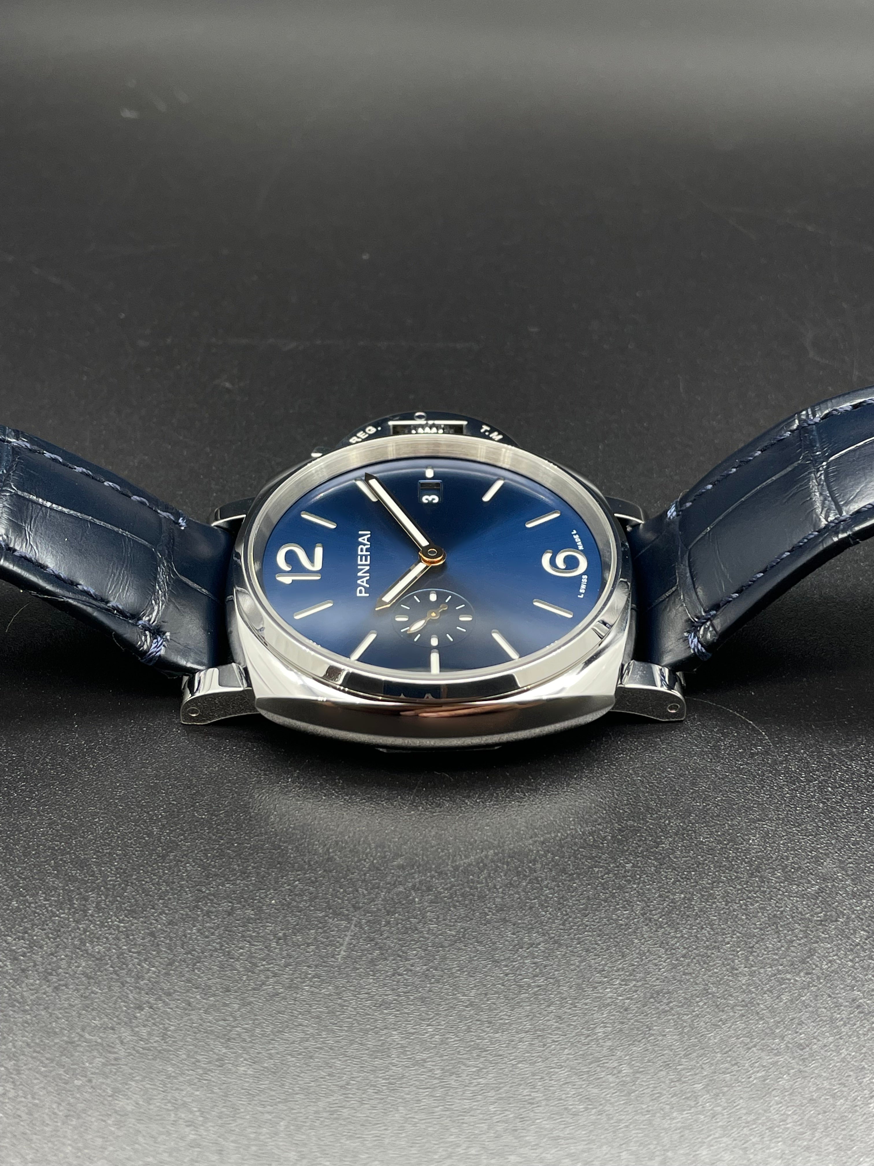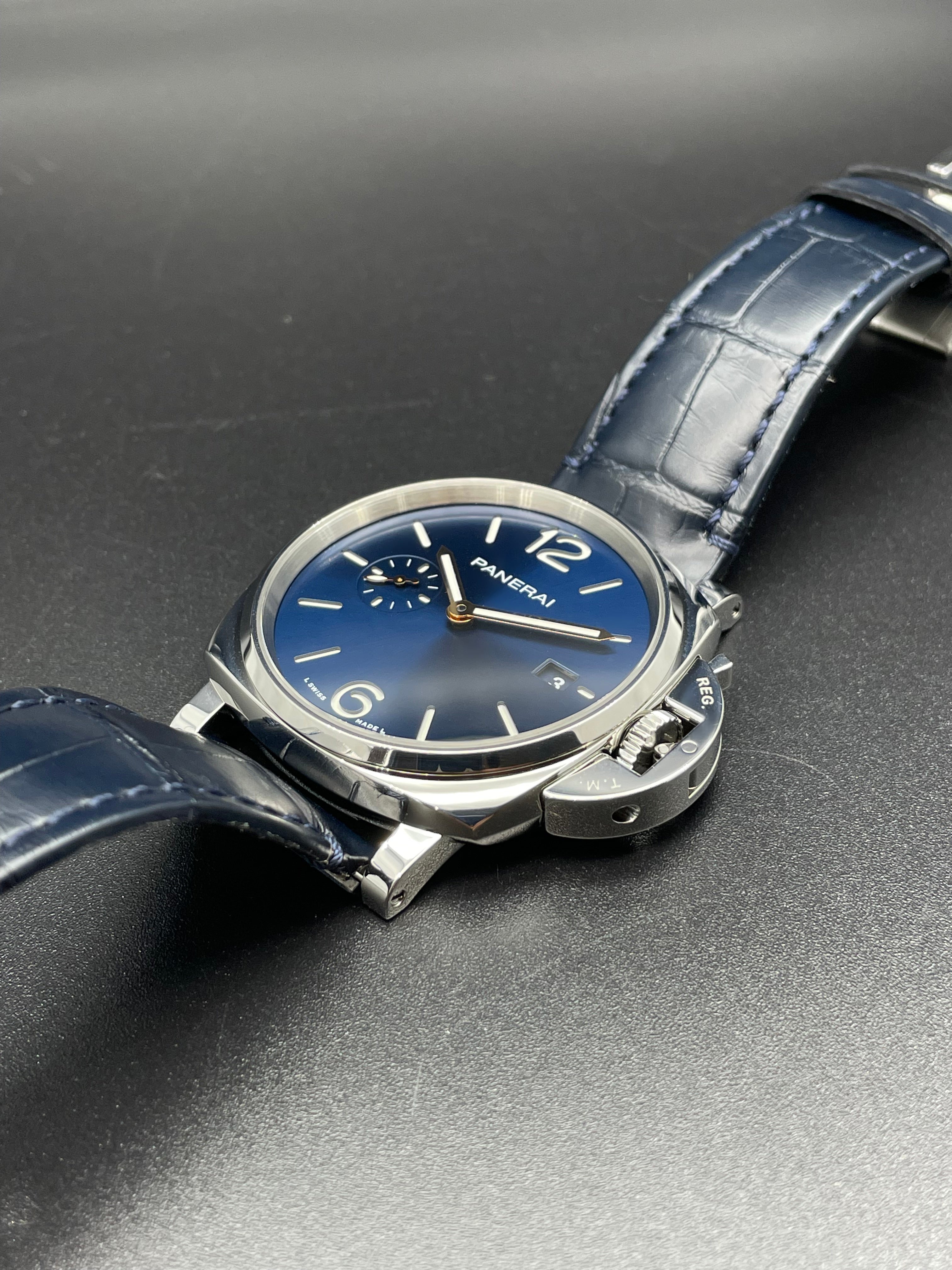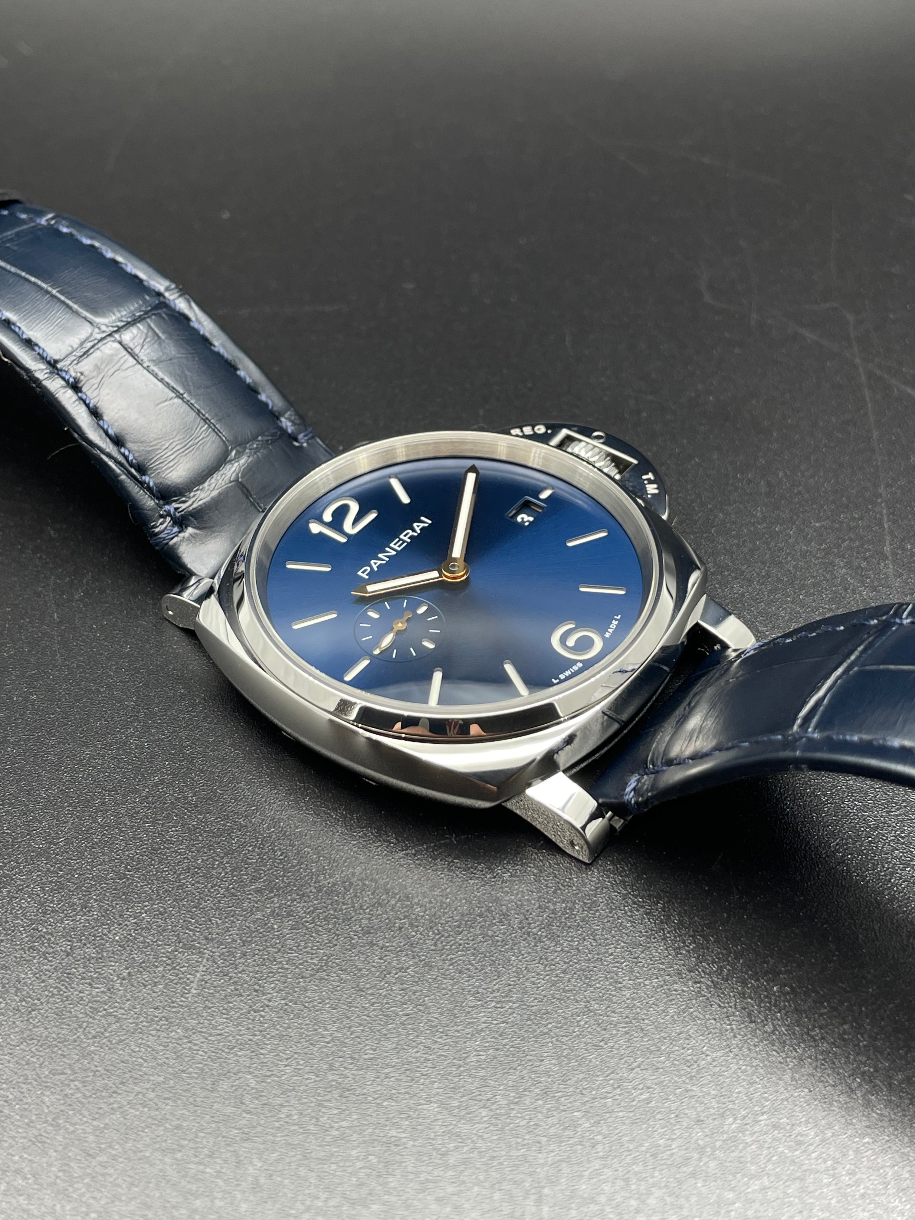 One of the standout features of the PAM01429 is its deep blue sun-brushed dial, which creates a captivating play of light. The minimalist design showcases the small seconds subdial at 9 o'clock and the date window at 3 o’clock, preserving the clean and balanced aesthetics that Panerai is known for. The luminous Arabic numerals and hour markers ensure high legibility, even in low-light conditions, maintaining Panerai's heritage as a tool watch brand, while its slim profile adds to its elegance and versatility.