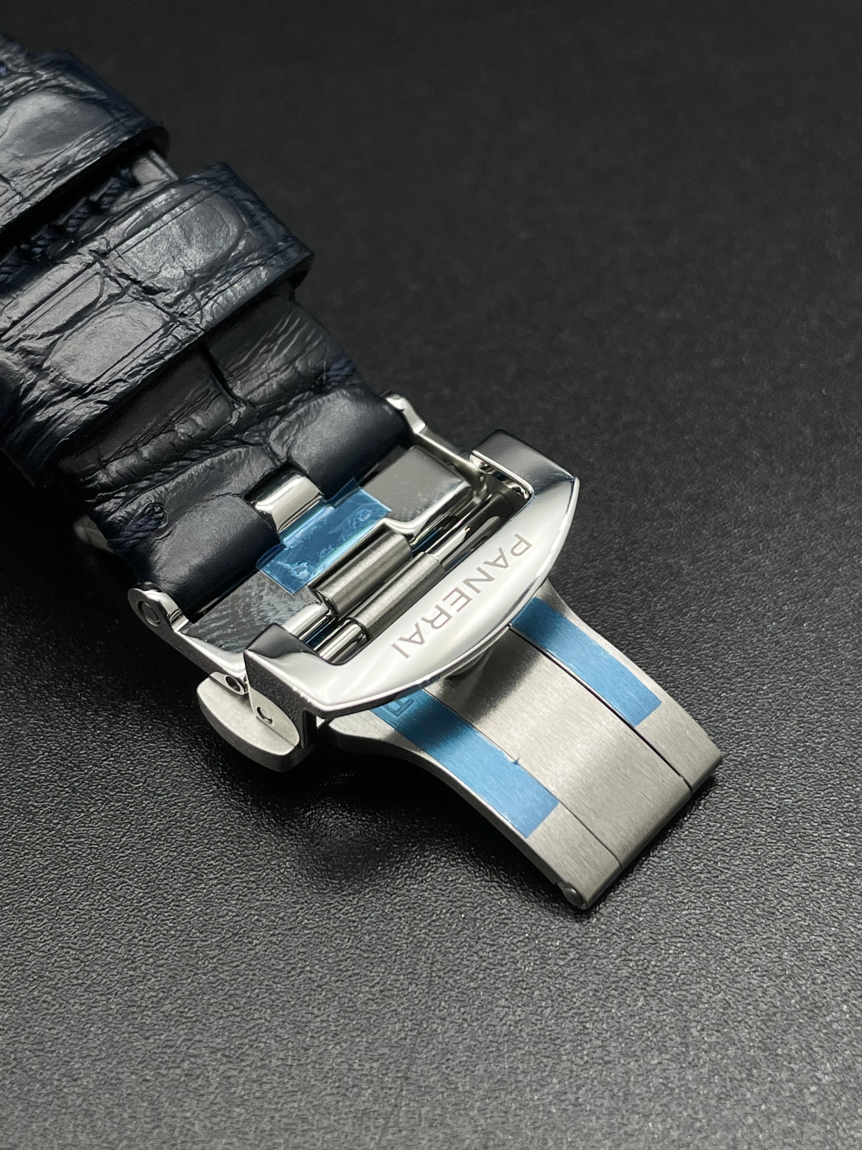The PAM01429 is paired with a matching blue alligator strap, further enhancing its refined appearance and making it suitable for various occasions. Its versatility lies in its ability to transition