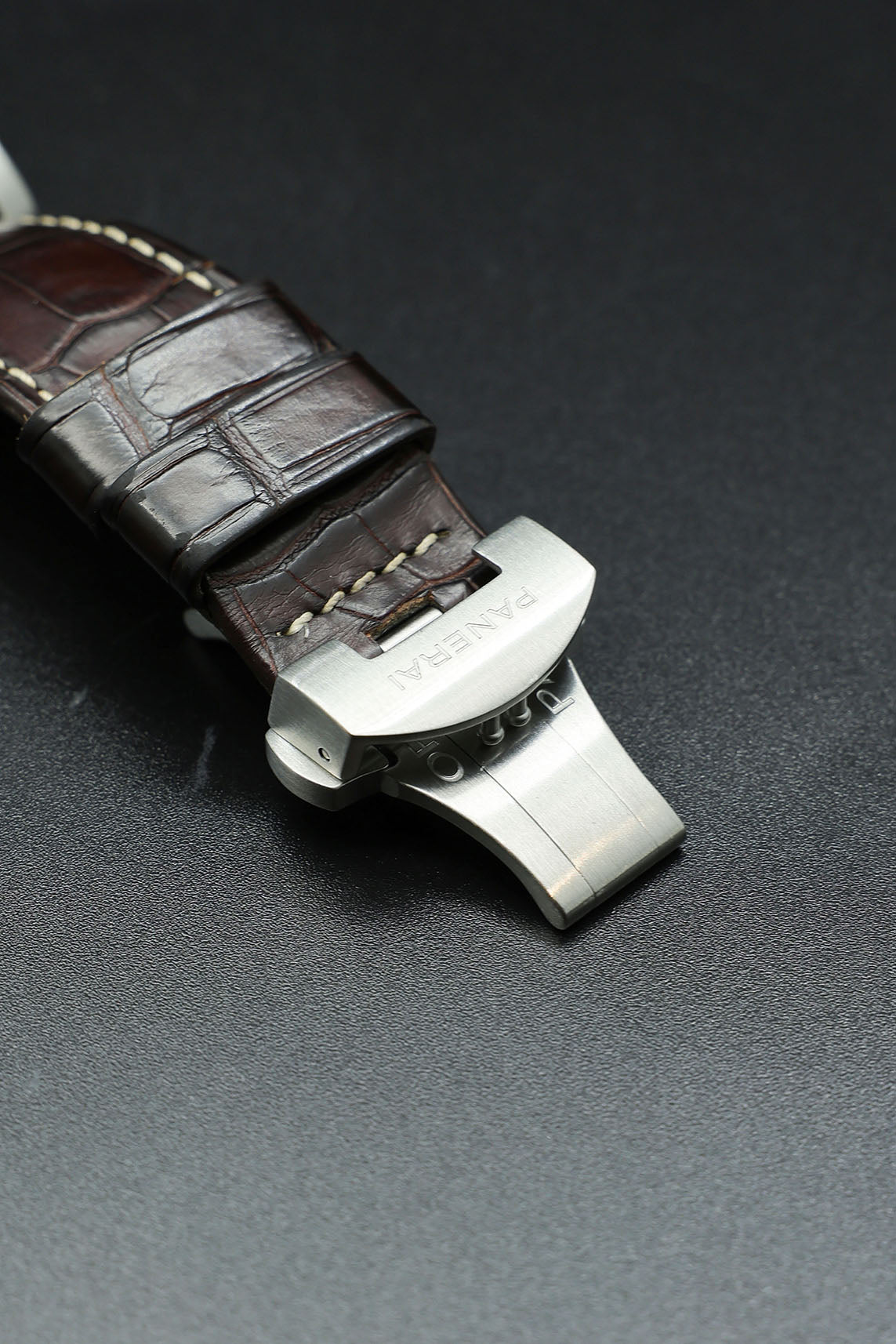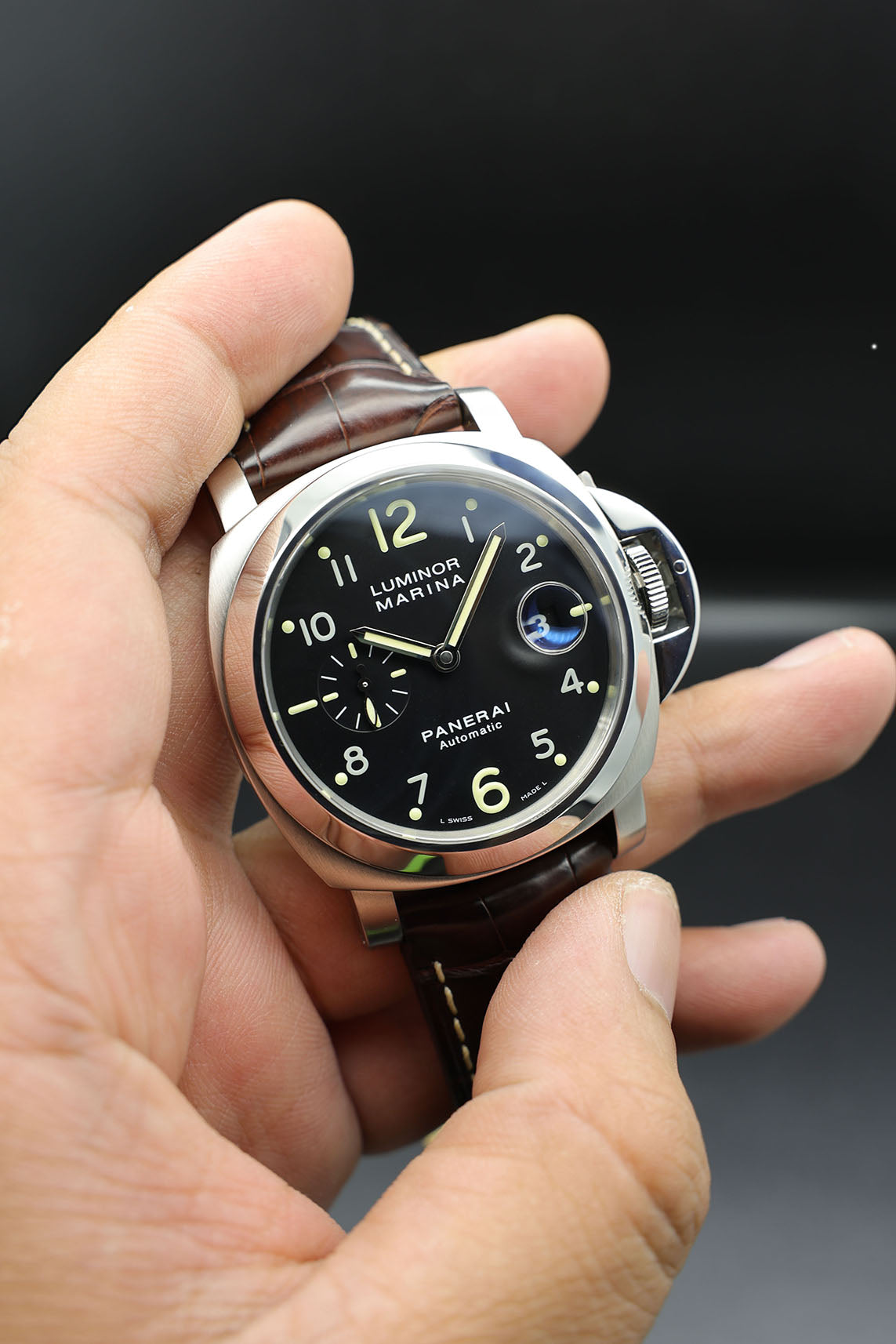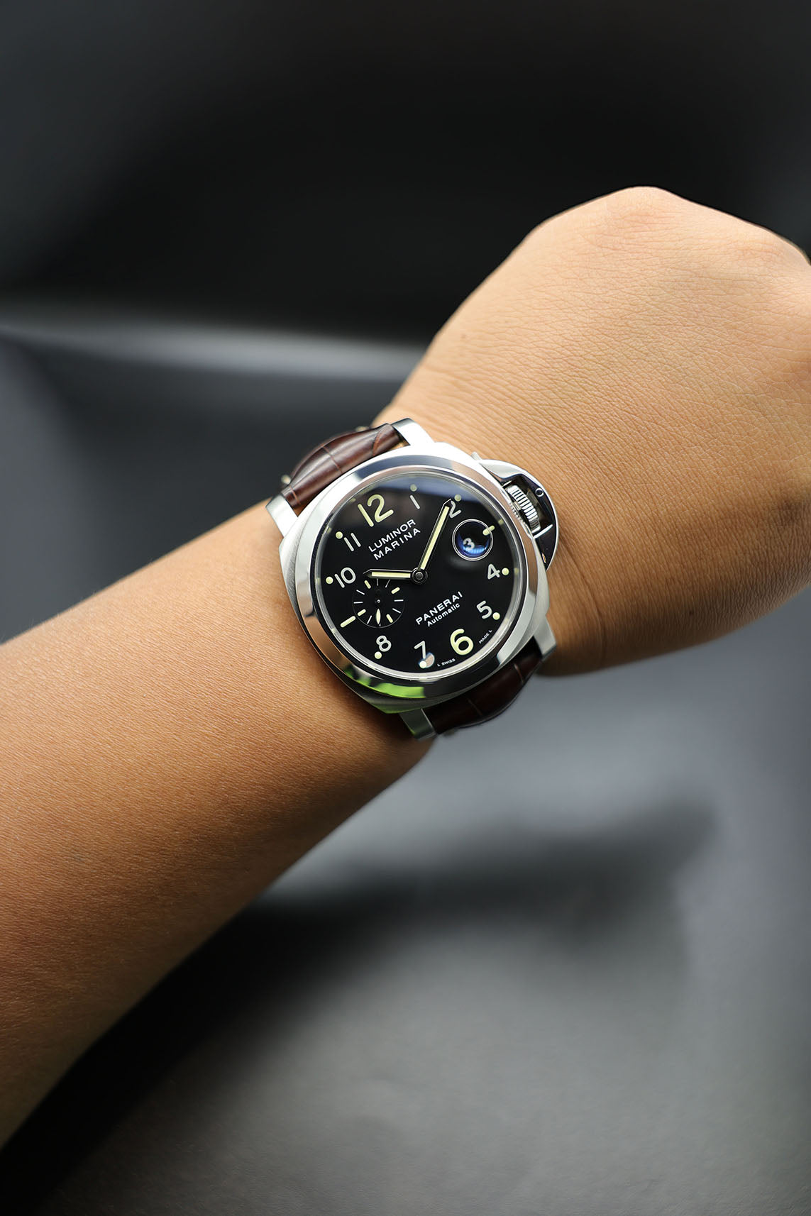 The Panerai Luminor Marina Automatic 44mm PAM00164 is a bold and functional timepiece that embodies Panerai’s signature design language while offering modern practicality. With its 44mm stainless steel case, the watch carries the unmistakable presence of a Luminor, featuring the iconic crown guard that ensures water resistance and reinforces its rugged appeal. The brushed case and polished bezel create a striking contrast, enhancing its versatile aesthetic—whether worn casually or as a statement piece for everyday wear.