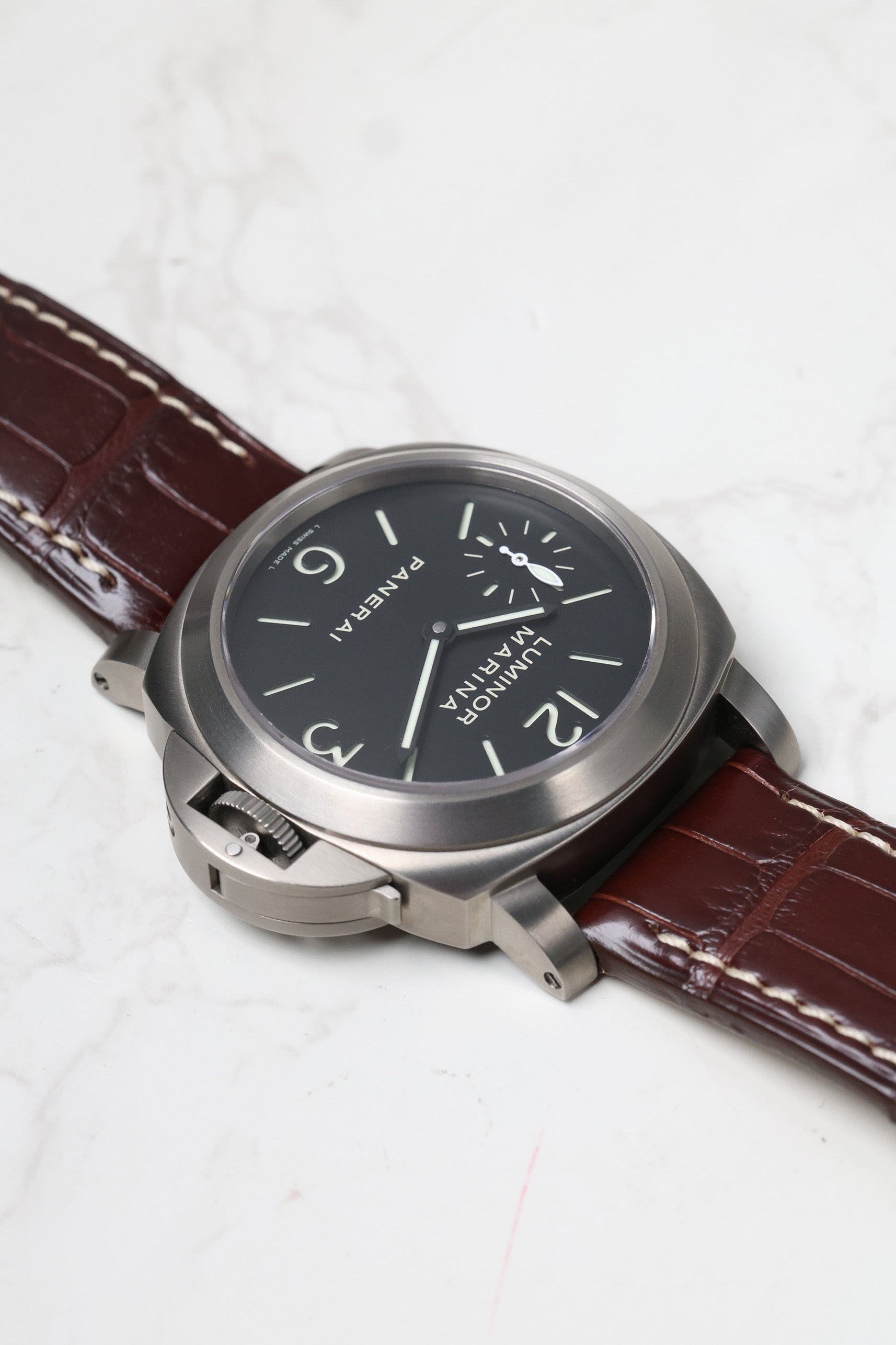 The 44mm cushion-shaped case is crafted entirely from brushed Grade 2 titanium. This material choice is transformative; it significantly reduces the weight on the wrist compared to stainless steel while offering superior corrosion resistance and a darker, more tactical matte-grey hue. All the hallmarks of the Luminor silhouette are present, most notably the patented crown-protecting bridge with its signature locking lever, which ensures the watch’s 300-meter water resistance and provides the most recognizable profile in horology.