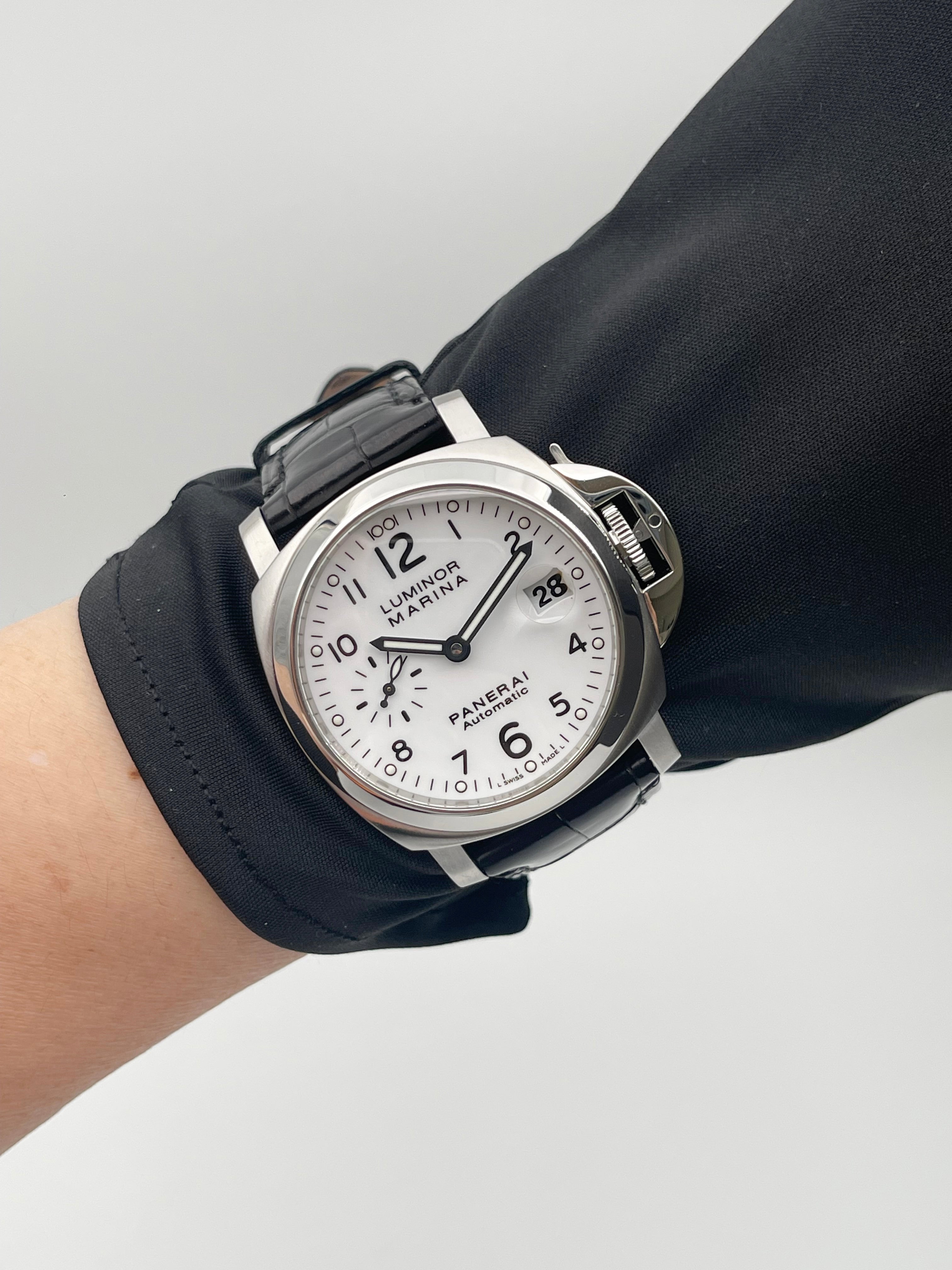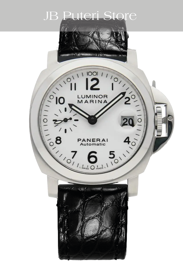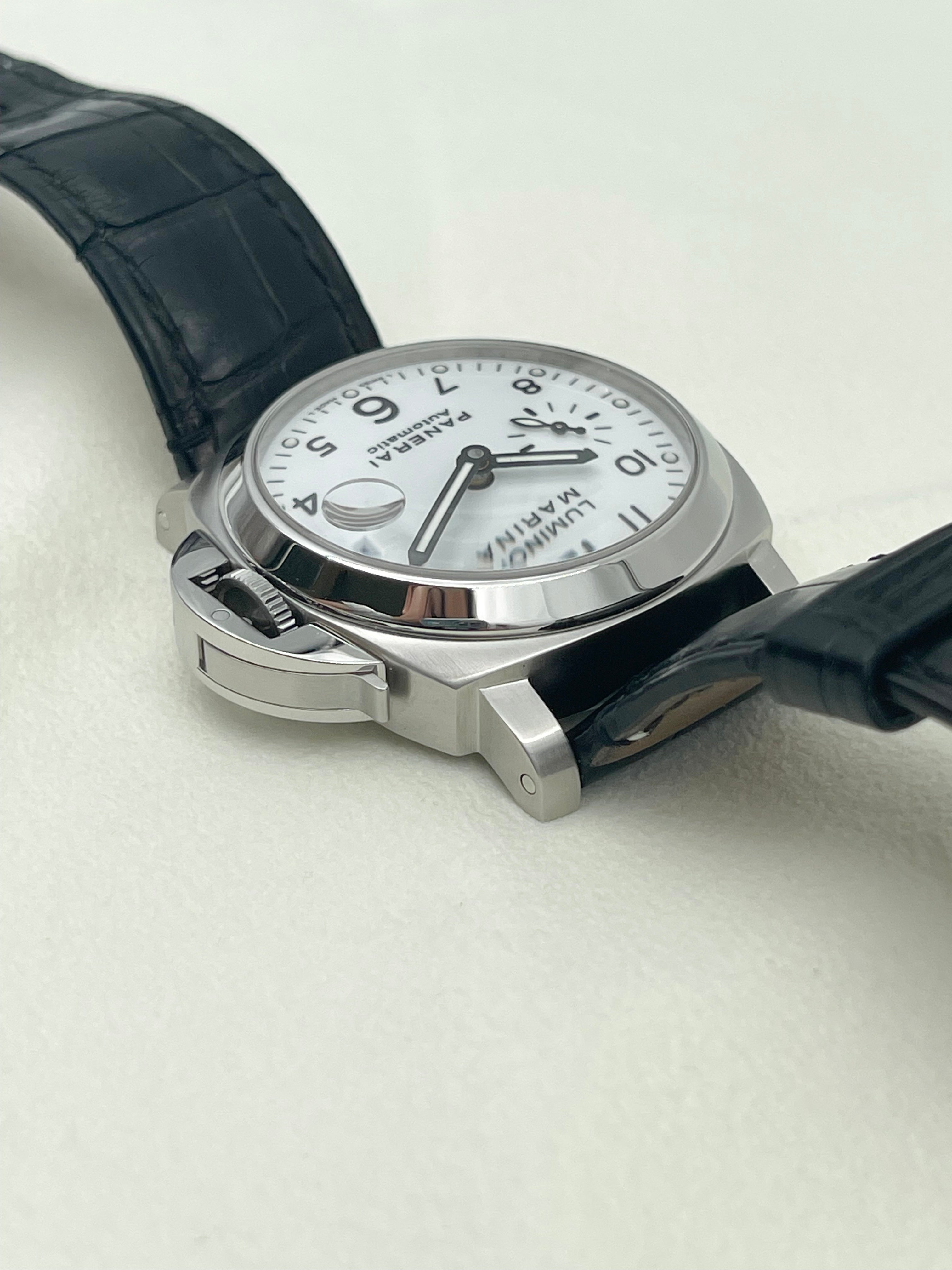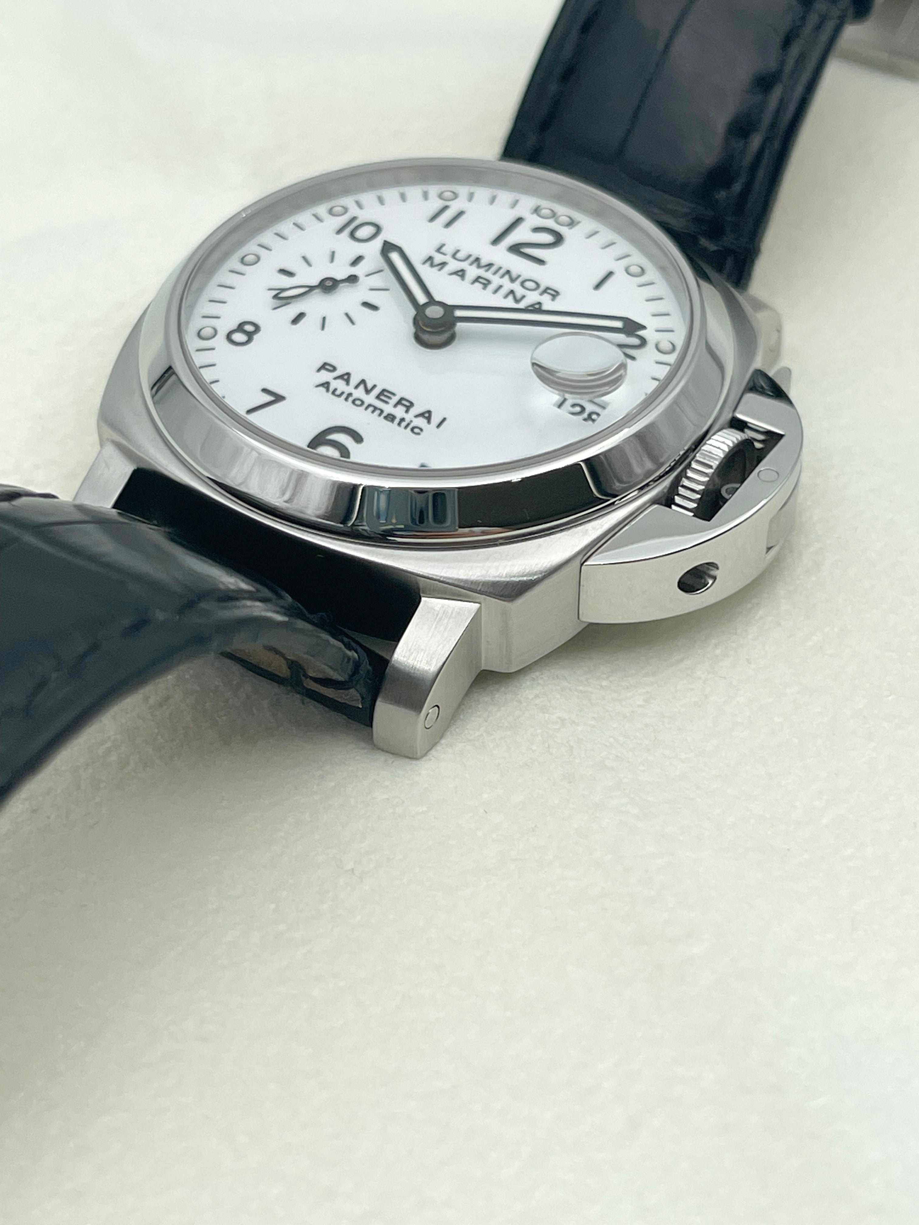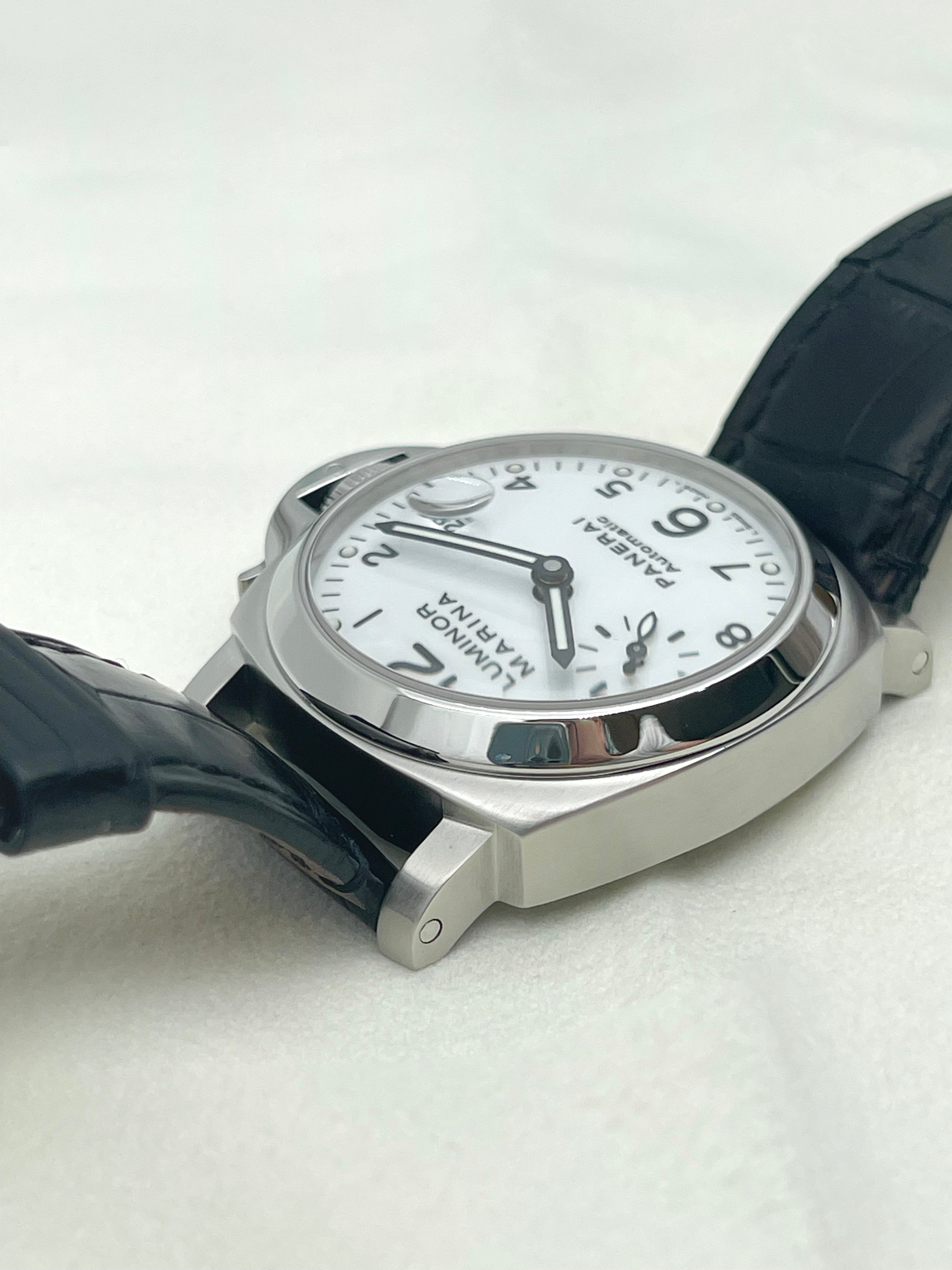 The Panerai Luminor Marina Automatic 40mm PAM00049 is a discontinued model that represents a rare configuration within the brand’s historical lineup. Best known for its oversized, military-inspired watches, Panerai seldom offers white dials, making this reference particularly distinctive and desirable among collectors. The clean, matte white dial provides a fresh and modern take on the otherwise rugged Luminor Marina design, balancing utilitarian roots with a refined aesthetic.