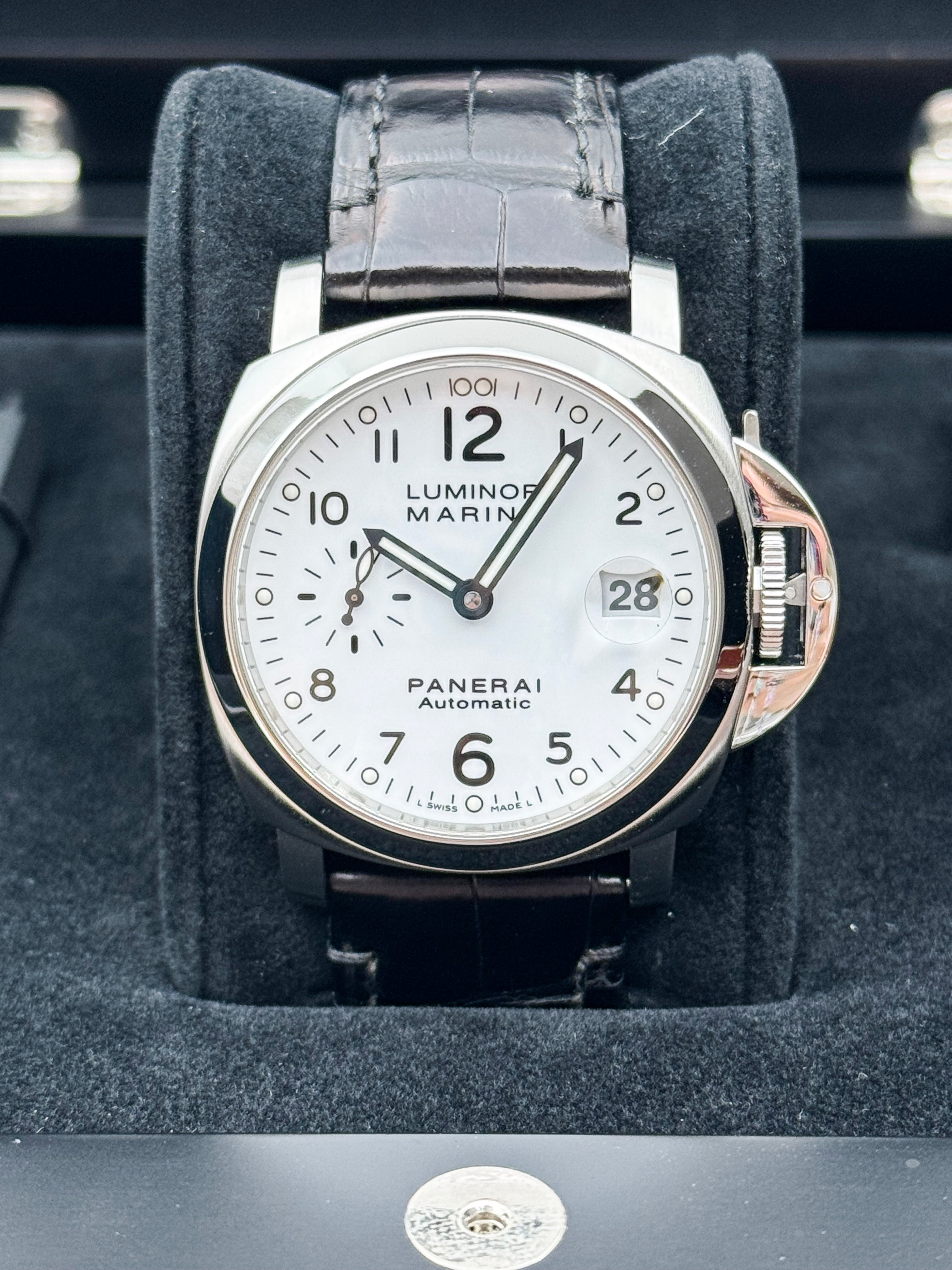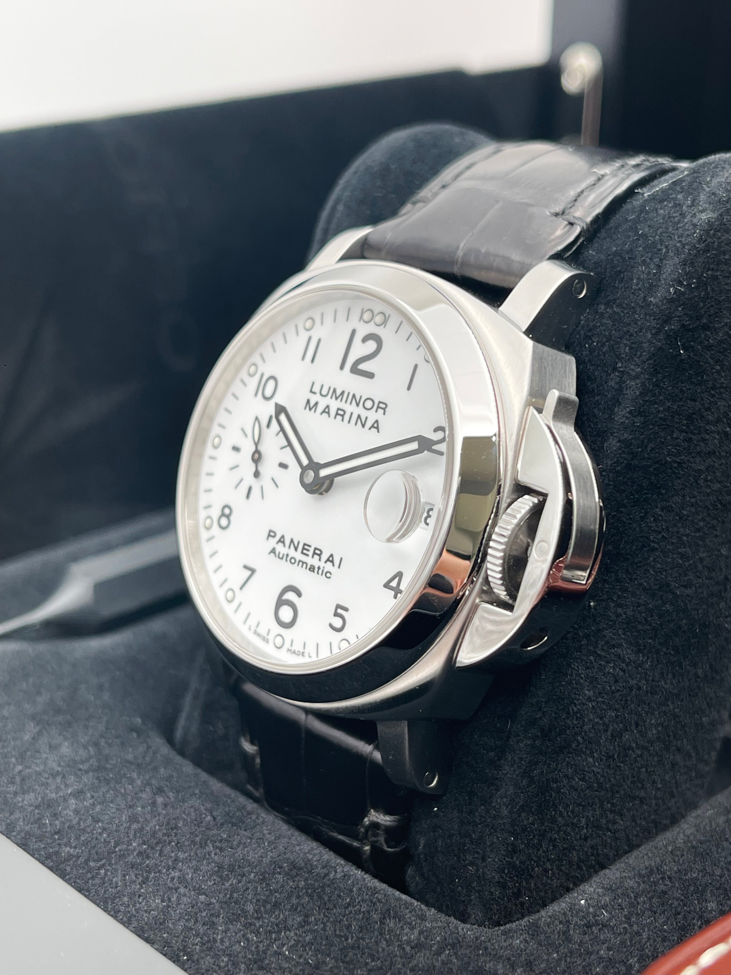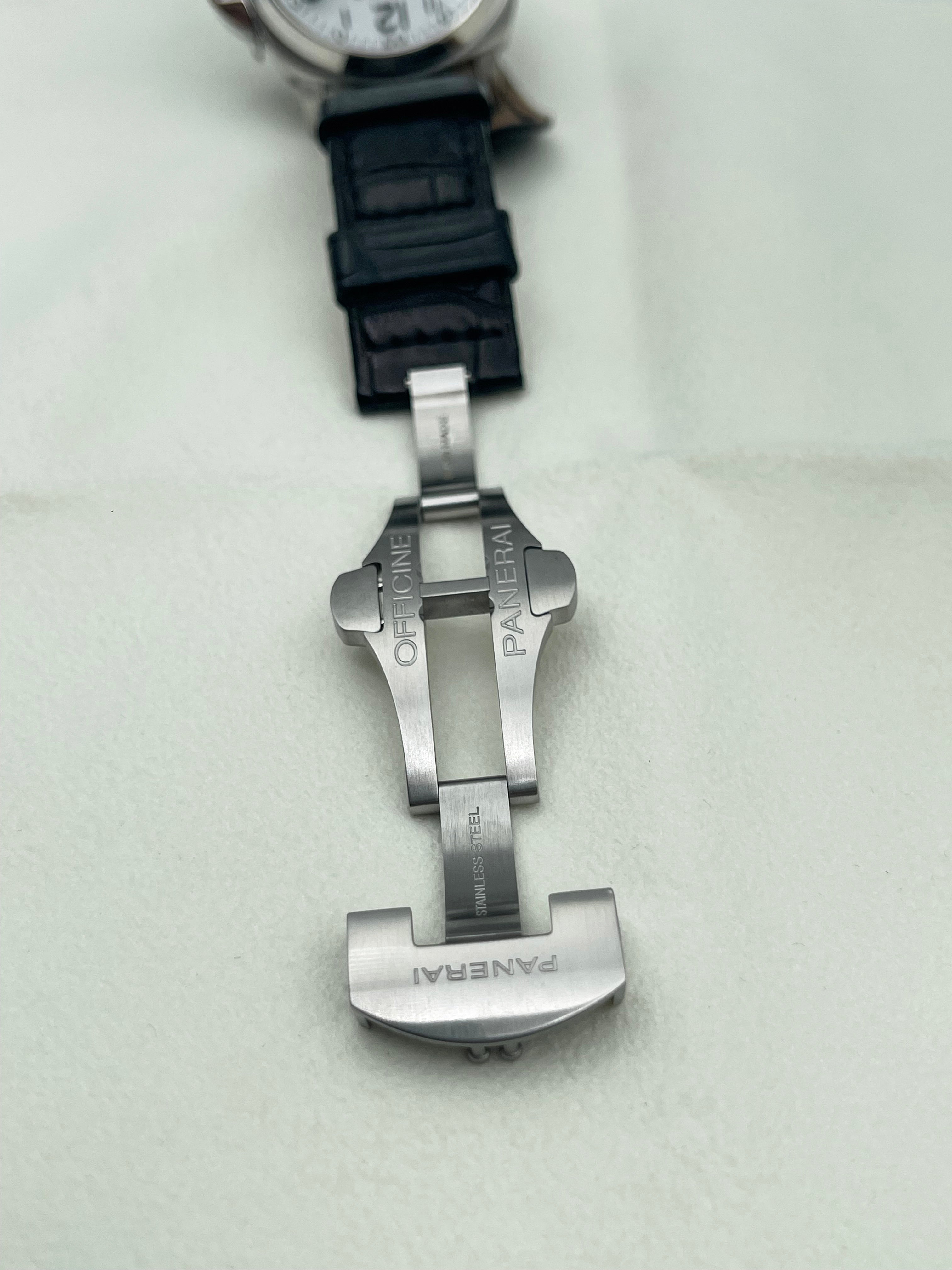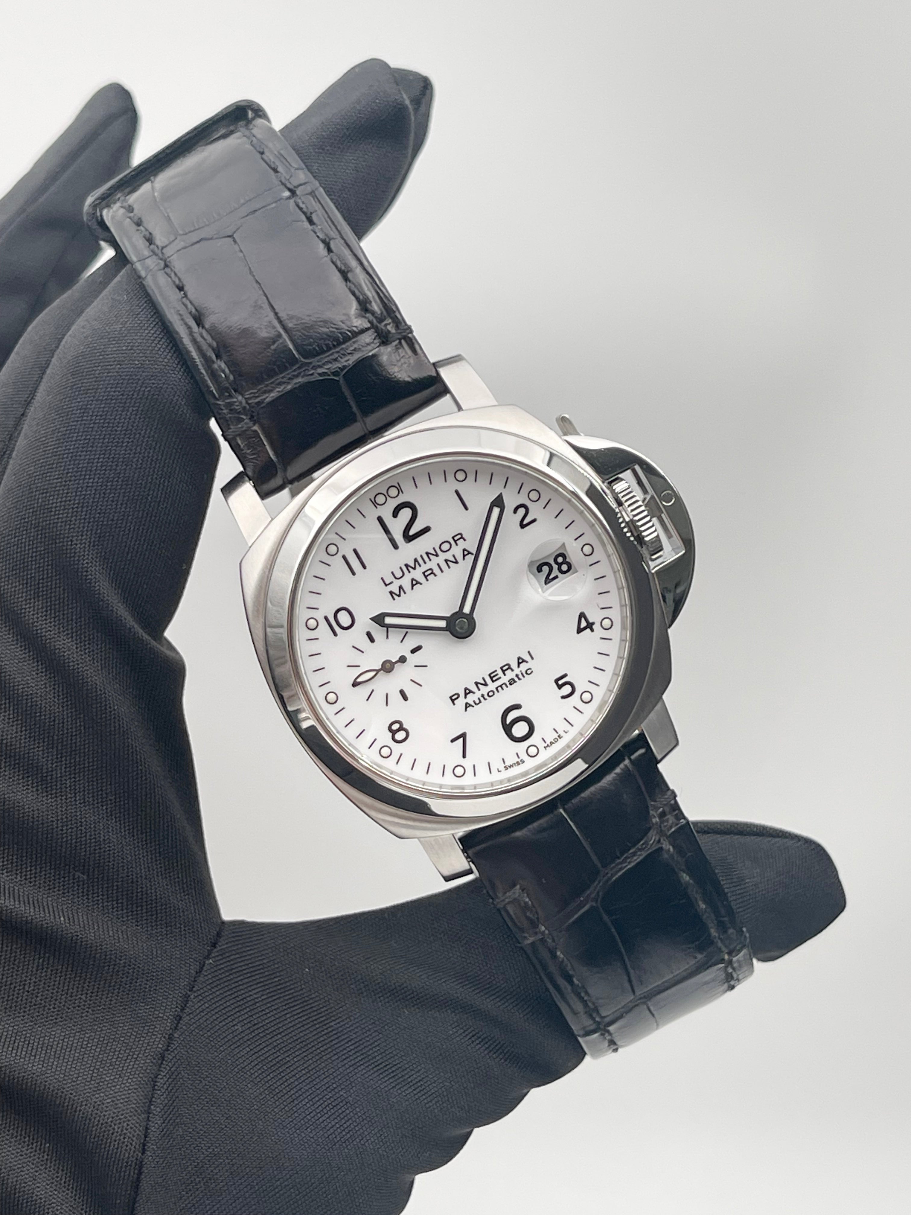 The Panerai Luminor Marina Automatic 40mm PAM00049 is a discontinued model that represents a rare configuration within the brand’s historical lineup. Best known for its oversized, military-inspired watches, Panerai seldom offers white dials, making this reference particularly distinctive and desirable among collectors. The clean, matte white dial provides a fresh and modern take on the otherwise rugged Luminor Marina design, balancing utilitarian roots with a refined aesthetic.