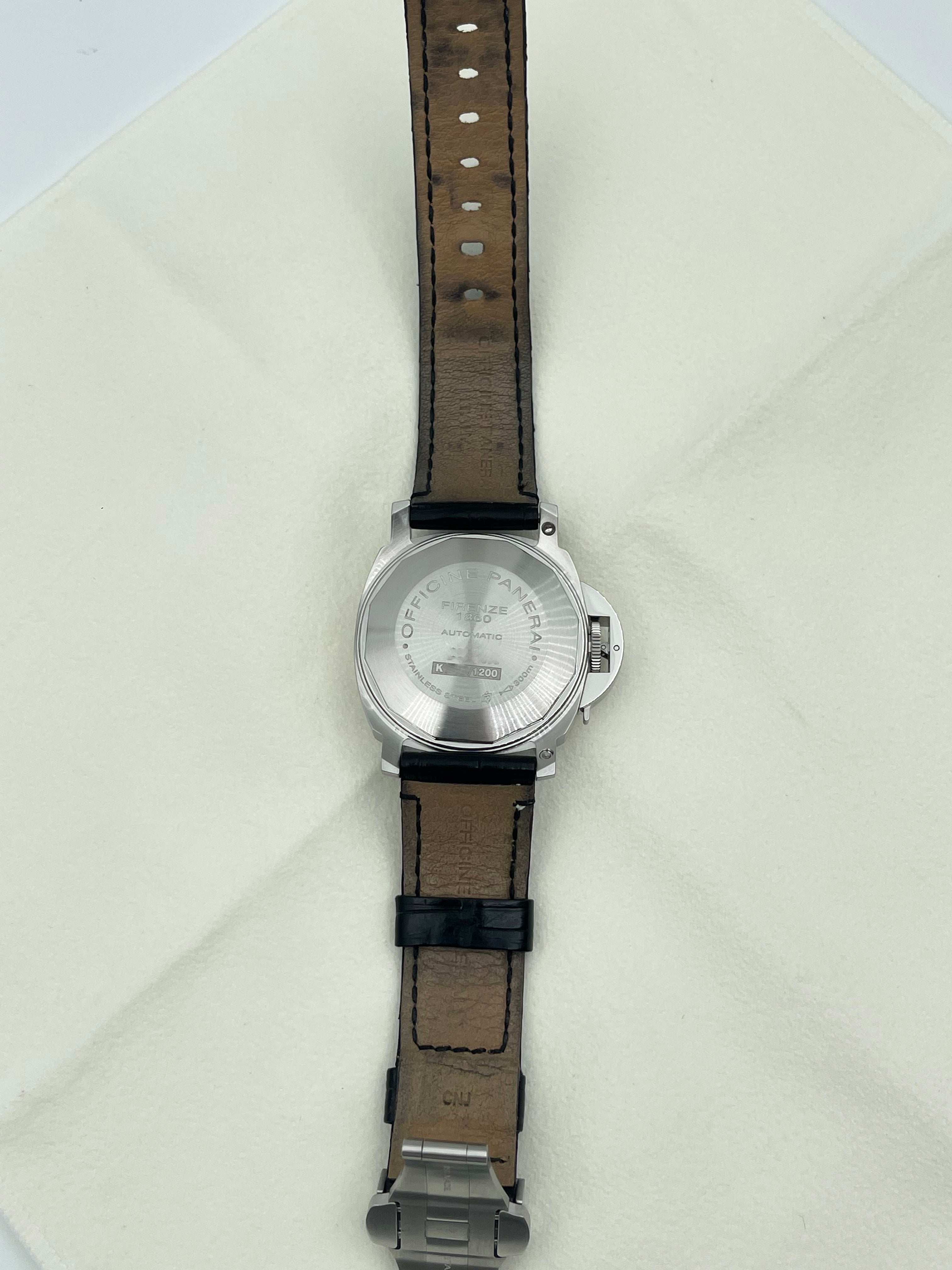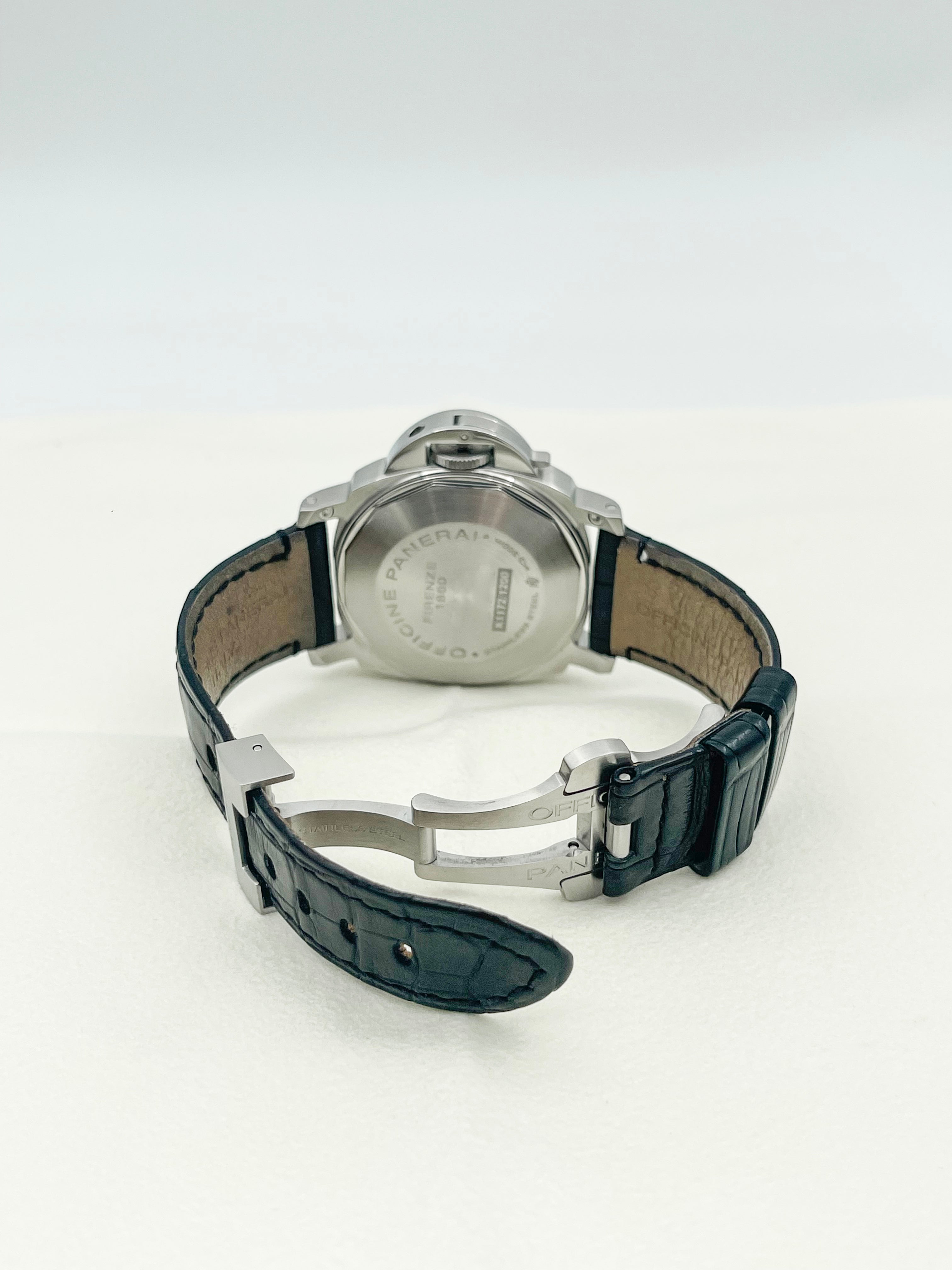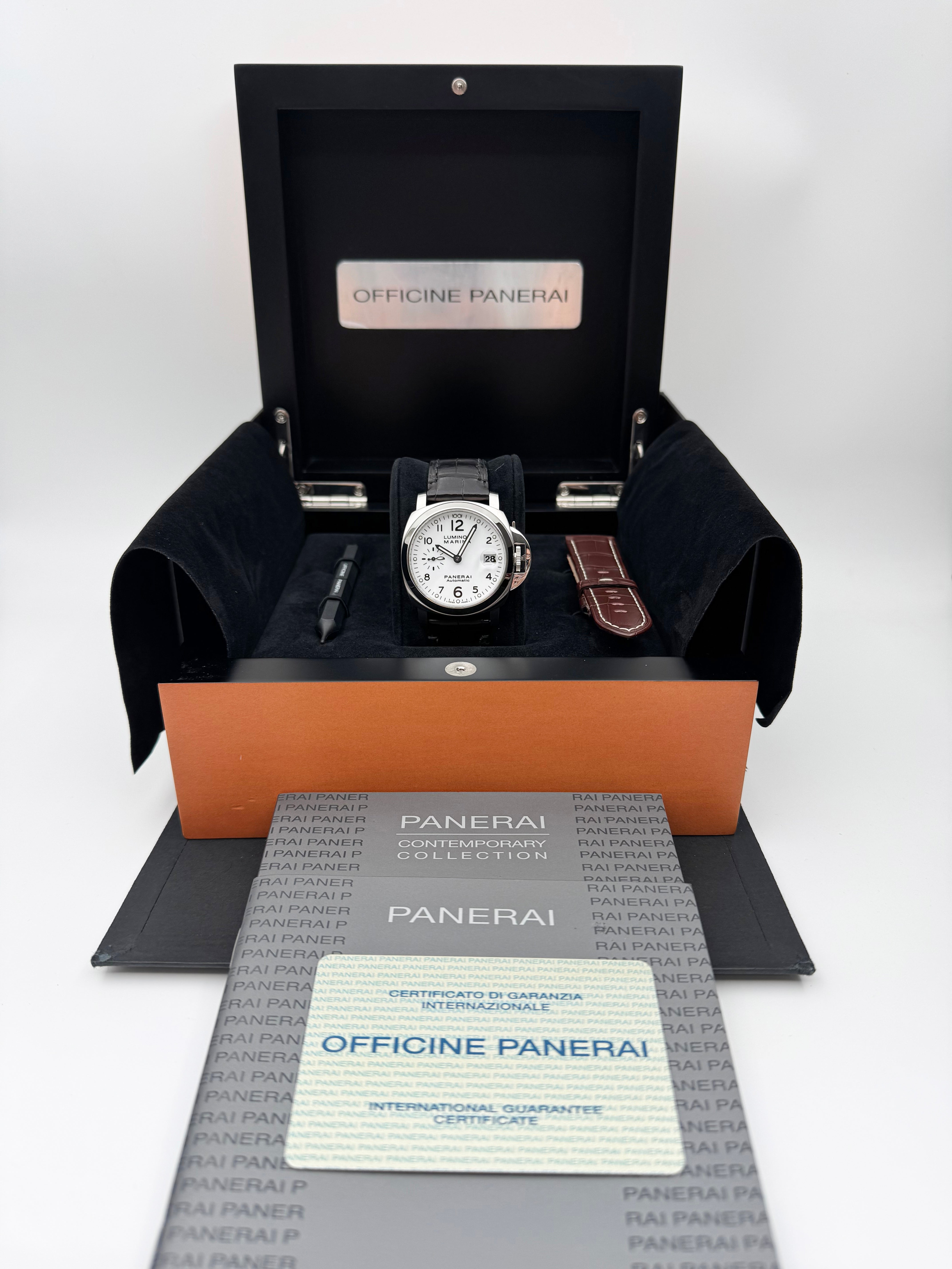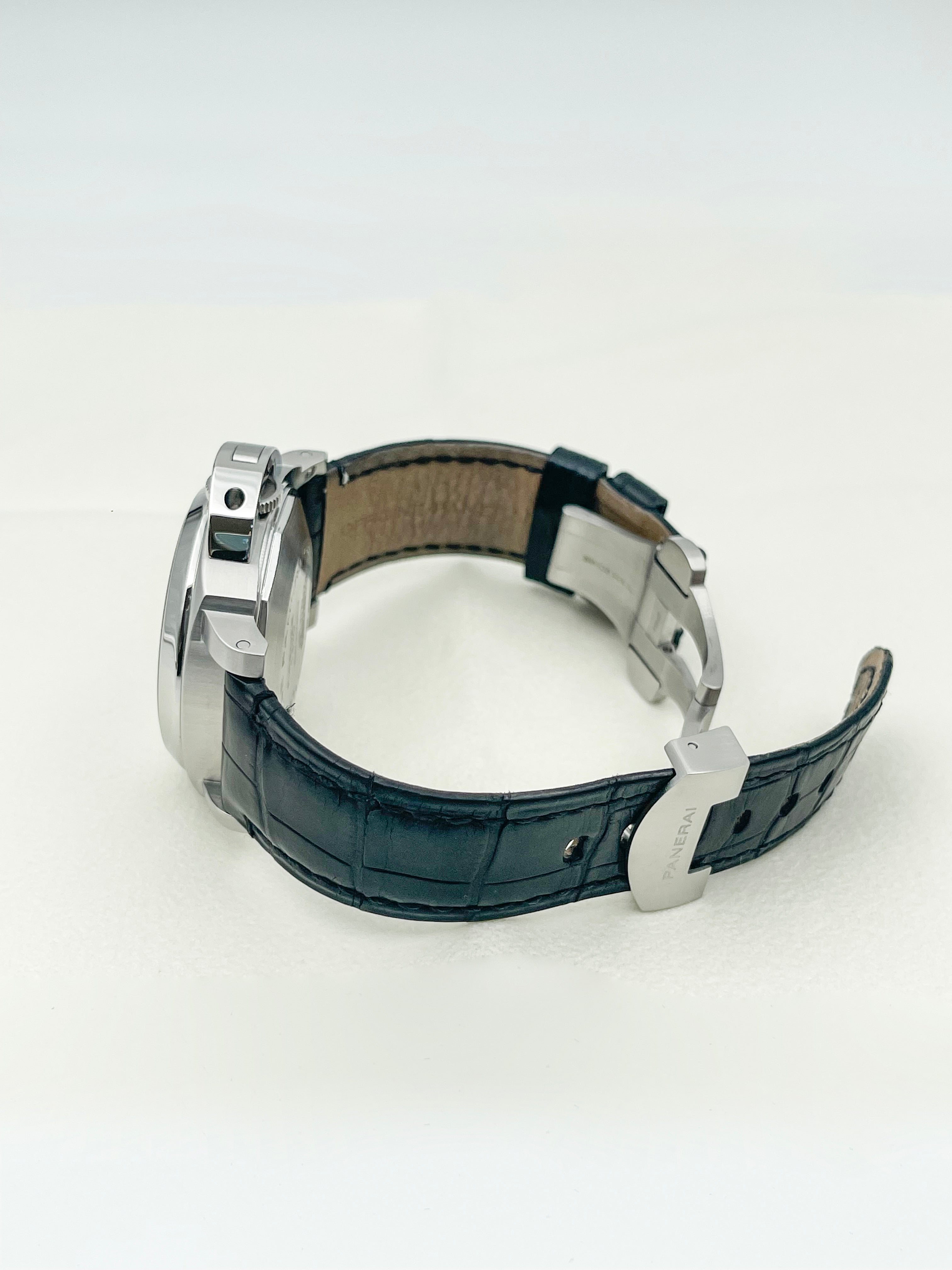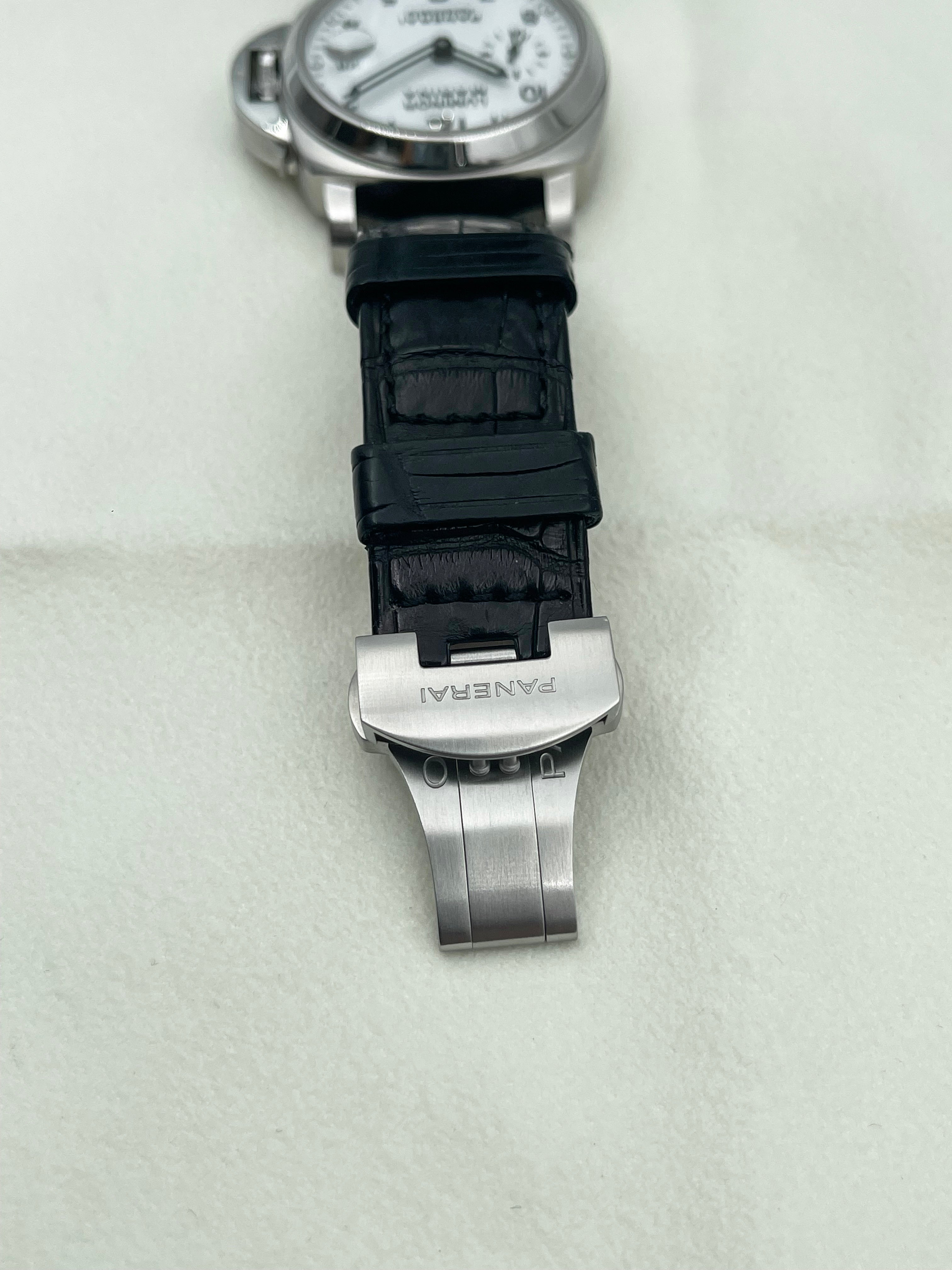 The Panerai Luminor Marina Automatic 40mm PAM00049 is a discontinued model that represents a rare configuration within the brand’s historical lineup. Best known for its oversized, military-inspired watches, Panerai seldom offers white dials, making this reference particularly distinctive and desirable among collectors. The clean, matte white dial provides a fresh and modern take on the otherwise rugged Luminor Marina design, balancing utilitarian roots with a refined aesthetic.