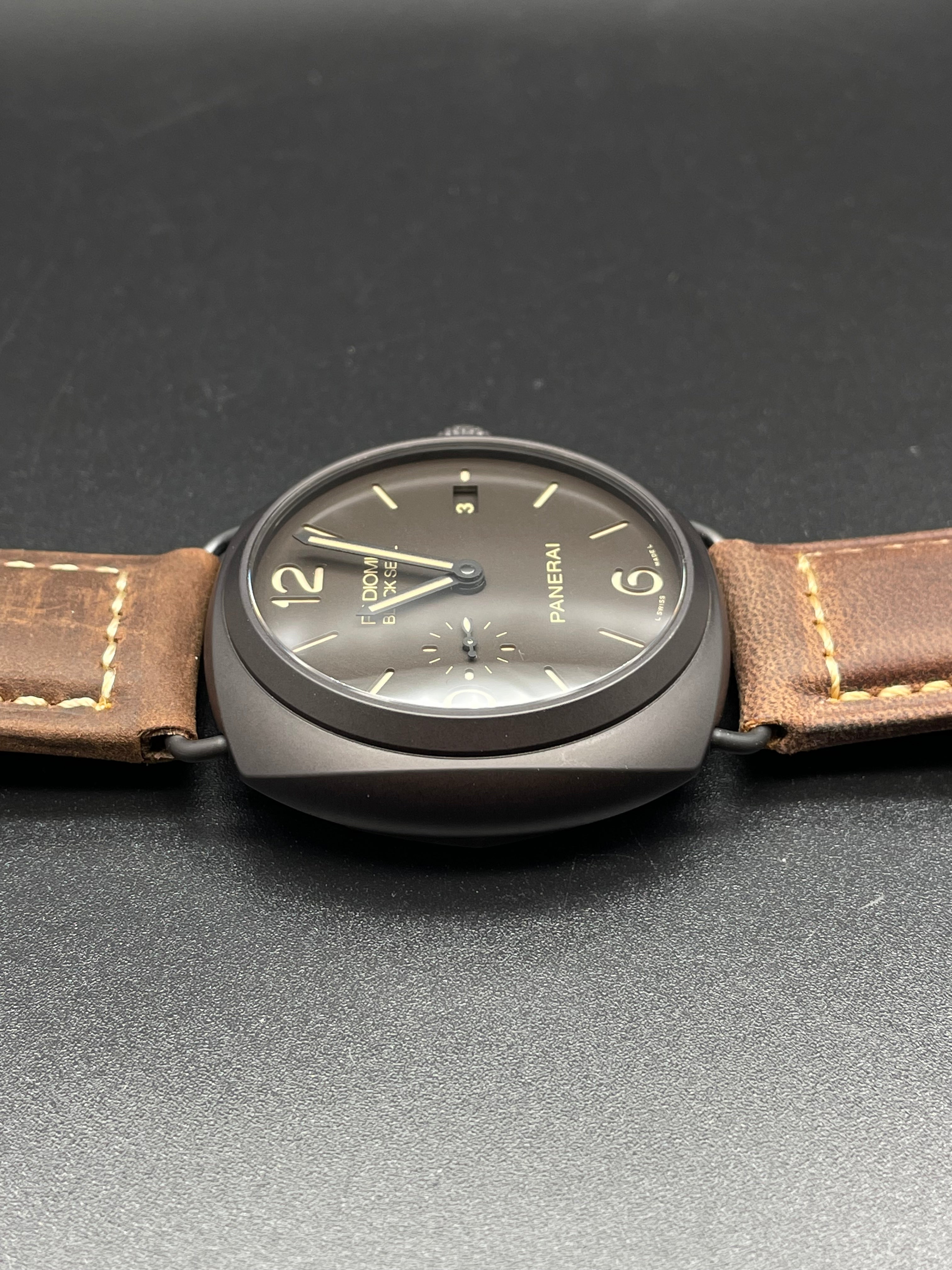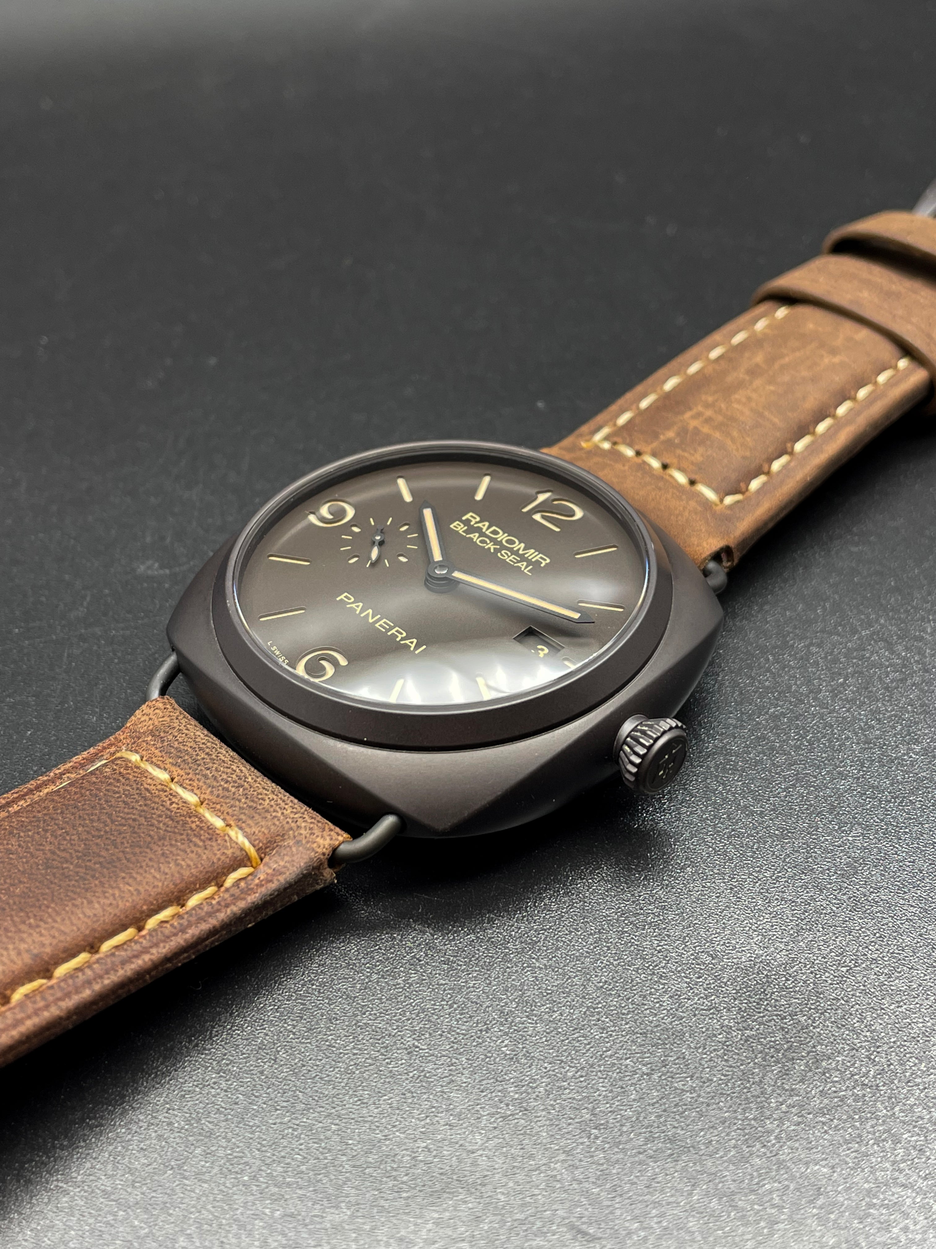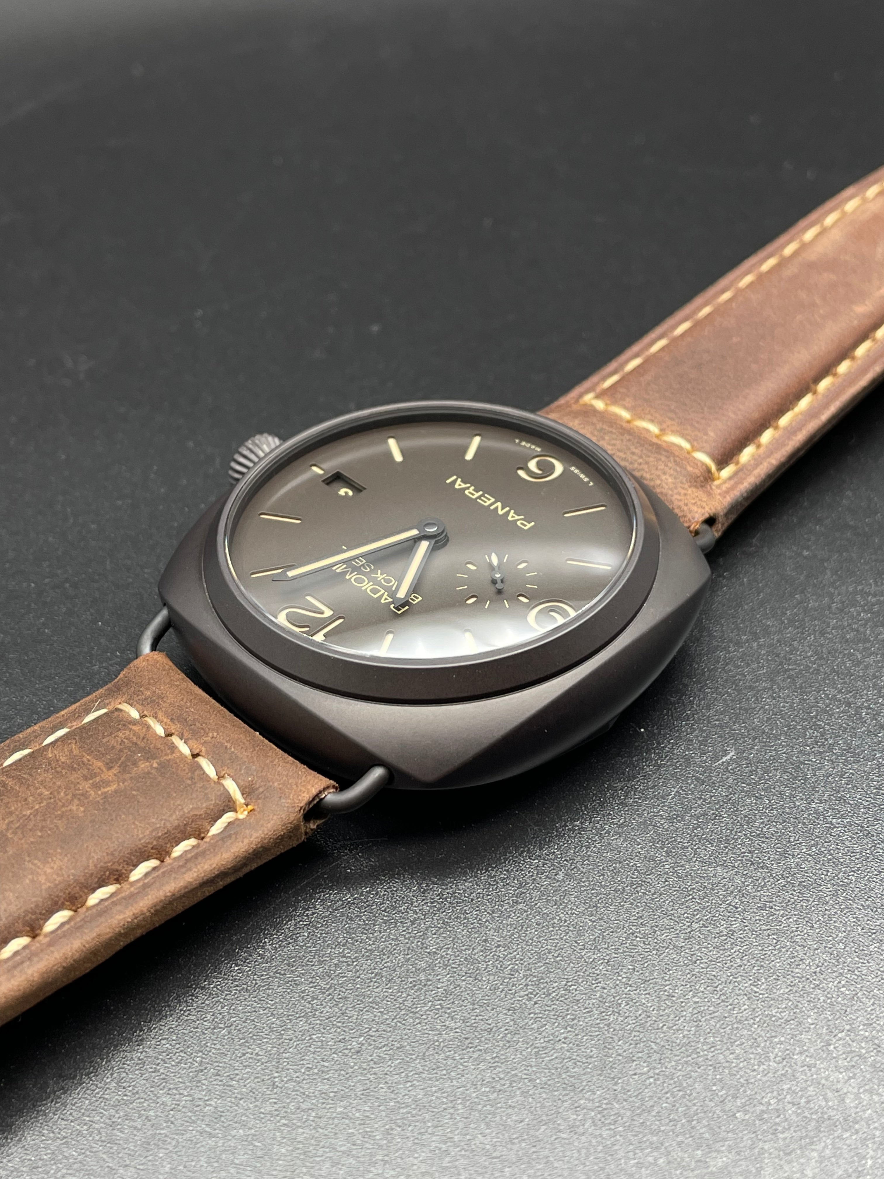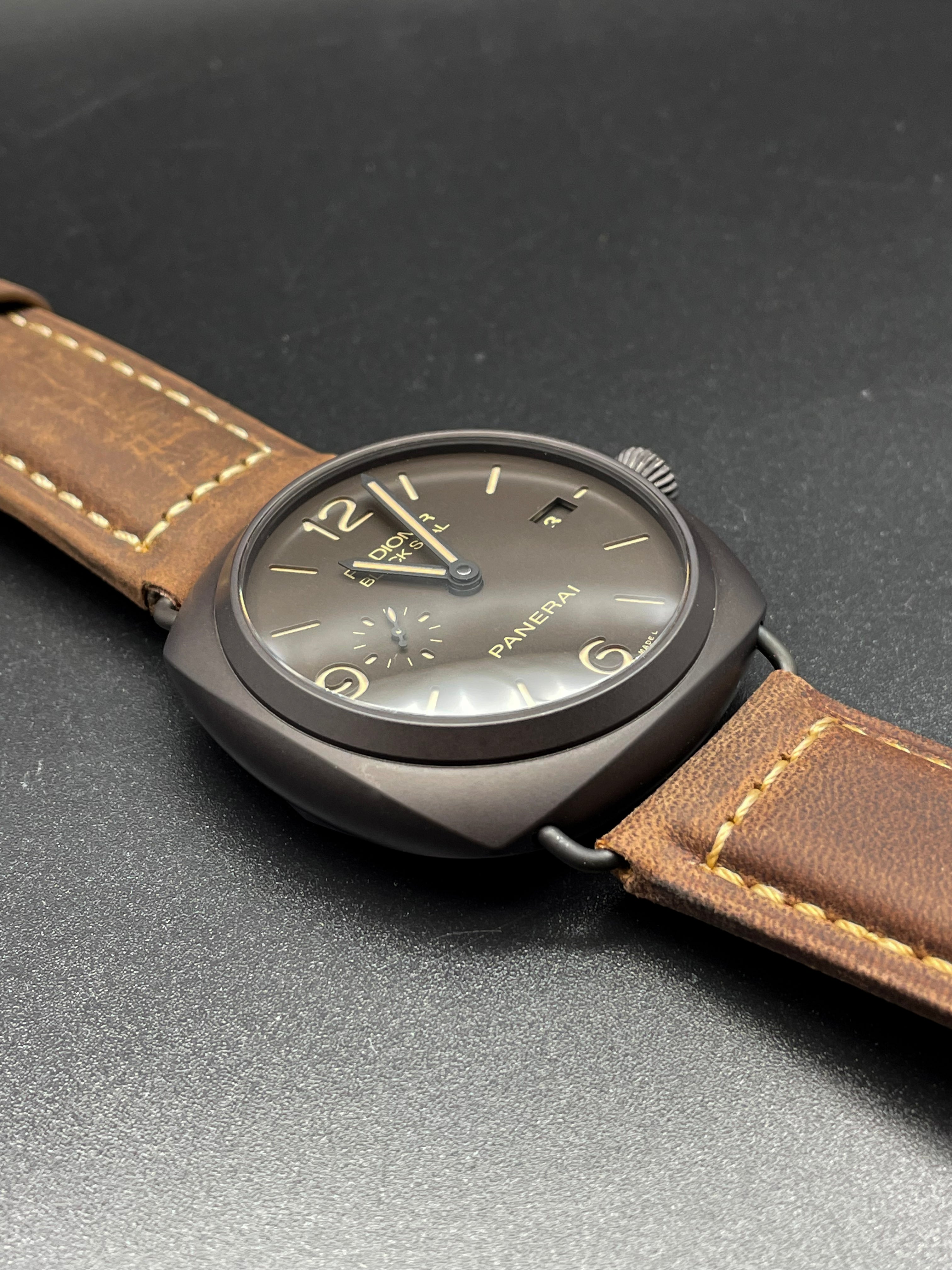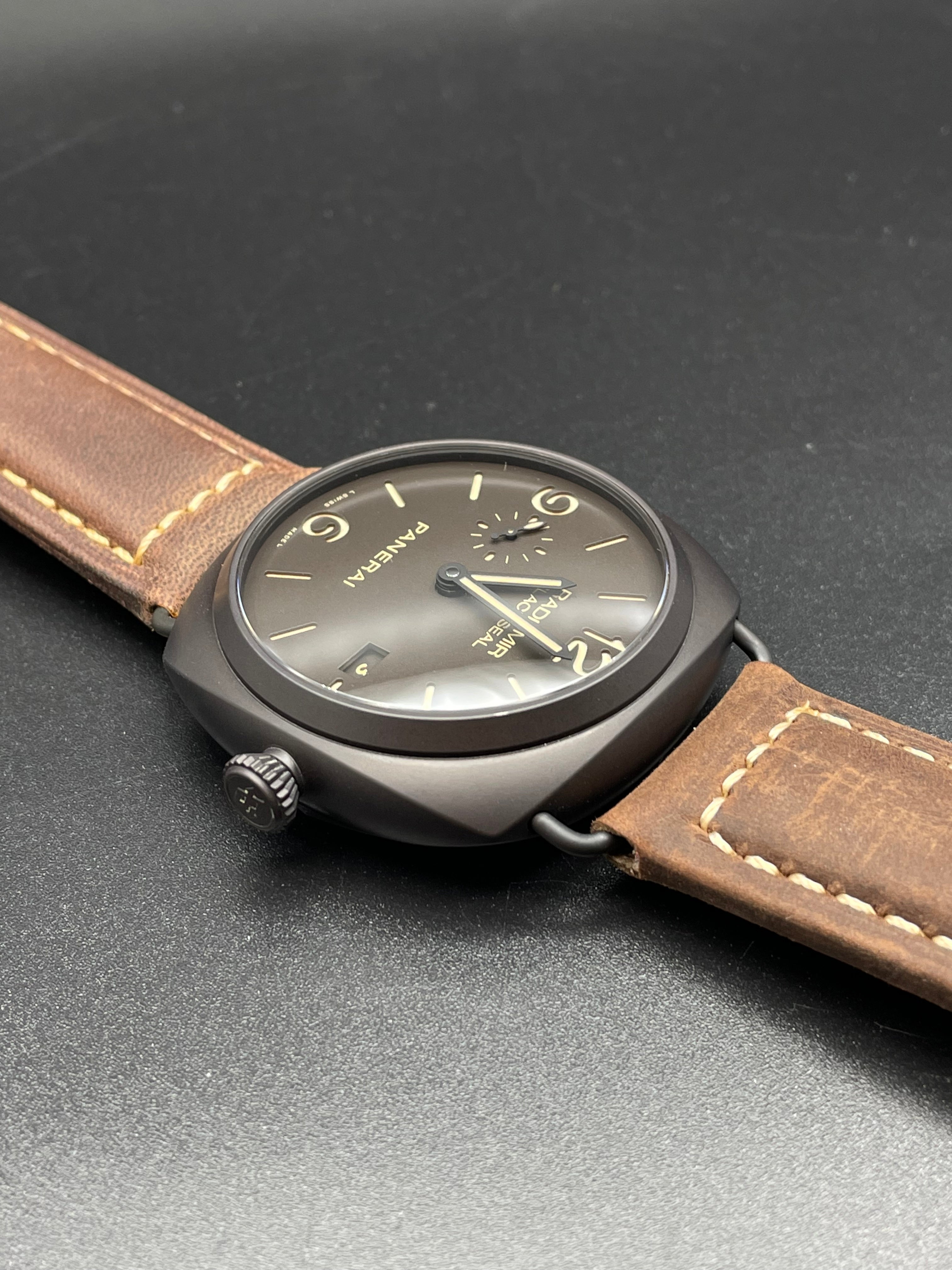 The Panerai Radiomir Composite PAM00505 is a distinguished timepiece that blends Panerai’s rich heritage with modern materials, offering a unique take on the classic Radiomir design. This model features a 45mm case crafted from Panerai’s proprietary composite material, which is lightweight, highly durable, and scratch-resistant. Both the case and the dial are finished in a deep brown color, creating a cohesive and refined aesthetic that sets this watch apart from more traditional black or steel models. The matte finish of the composite material lends the watch a contemporary yet understated elegance, perfectly complementing the iconic cushion-shaped Radiomir case.