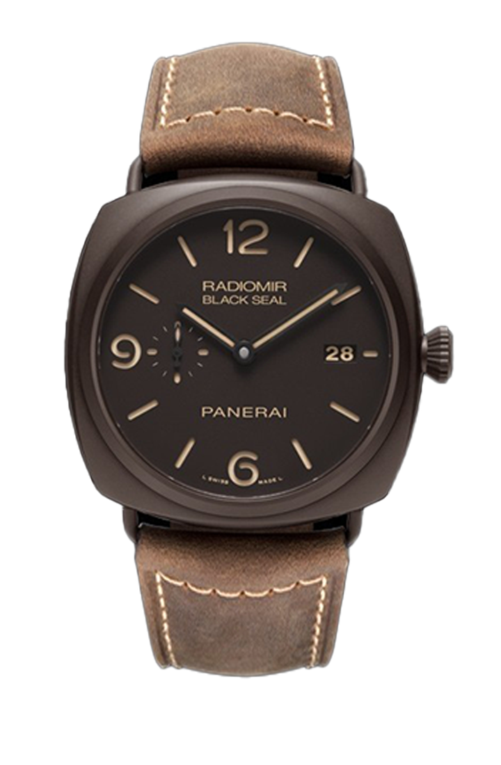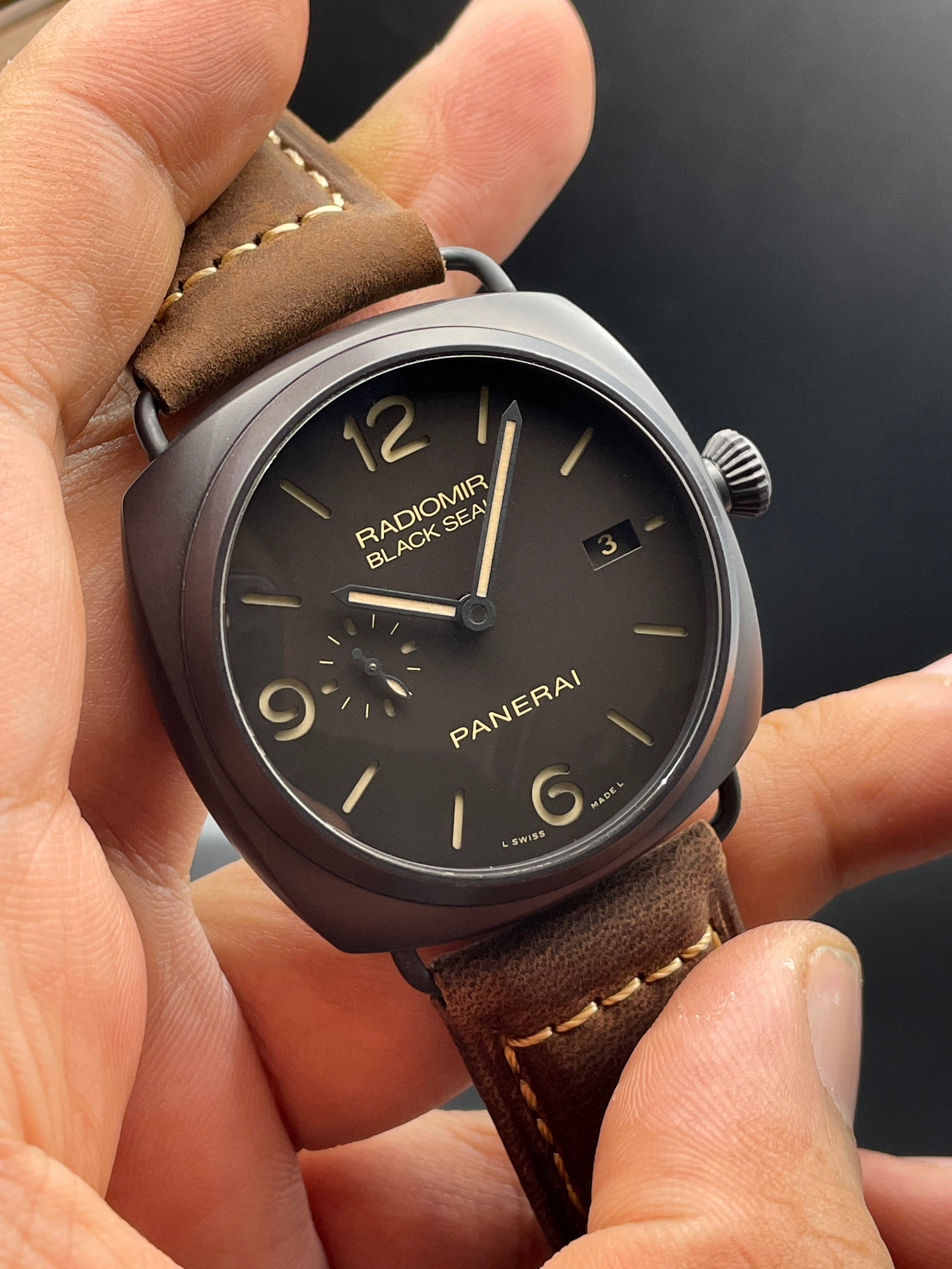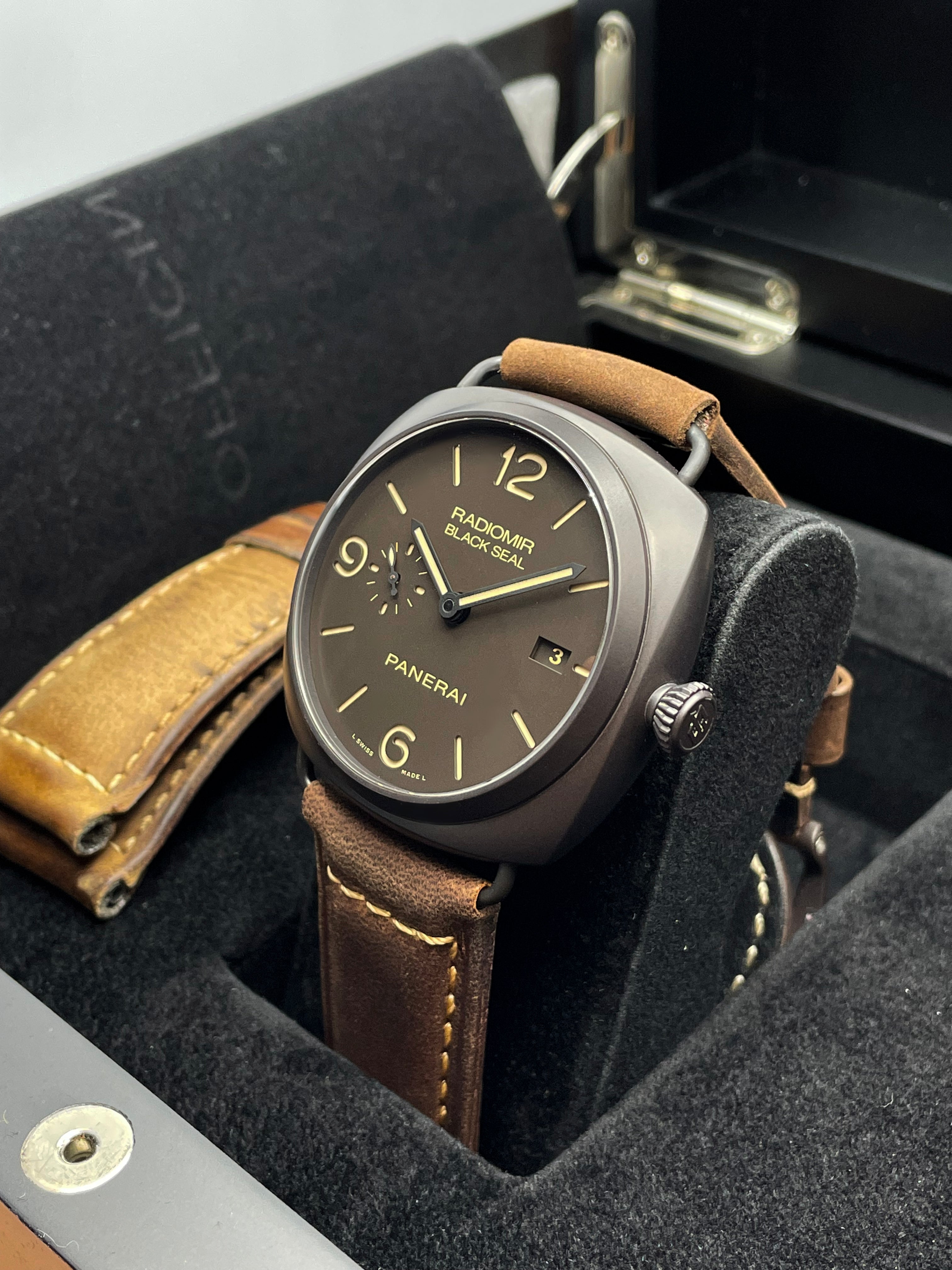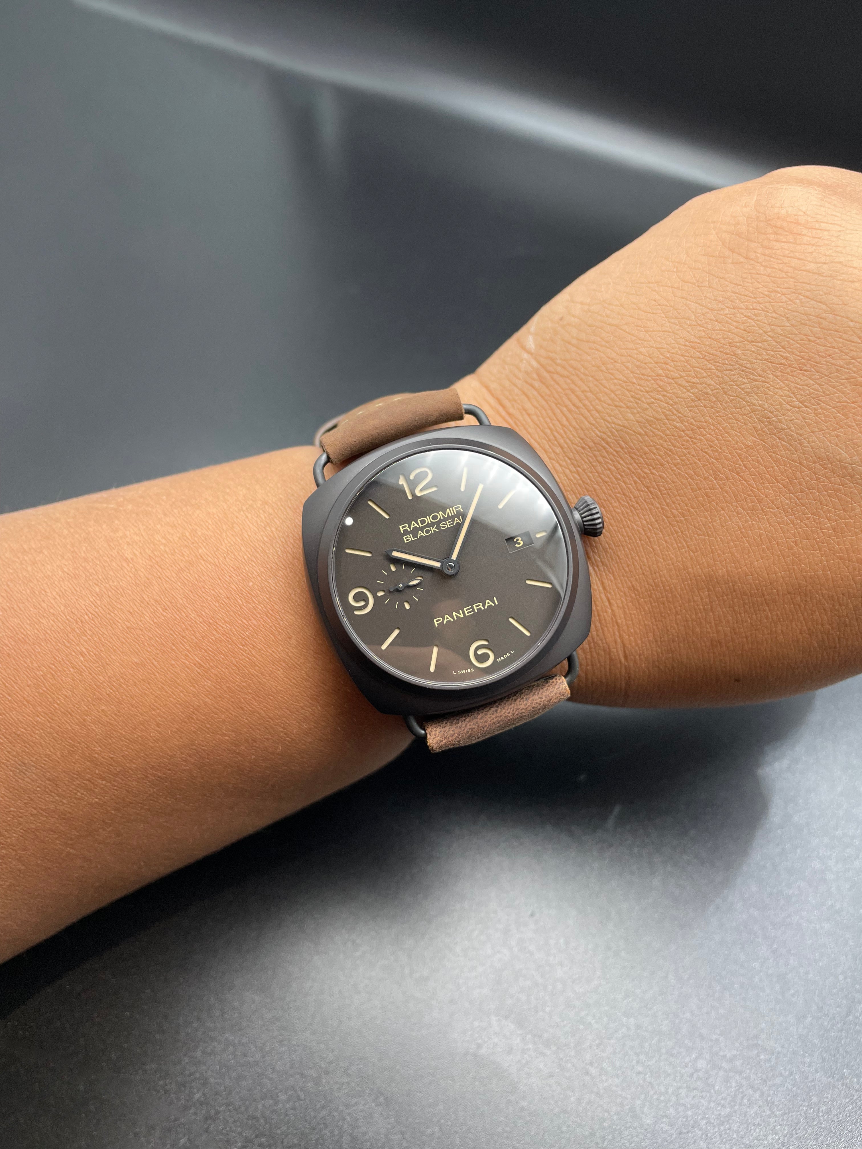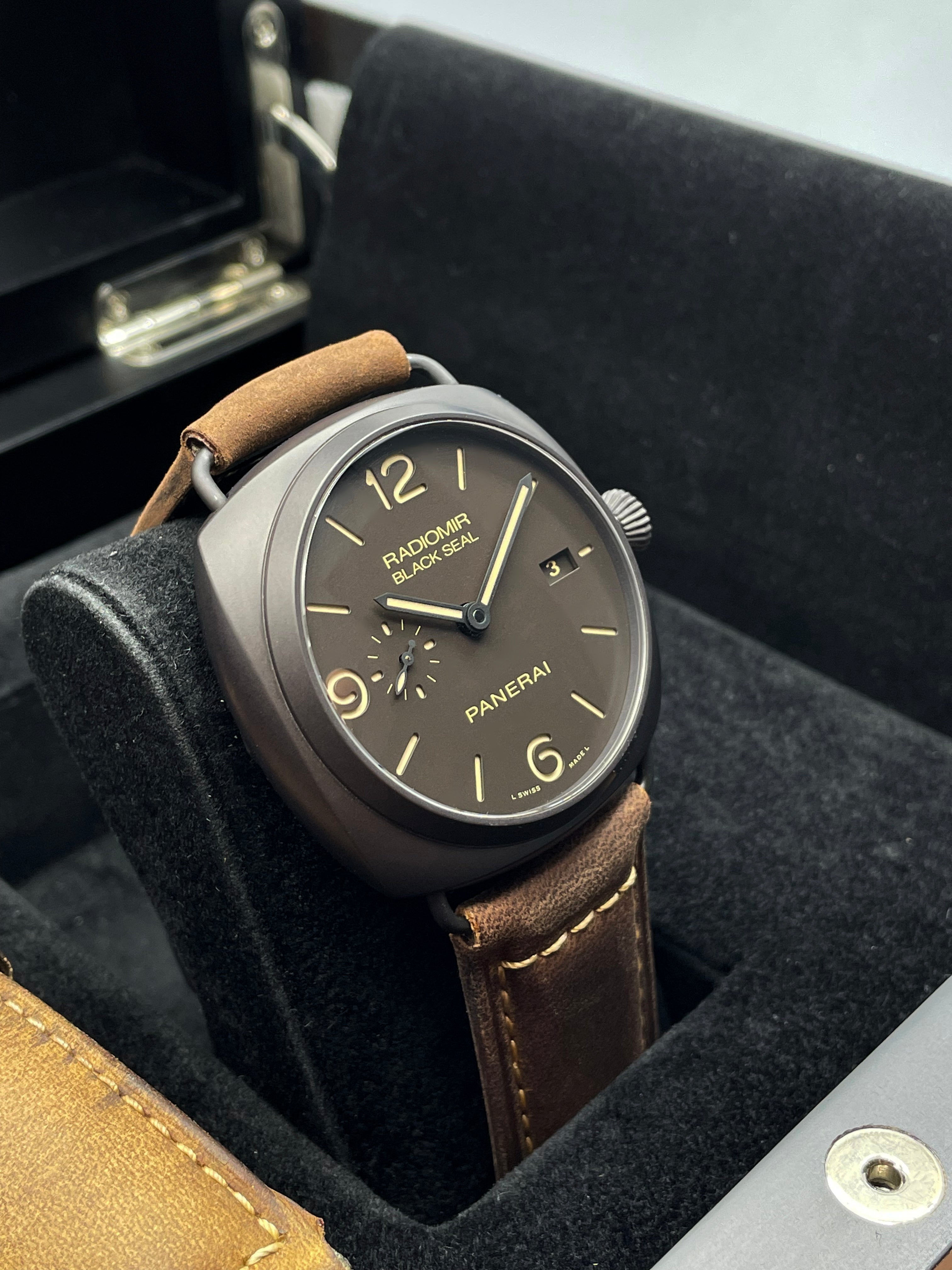 The Panerai Radiomir Composite PAM00505 is a distinguished timepiece that blends Panerai’s rich heritage with modern materials, offering a unique take on the classic Radiomir design. This model features a 45mm case crafted from Panerai’s proprietary composite material, which is lightweight, highly durable, and scratch-resistant. Both the case and the dial are finished in a deep brown color, creating a cohesive and refined aesthetic that sets this watch apart from more traditional black or steel models. The matte finish of the composite material lends the watch a contemporary yet understated elegance, perfectly complementing the iconic cushion-shaped Radiomir case.