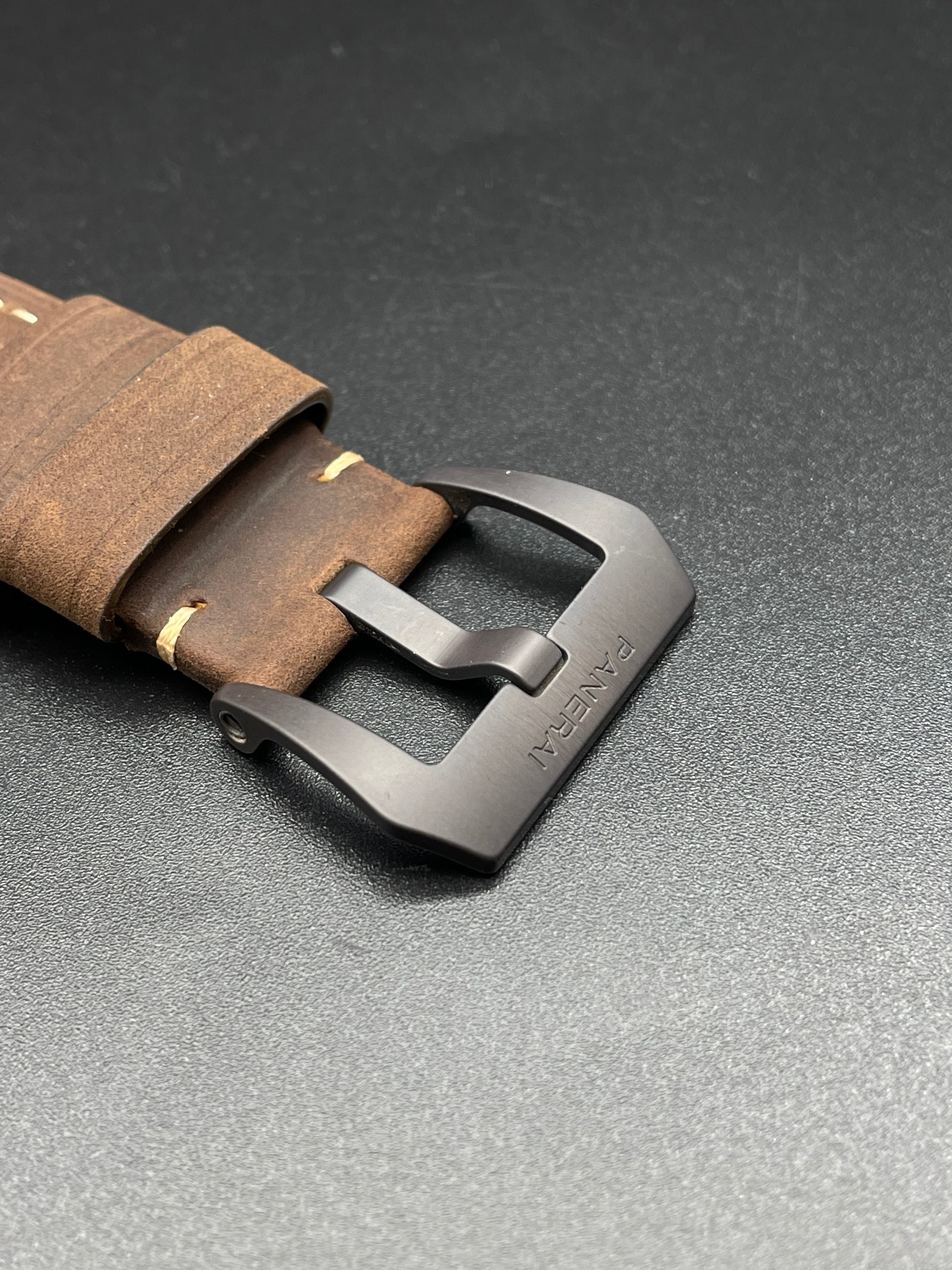 The brown dial of the PAM00505 continues Panerai’s tradition of simplicity and legibility. The minimalist design features large, luminescent Arabic numerals and hour markers that ensure excellent visibility, even in low-light conditions. The sandwich-style dial construction, a signature Panerai feature, enhances the watch’s readability by placing the luminous material between two layers. A small seconds sub-dial at 9 o’clock adds functionality while maintaining the clean, uncluttered look that Panerai is known for.