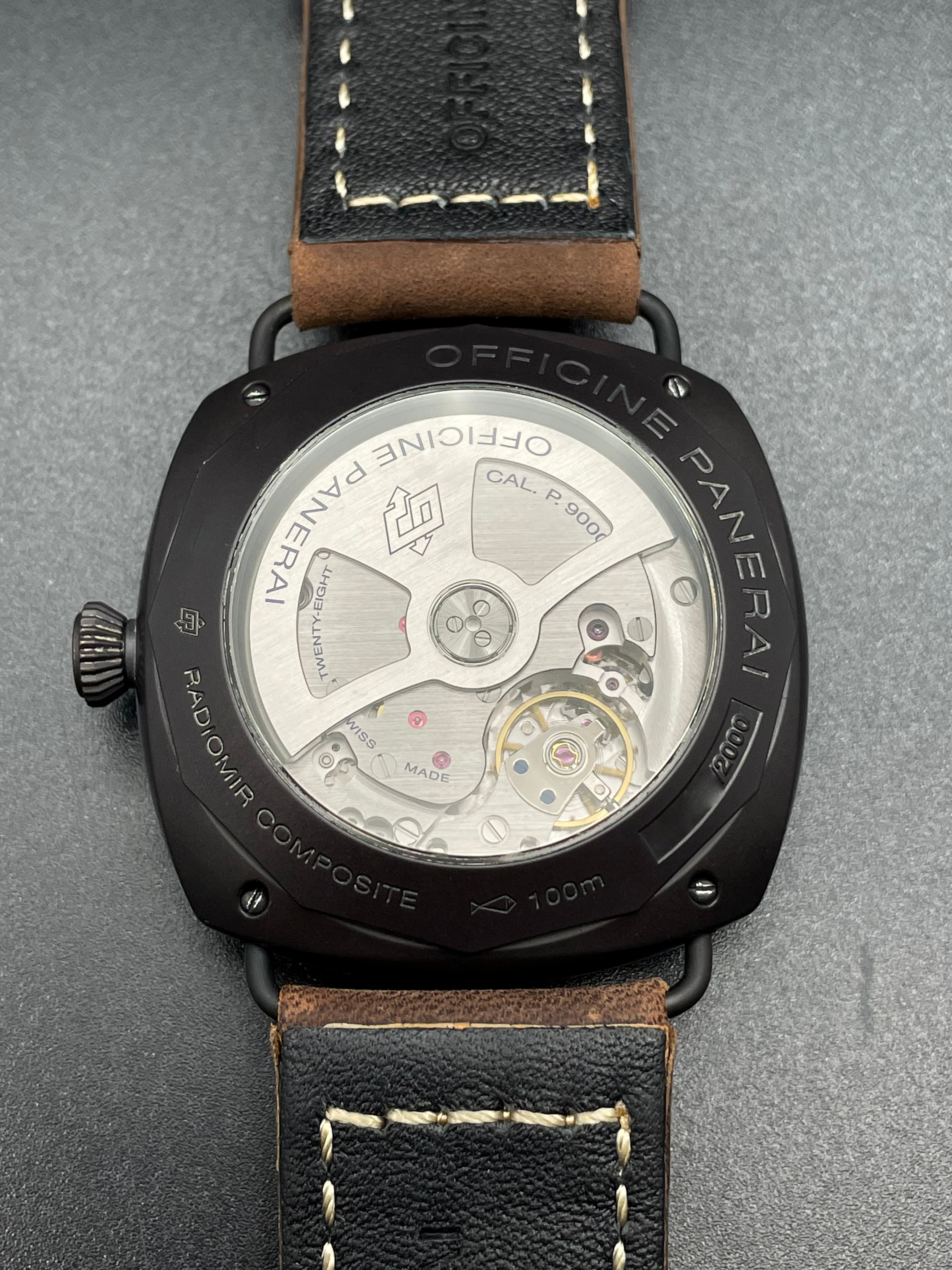 Powering the Radiomir Composite PAM00505 is the in-house Panerai P.9000 automatic movement, which provides a robust three-day power reserve thanks to its dual-barrel construction. The movement can be admired through the transparent case back, showcasing Panerai’s attention to detail and craftsmanship. Unfortunately, this reference has been discontinued and is no longer in production, making the PAM00505 a sought-after piece for collectors and enthusiasts who appreciate its unique blend of innovative materials and classic Panerai design.
