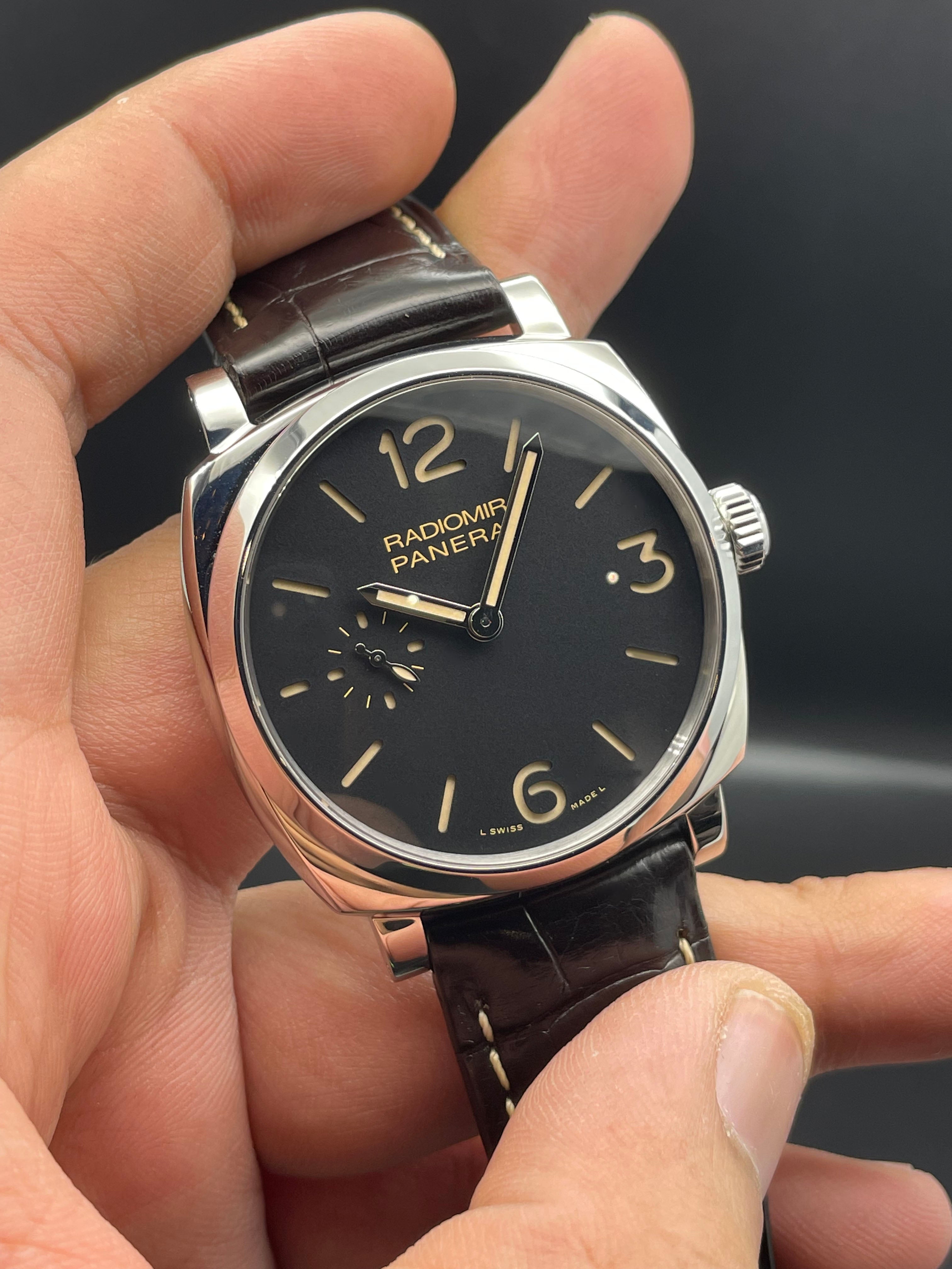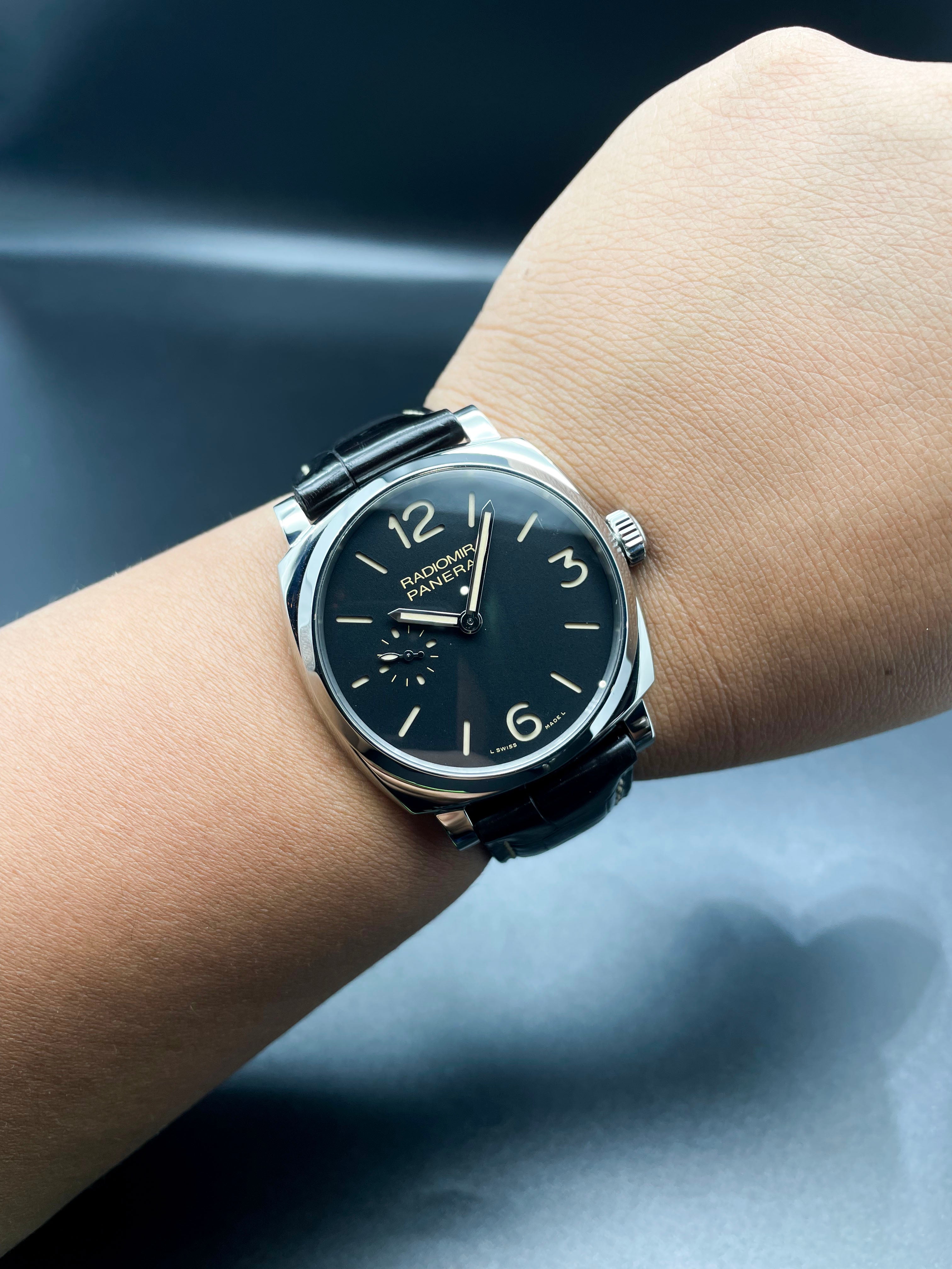 The Panerai Radiomir 1940 42mm PAM00512 is a refined interpretation of Panerai’s historic military-inspired design, balancing vintage aesthetics with modern proportions. Crafted in stainless steel, its 42mm case offers a more wearable alternative to the traditionally larger Radiomir models while still maintaining the brand’s distinct DNA. Unlike the wire lugs seen on classic Radiomir designs, the integrated lugs of the 1940 case provide a sturdier construction while keeping the overall look sleek and elegant. The polished bezel and cushion-shaped case give the watch a sophisticated yet understated presence.
