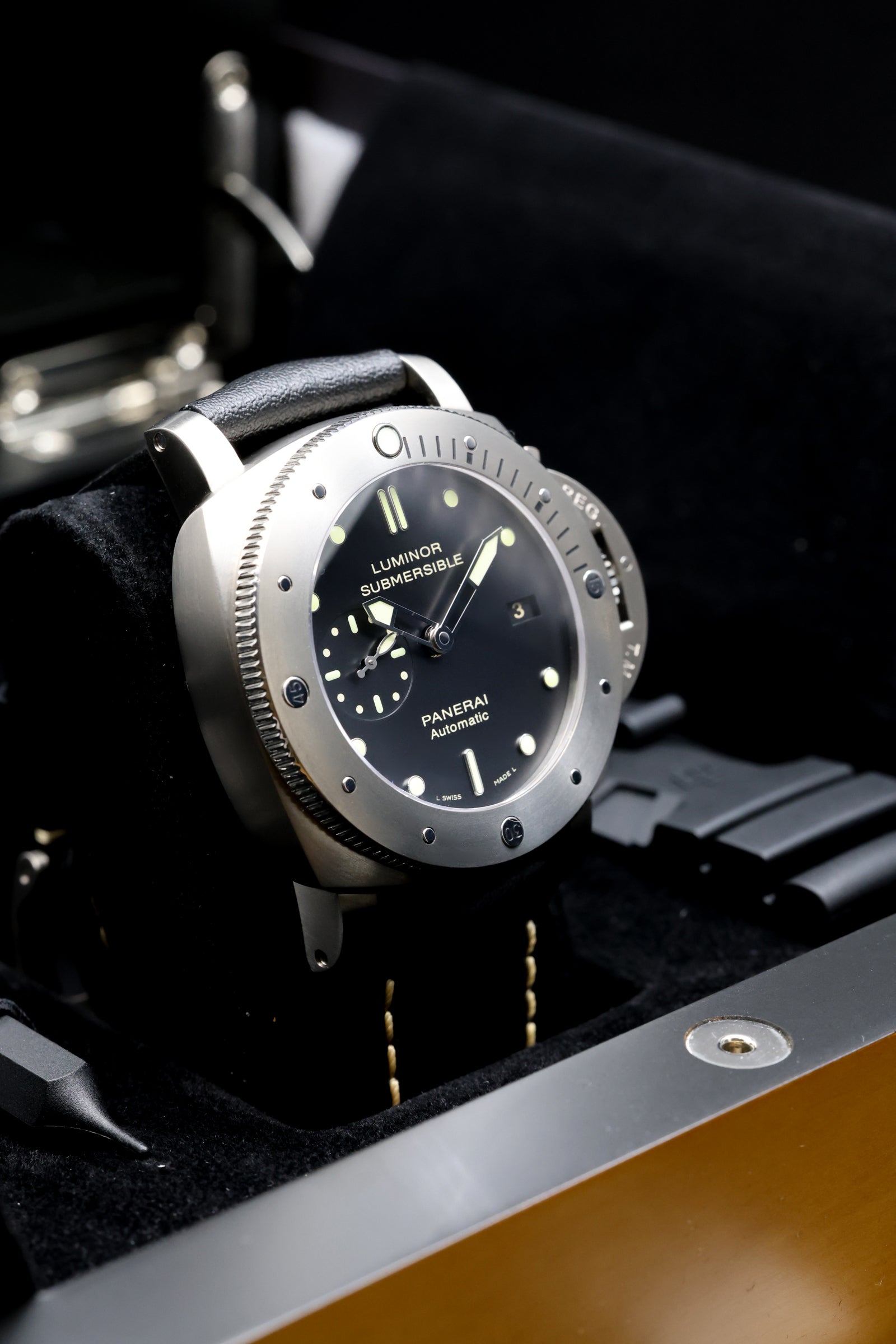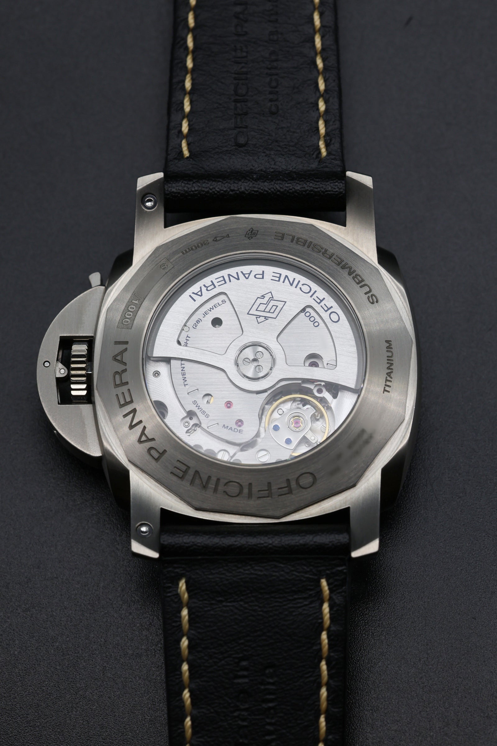 Crafted from lightweight titanium, the PAM00305 features a 47mm case that is both durable and surprisingly wearable given its size. Titanium’s hypoallergenic properties and resistance to corrosion make it an ideal material for a dive watch, especially one designed for professional use. The signature crown-protecting bridge and uni-directional rotating bezel with large markers ensure reliability and practicality underwater, emphasizing Panerai's focus on functionality.