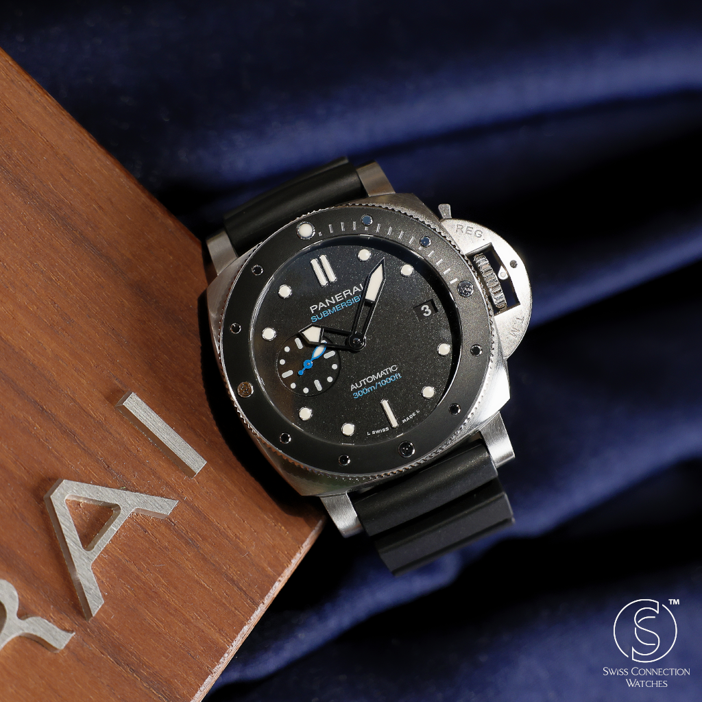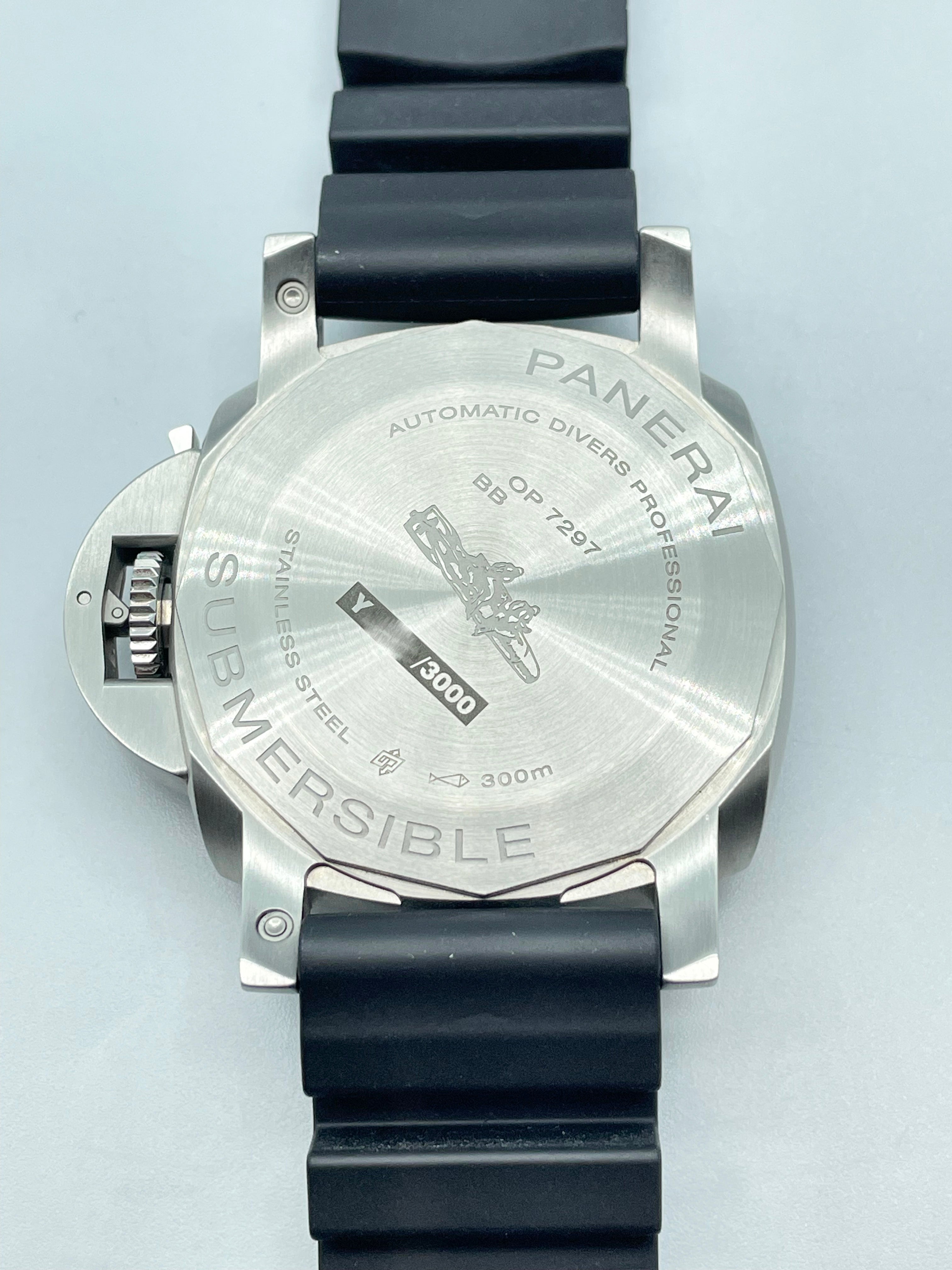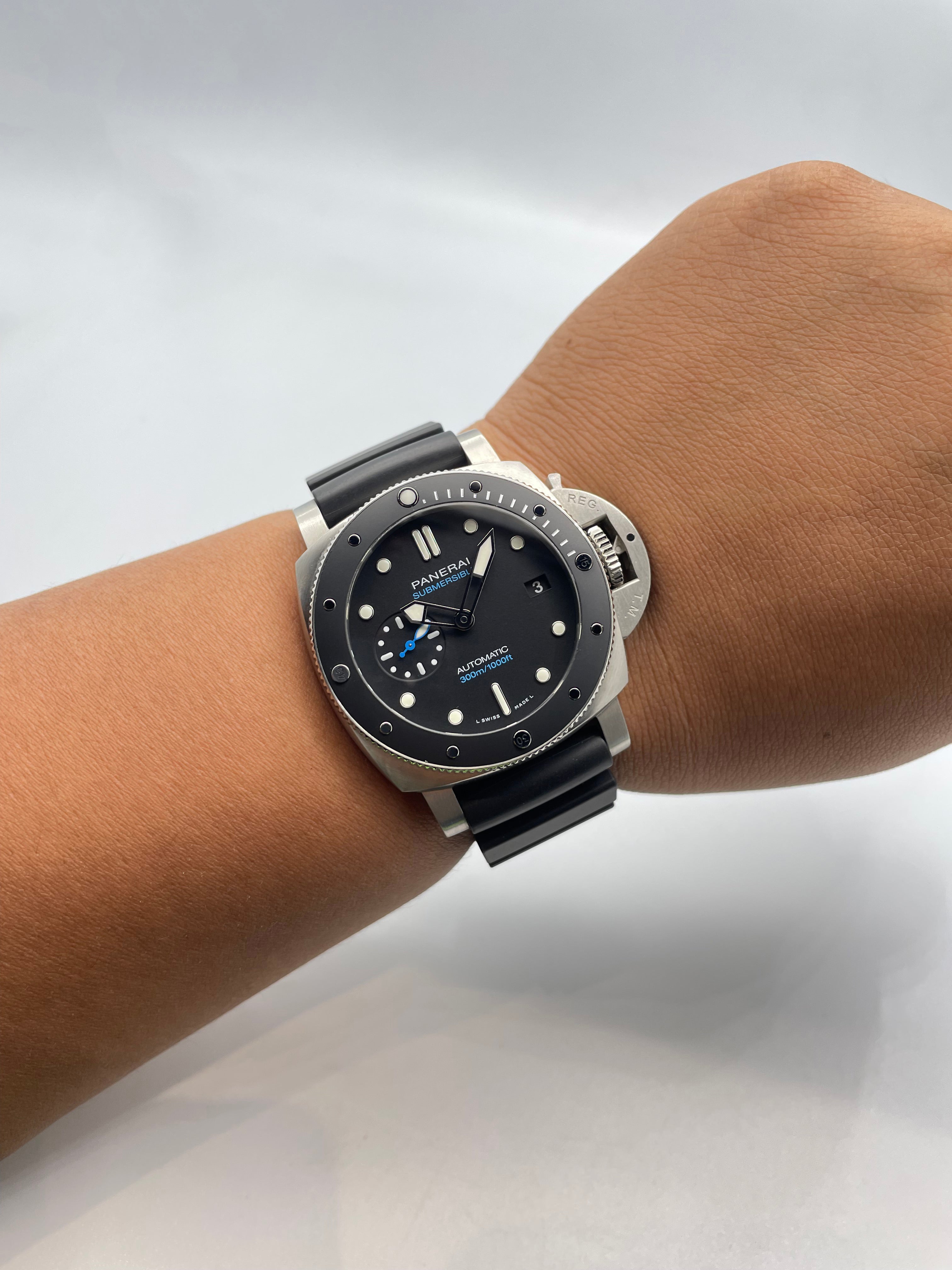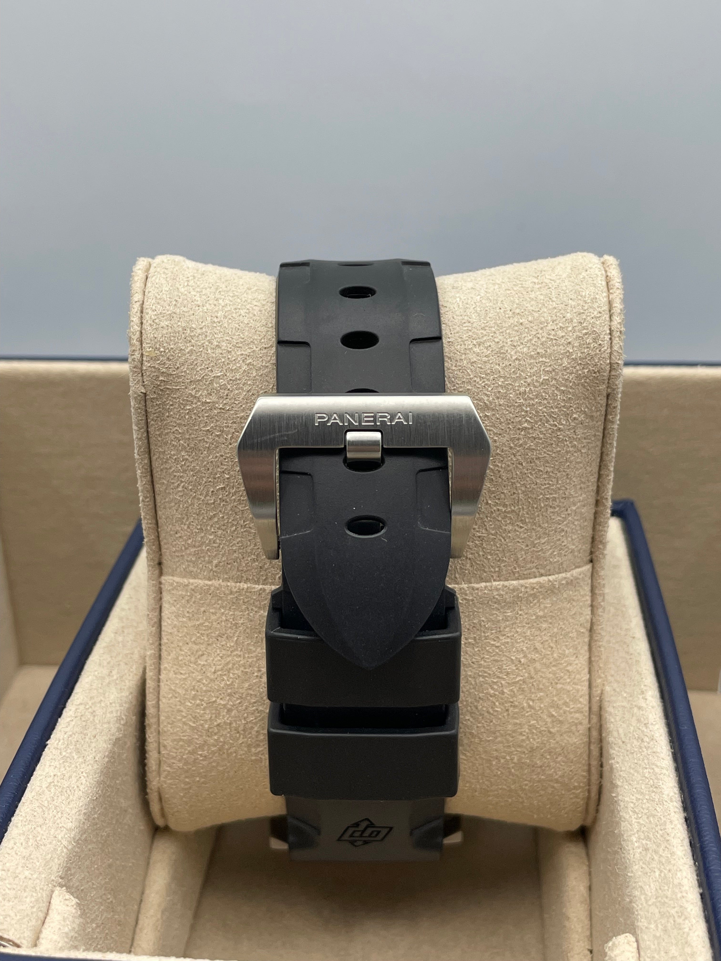Comfortably paired with a matching black rubber strap, the PAM02683 maintains a sporty, dynamic profile while feeling lightweight and secure on the wrist. The 300-meter water resistance and sturdy build make it a capable companion for water sports, travel, or everyday wear, all while staying true to Panerai’s tool-watch DNA.