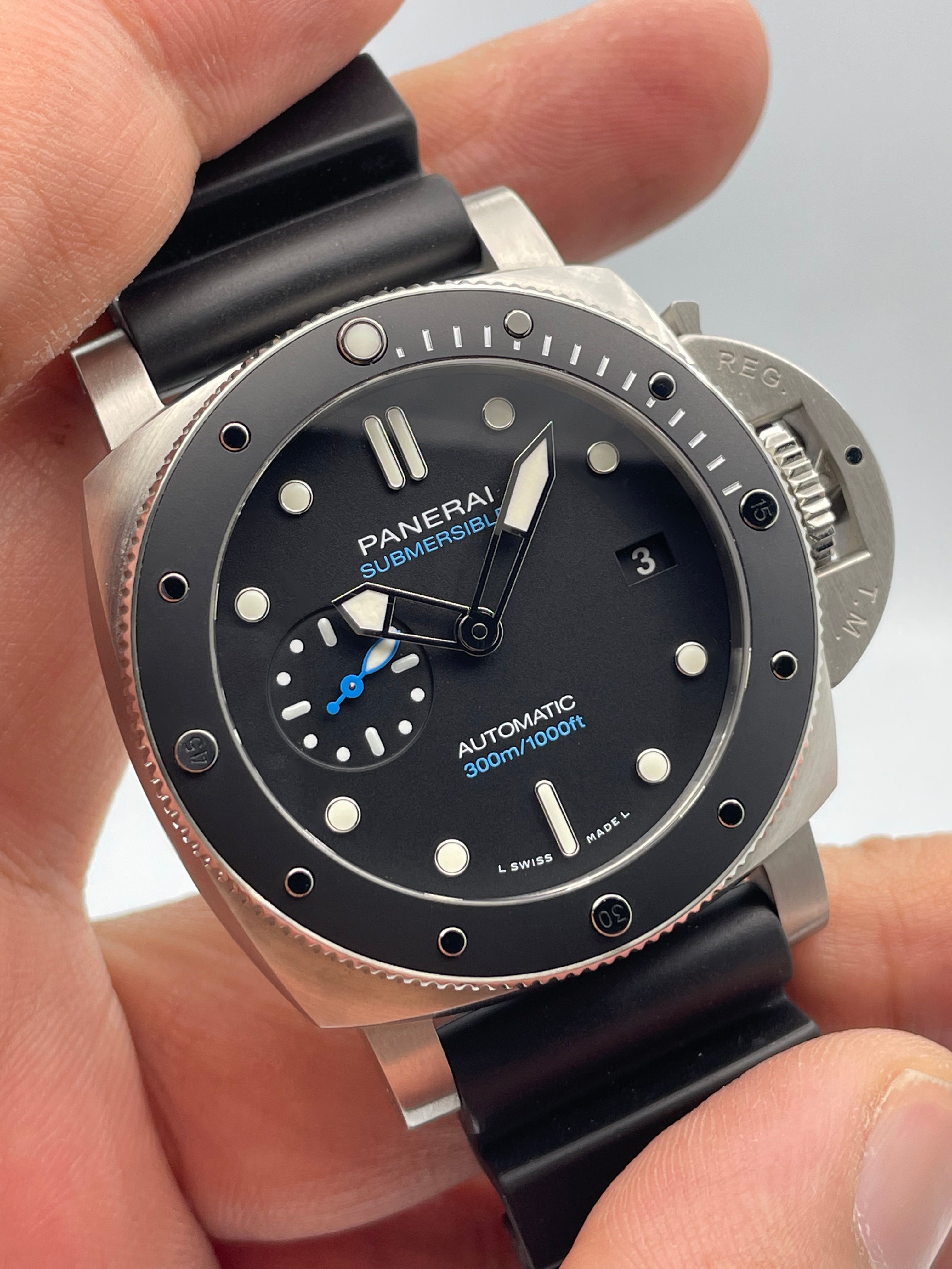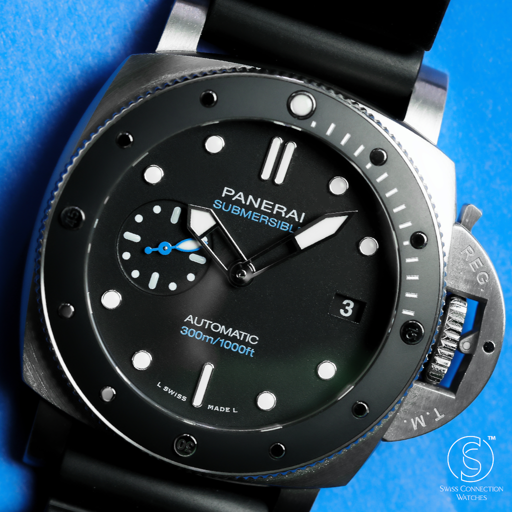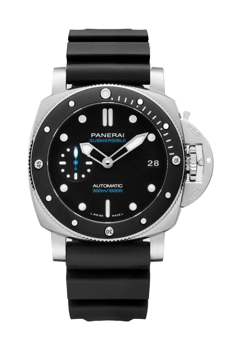 The matte black dial serves as a clean, legible backdrop, punctuated by vibrant blue accents on the seconds hand and select markers—subtle nods to the watch’s aquatic spirit. Large hour markers and bold hands filled with Super-LumiNova ensure excellent visibility in all lighting conditions. The layout remains balanced, with a small seconds subdial at 9 o’clock and a practical date window at 3, reinforcing Panerai’s focus on utility-driven design.