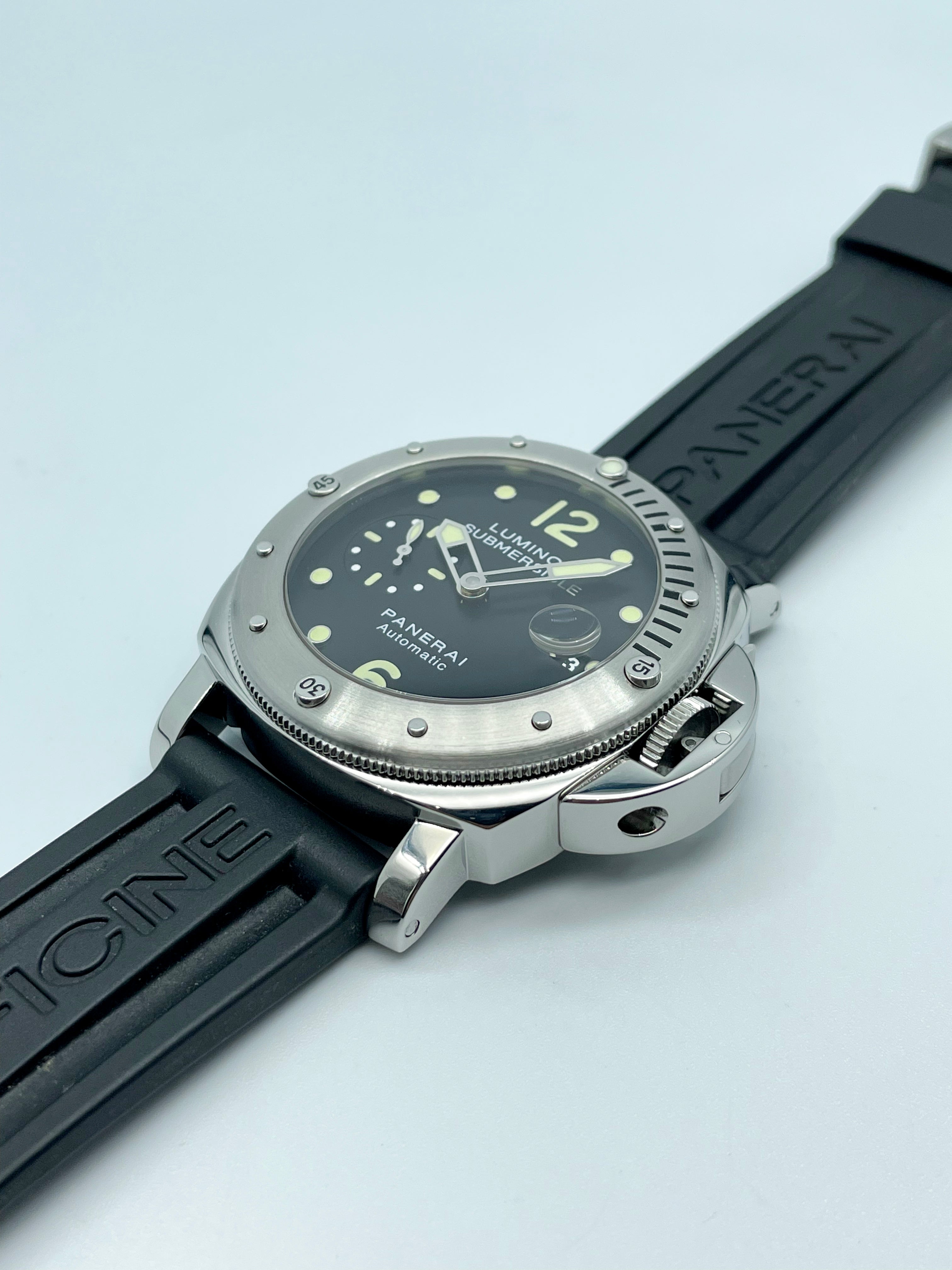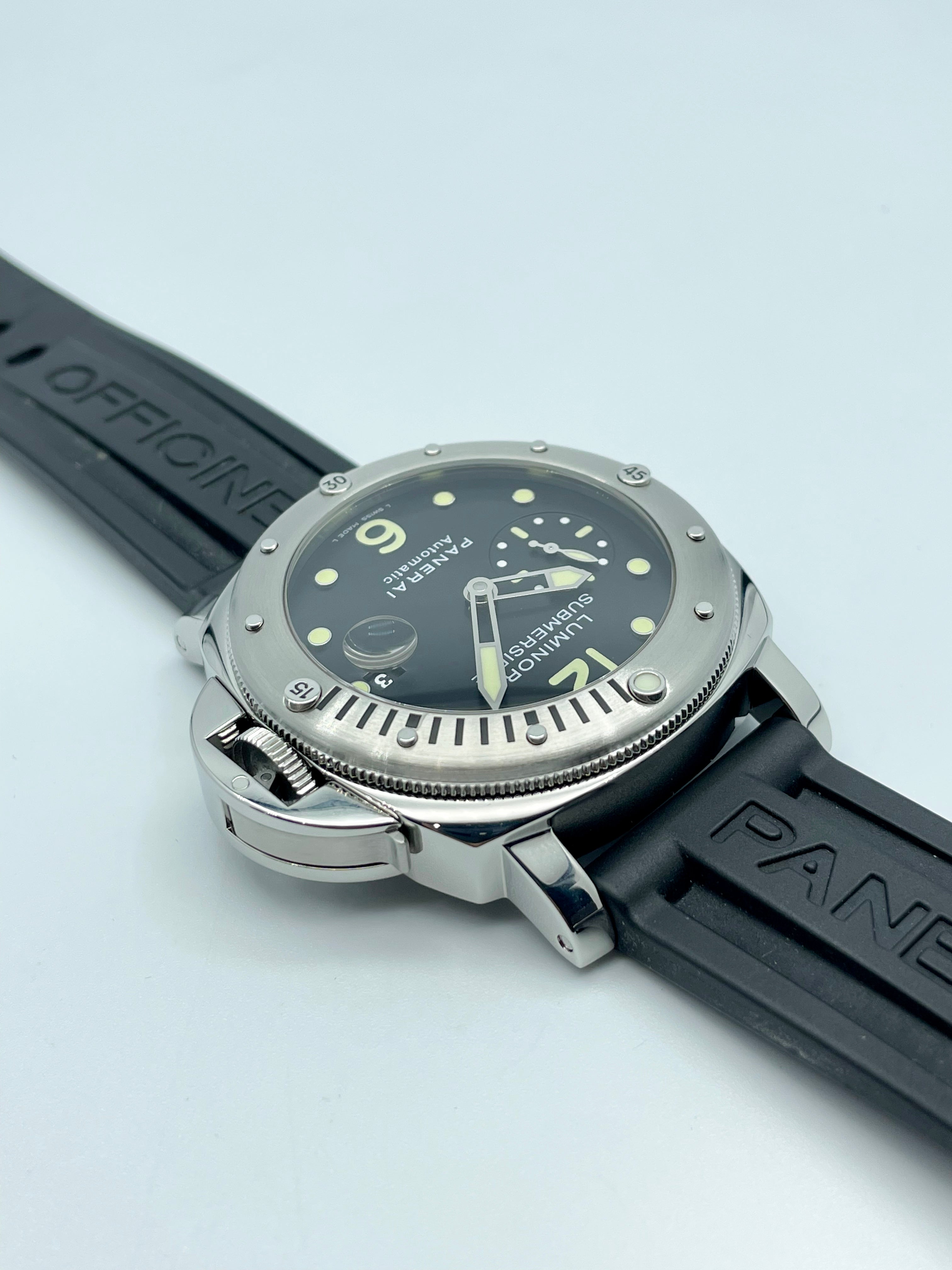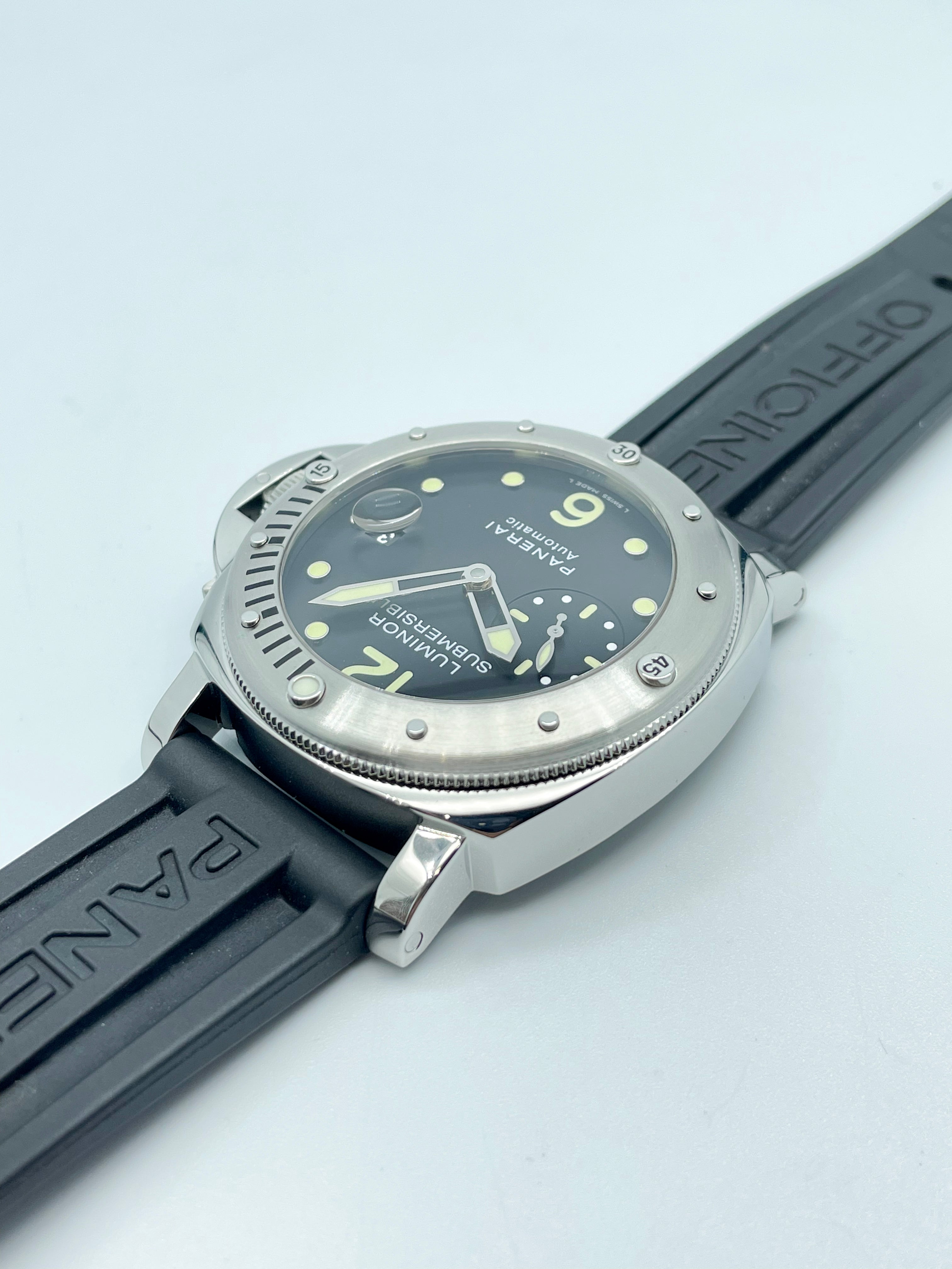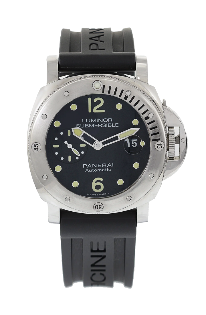 The Panerai Luminor Submersible PAM00024 is a standout model within Panerai’s collection, known for its robust design and professional diving capabilities. Featuring a substantial 44mm stainless steel case, it showcases Panerai’s signature crown-protecting bridge, which enhances water resistance up to 300 meters. This distinctive feature not only secures the crown but also adds to the watch's rugged aesthetic, making it ideal for serious divers.