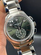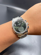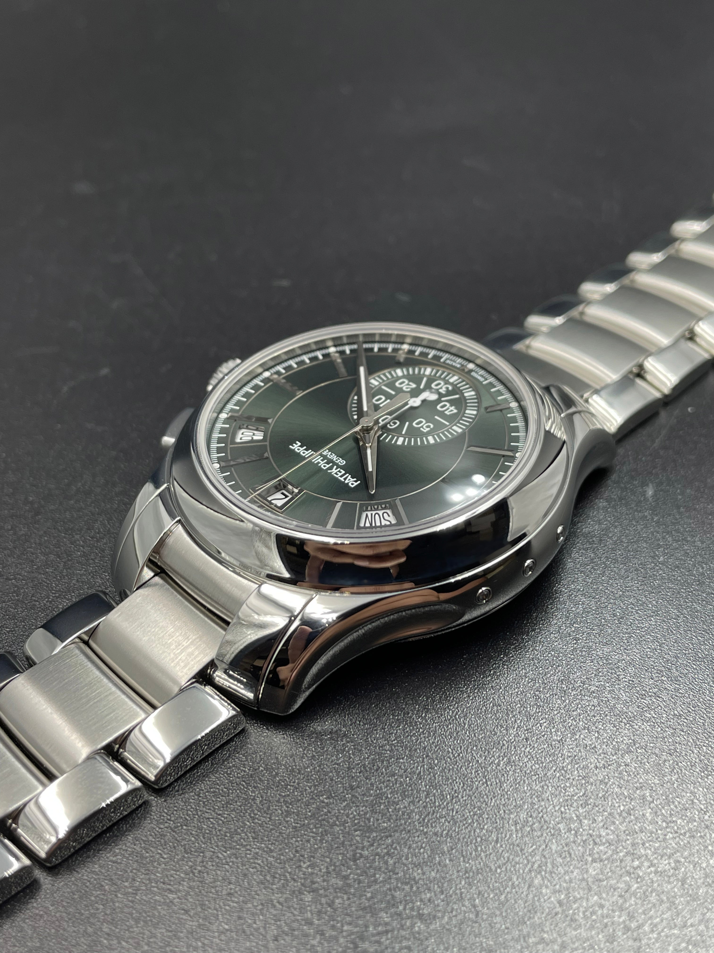 The dial, too, has received a refreshing update, with Patek opting for a mesmerizing sunray-brushed olive green hue. This verdant backdrop provides a striking contrast to the white gold hands, applied markers, and crisp white numerals and tracks, resulting in a visually captivating and legible display. The iconic annual calendar apertures, positioned in the quintessentially European style, retain their proud position at 12 o'clock, while a discreet day/night indicator resides within the 60-minute chronograph counter at 6 o'clock.