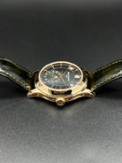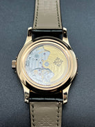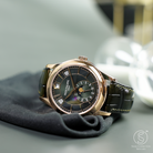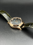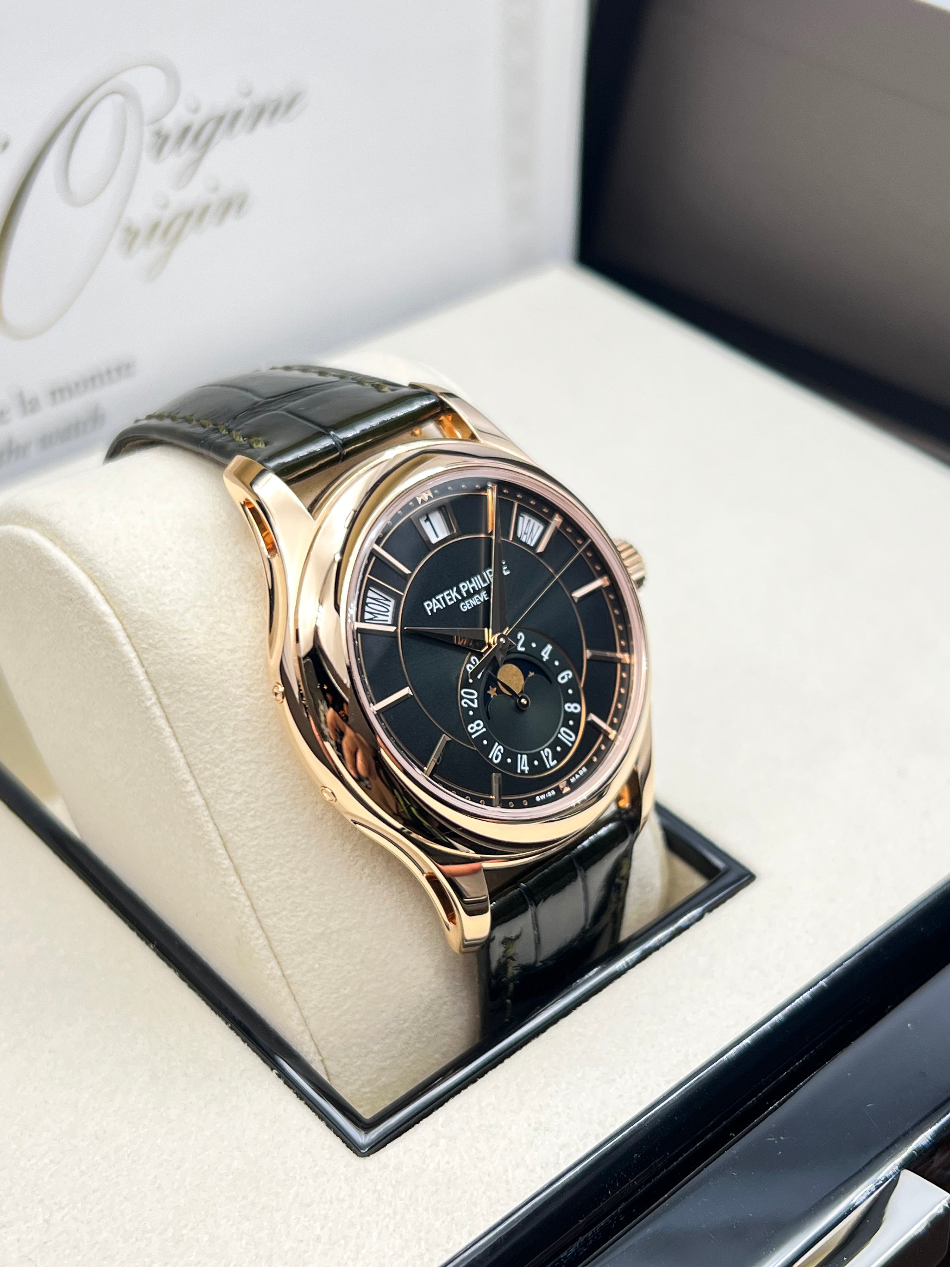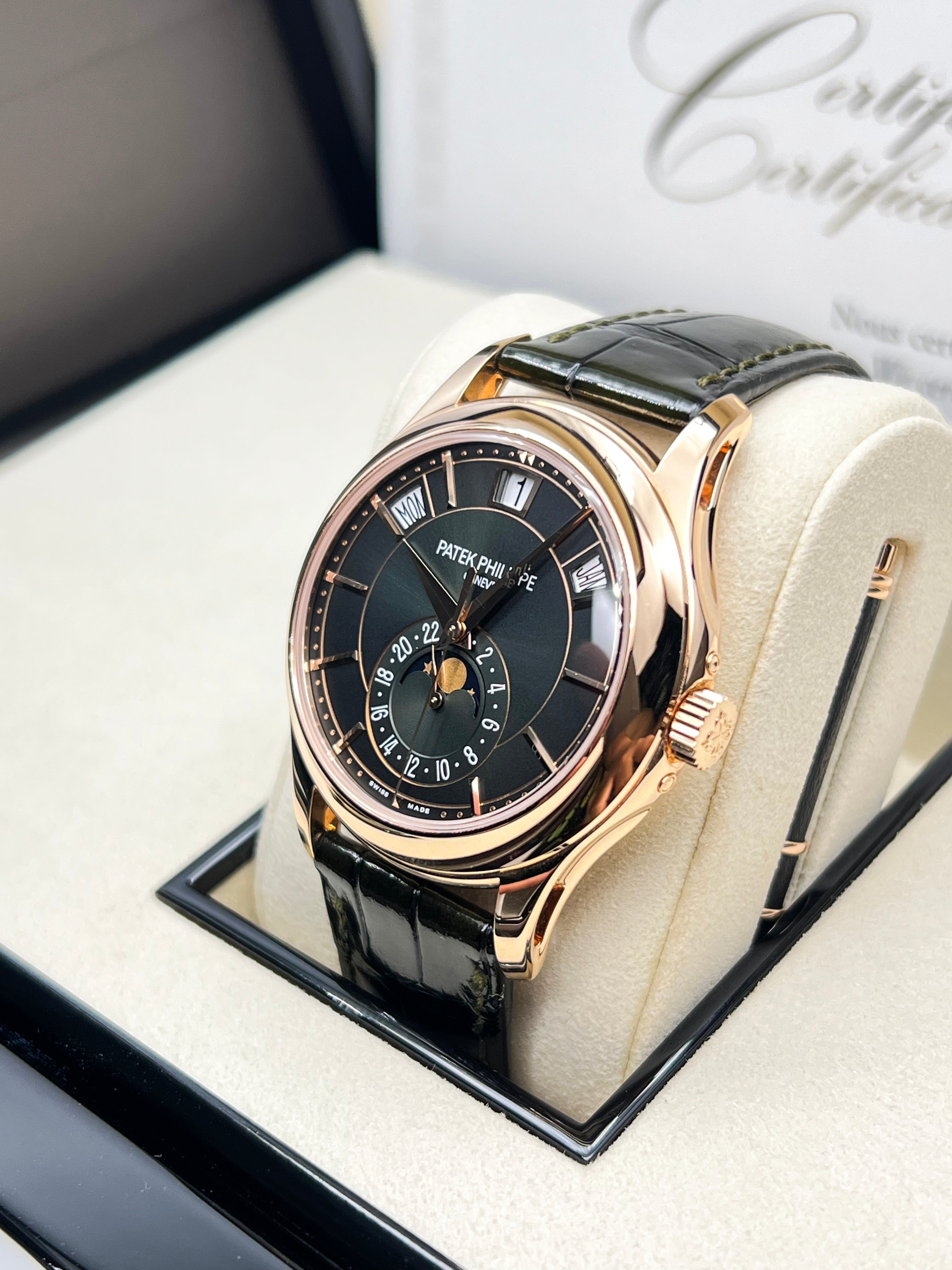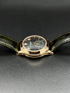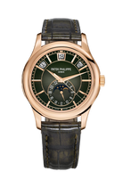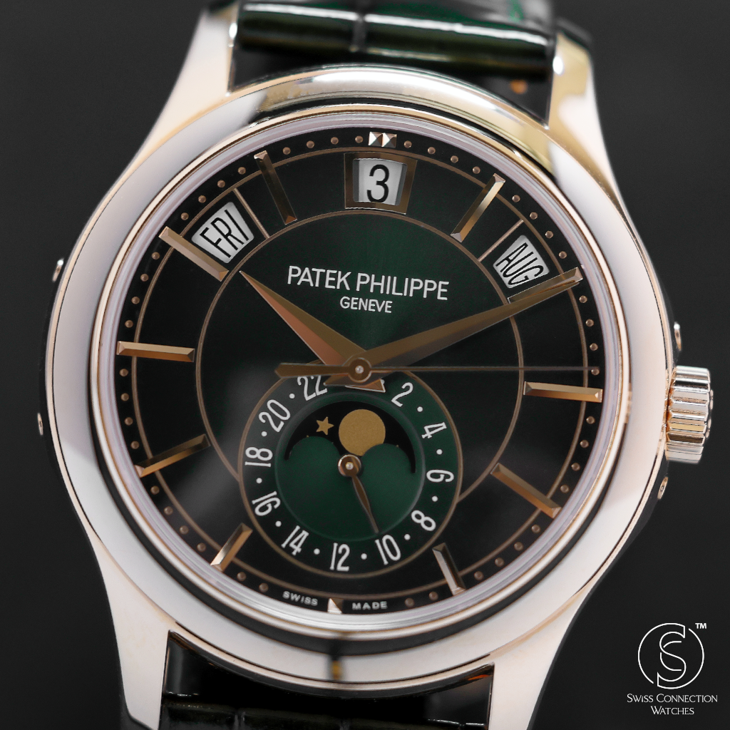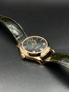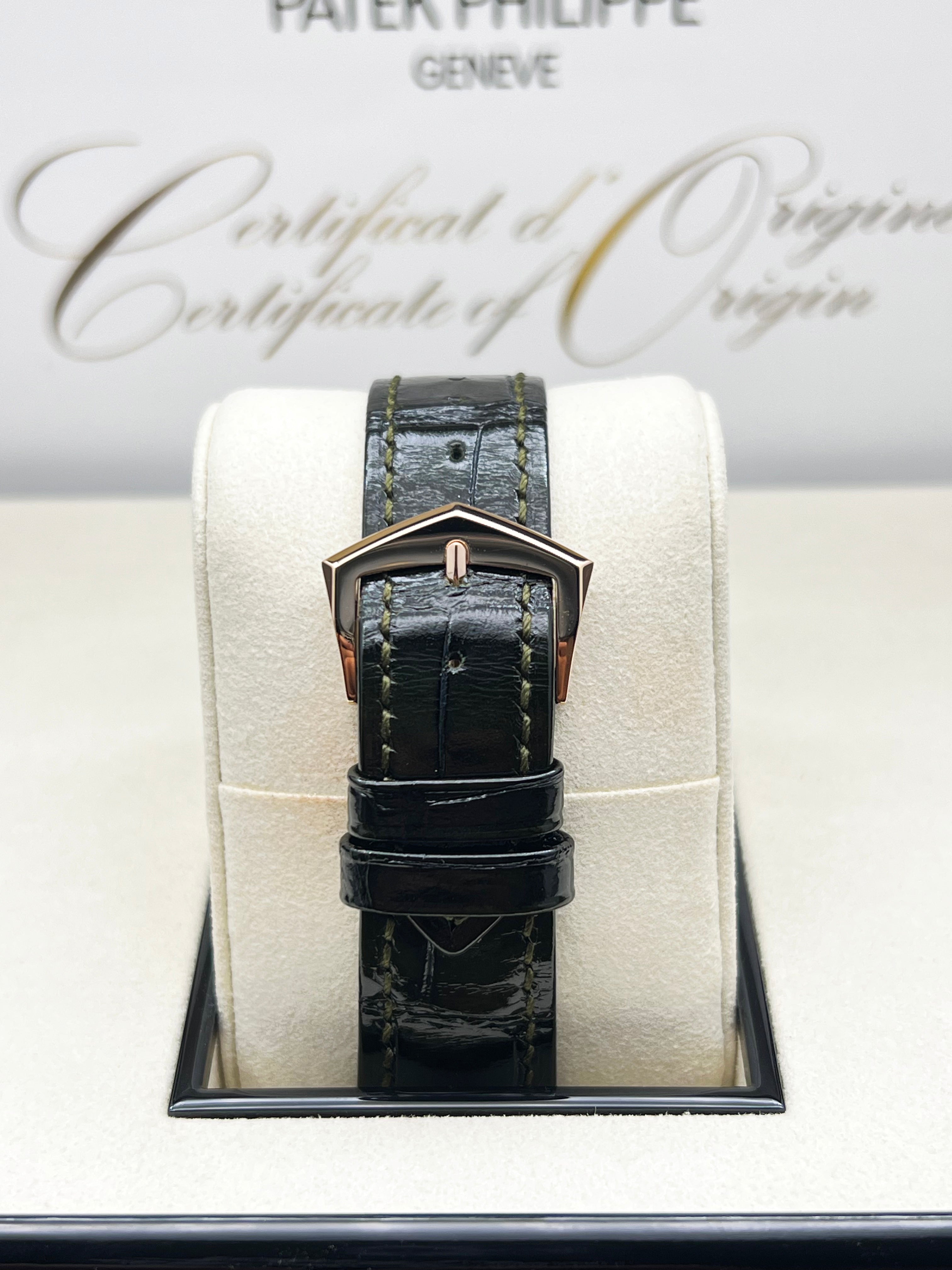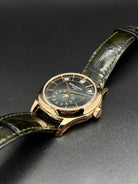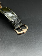 The Patek Philippe Annual Calendar 5205R-011 represents a refined evolution of one of the maison’s most elegant complications. Introduced in 2022, this iteration in rose gold comes with a newly updated case and a stunning olive green sunburst dial that shifts in tone with changing light—bringing a fresh, contemporary allure to a classically styled timepiece. The 5205’s signature triple aperture layout for day, date, and month at the top of the dial remains, providing excellent legibility while preserving the elegant symmetry that defines the collection.