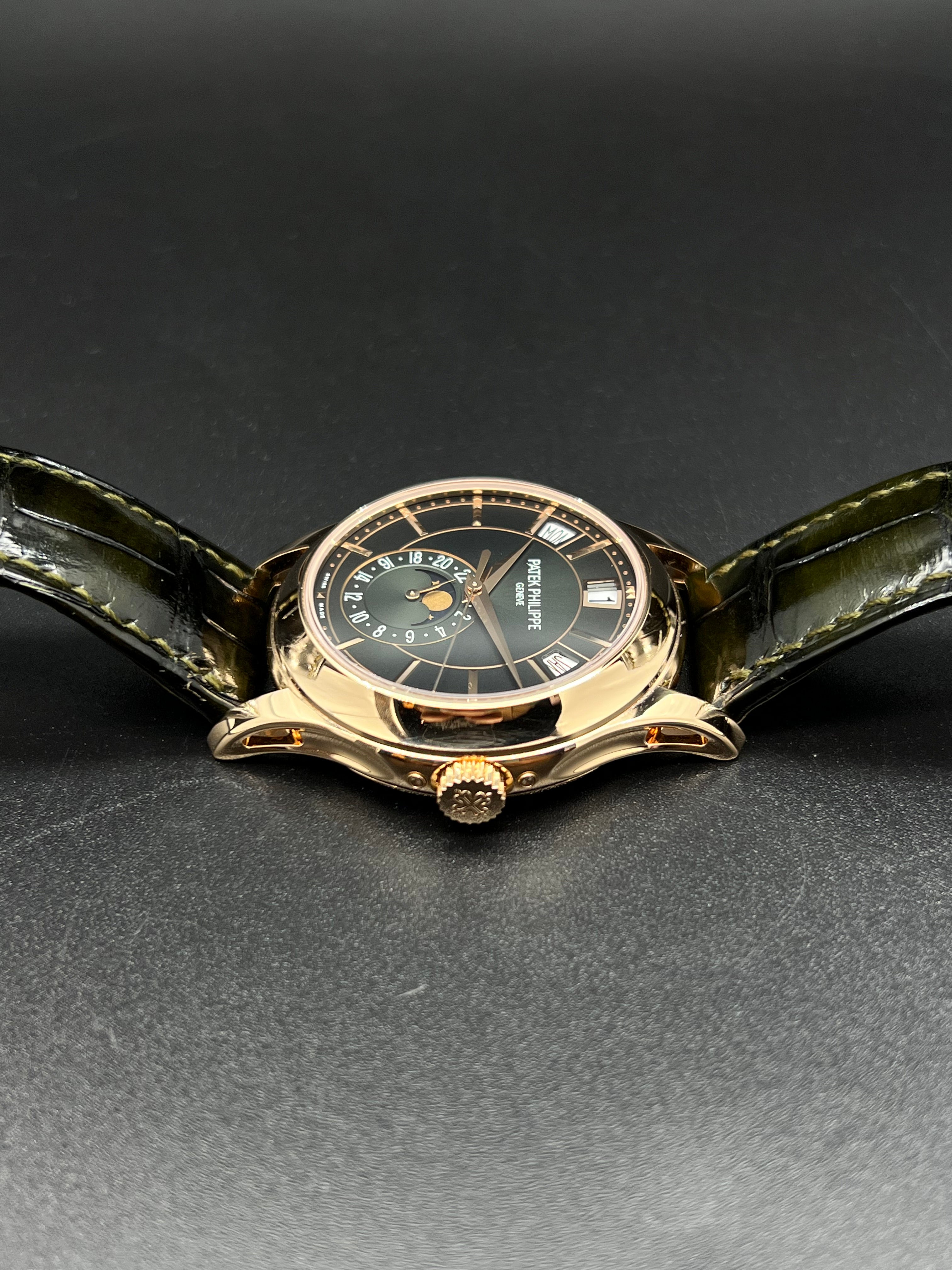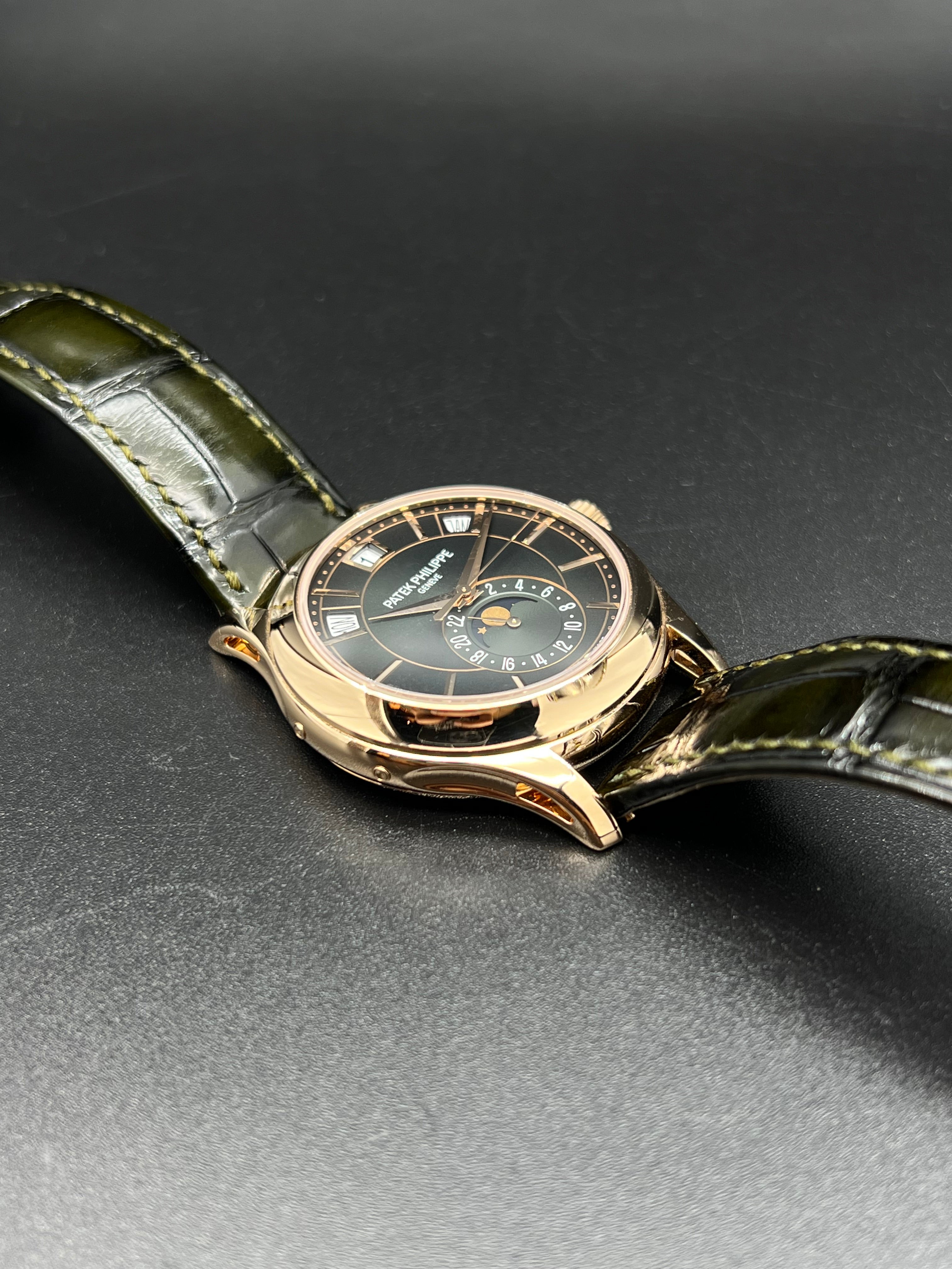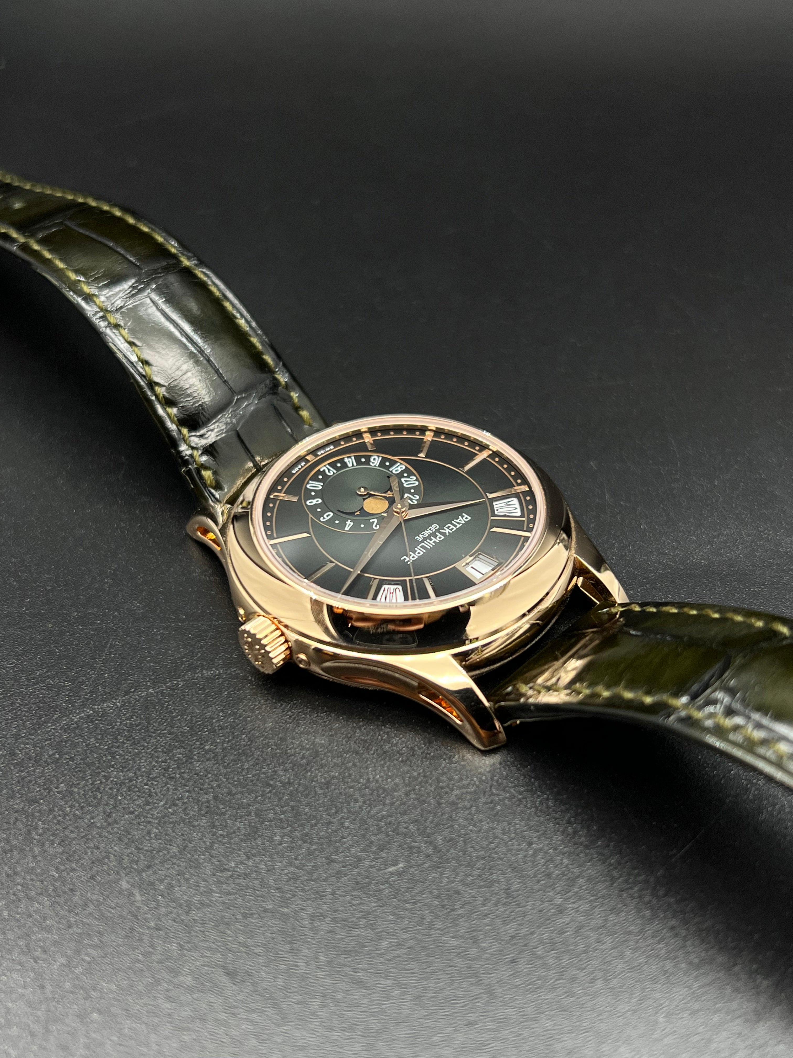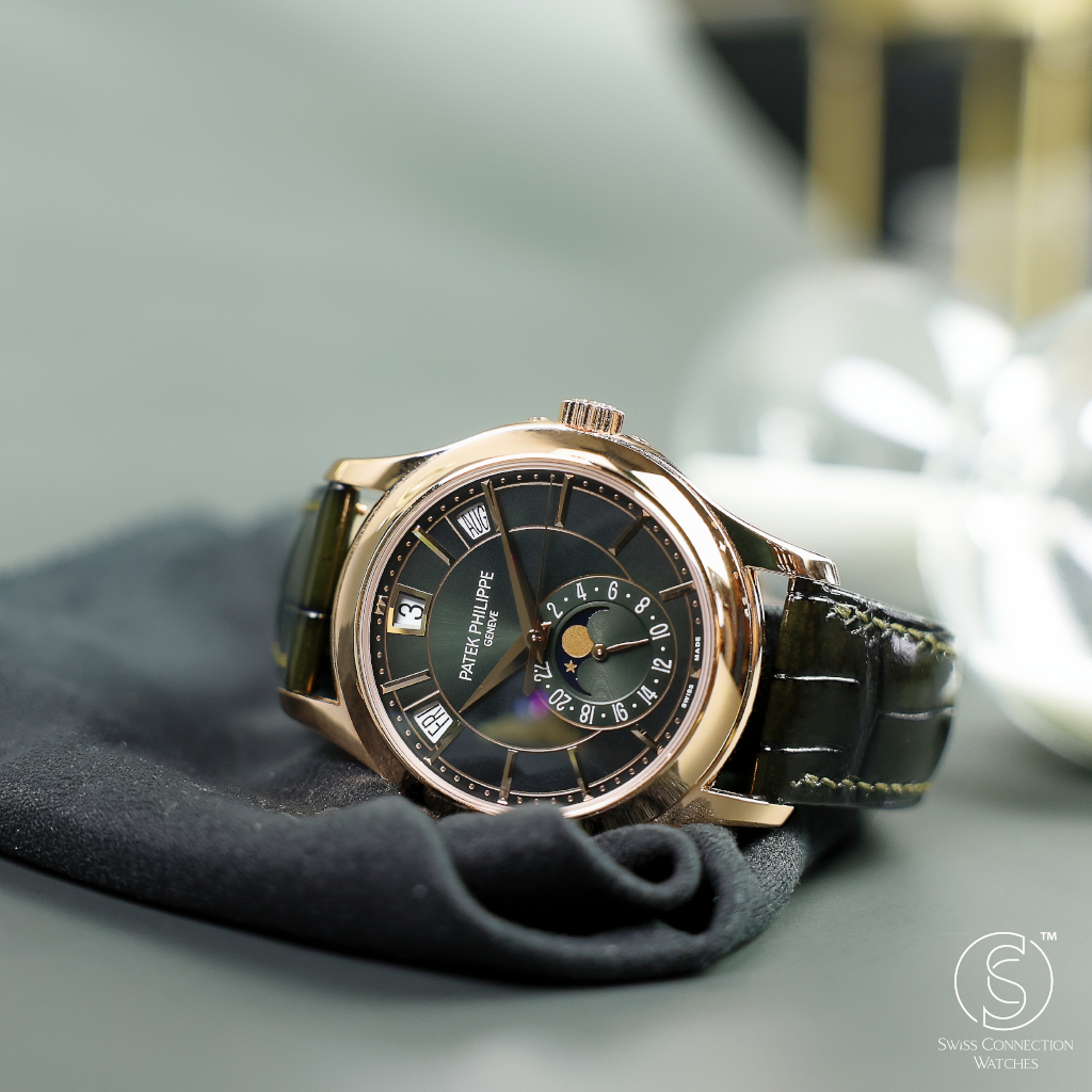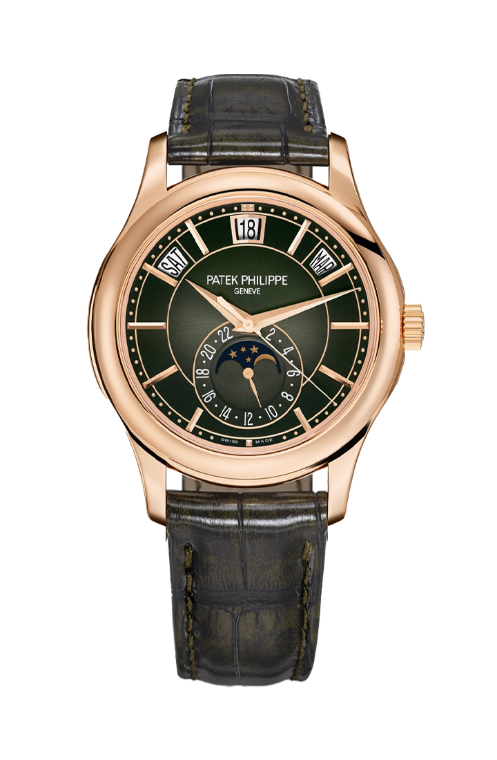 The dial of the 5205R-011 is where this model truly distinguishes itself. The rich olive green color is a first for this reference and adds a modern, luxurious twist to Patek’s typically more conservative palette. Applied rose gold hour markers and dauphine hands stand out sharply against the backdrop, while the moonphase and 24-hour indicator add both charm and functionality to the lower half of the dial. It’s a dial that rewards close inspection, with layers of finishing and subtle color gradation.