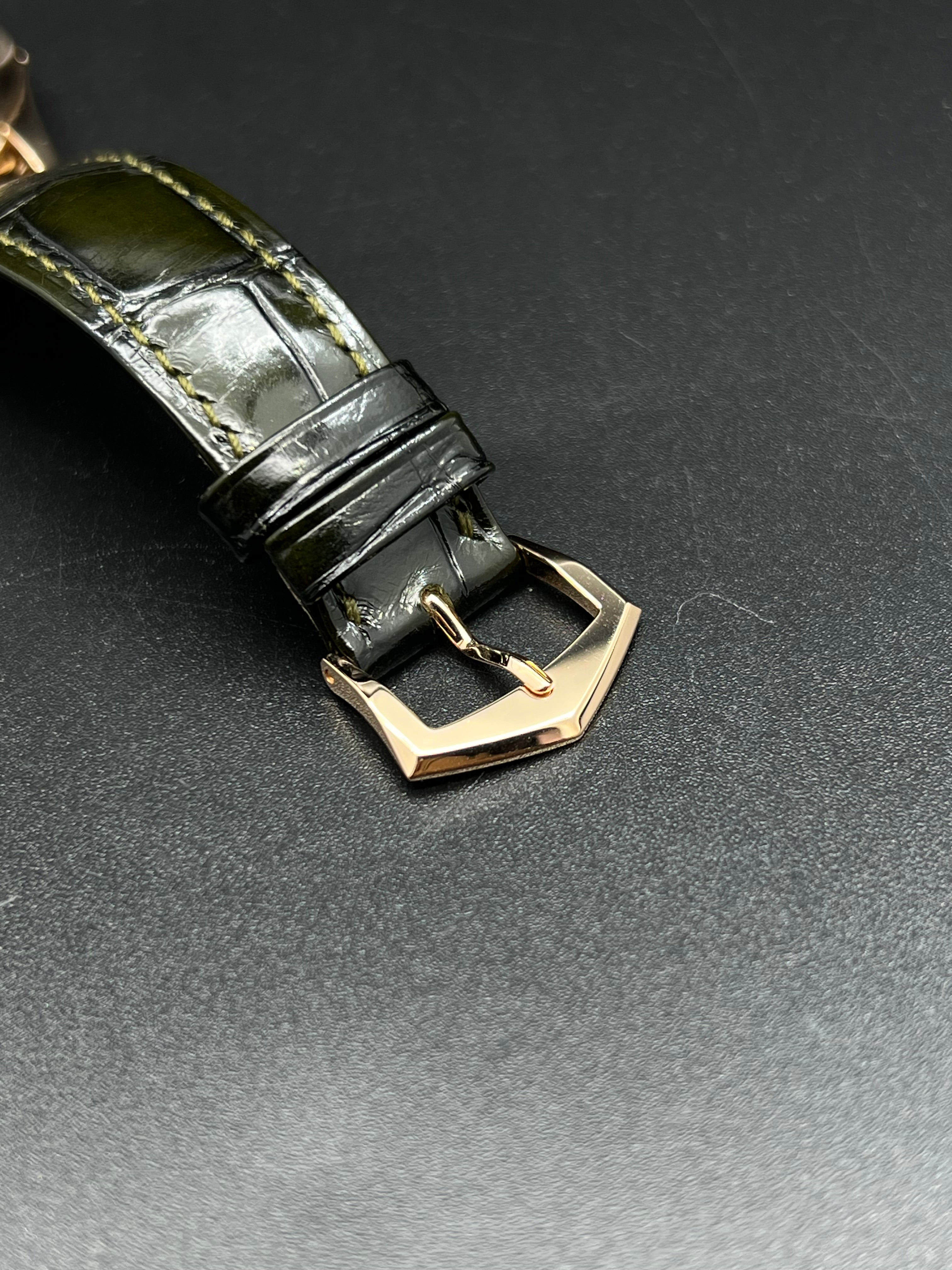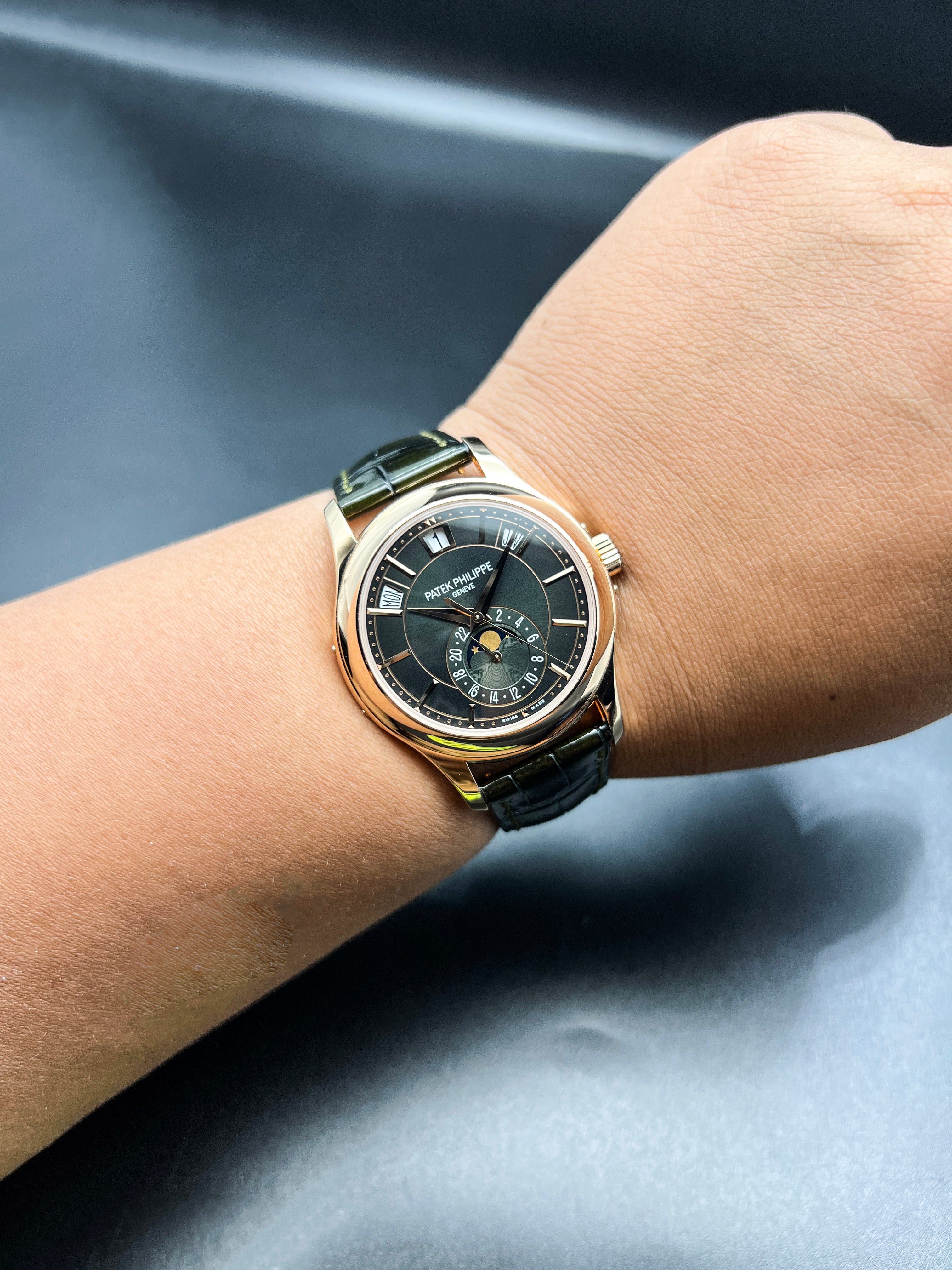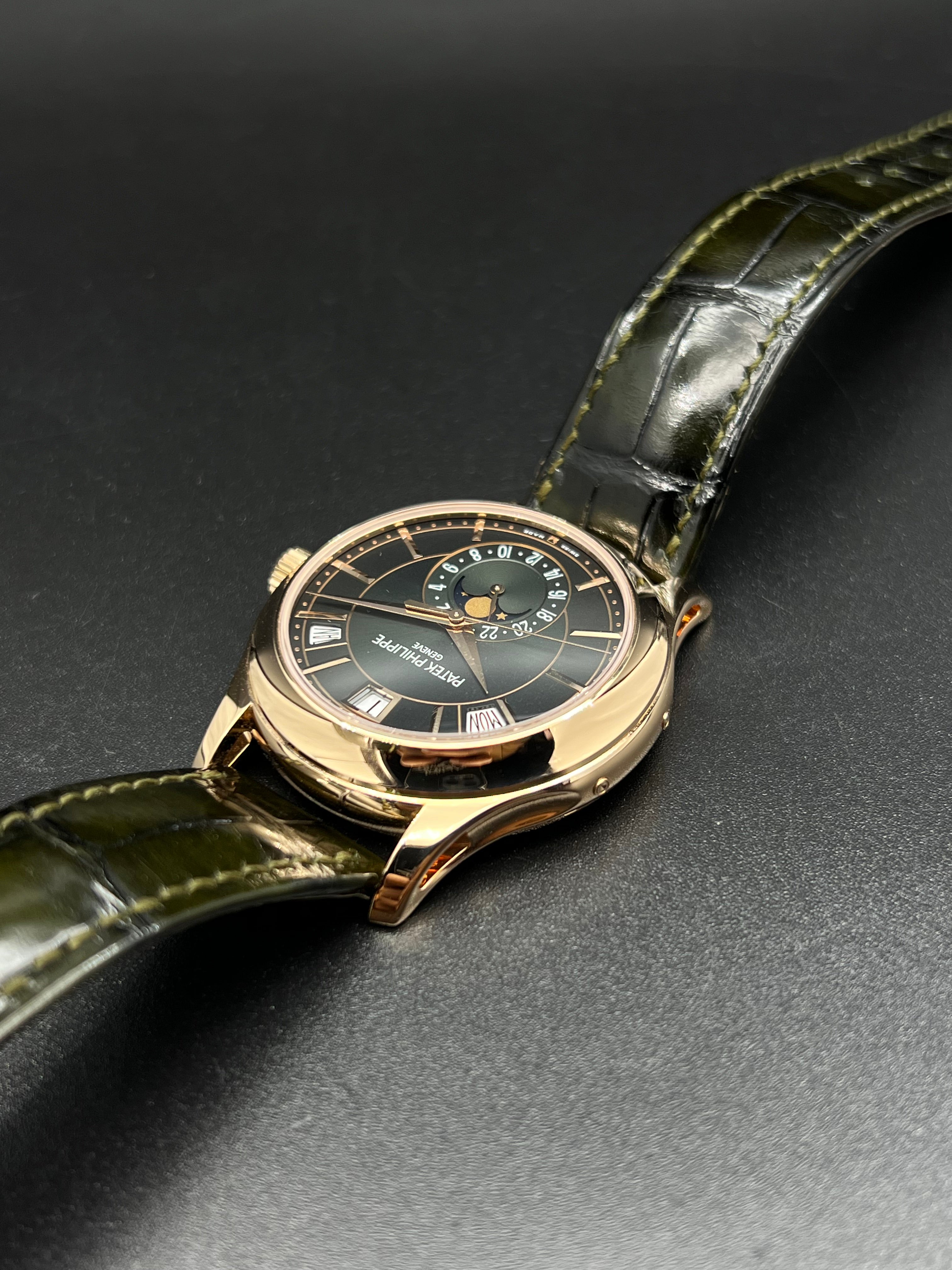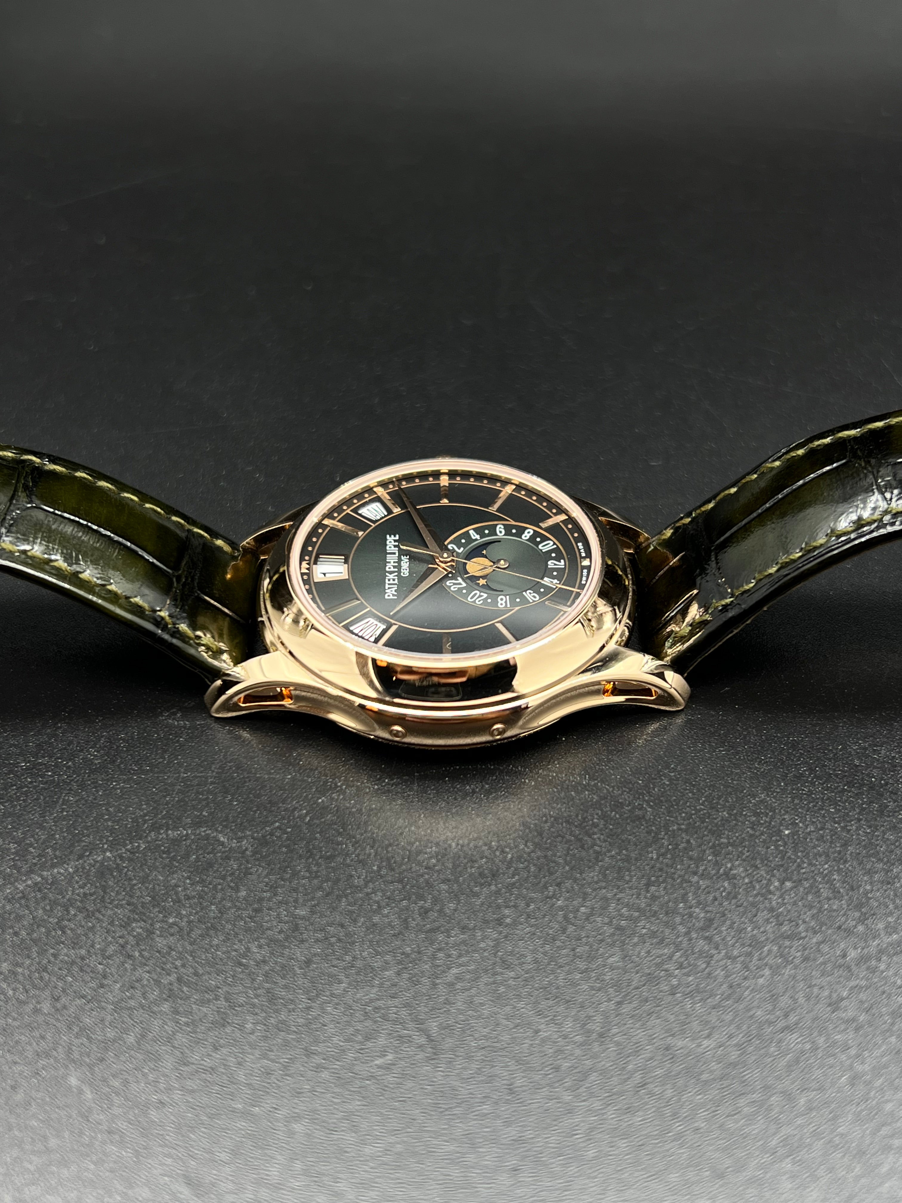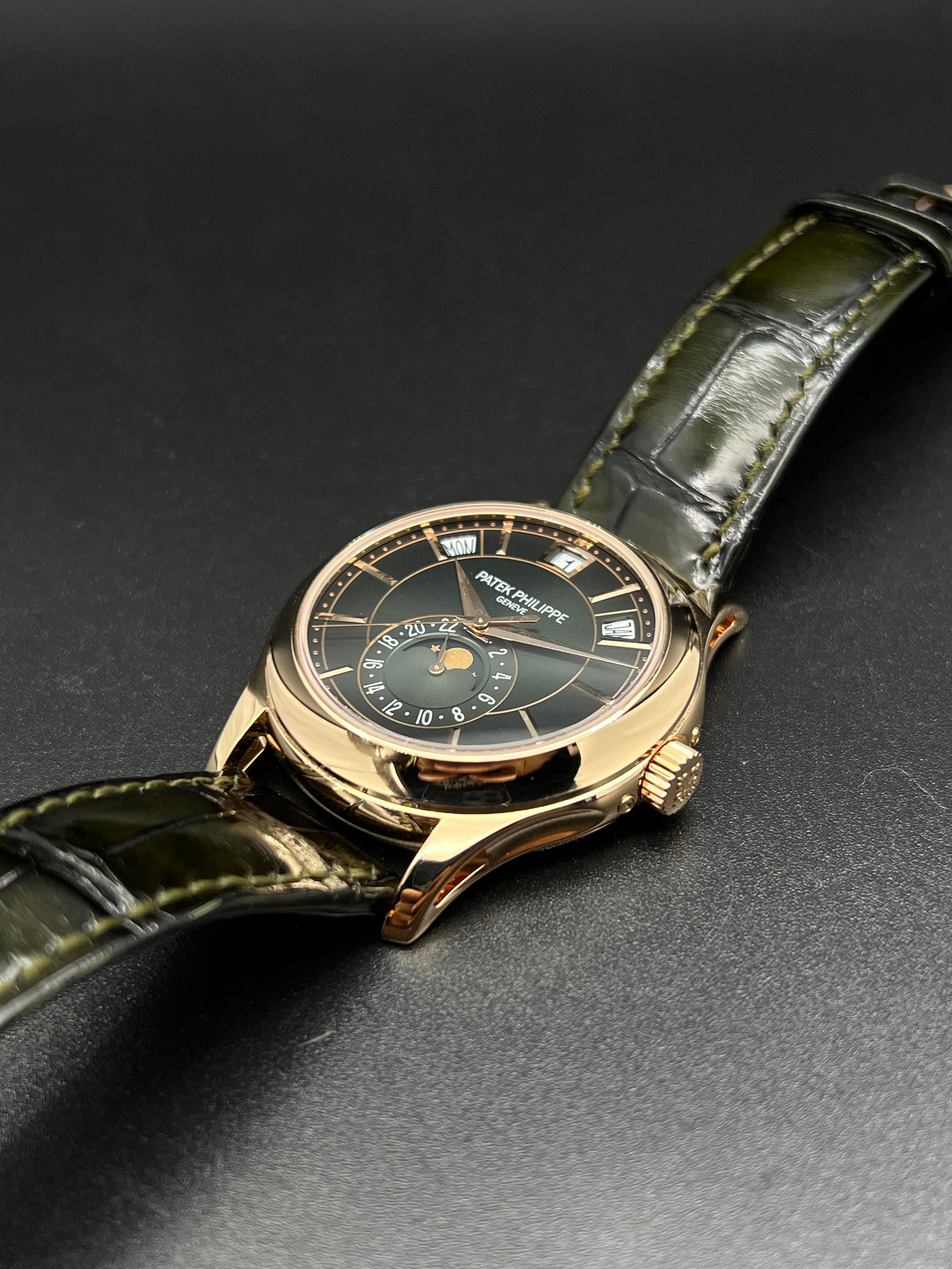 The dial of the 5205R-011 is where this model truly distinguishes itself. The rich olive green color is a first for this reference and adds a modern, luxurious twist to Patek’s typically more conservative palette. Applied rose gold hour markers and dauphine hands stand out sharply against the backdrop, while the moonphase and 24-hour indicator add both charm and functionality to the lower half of the dial. It’s a dial that rewards close inspection, with layers of finishing and subtle color gradation.
