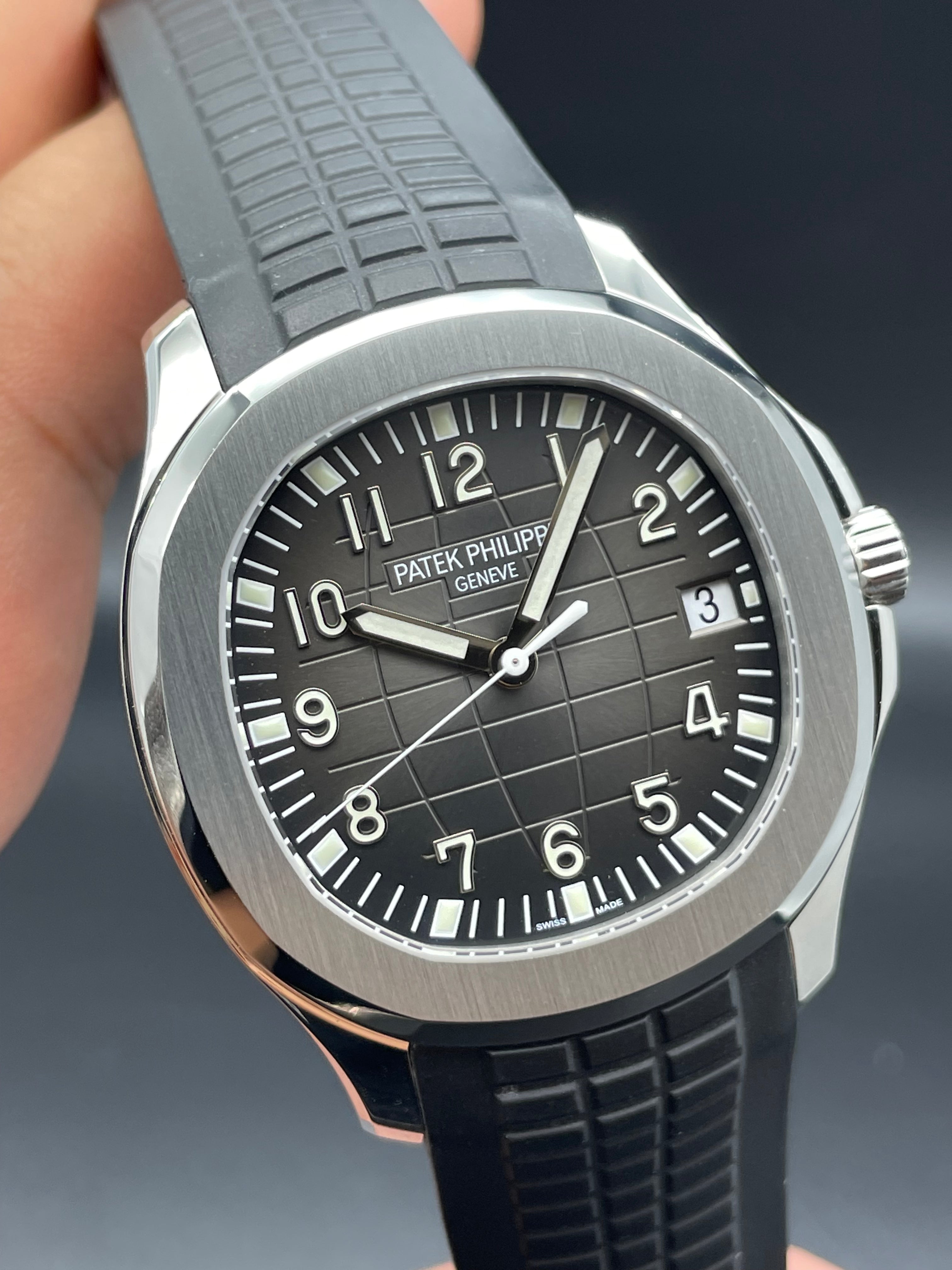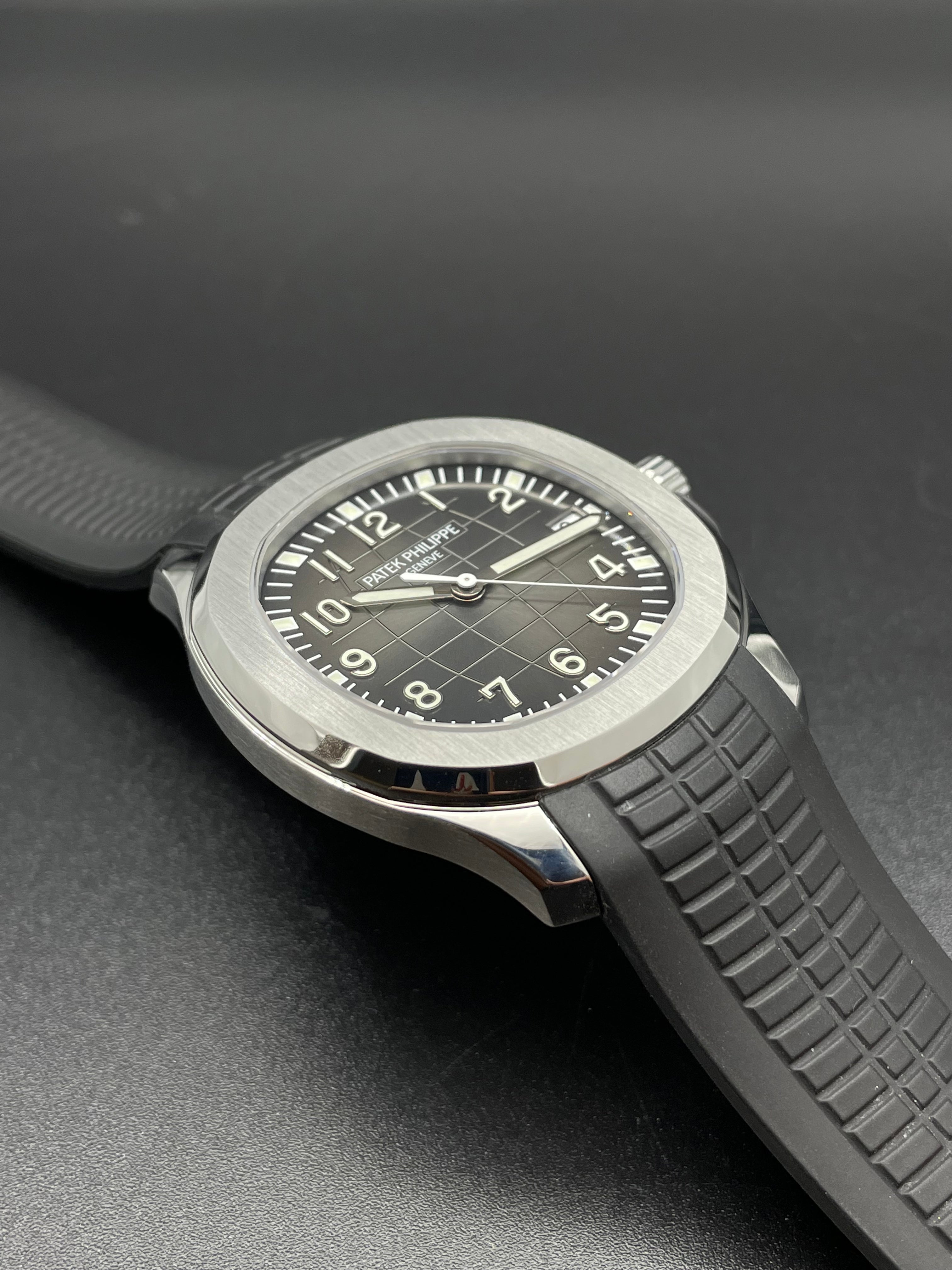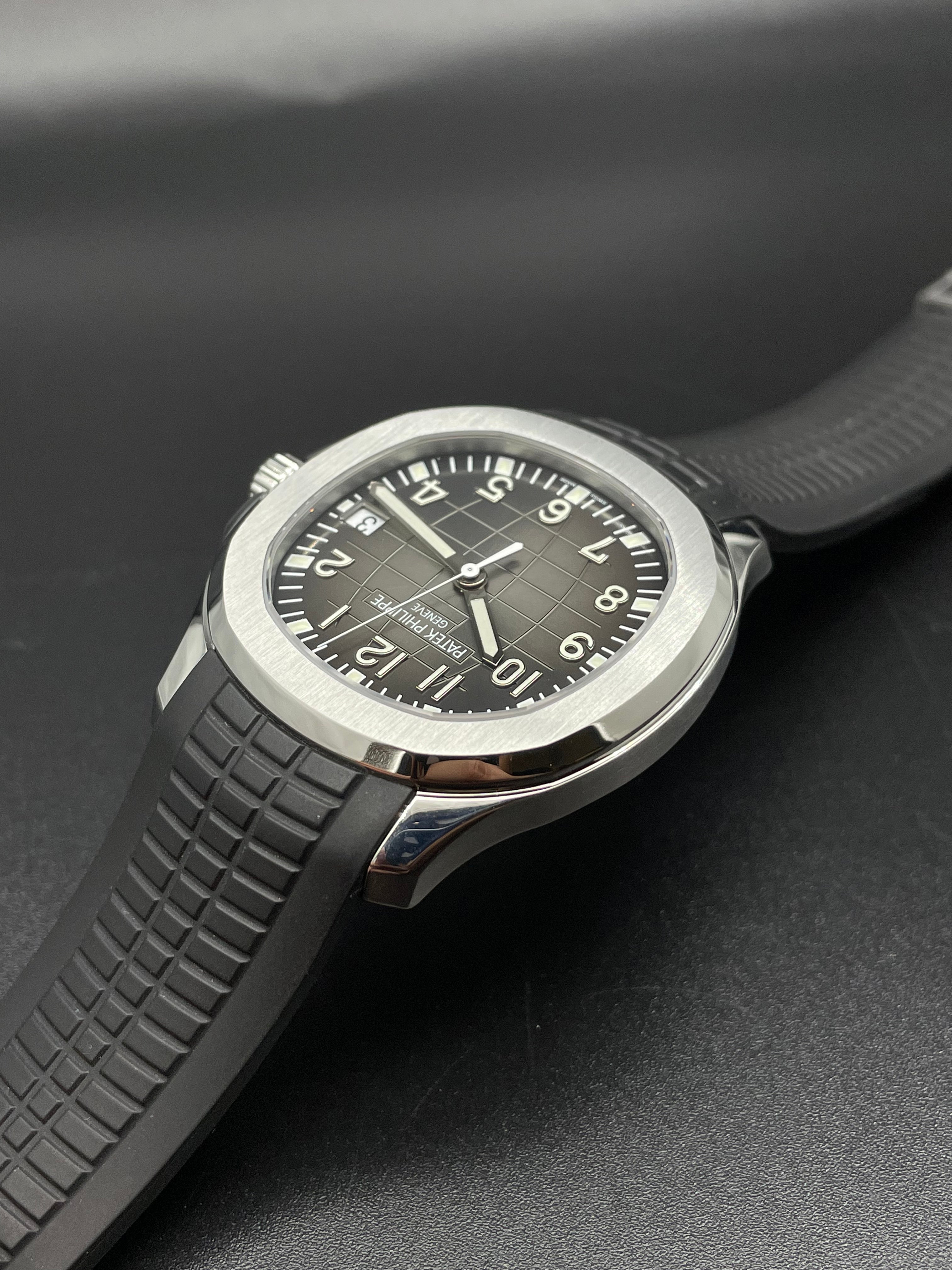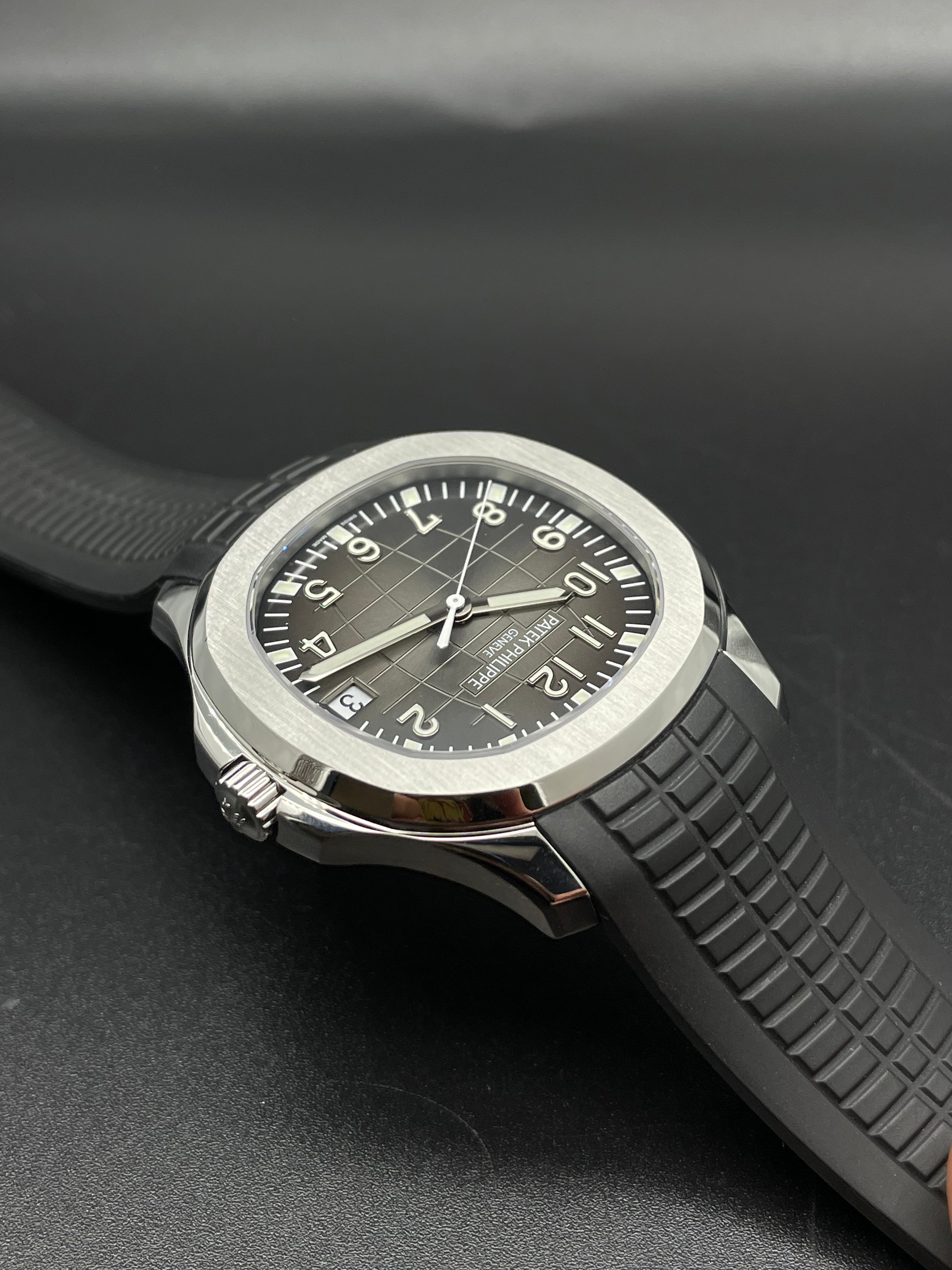 The dial of the Aquanaut 5167A emphasizes legibility and simplicity, with large white Arabic numerals against a black backdrop, providing excellent contrast. Luminous markers and hands ensure the watch remains easy to read in low-light conditions, while the date window at 3 o’clock is neatly integrated without disrupting the dial’s balance. The minimalist design, paired with its bold grid pattern, makes this watch a stylish option that can transition seamlessly between casual and formal wear.