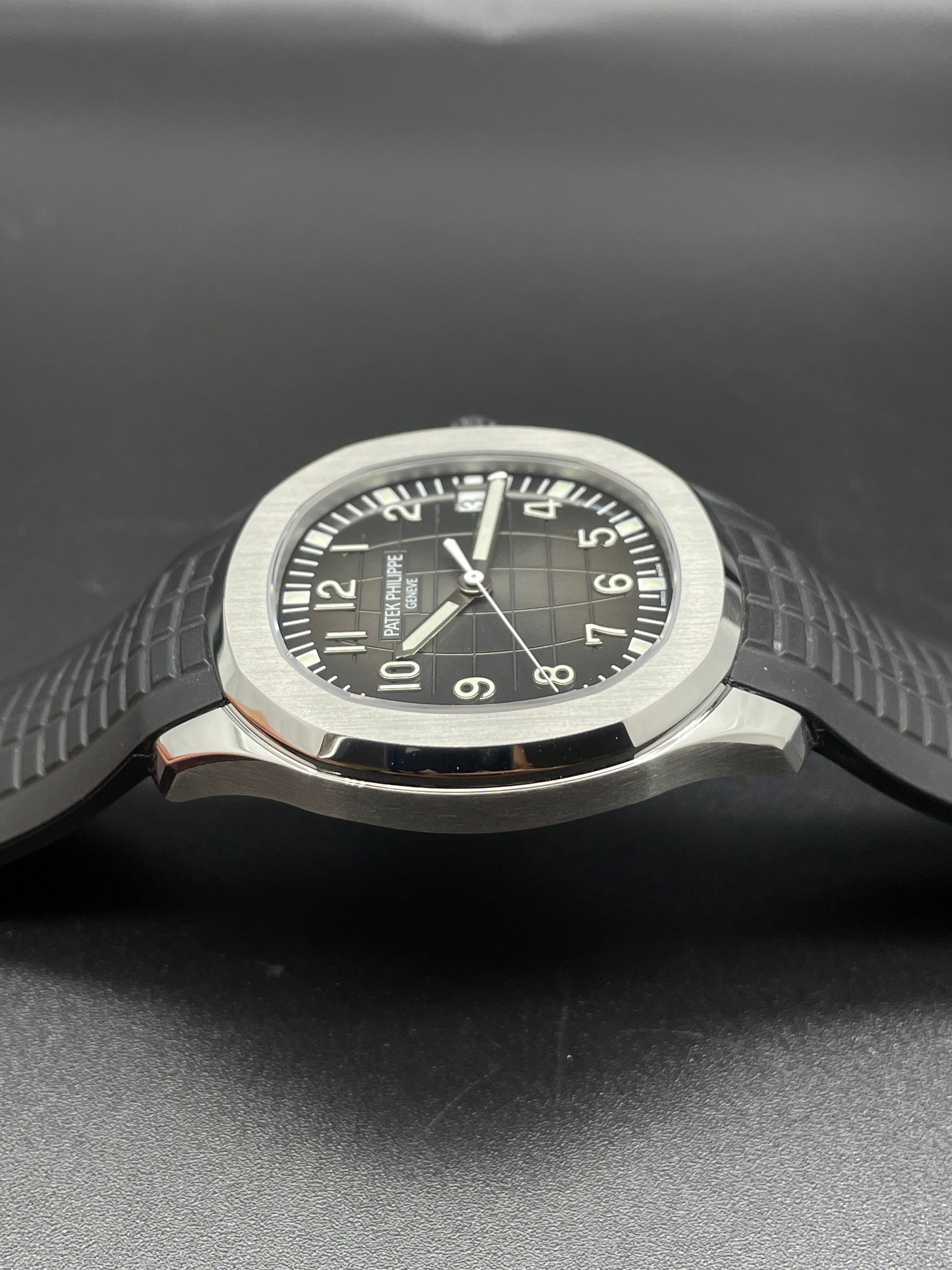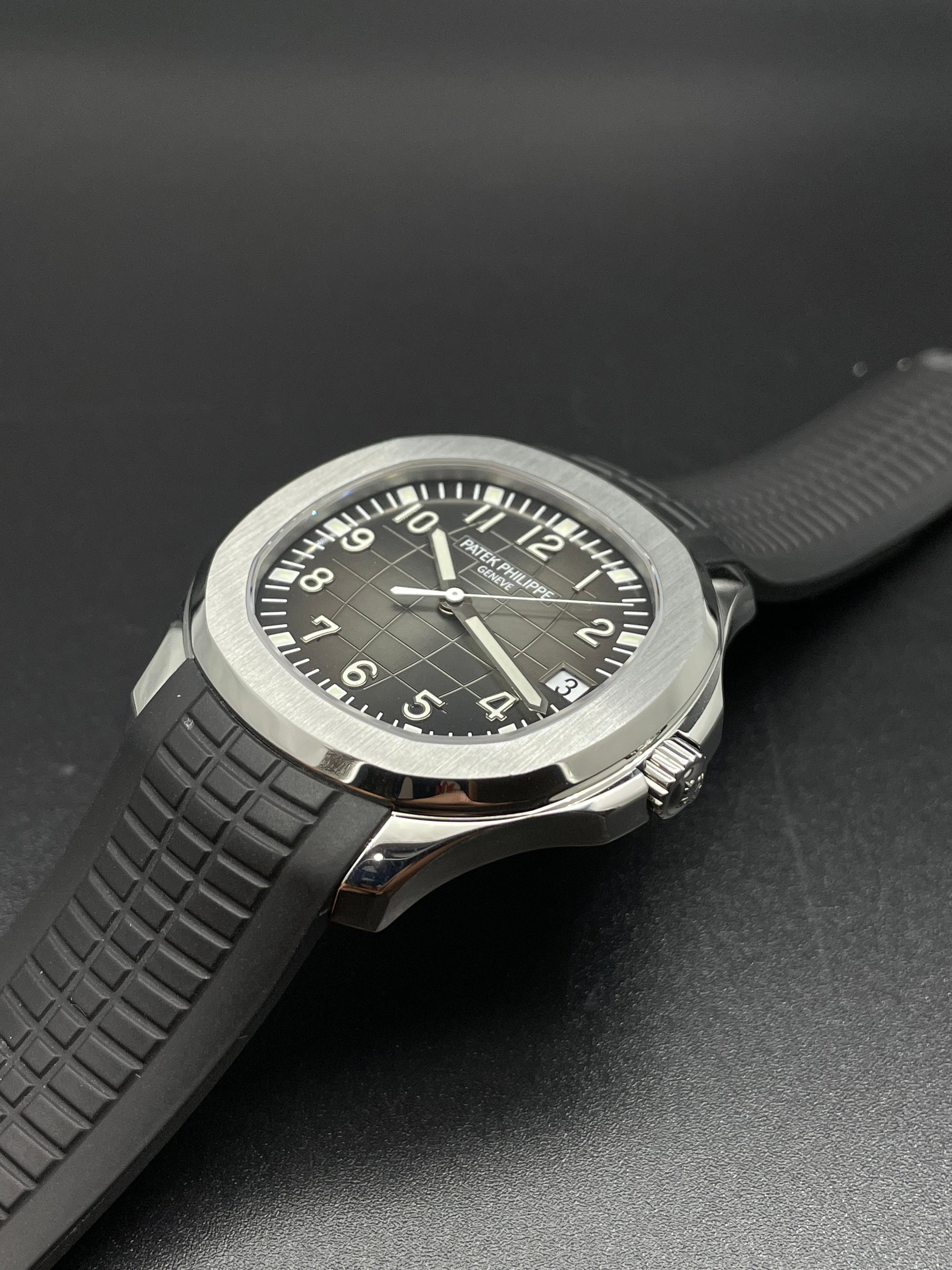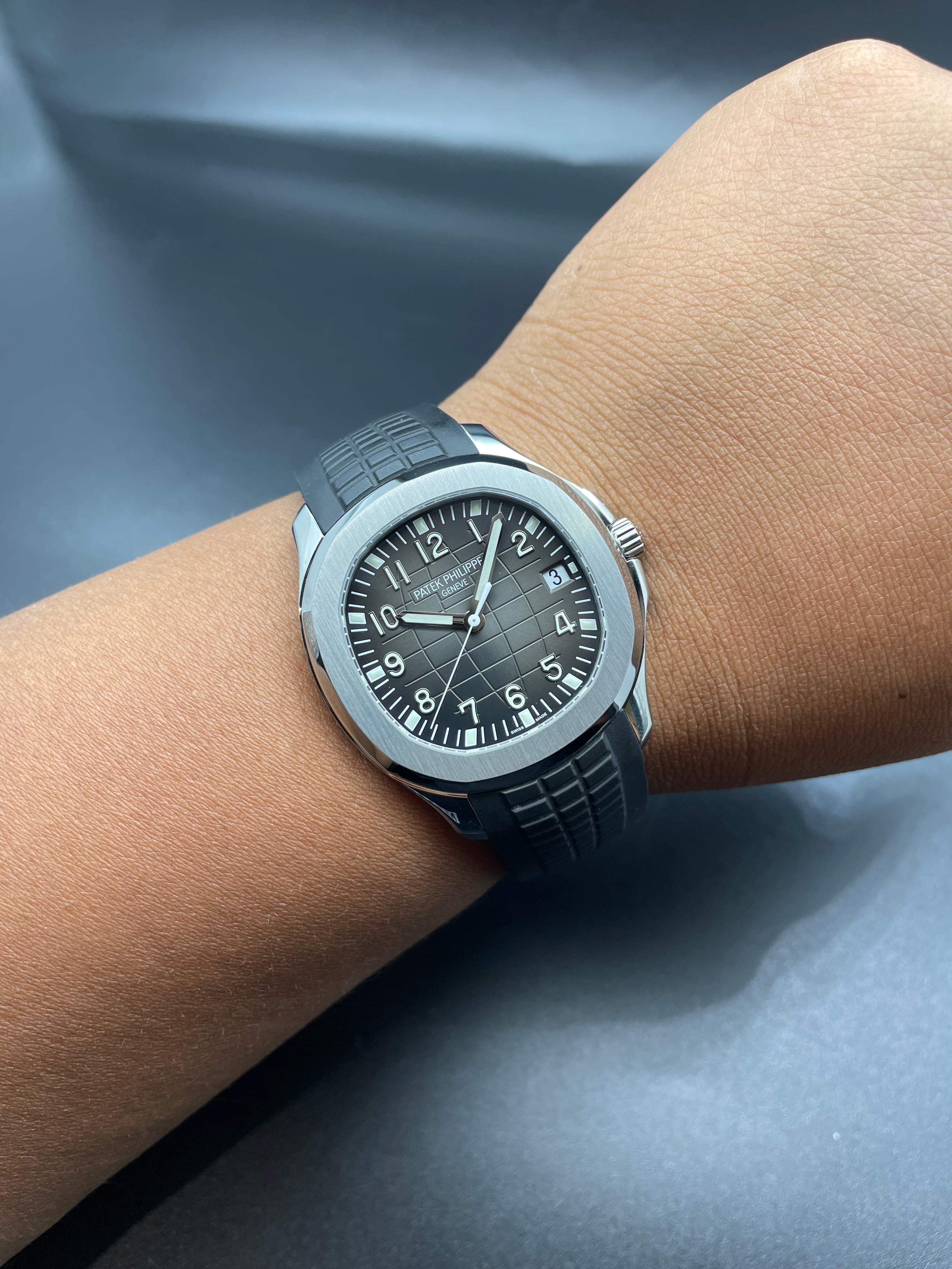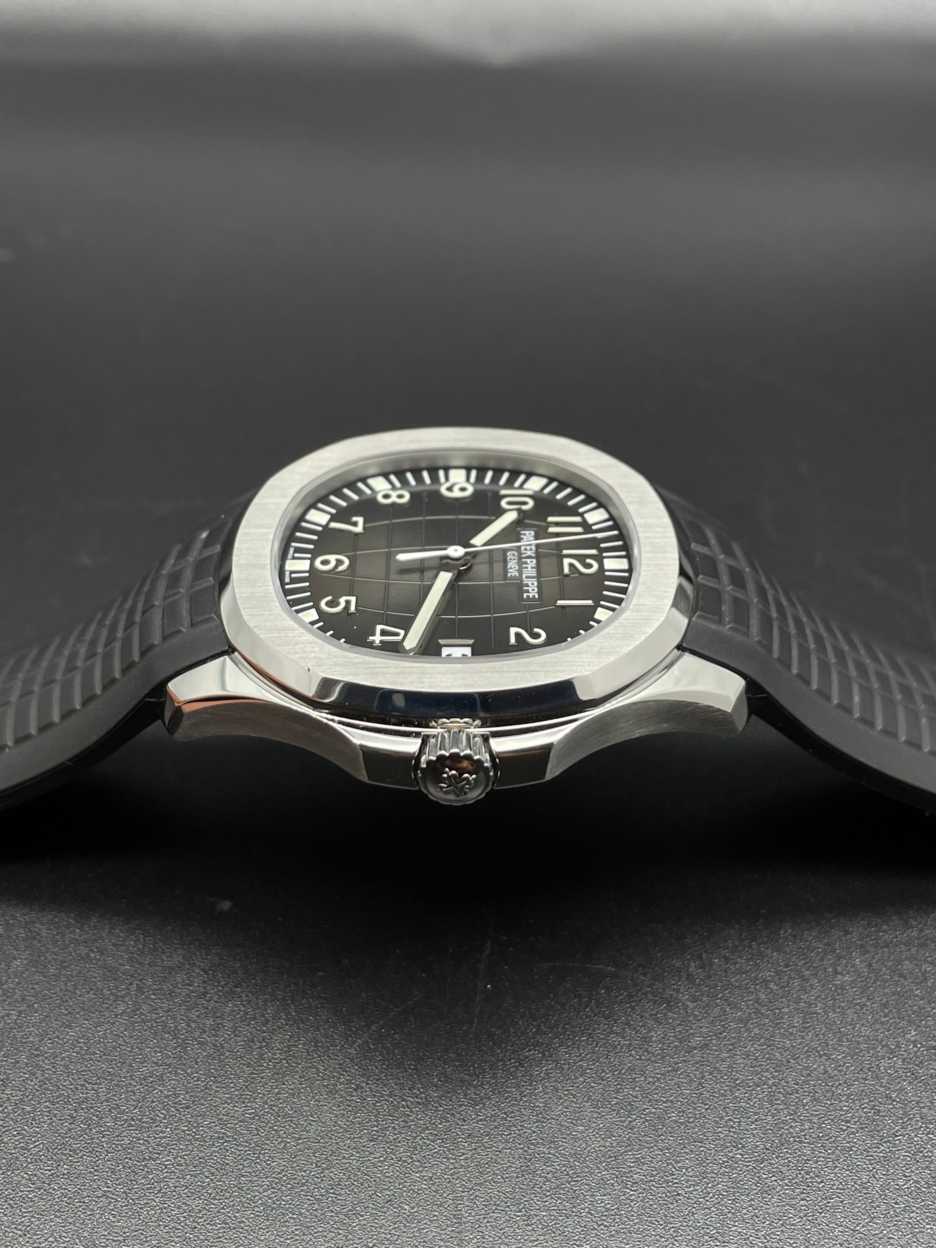 The dial of the Aquanaut 5167A emphasizes legibility and simplicity, with large white Arabic numerals against a black backdrop, providing excellent contrast. Luminous markers and hands ensure the watch remains easy to read in low-light conditions, while the date window at 3 o’clock is neatly integrated without disrupting the dial’s balance. The minimalist design, paired with its bold grid pattern, makes this watch a stylish option that can transition seamlessly between casual and formal wear.
