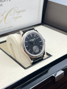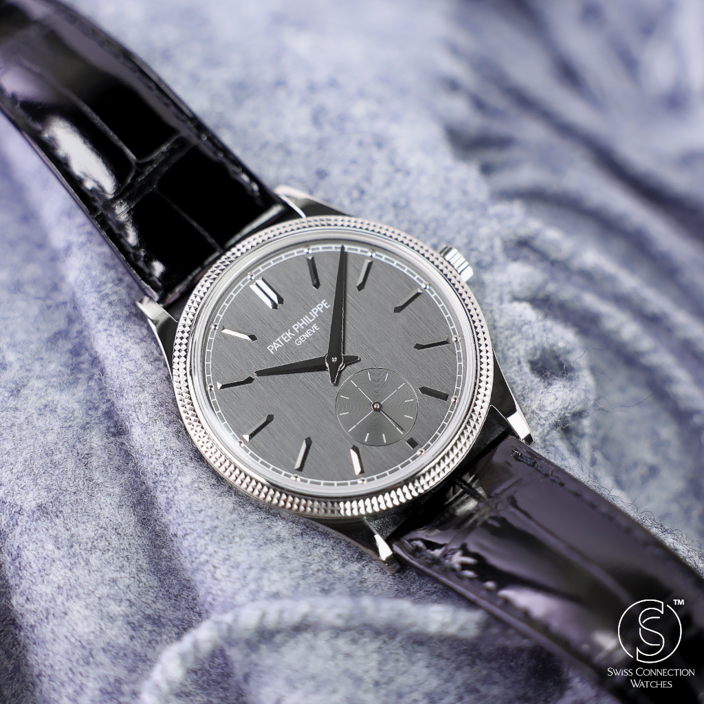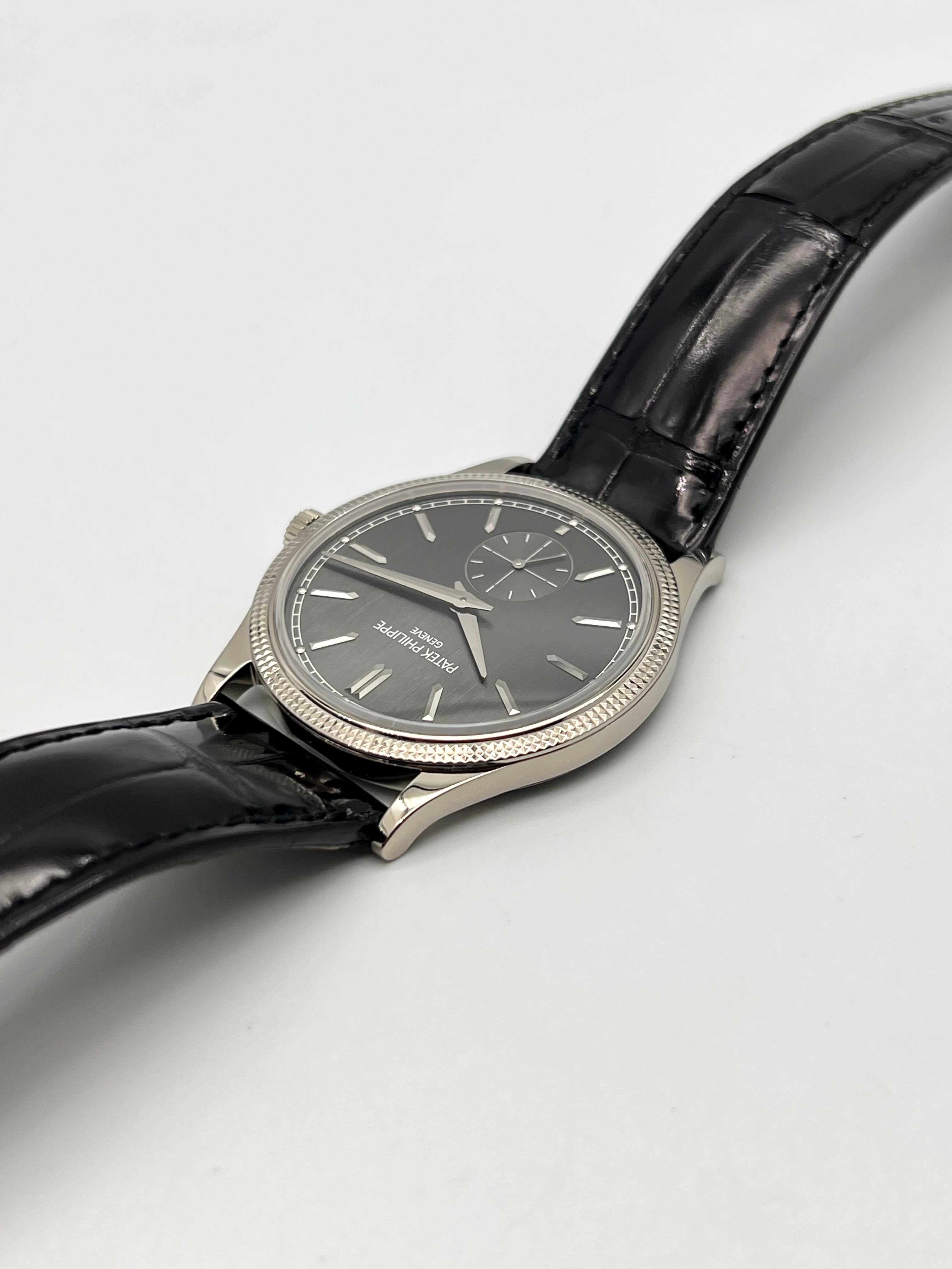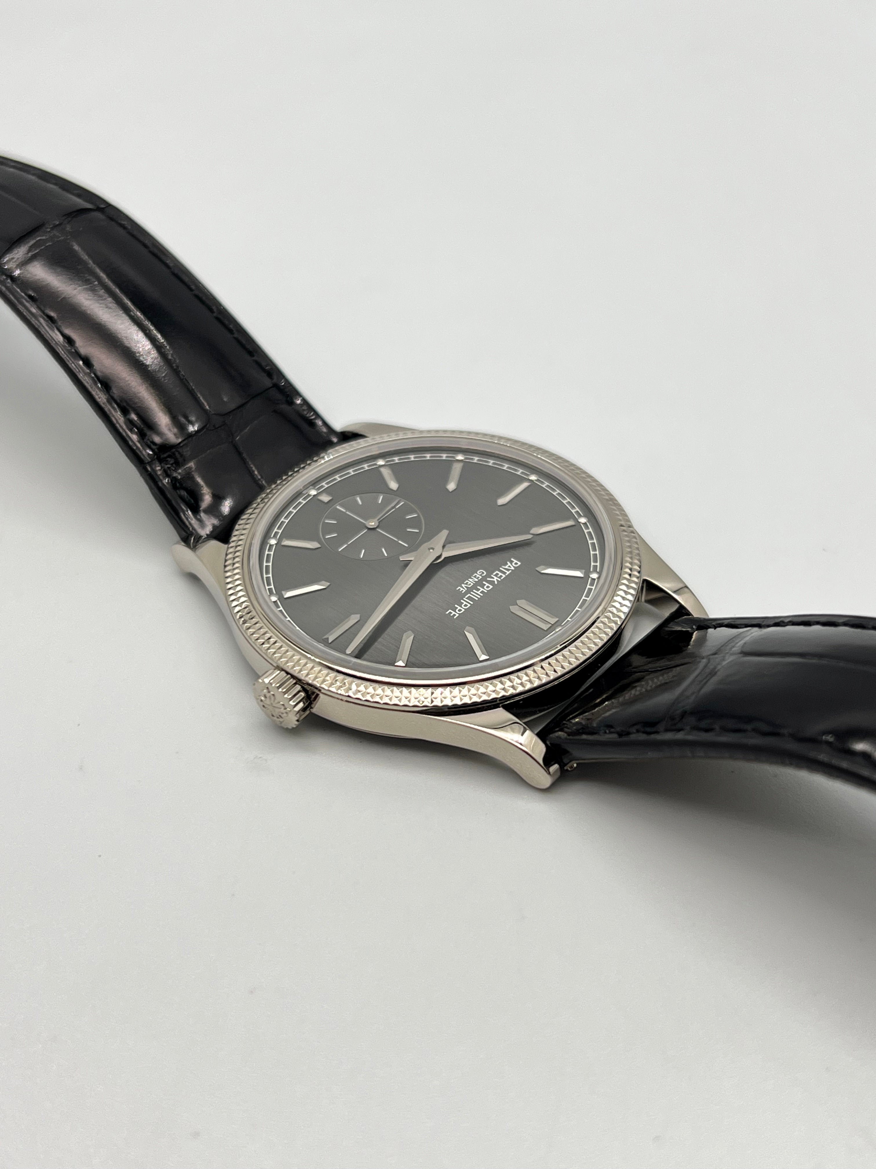 The charcoal gray dial is understated yet captivating, enhanced by applied white gold hour markers, faceted dauphine hands, and a small seconds subdial at 6 o’clock. The dial’s vertical satin finish adds depth and modernity, contrasting gently with the traditional bezel pattern. It’s a composition that speaks volumes through restraint—a key pillar in Patek Philippe’s design philosophy.