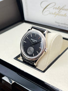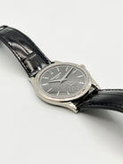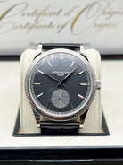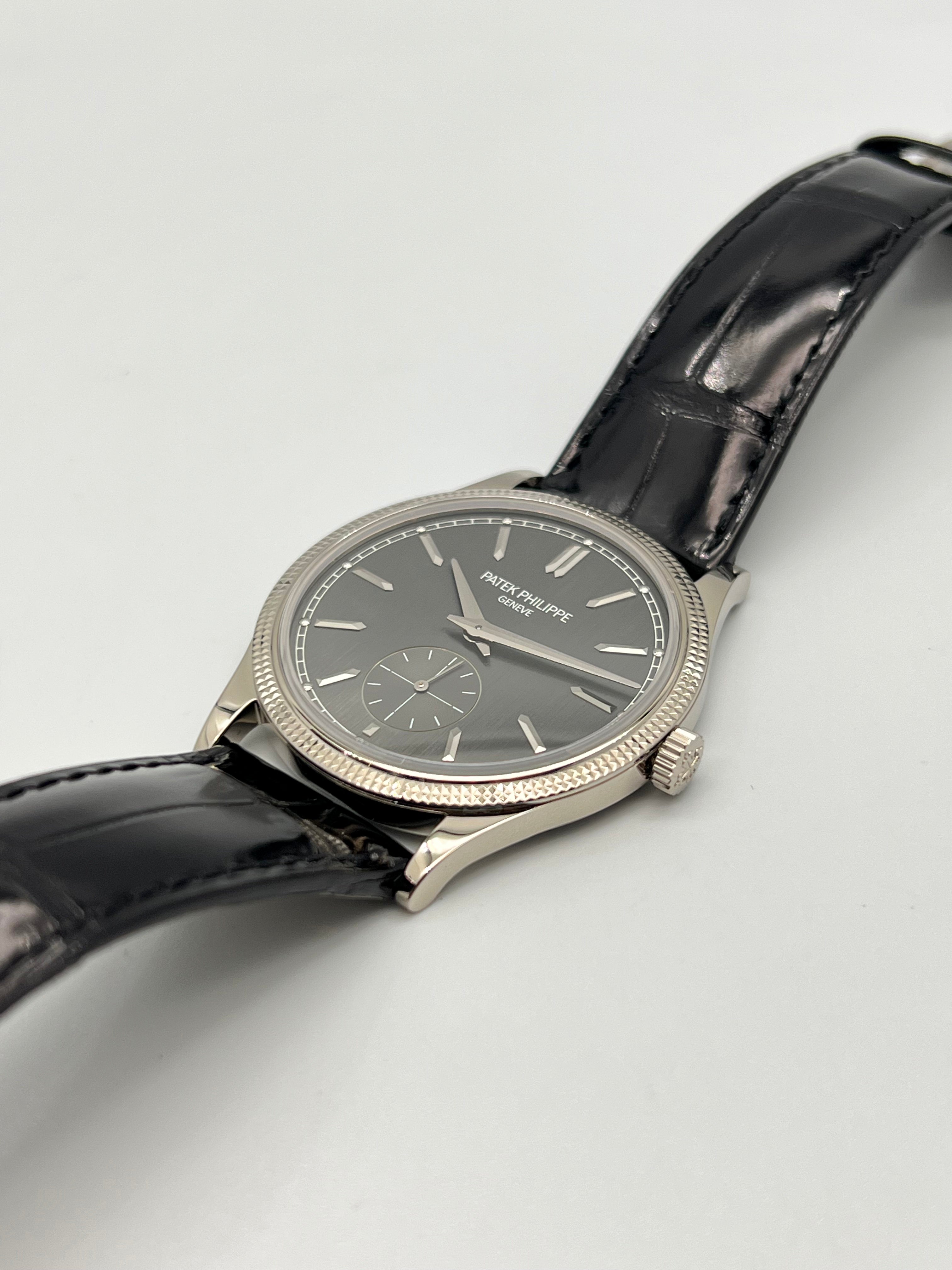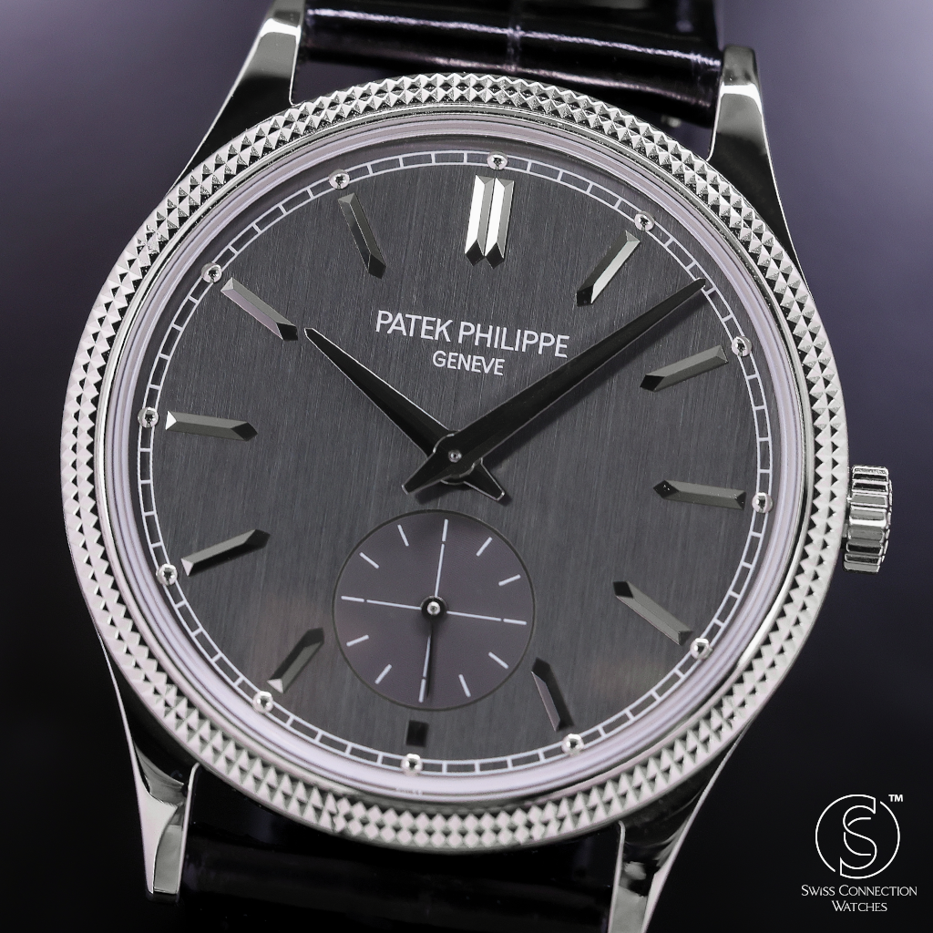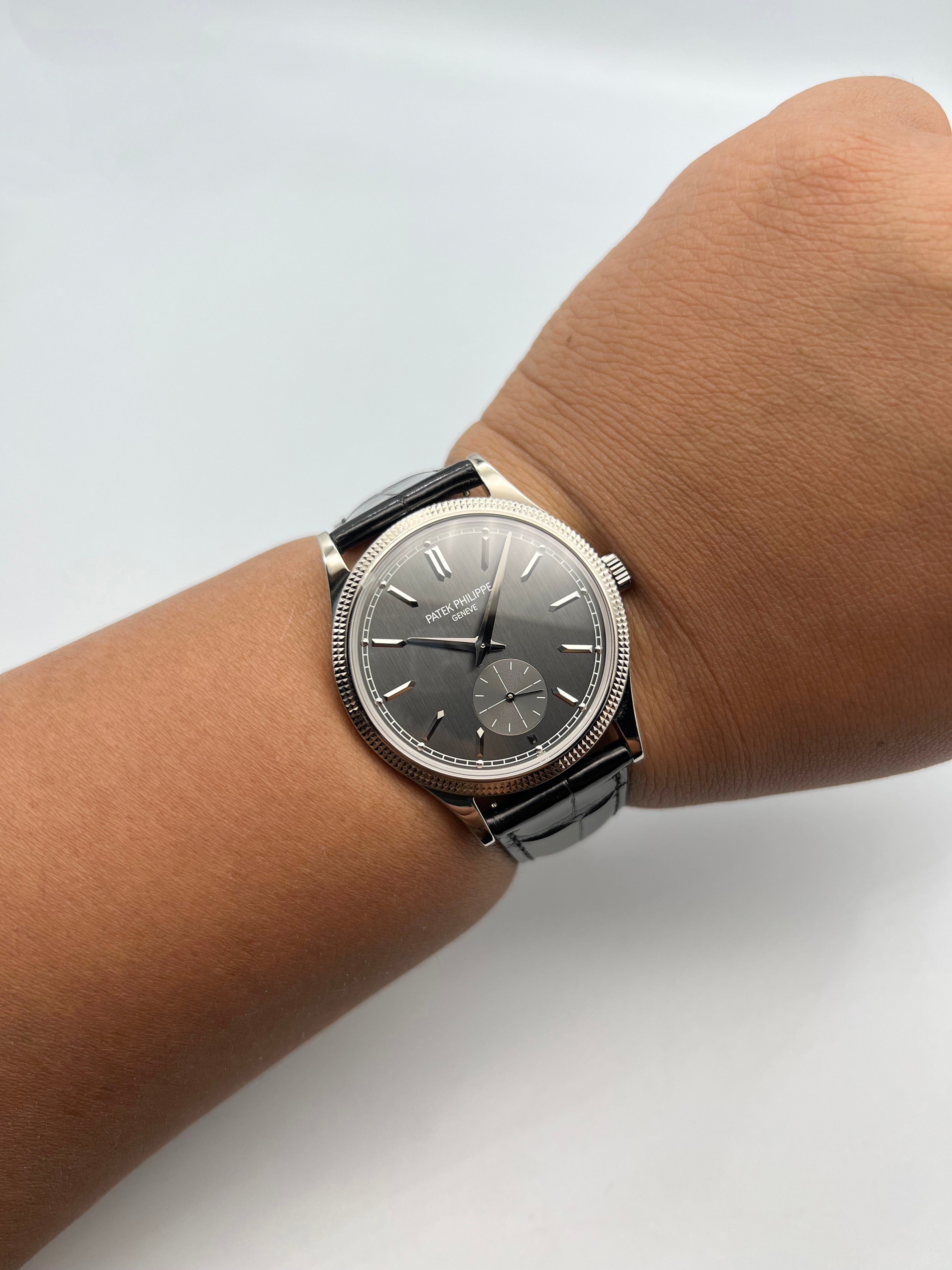 The charcoal gray dial is understated yet captivating, enhanced by applied white gold hour markers, faceted dauphine hands, and a small seconds subdial at 6 o’clock. The dial’s vertical satin finish adds depth and modernity, contrasting gently with the traditional bezel pattern. It’s a composition that speaks volumes through restraint—a key pillar in Patek Philippe’s design philosophy.