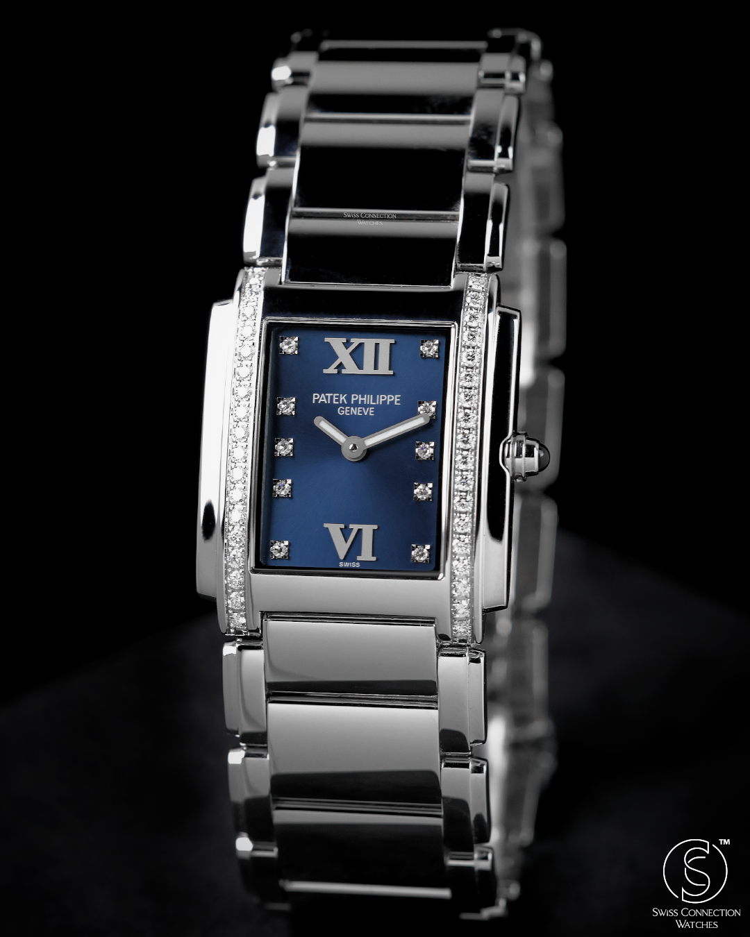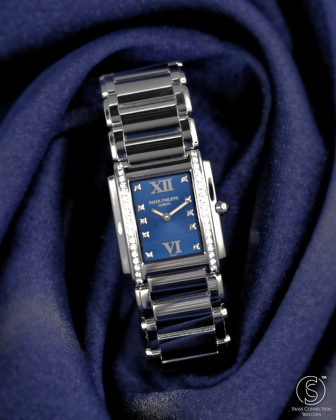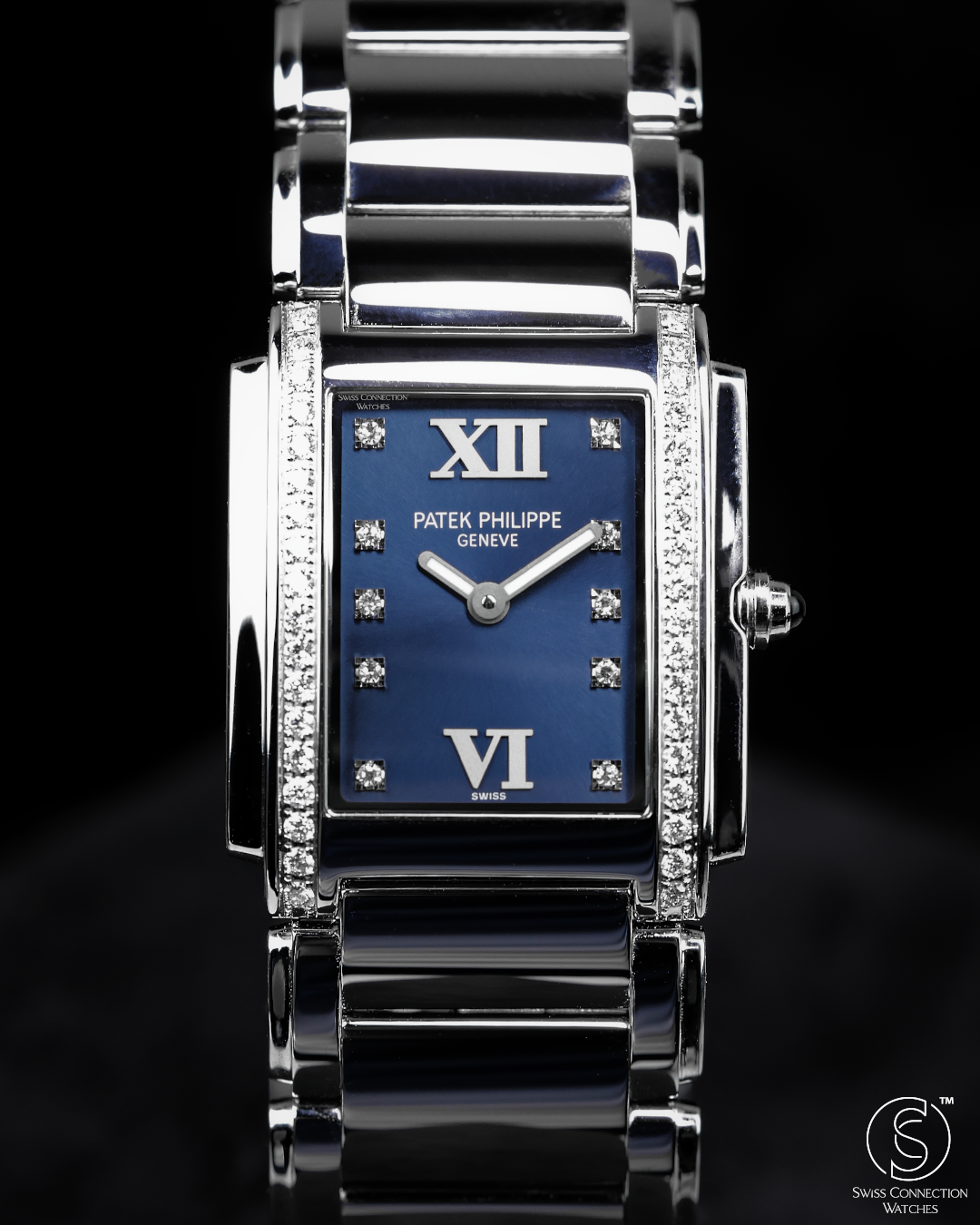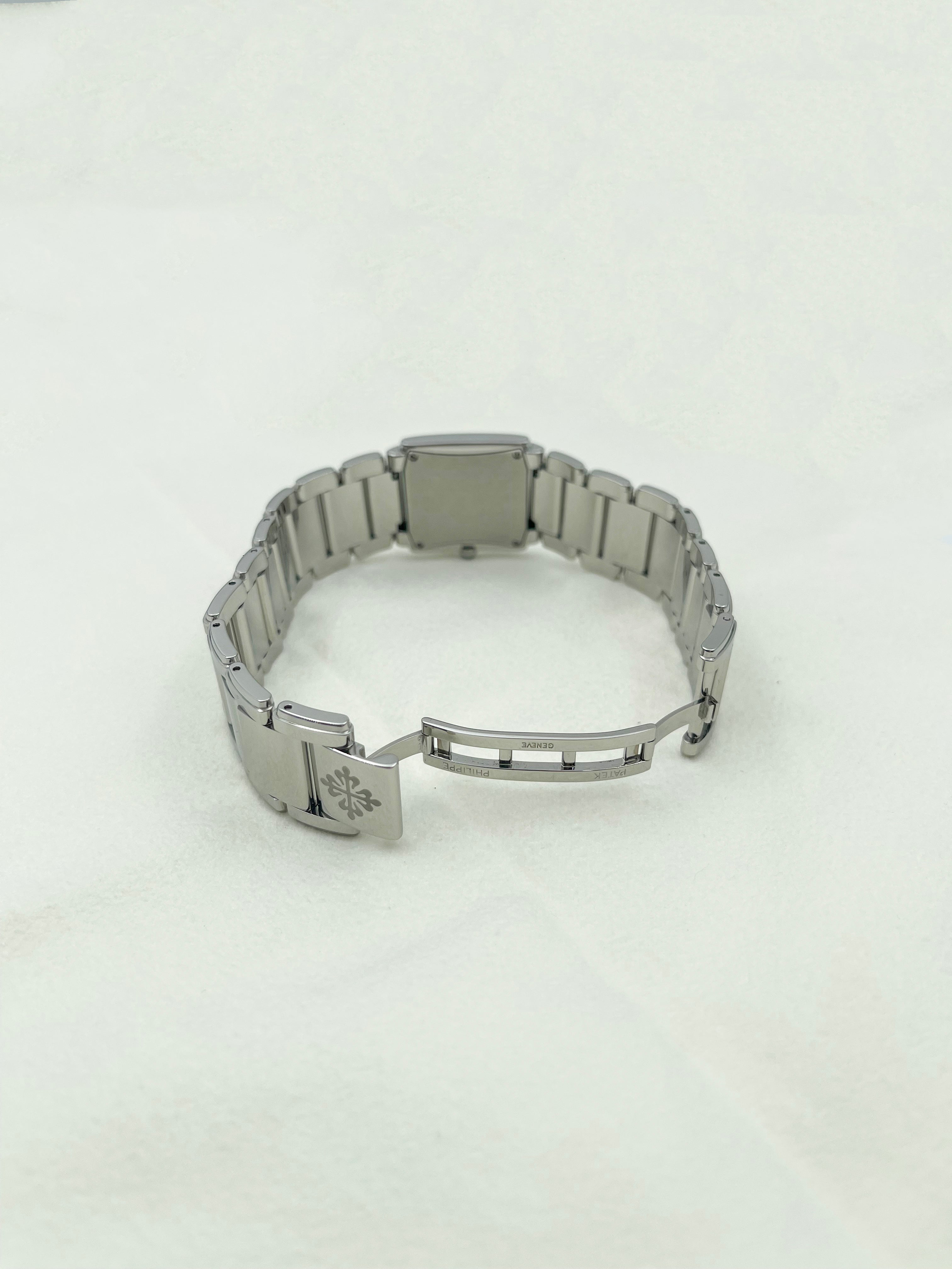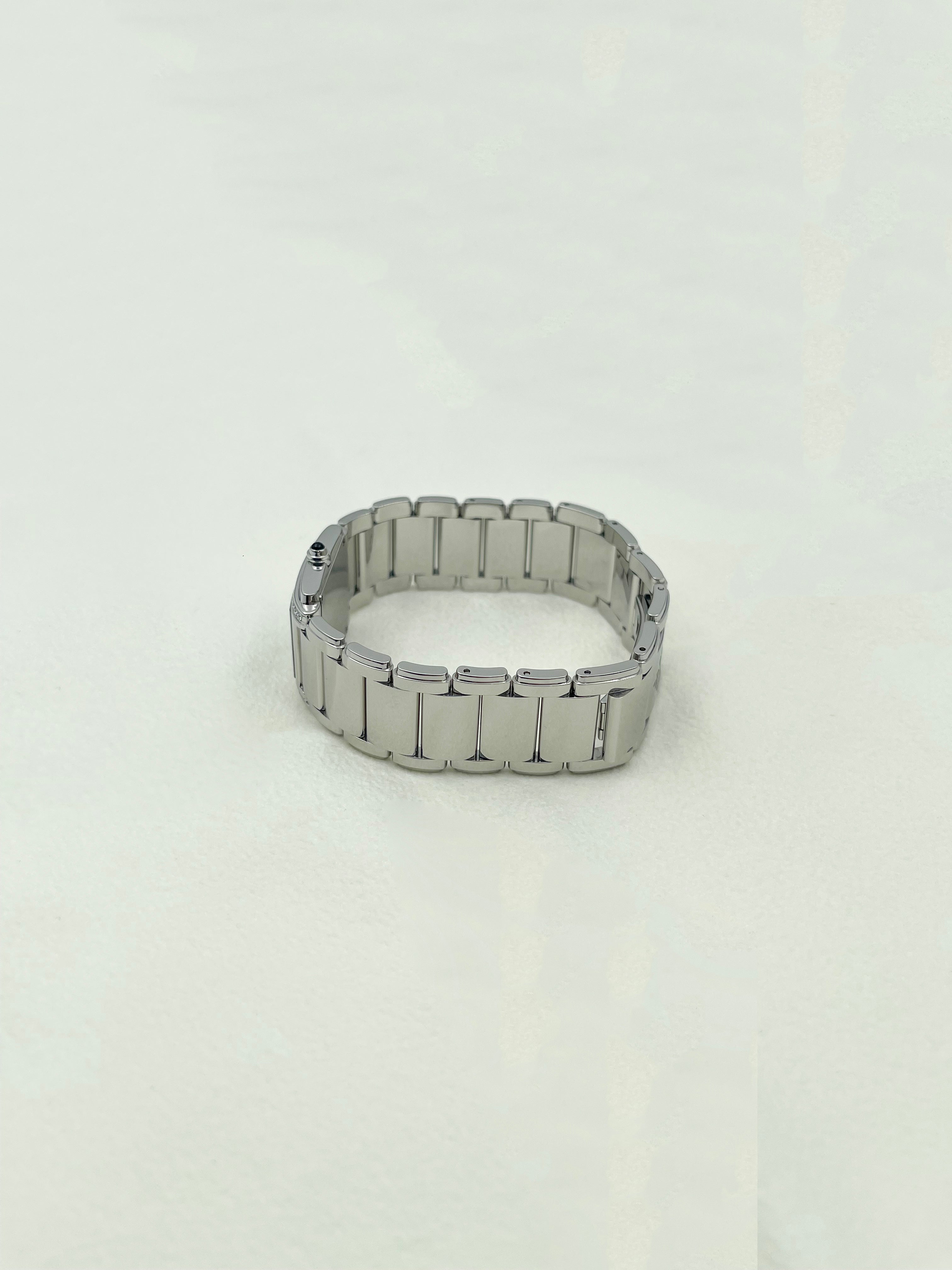 Crafted in stainless steel, the case measures 25.1mm by 30mm, with softly curved edges that follow the contours of the wrist like a piece of fine jewellery. The signature cambered rectangular case and gently stepped sides create a clean Art Deco profile, while the integrated steel bracelet flows seamlessly into the case — polished, articulated, and luxuriously fluid to the touch. The bezel is set with 36 diamonds (~0.45 ct), offering a subtle yet unmistakable radiance.