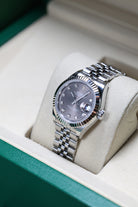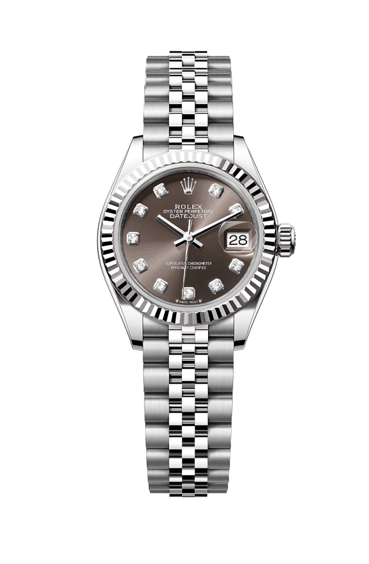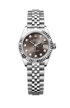 The timepiece features a sophisticated Dark Grey sunray dial, which provides a beautiful, nuanced backdrop for its dazzling accents. The dial is exquisitely adorned with 10 brilliant-cut diamond hour markers, adding a touch of exquisite sparkle and undeniable glamour to its classic design. The date window, magnified by the iconic Cyclops lens, ensures clear utility, completing the instantly recognizable Datejust aesthetic.
