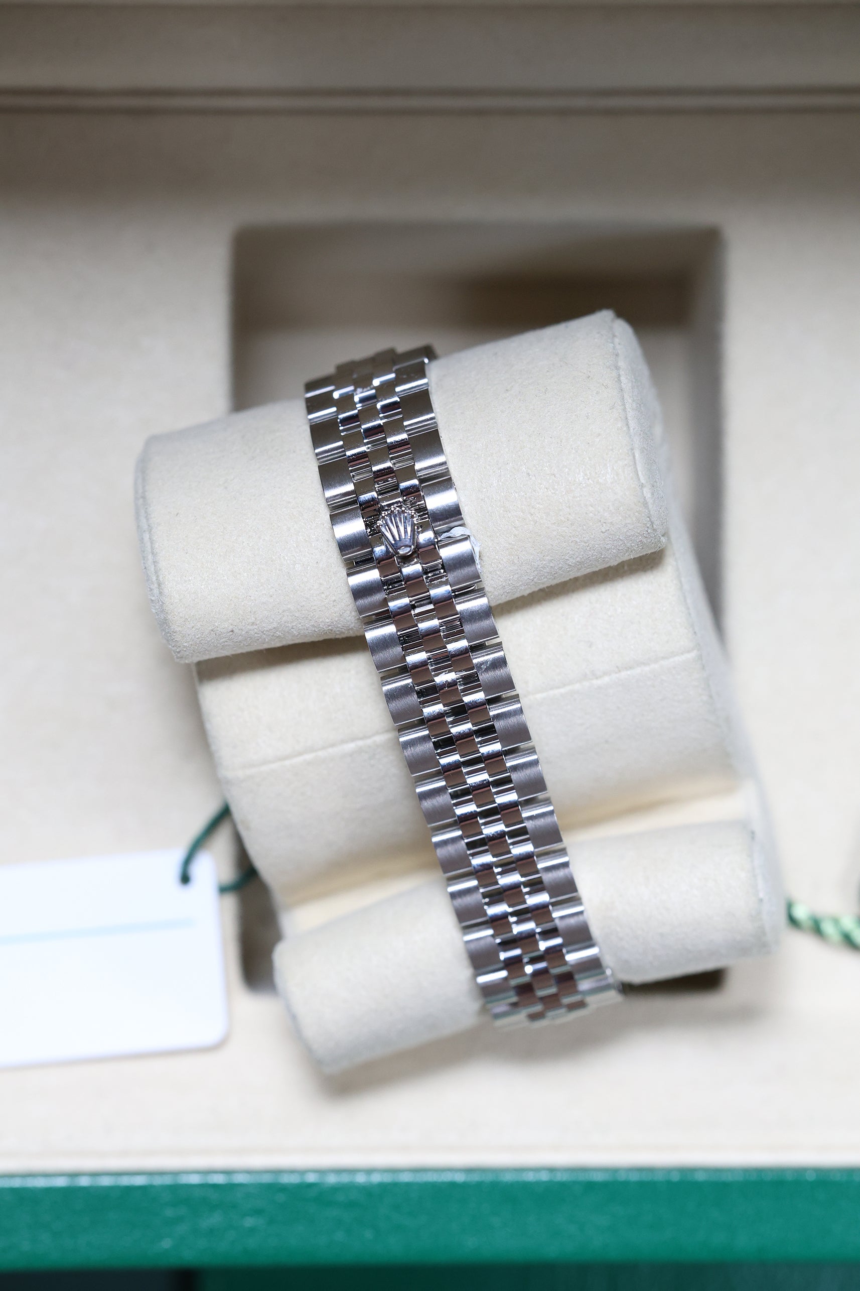 This refined timepiece is secured by the supple and iconic Jubilee bracelet, renowned for its comfortable five-piece links and graceful drape on the wrist. The Jubilee enhances the watch's inherent elegance, creating a luxurious feel that transitions effortlessly from formal events to everyday wear. Its combination of the 18k white gold fluted bezel and the intricate Jubilee bracelet exudes an air of sophisticated luxury.