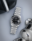 This specific Datejust 36 captivates with its striking black dial, a classic and versatile hue that provides a sophisticated backdrop. Adding a refined touch of sparkle, the dial is adorned with 10 brilliant-cut diamond hour markers, meticulously set to catch the light and enhance its luxurious appeal. The iconic fluted bezel, crafted from 18k white gold, frames the dial with brilliant precision, while the signature Cyclops lens magnifies the date, a hallmark of Rolex's commitment to both aesthetics and clear utility.