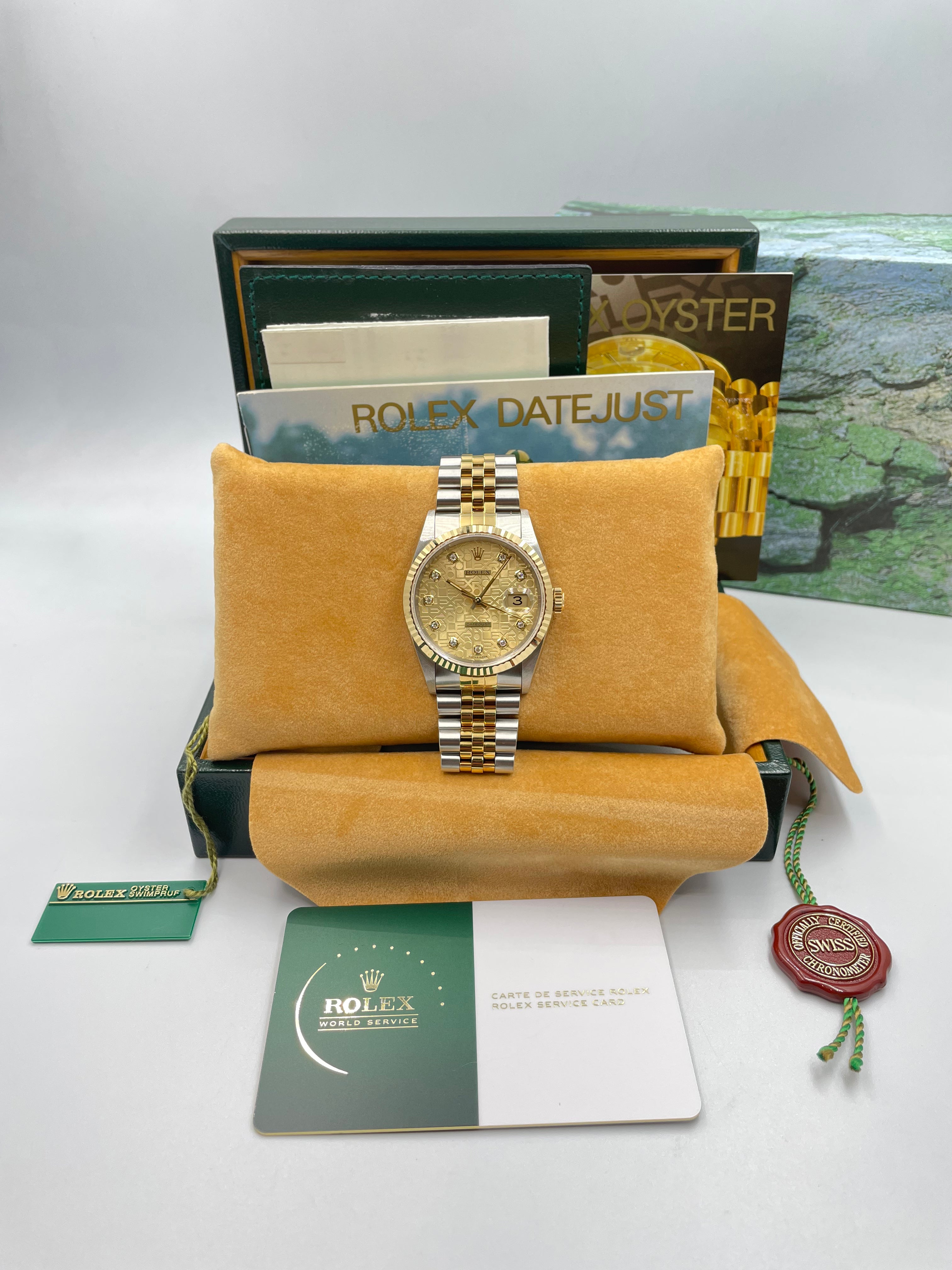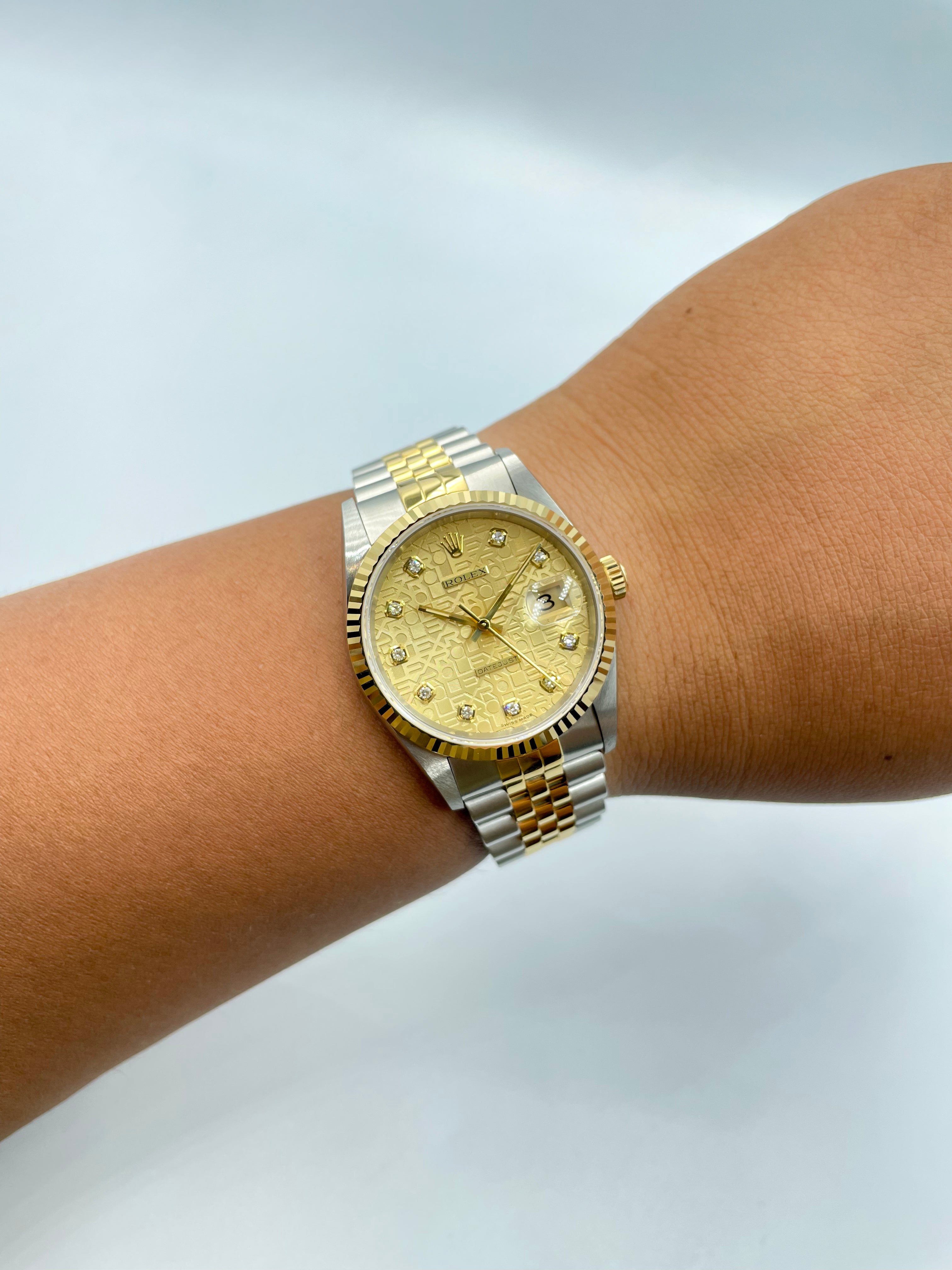 In 1985, in conjunction with the 40th anniversary of the release of the Datejust series, Rolex introduced the Jubilee dial. The year also coincides with Rolex's 80th anniversary. This particular dial was known as the Jubilee dial (or anniversary dial) and the "computer dial" over here in Asia. This particular dial was one of the first laser-etched dials with the "Rolex Rolex" motif on the dial. It was a very popular dial - and continued production for quite a few years. The Jubilee motif was only discontinued in 2021 - when the new Datejust range was released. This dial no longer is available in production.
