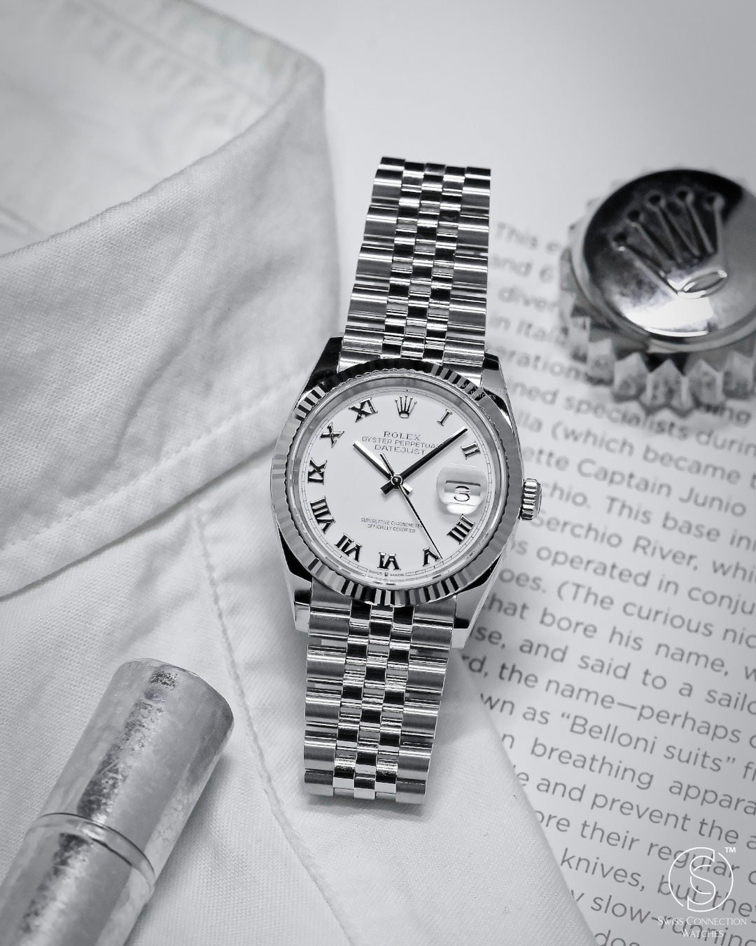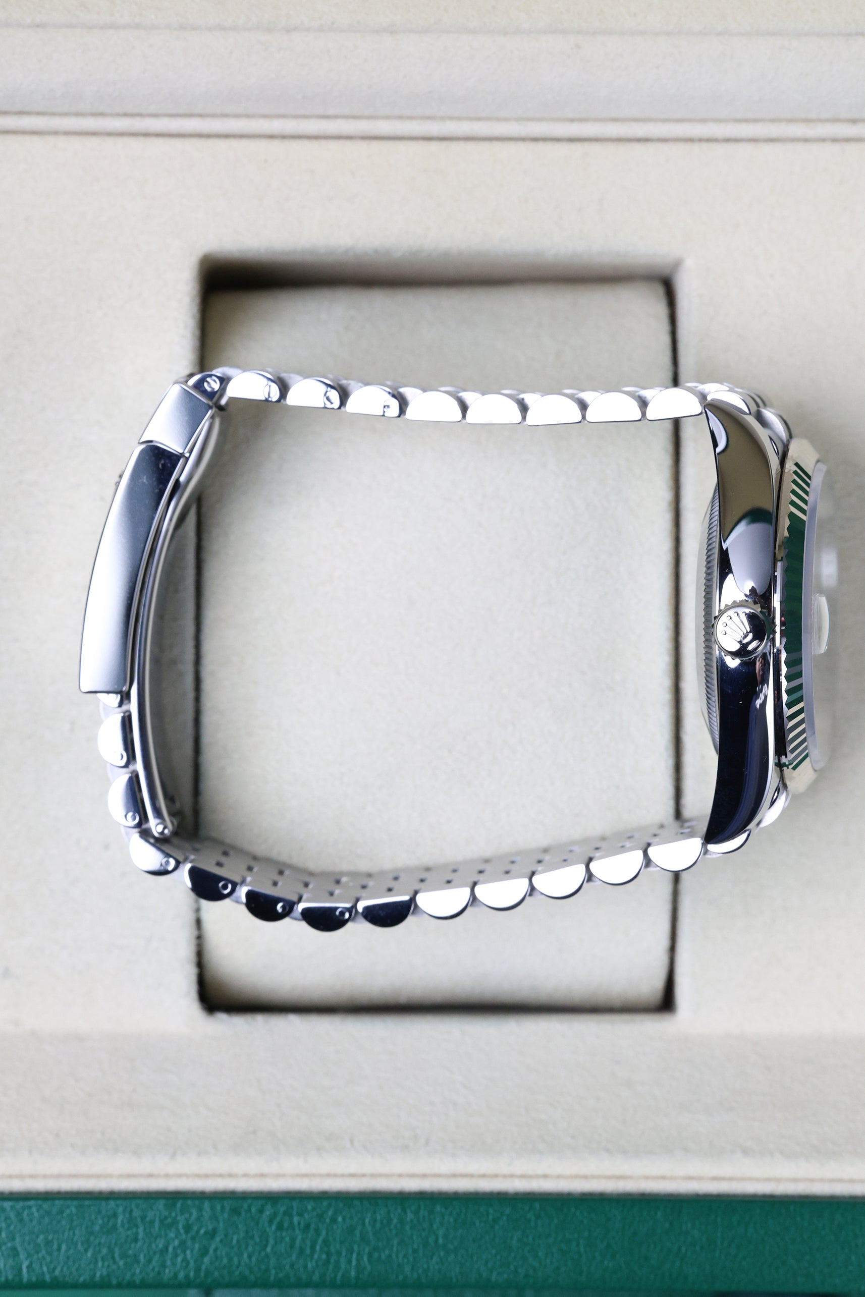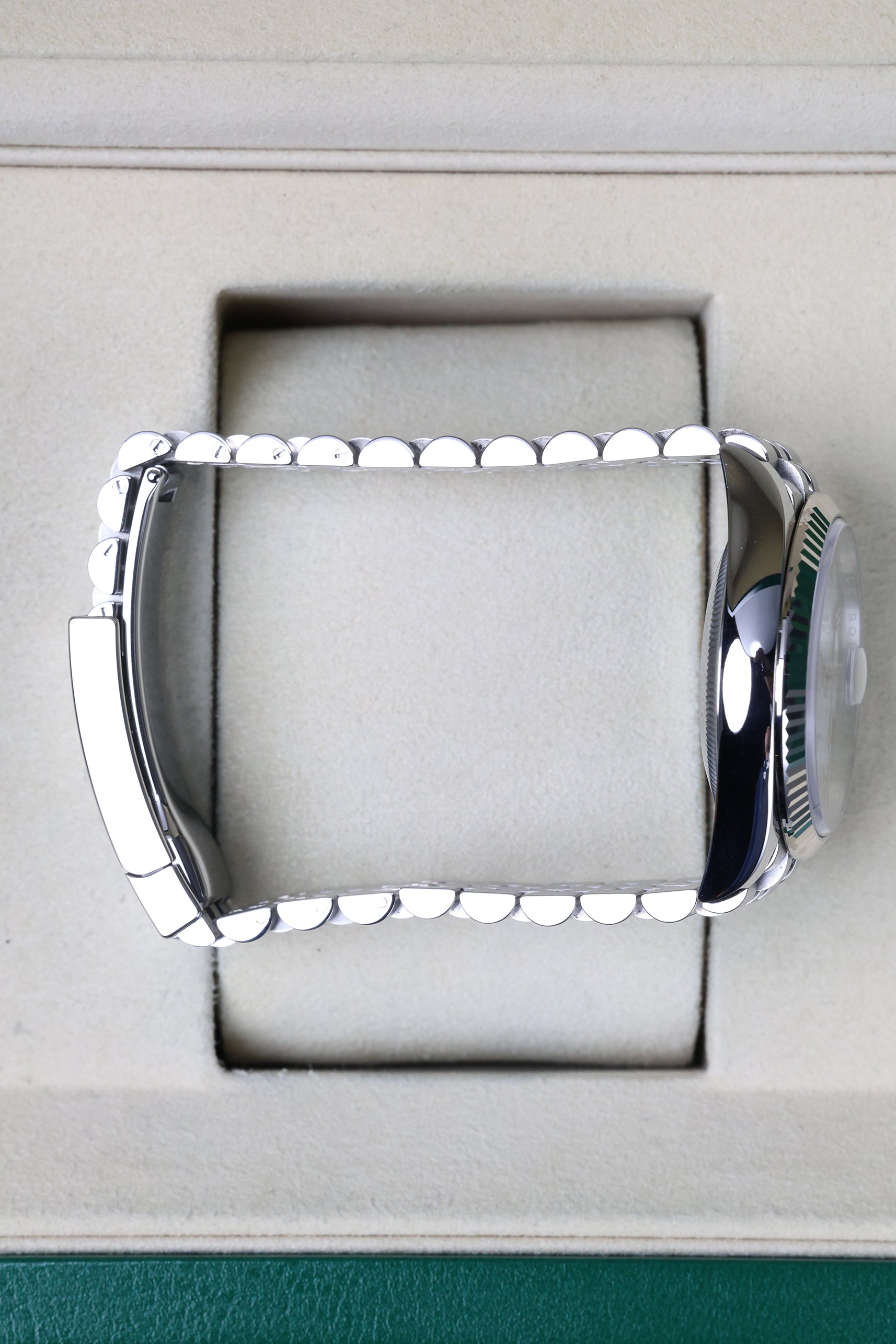 In this configuration, the watch is fitted with the legendary Jubilee bracelet. With its intricate five-piece link construction, the Jubilee is renowned for its "liquid" drape and exceptional comfort on the wrist. When paired with the fluted bezel, it creates the most iconic Datejust "look"—a shimmering, jewelry-grade aesthetic that catches the light from every angle. The bracelet is secured by the Oysterclasp and includes the Easylink 5mm comfort extension, providing a perfect, tool-free fit that ensures the watch stays comfortable regardless of temperature or activity.