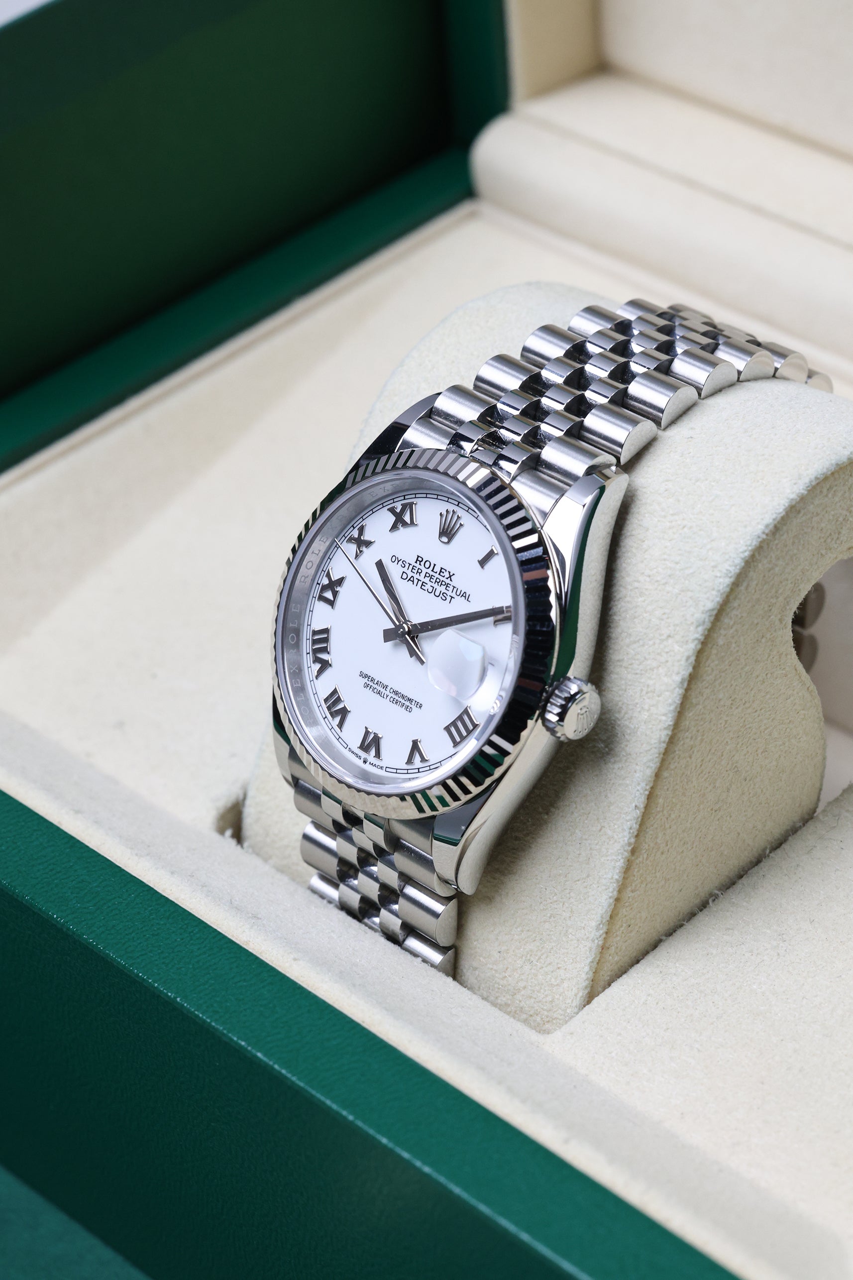 Under the hood, the 126234 is powered by the Manufacture Calibre 3235, a next-generation movement protected by 14 patents. It features the high-efficiency Chronergy escapement and a blue Parachrom hairspring, offering superior resistance to magnetic fields and shocks. With an impressive 70-hour power reserve, the watch is "weekend-proof," meaning it will continue running from Friday evening through Monday morning. Certified as a Superlative Chronometer and water-resistant to 100 meters, this Datejust is not merely a refined dress watch; it is a high-precision instrument that pairs the irreplaceable character of the now-discontinued serif Roman dial with the robust reliability of modern Rolex craftsmanship.
