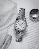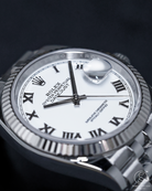 The centerpiece of this specific reference is its crisp, luminous white dial, which serves as a canvas for one of the most sought-after configurations in the Datejust family: the Serif Roman Numeral dial. Unlike the updated versions found in the newest Rolex catalog—which feature simplified, non-serif "block" numerals—this specific iteration utilizes elegant, elongated Roman numerals with traditional serif detailing. Crafted from 18k white gold, these indices provide a sense of depth and formal sophistication that feels distinctly "old-school" and artisanal. Framed by the brilliant, light-refracting 18k white gold fluted bezel, the dial achieves a level of high-contrast legibility and classical charm that is becoming increasingly rare.