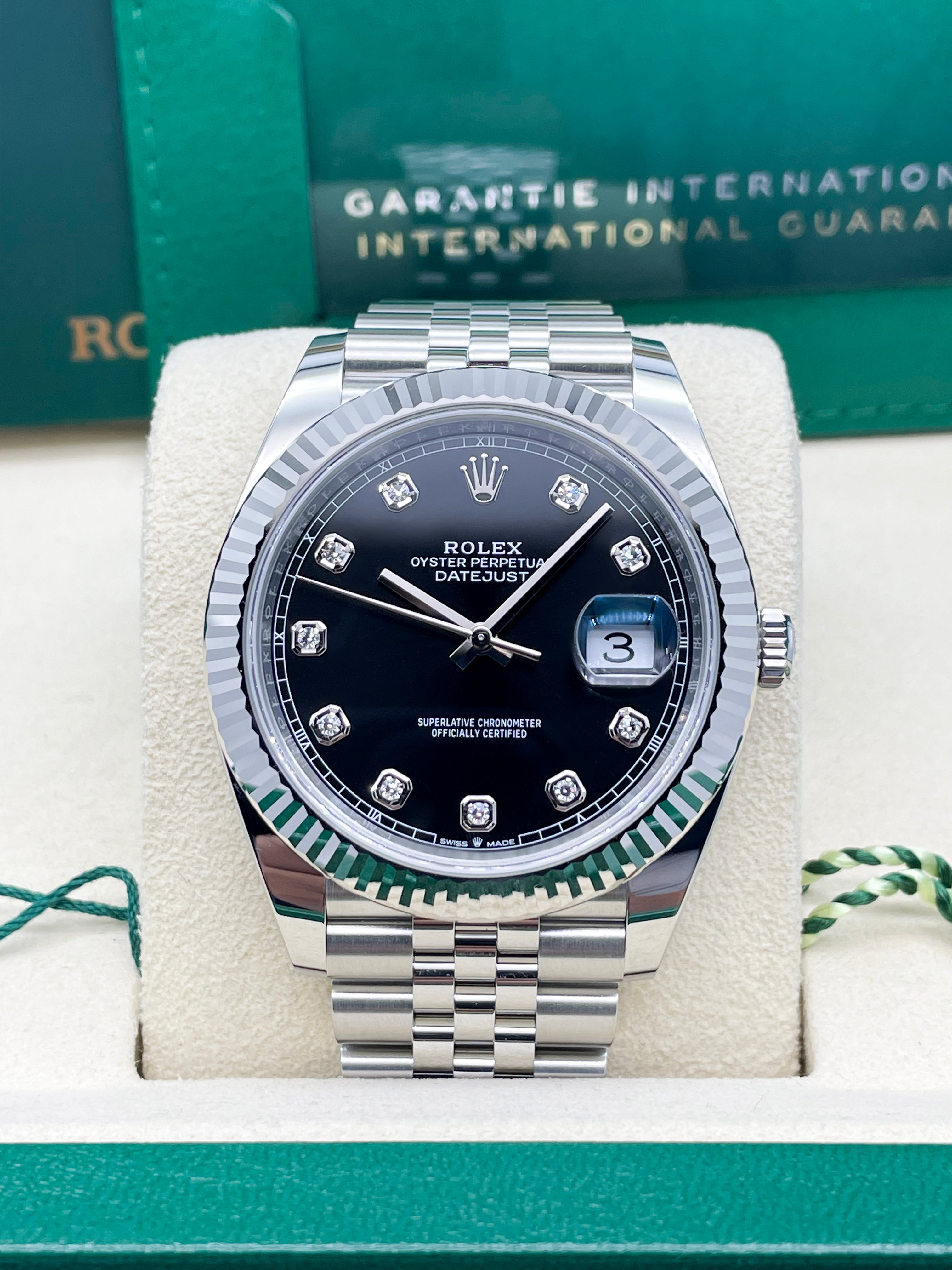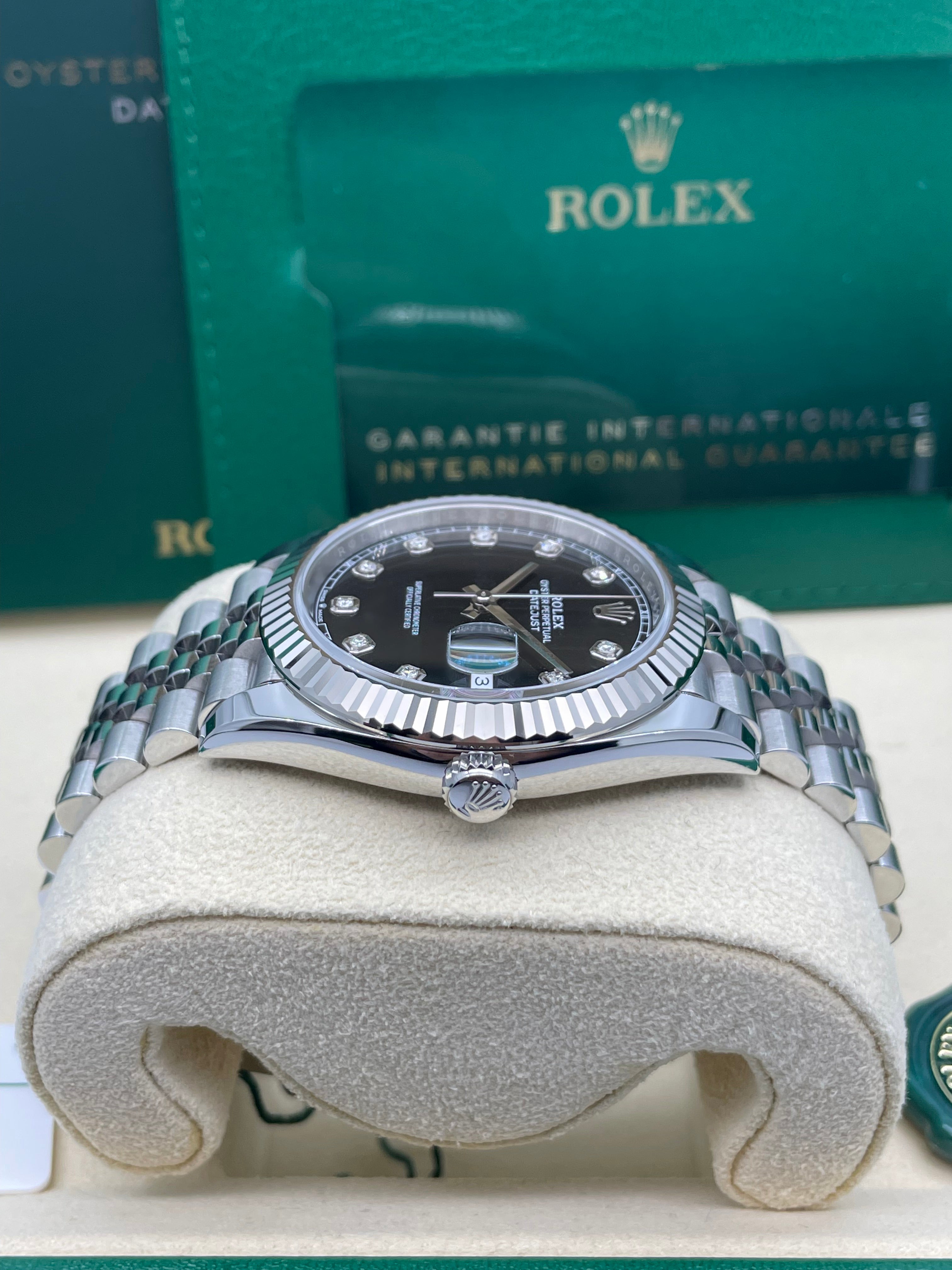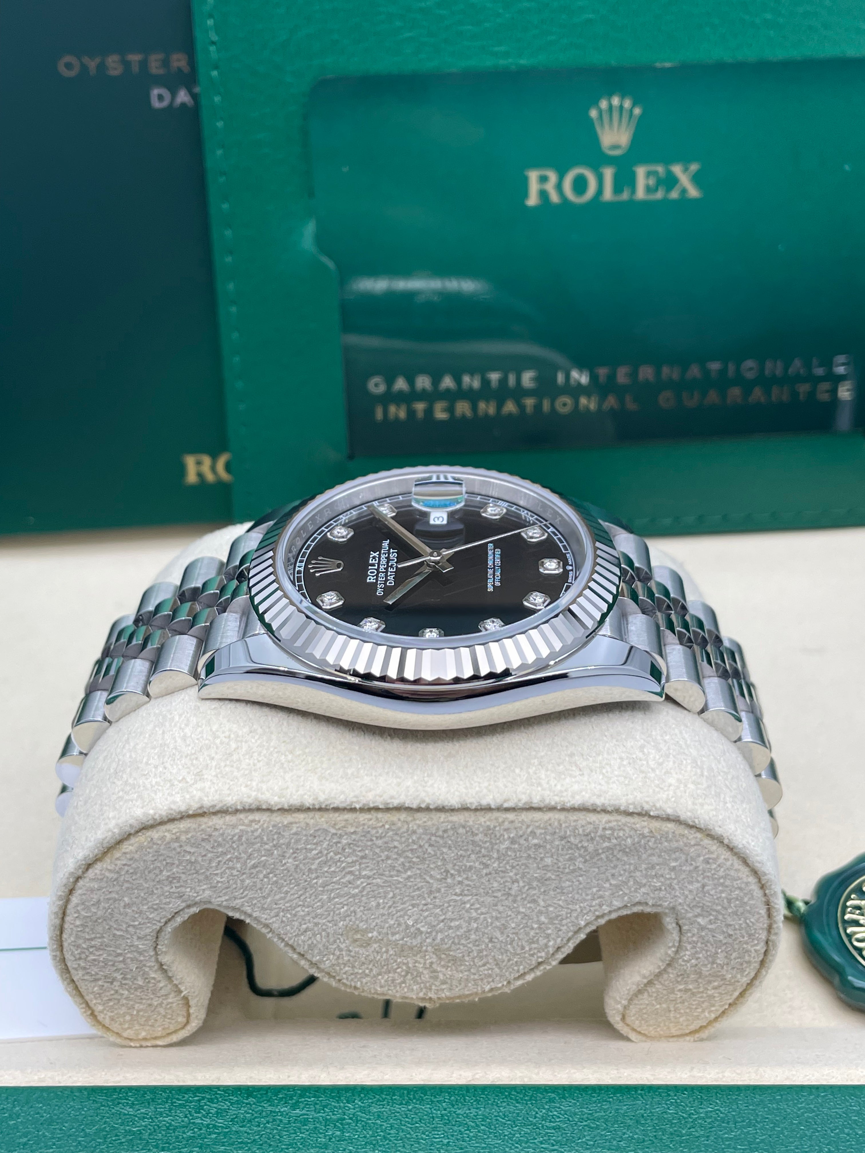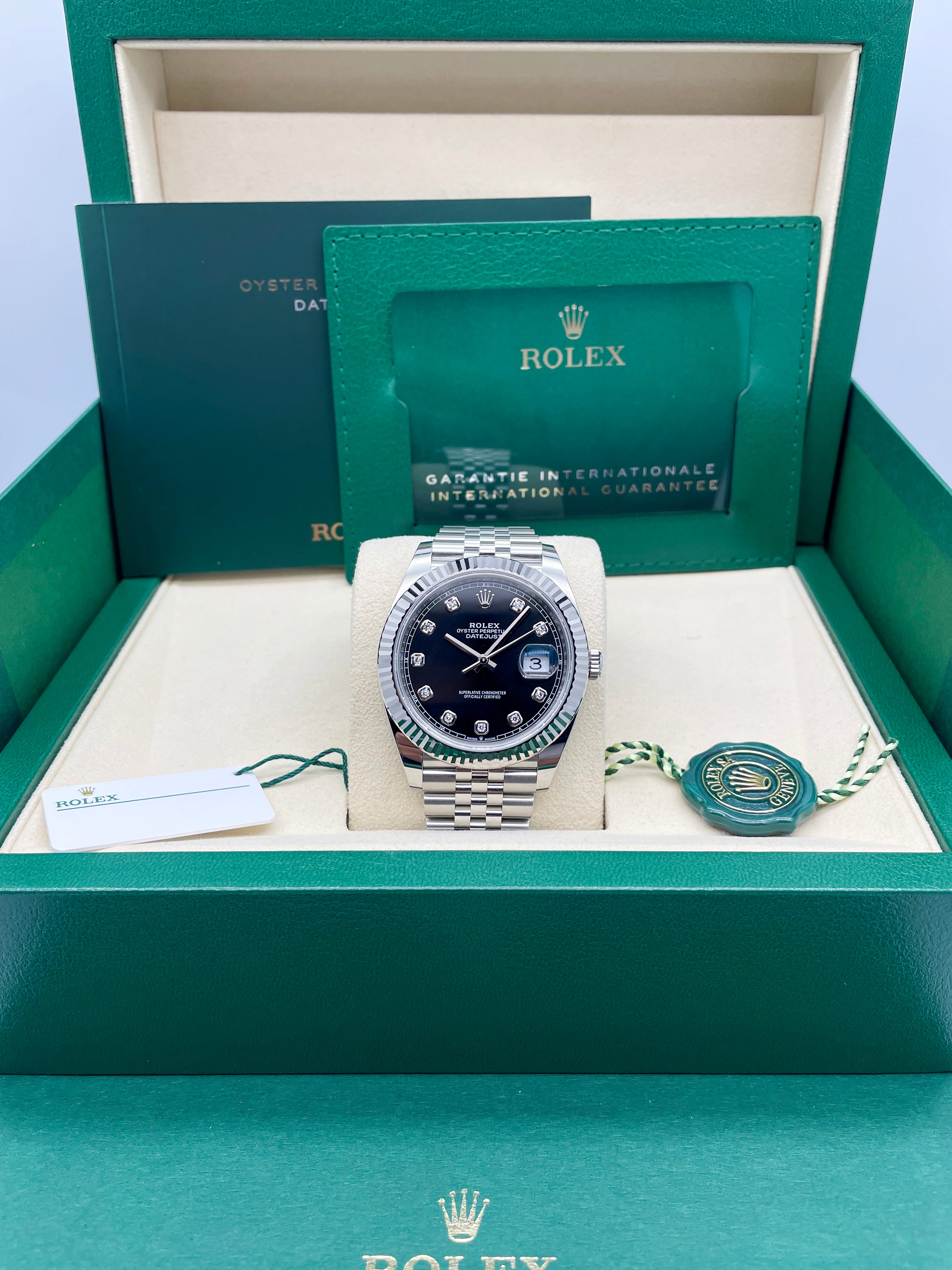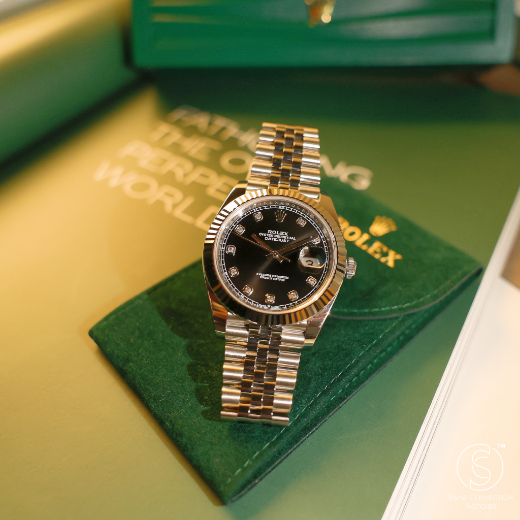 Powering this exquisite timepiece is Rolex's latest generation in-house automatic movement, boasting an impressive 70-hour power reserve. This mechanism ensures superior precision, durability, and reliability, all certified as a Superlative Chronometer. With a robust 100-meter water resistance, the Datejust 41mm in Black with 10 Diamonds is more than just a refined dress watch; it's a dependable and robust everyday companion, perfectly balancing cherished tradition with modern innovation and dazzling sparkle.