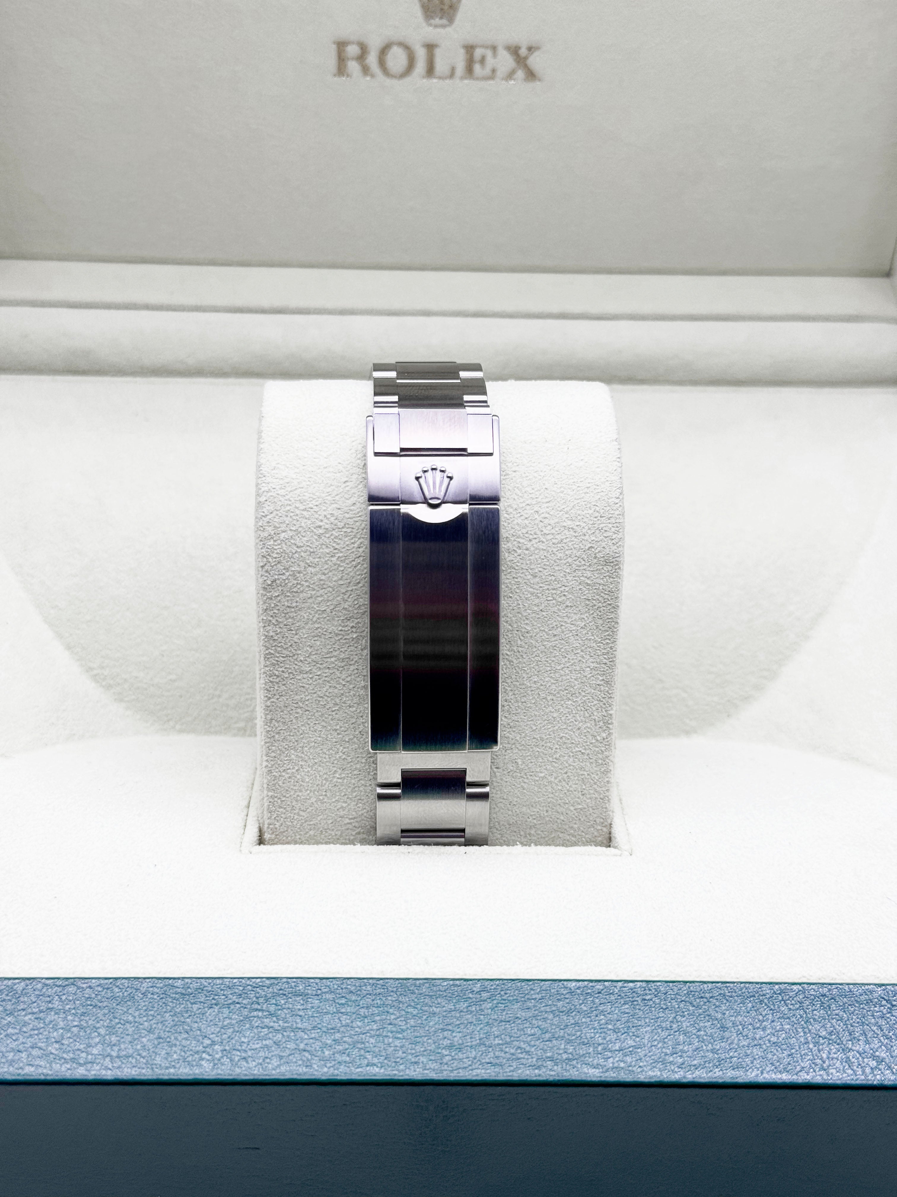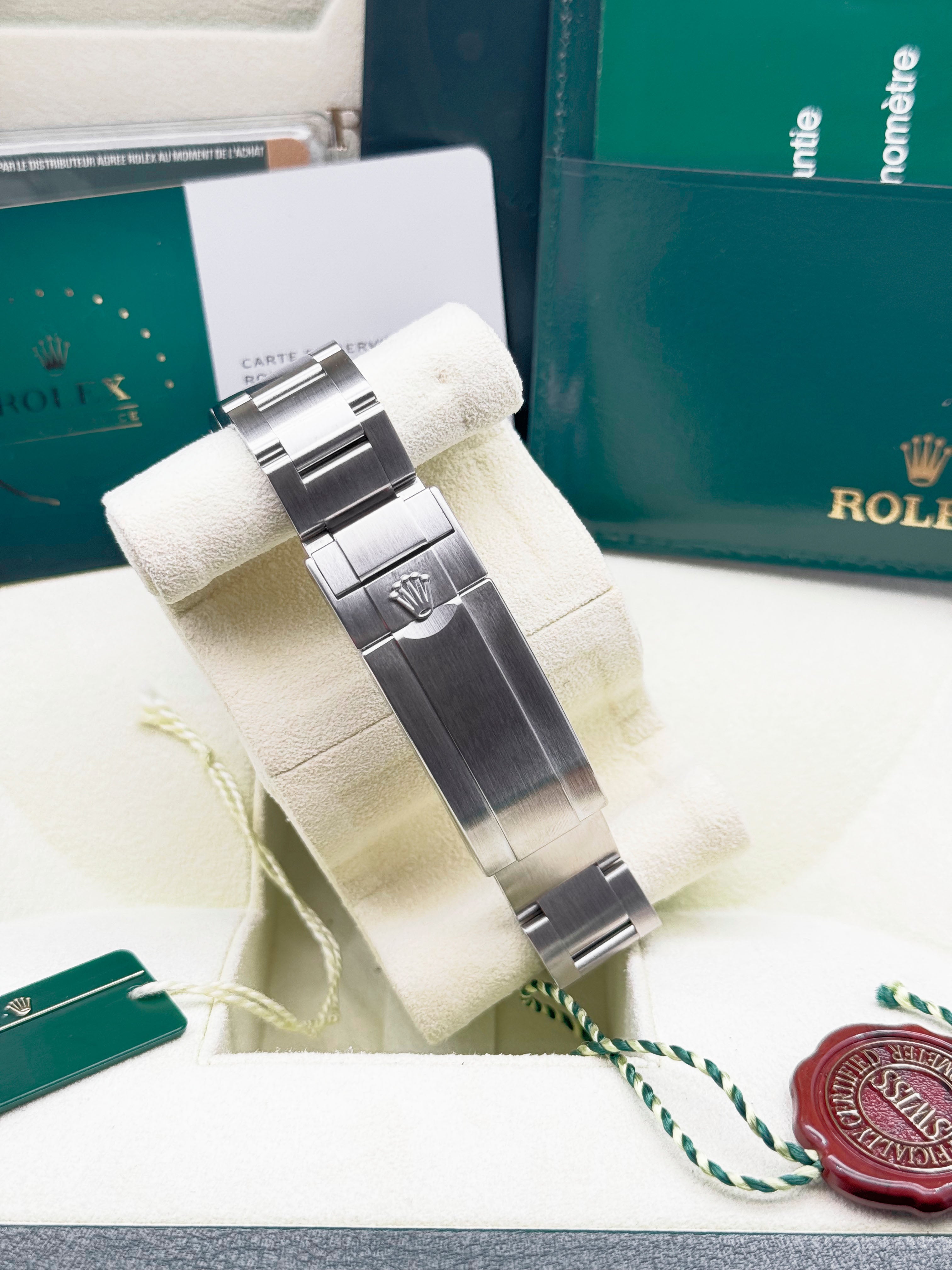 This particular example has just returned from a full service at the Rolex Service Centre in March 2025, ensuring optimal performance and pristine condition. The service included a complete overhaul of the movement and refinishing of the case and bracelet, bringing the watch back to near-factory standards. It now offers both the reassurance of Rolex’s mechanical reliability and the added confidence of service-backed documentation.