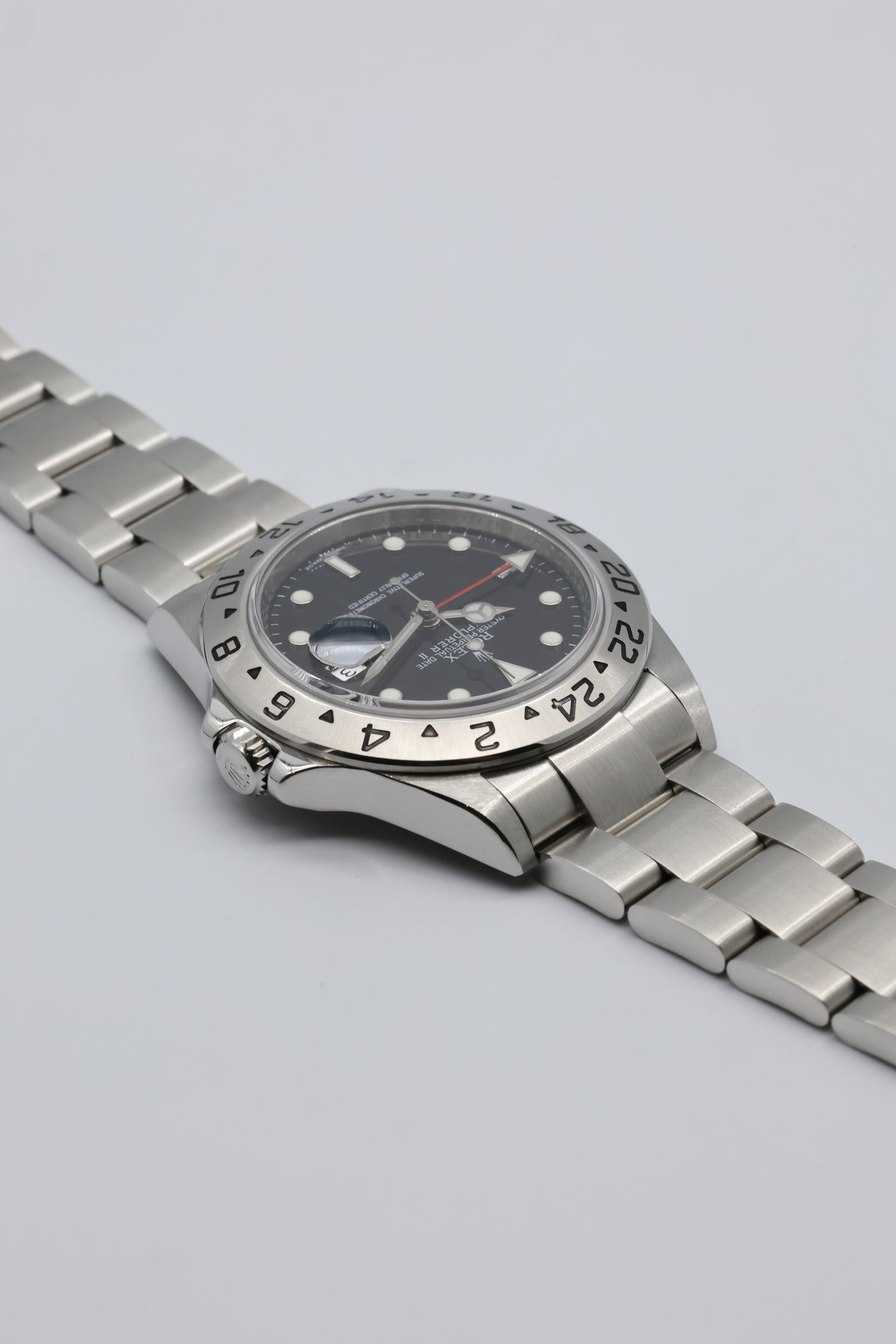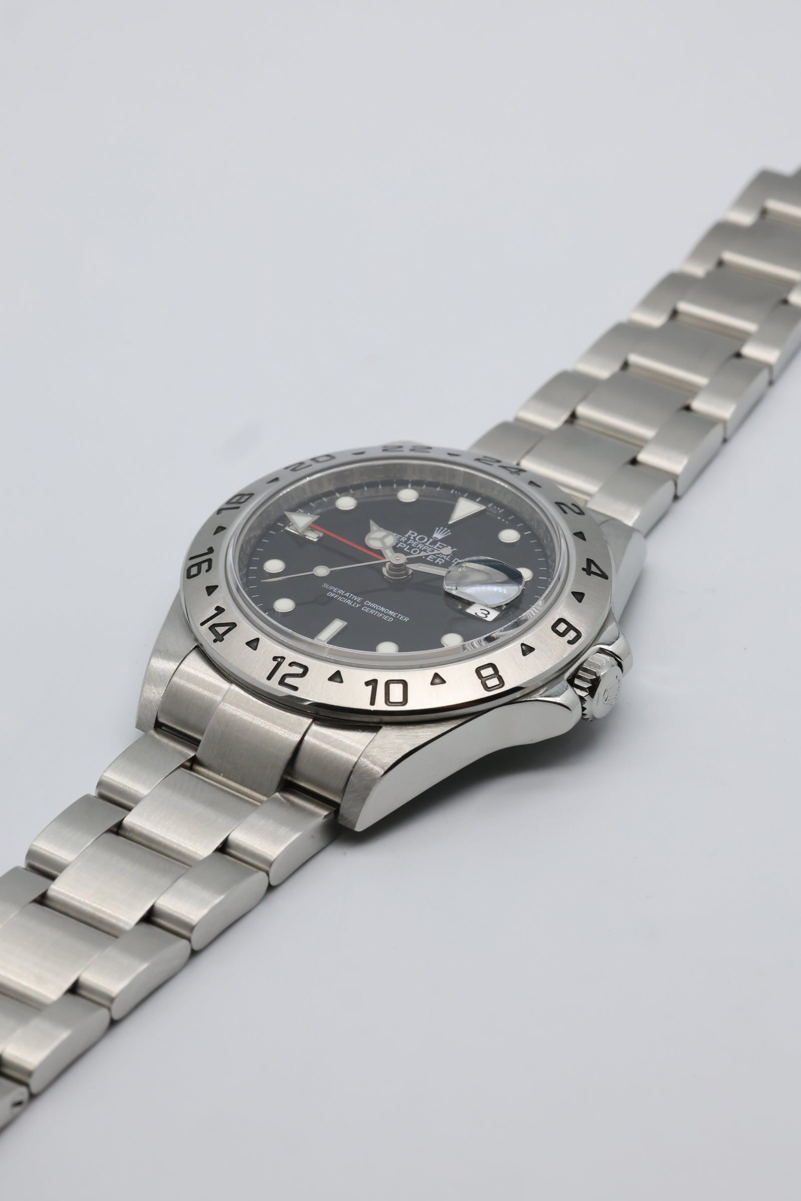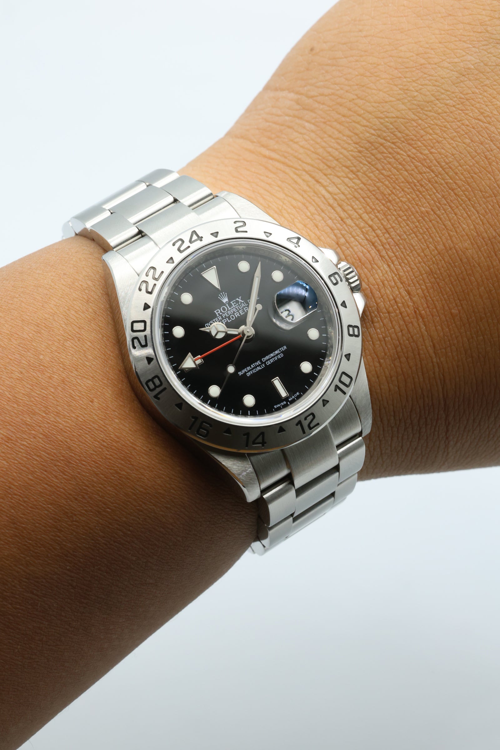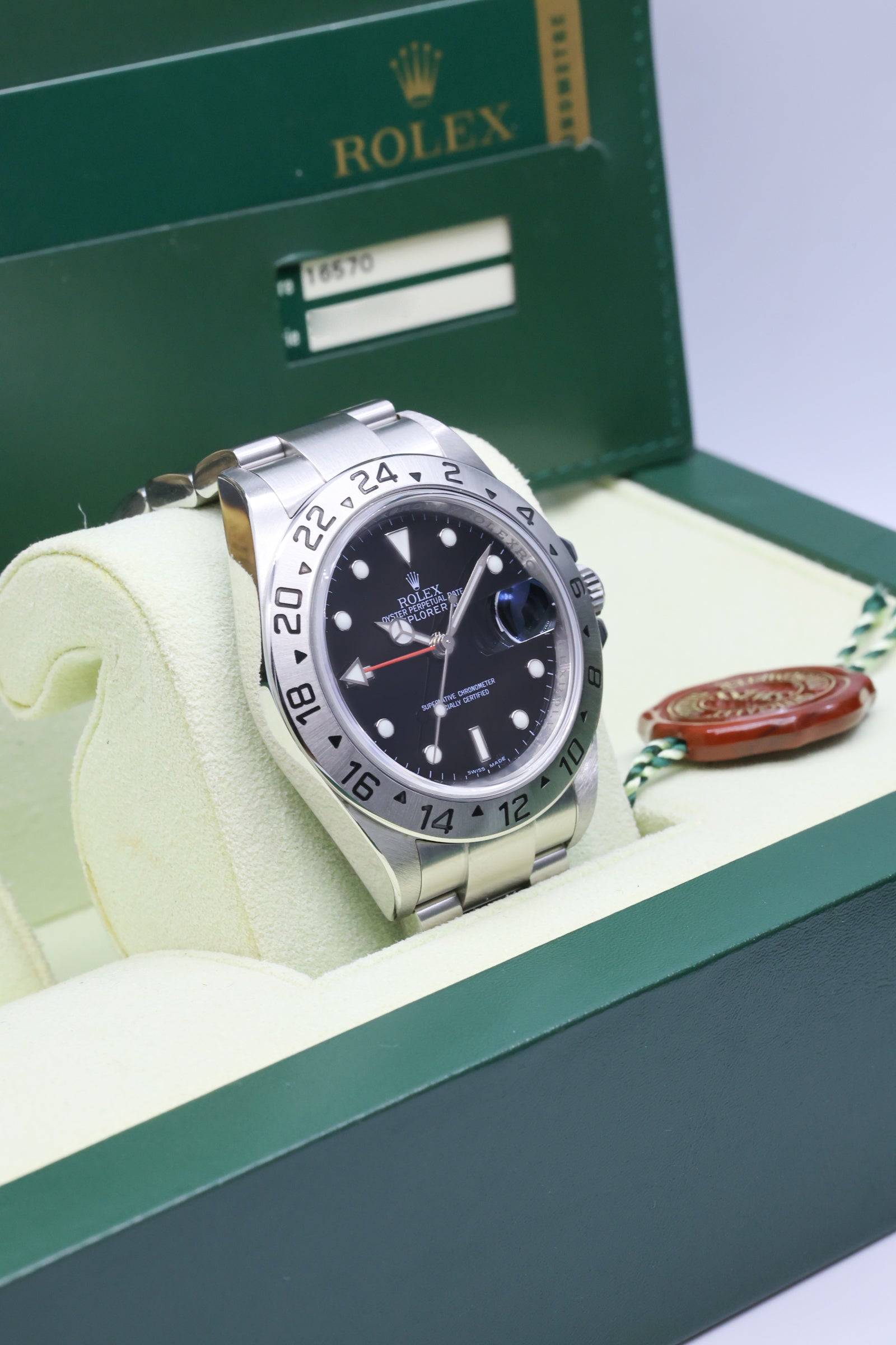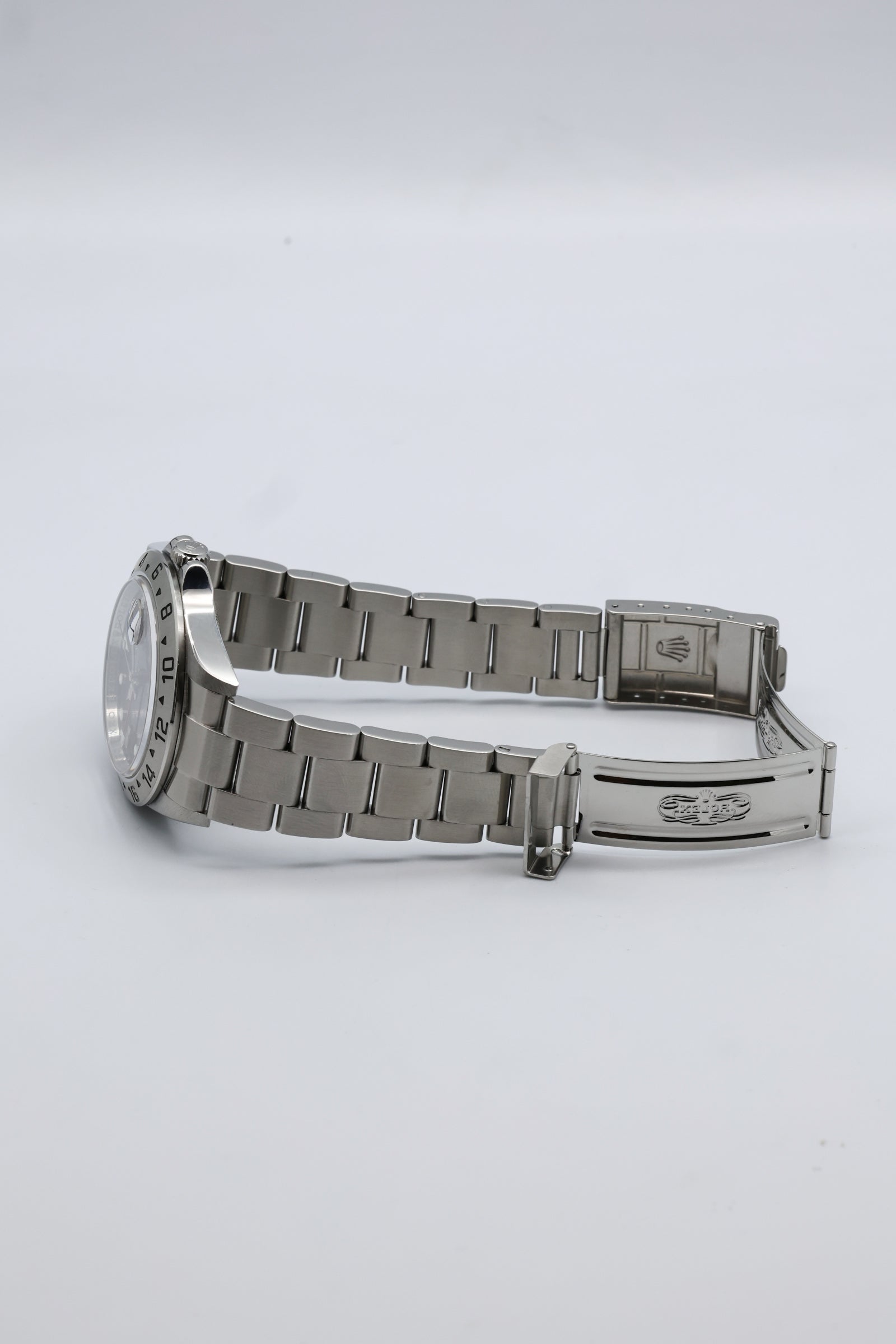 Housed in a 40mm stainless steel case, the 16570 maintains a sleek and comfortable profile that suits various wrist sizes. Its Oyster case construction ensures water resistance up to 100 meters (330 feet), making it reliable for both rugged exploration and urban adventures. The fixed 24-hour bezel, crafted from robust stainless steel, features engraved numerals filled with black enamel for excellent legibility. Paired with the Oyster bracelet and its secure folding clasp, the watch offers a harmonious combination of durability and refinement.