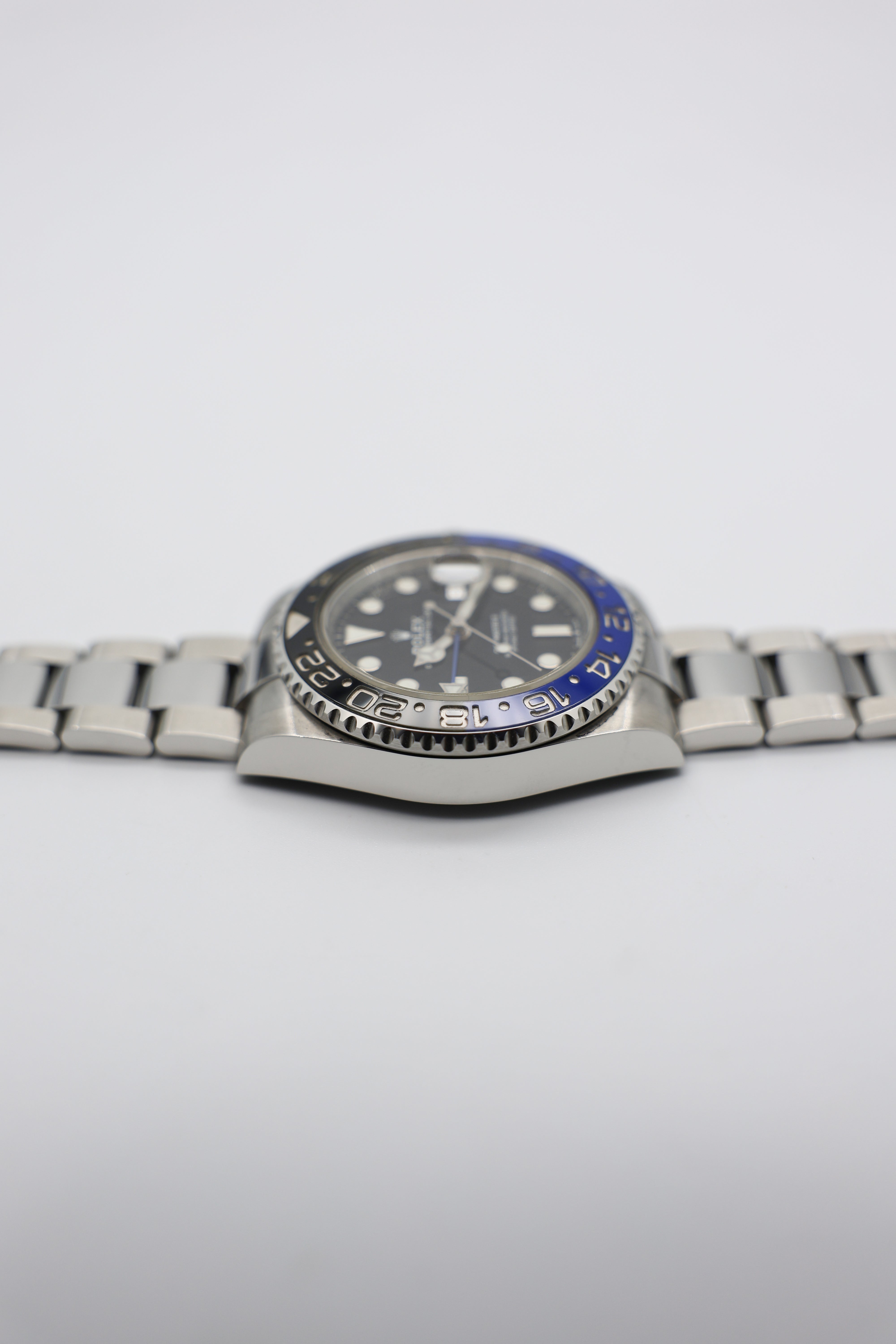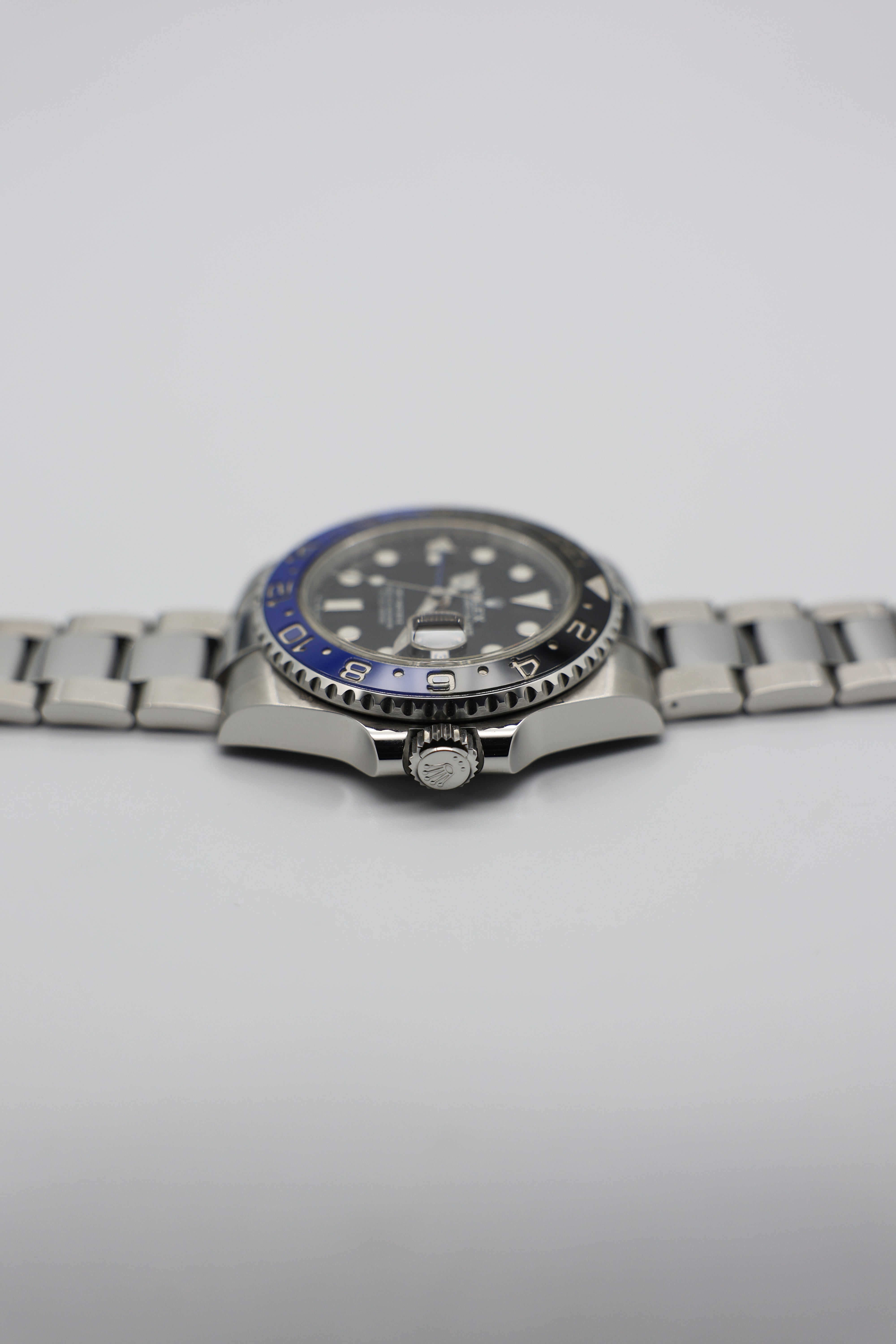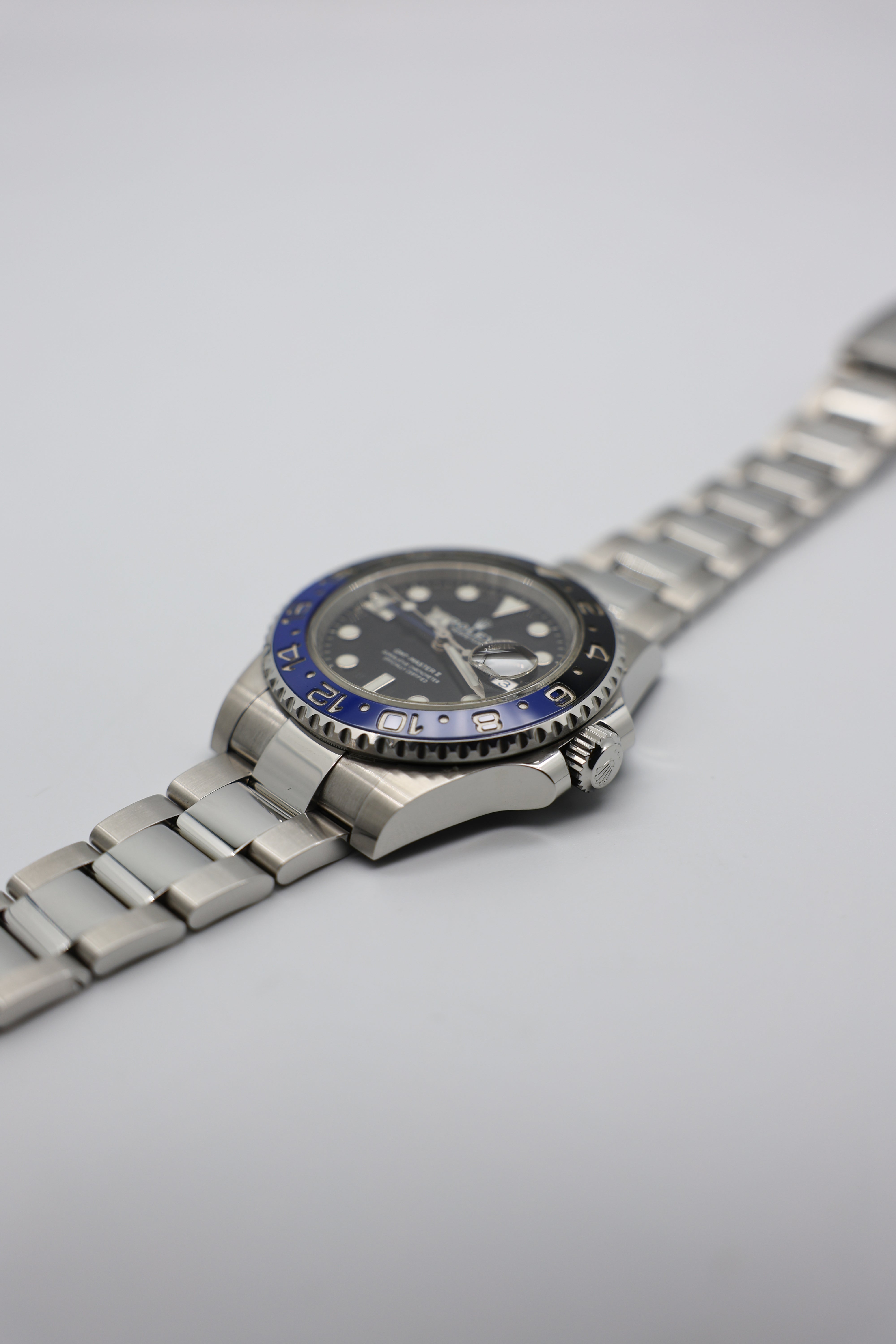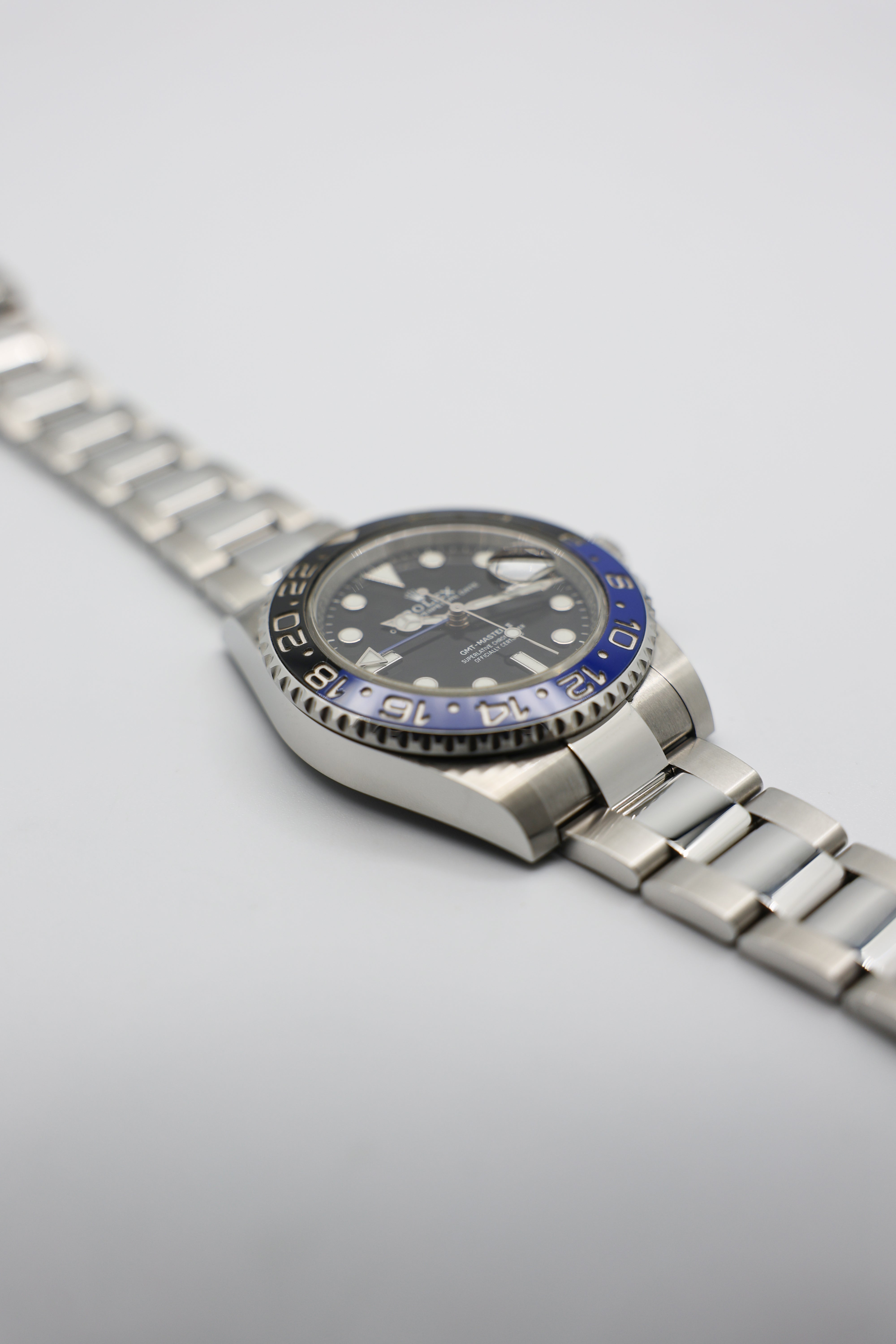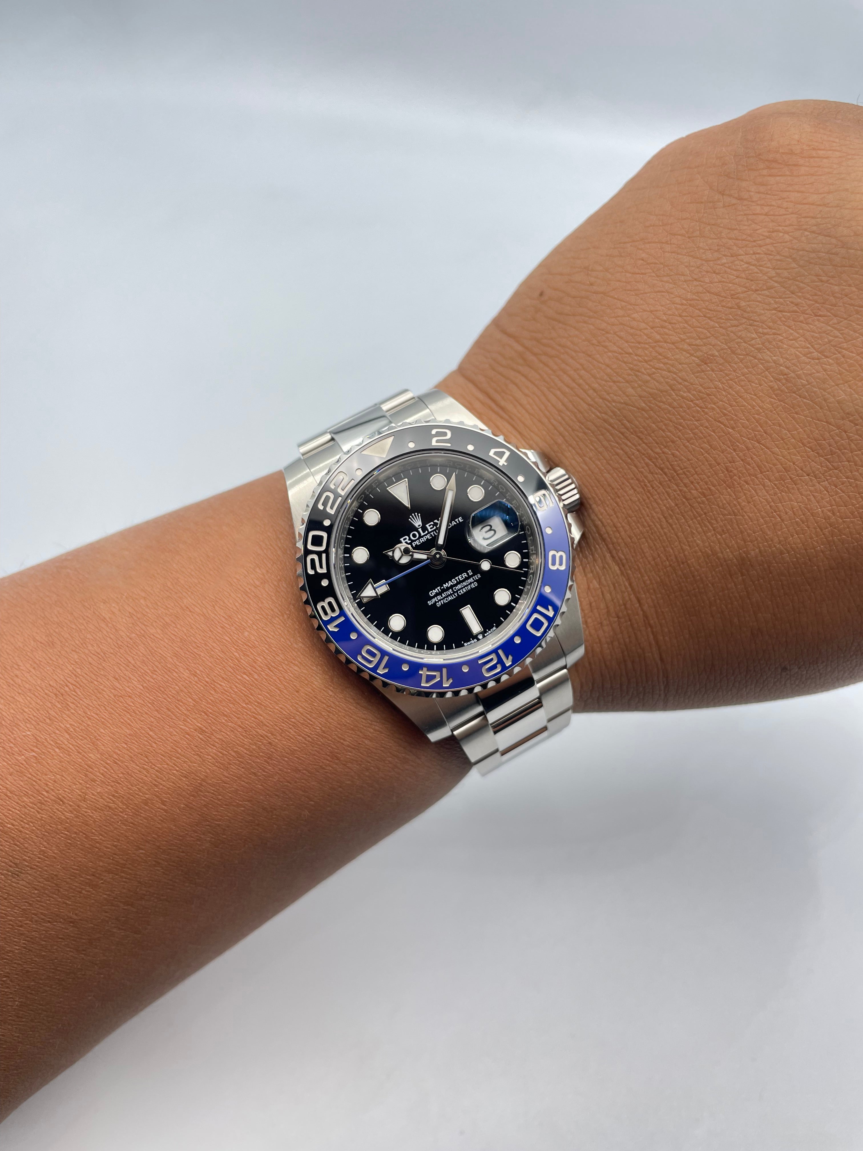 The dial of the Batman is a sleek, functional black with high-contrast white hour markers, offering excellent readability. The familiar Mercedes hour hand and blue GMT hand make tracking multiple time zones a breeze, while the Chromalight display ensures visibility in low light with a long-lasting blue glow. The watch’s 40mm Oystersteel case adds to its durability, making it resilient enough for rugged use yet refined enough for more formal settings.