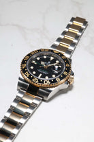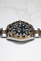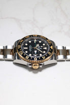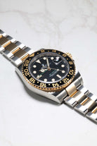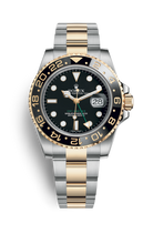 This timepiece is a stunning blend of robust Oystersteel and luxurious 18k yellow gold, which appears on the bezel, crown, and polished center links of the Oyster bracelet. The glossy black Cerachrom bezel provides a refined, modern edge that is perfectly complemented by the classic black dial. Yellow gold accents on the hands and bold maxi hour markers provide a warm contrast, elevating the watch's visual appeal and reinforcing the bi-metal construction. The 24-hour GMT hand, also in gold, allows for tracking a second time zone, making it an ideal companion for travelers.