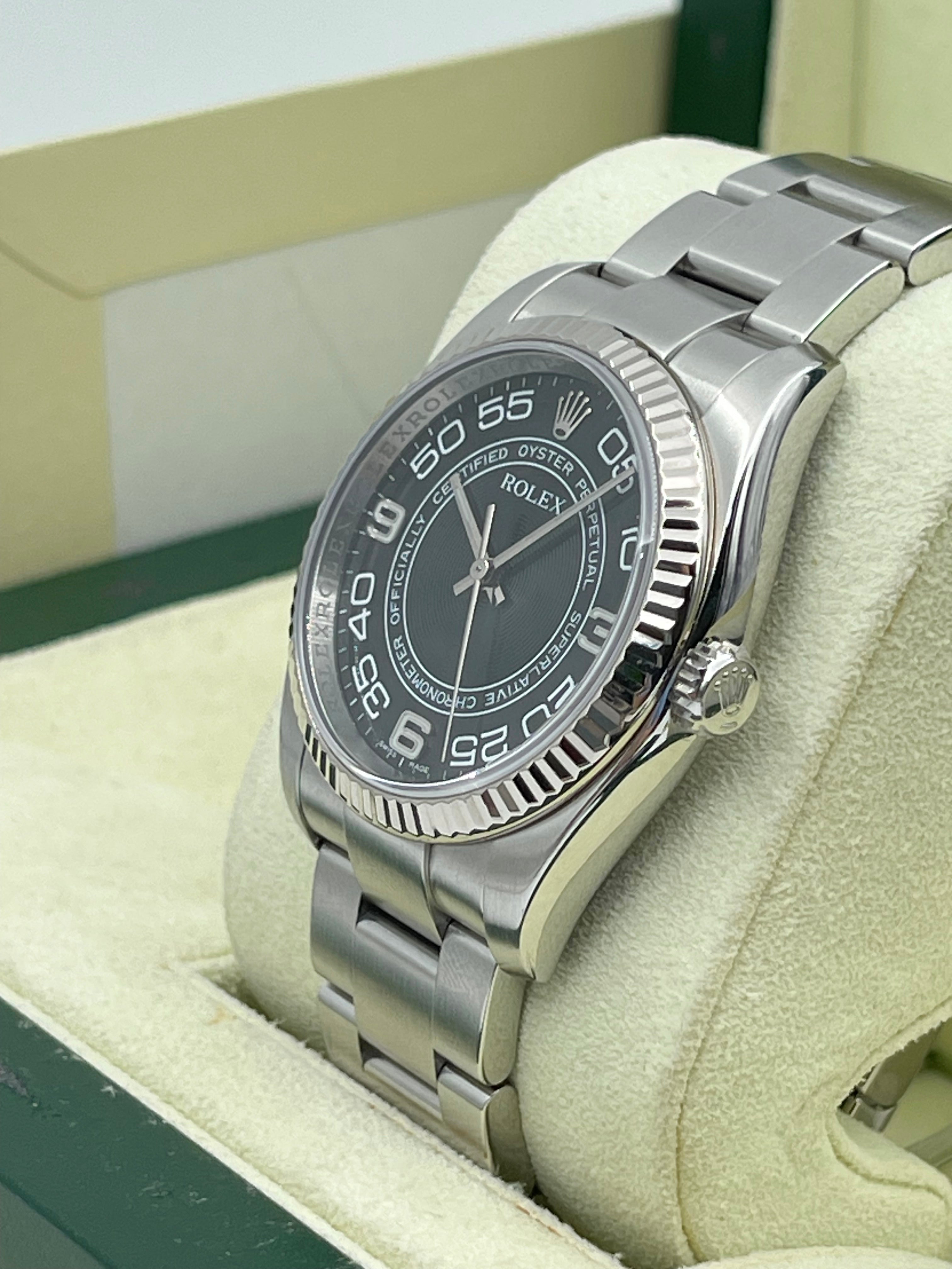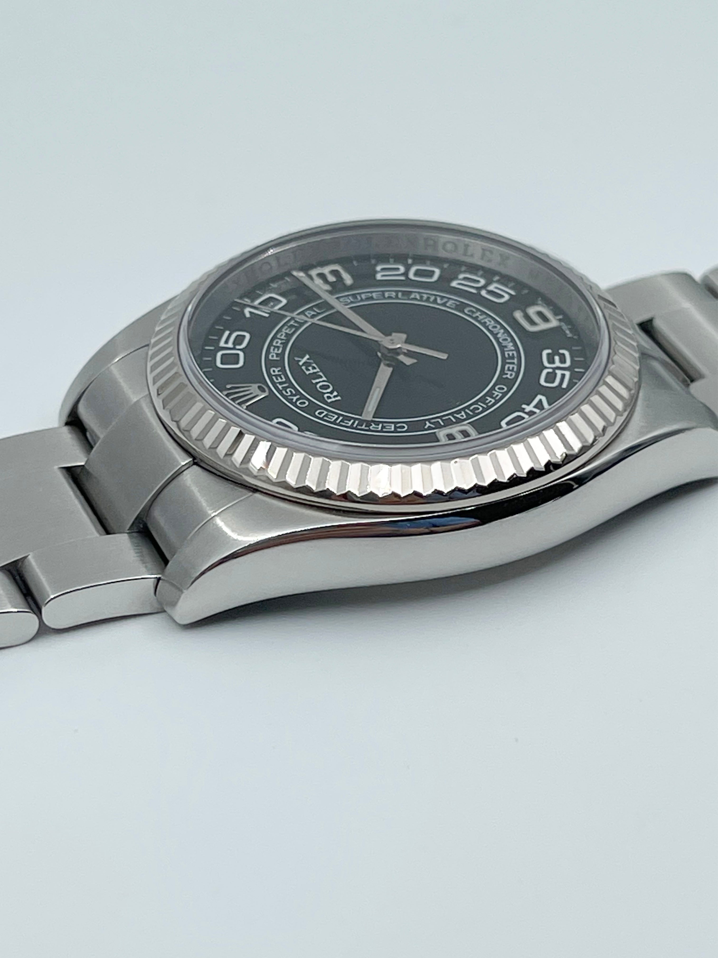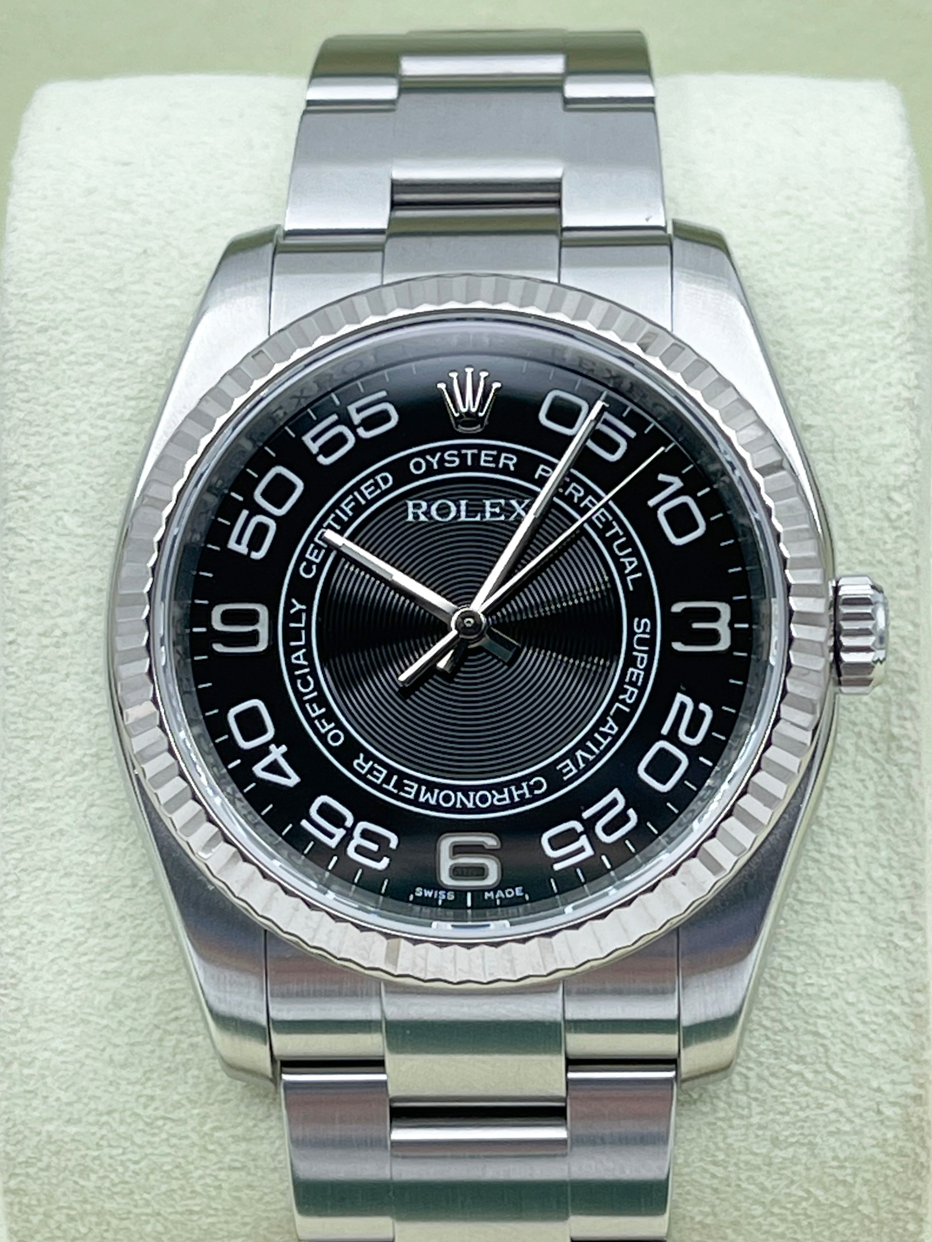 The reference 116034 is the previous generation Oyster Perpetual 36. Introduced since 2000s, it was later discontinued in 2014. During the early 2000s, Rolex released a few interesting dials - including the Black Concentric dial - which had a concentric "Superlative Chronometer Officially Certified" printed on the dial - with a guilloche finishing. These dials are rare and no longer in production.