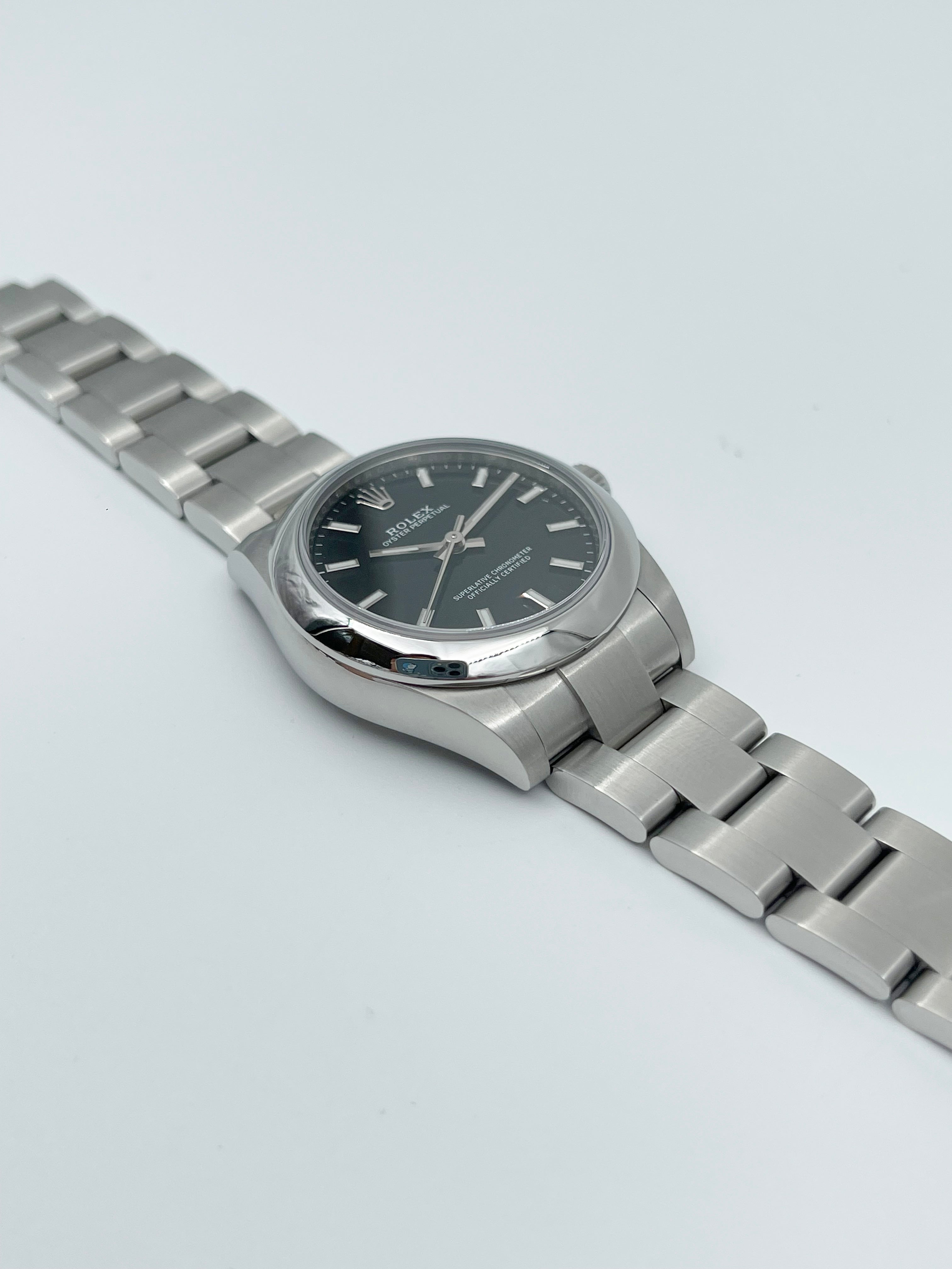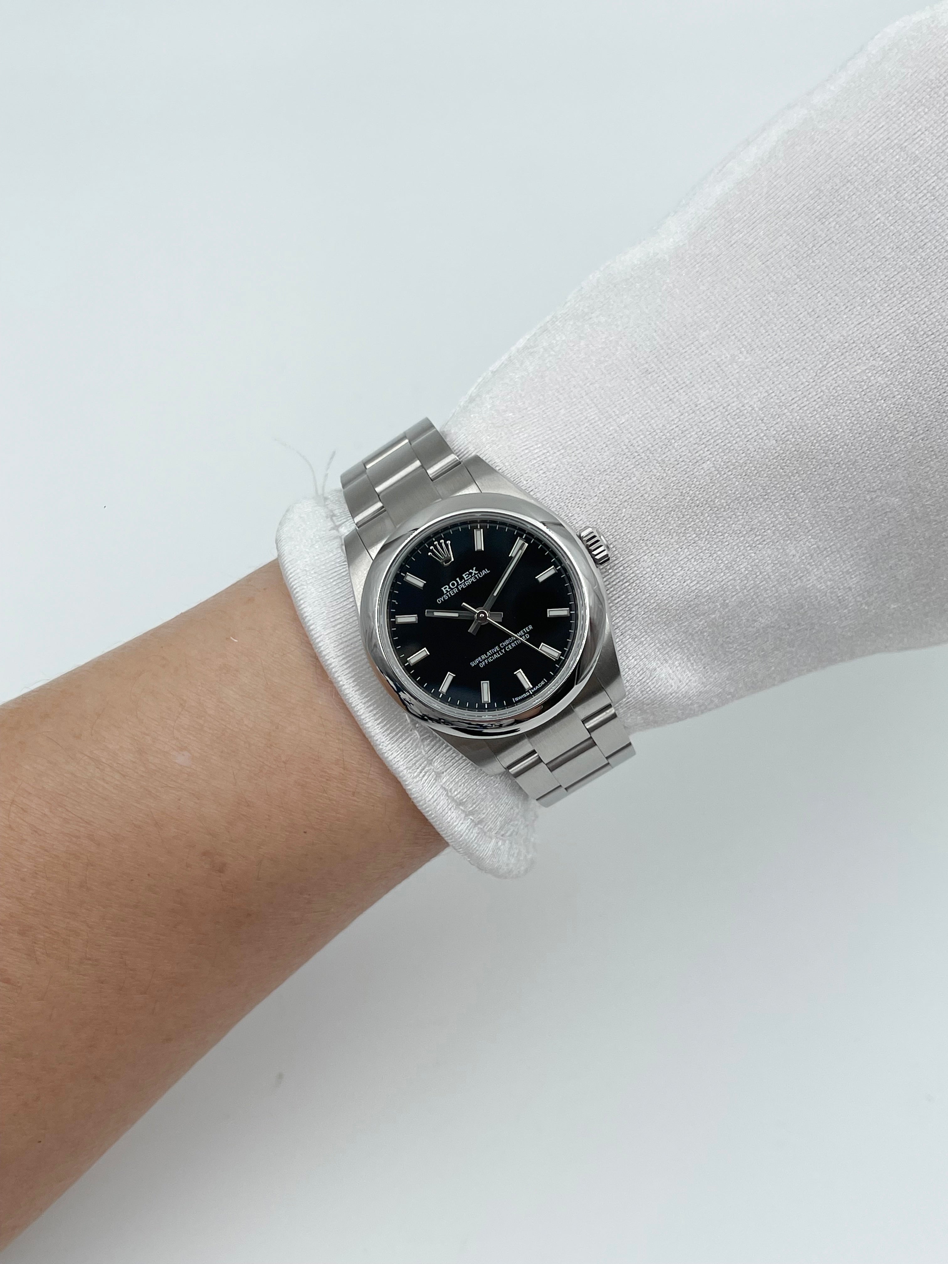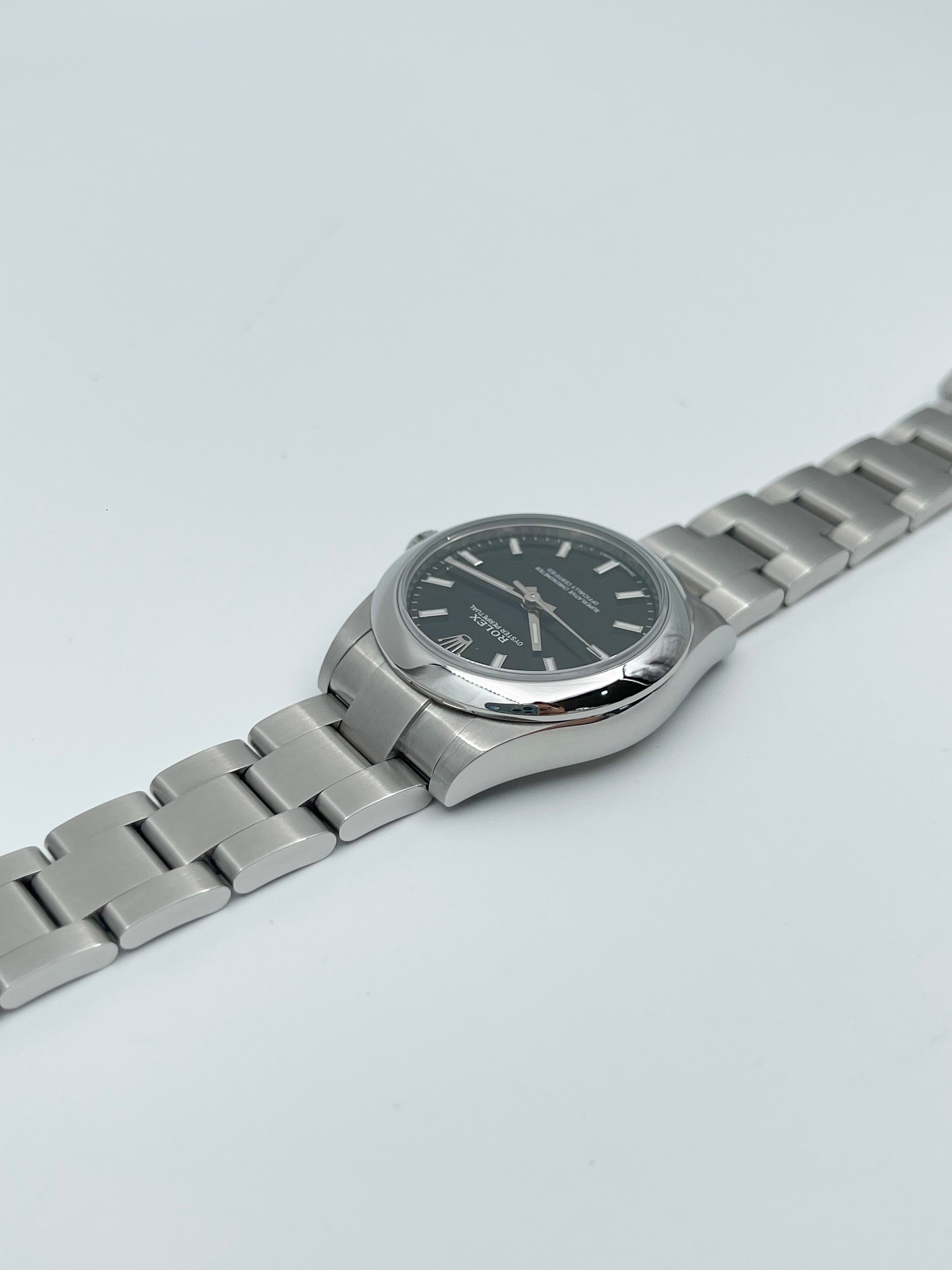 The Rolex Oyster Perpetual 31mm reference 177200 is a refined and understated expression of Rolex's core values—precision, elegance, and timeless versatility. Crafted in Oystersteel, this 31mm model offers a perfect balance between subtle presence and practical wearability, making it ideal for those with smaller wrists or who prefer a more classic, compact size. The black dial adds a touch of sophistication and modernity to the watch, providing excellent legibility with white baton hour markers and polished hands that catch the light beautifully.