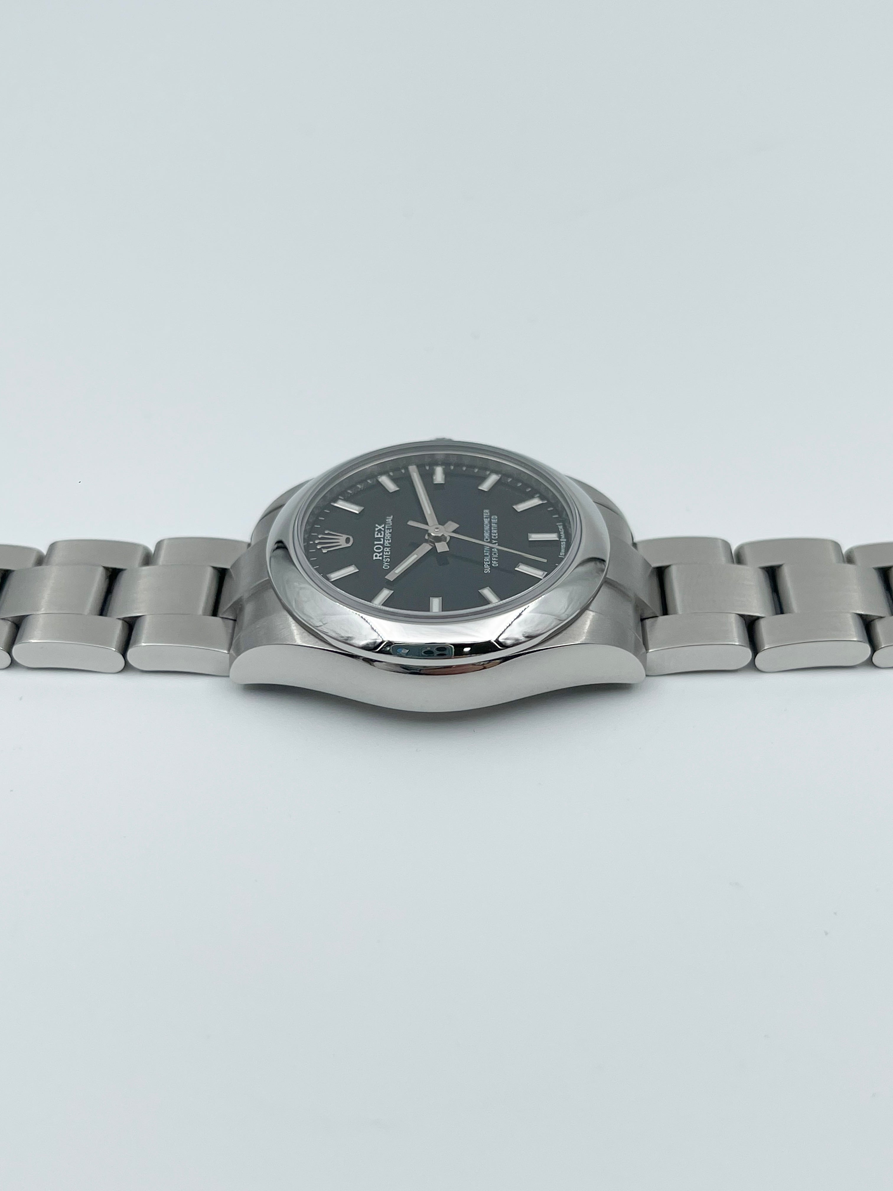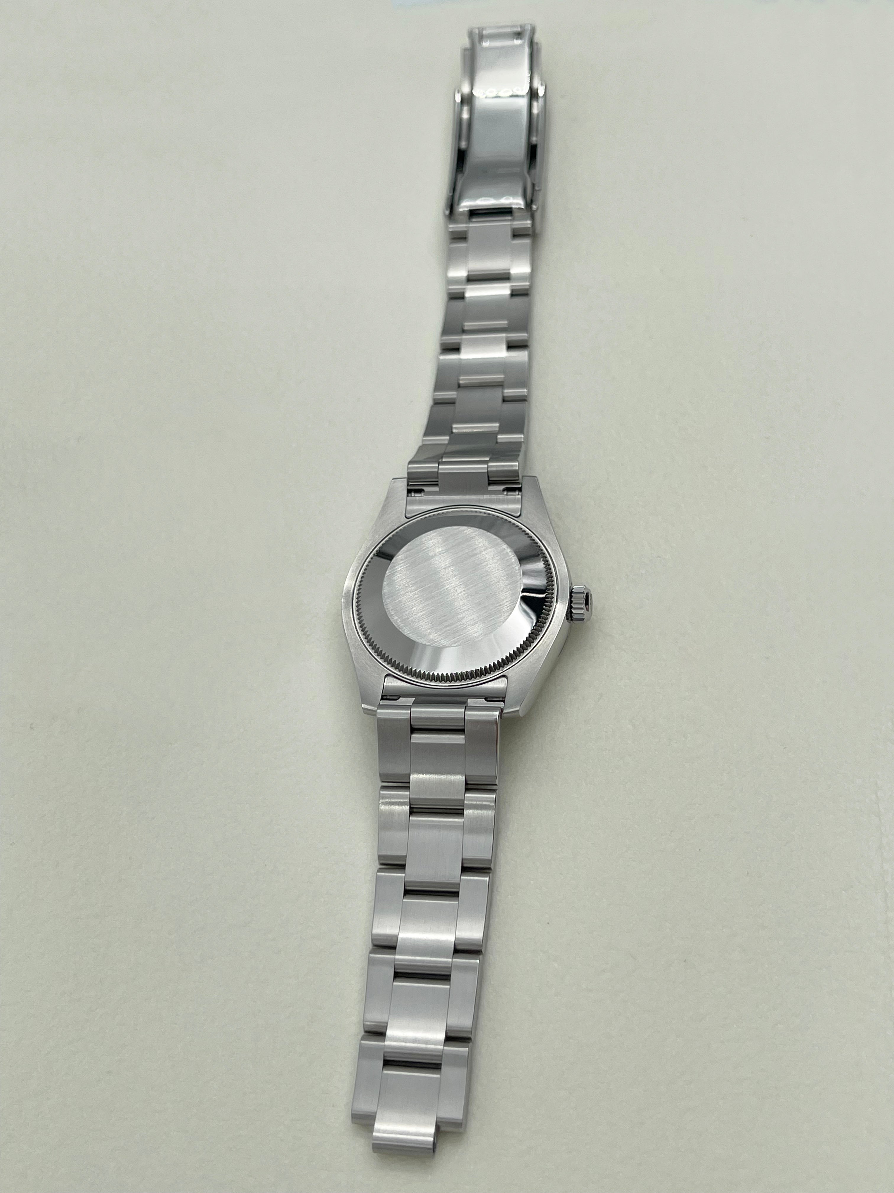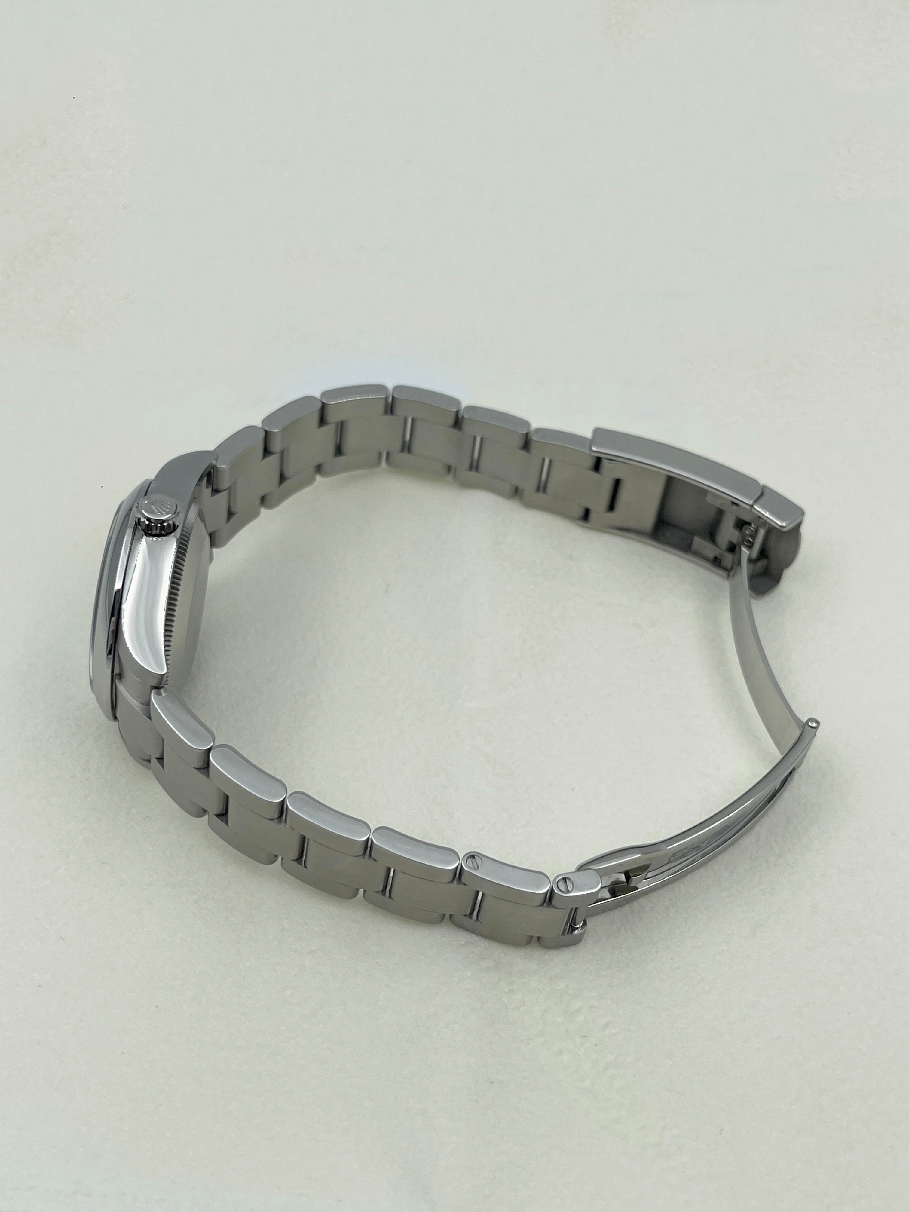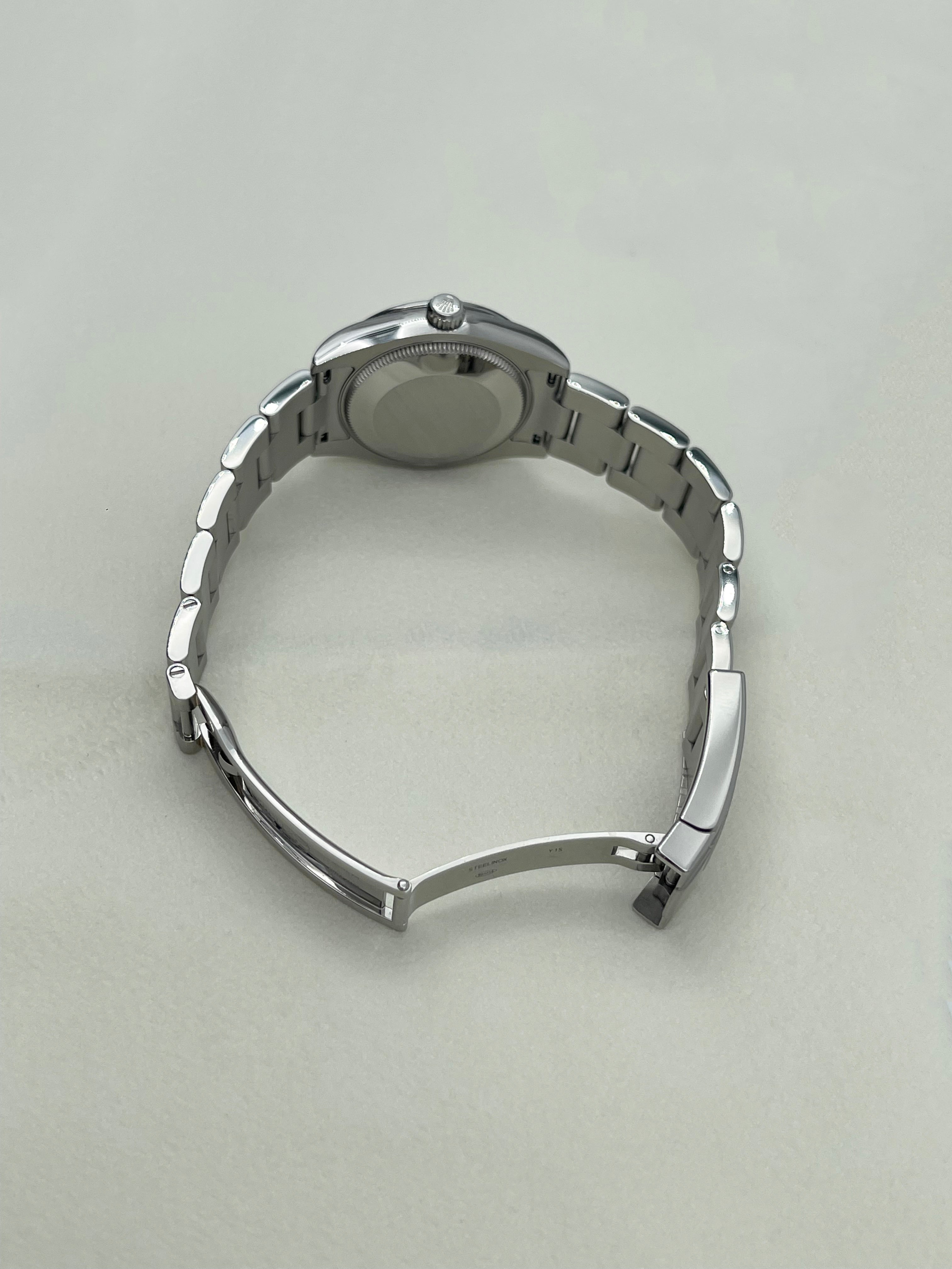 The Oyster Perpetual 177200 stands out as one of the last iterations to feature the older case design, with its slimmer profile and smoother lugs. This gives the watch a dressier, more traditional Rolex aesthetic compared to the chunkier proportions of the current generation. The smooth bezel and solid Oyster bracelet with brushed links further enhance its minimalist appeal, making it a versatile timepiece that easily transitions from casual settings to more formal occasions.