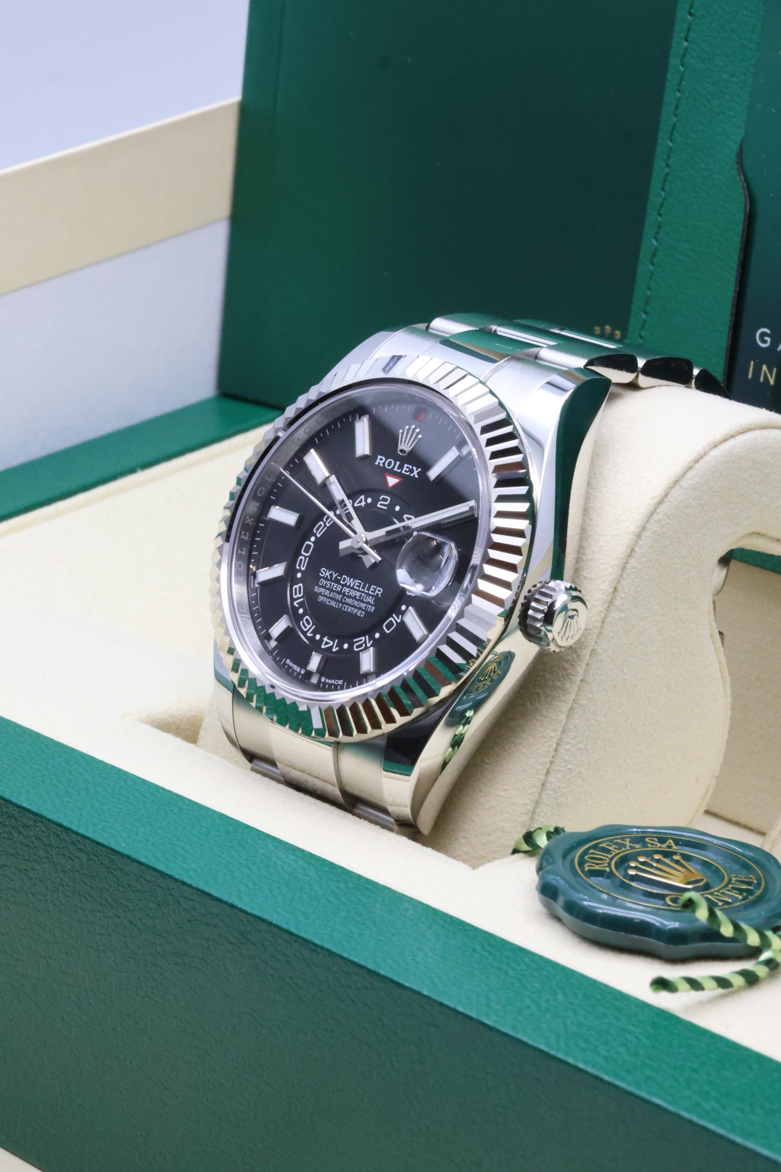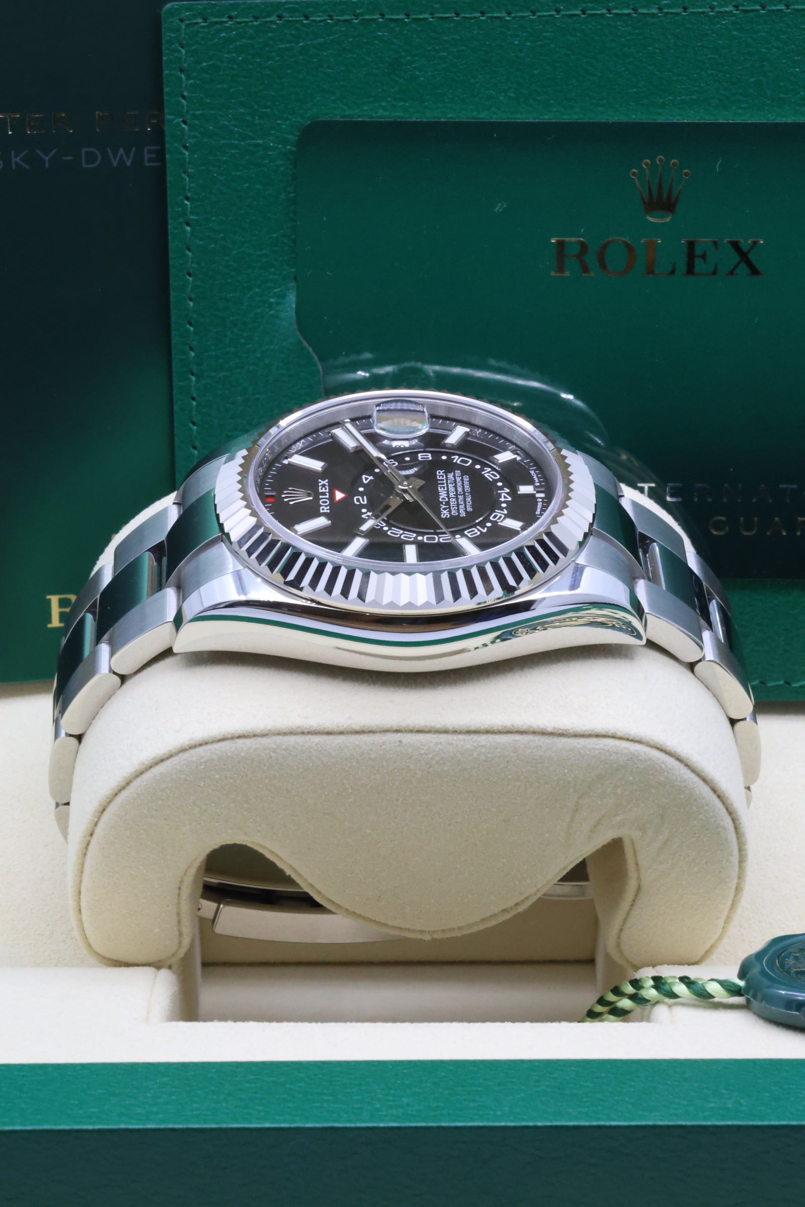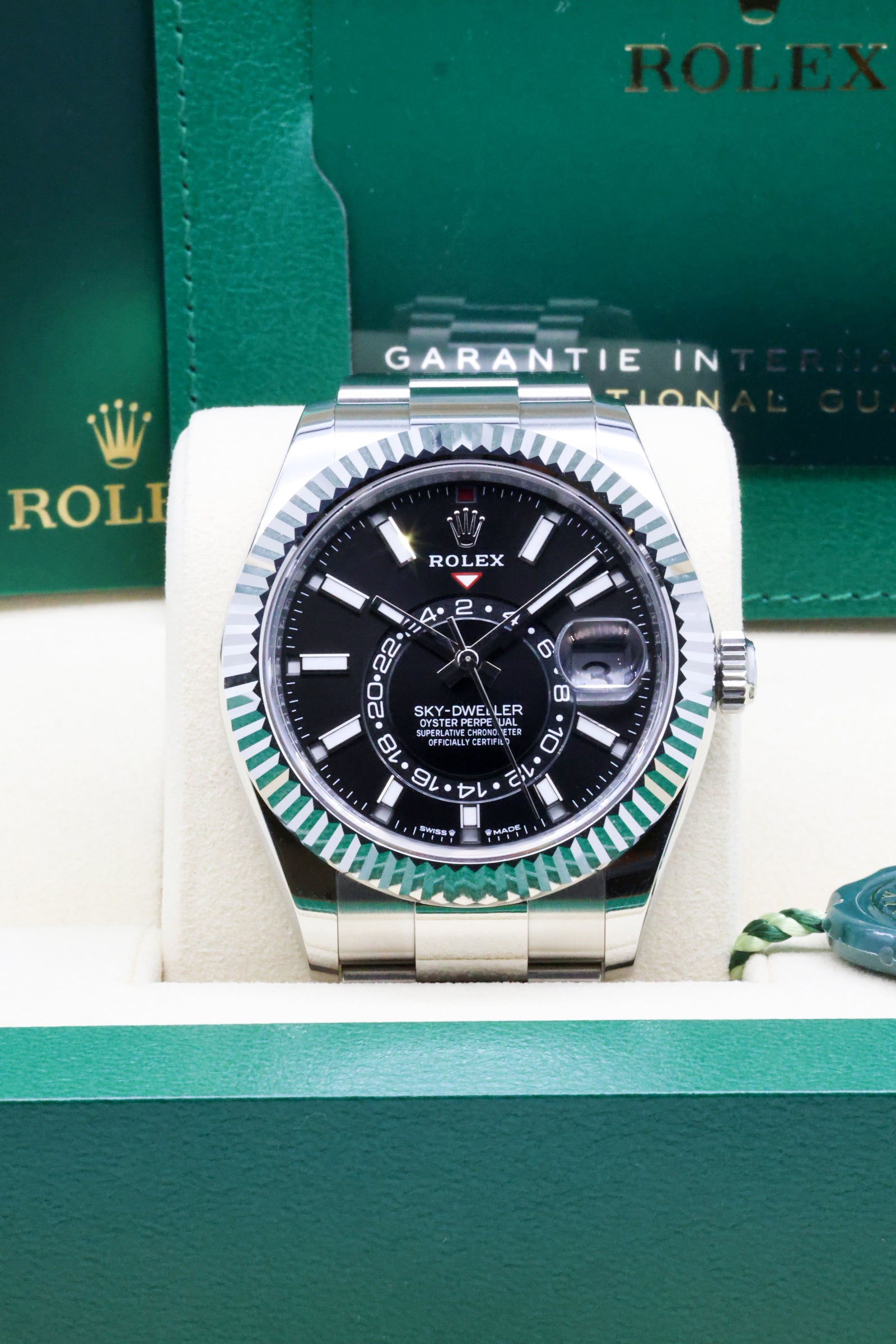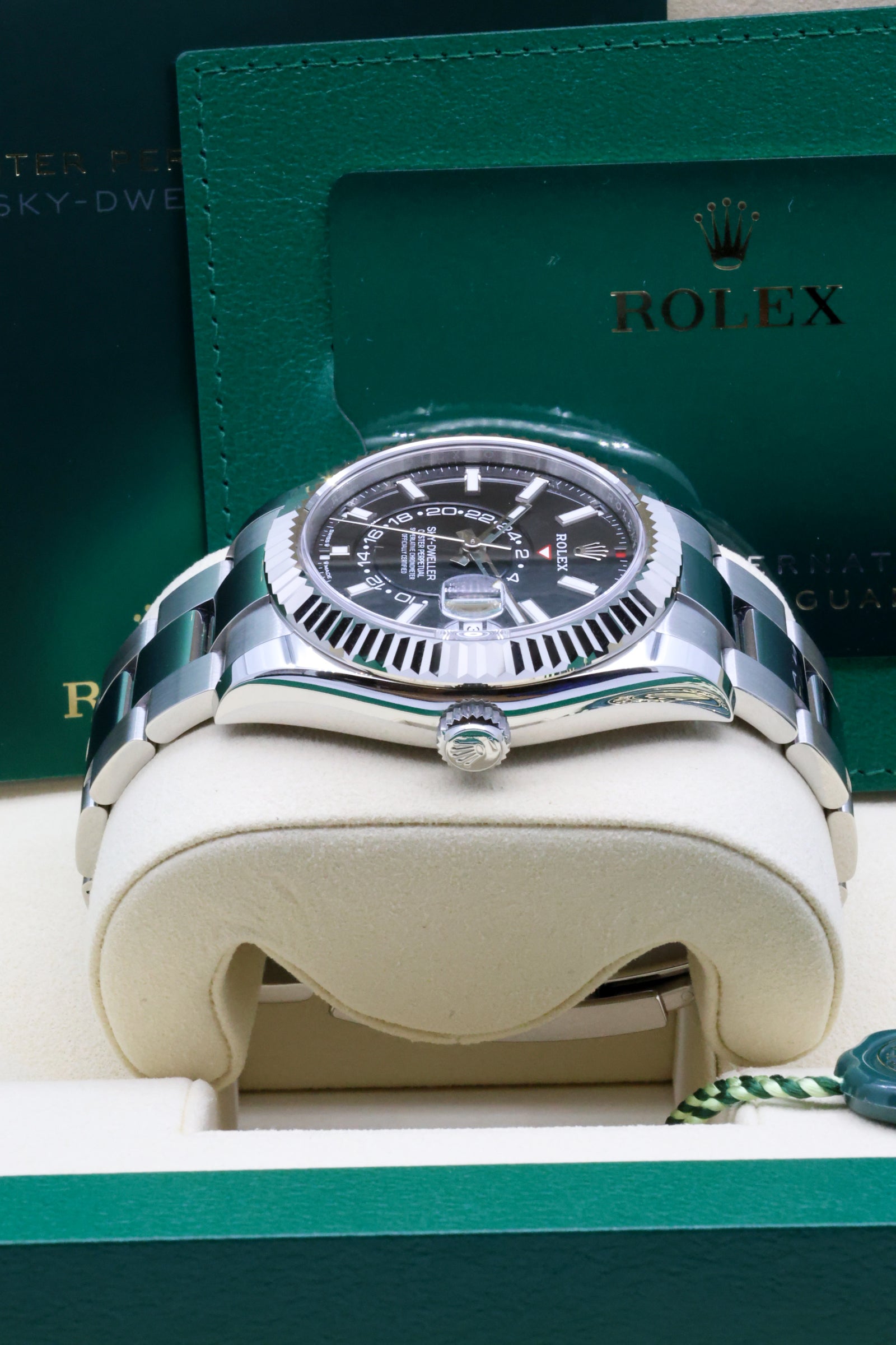 The Sky-Dweller 336934 is not just a technical marvel; it’s a symbol of versatility and sophistication. Its robust Oystersteel construction, paired with the Oyster bracelet featuring the Easylink comfort extension, ensures a secure yet refined wear. This combination of innovation, craftsmanship, and timeless design has cemented the Sky-Dweller as a favorite among globetrotters and collectors who seek the ultimate expression of Rolex’s technical prowess.